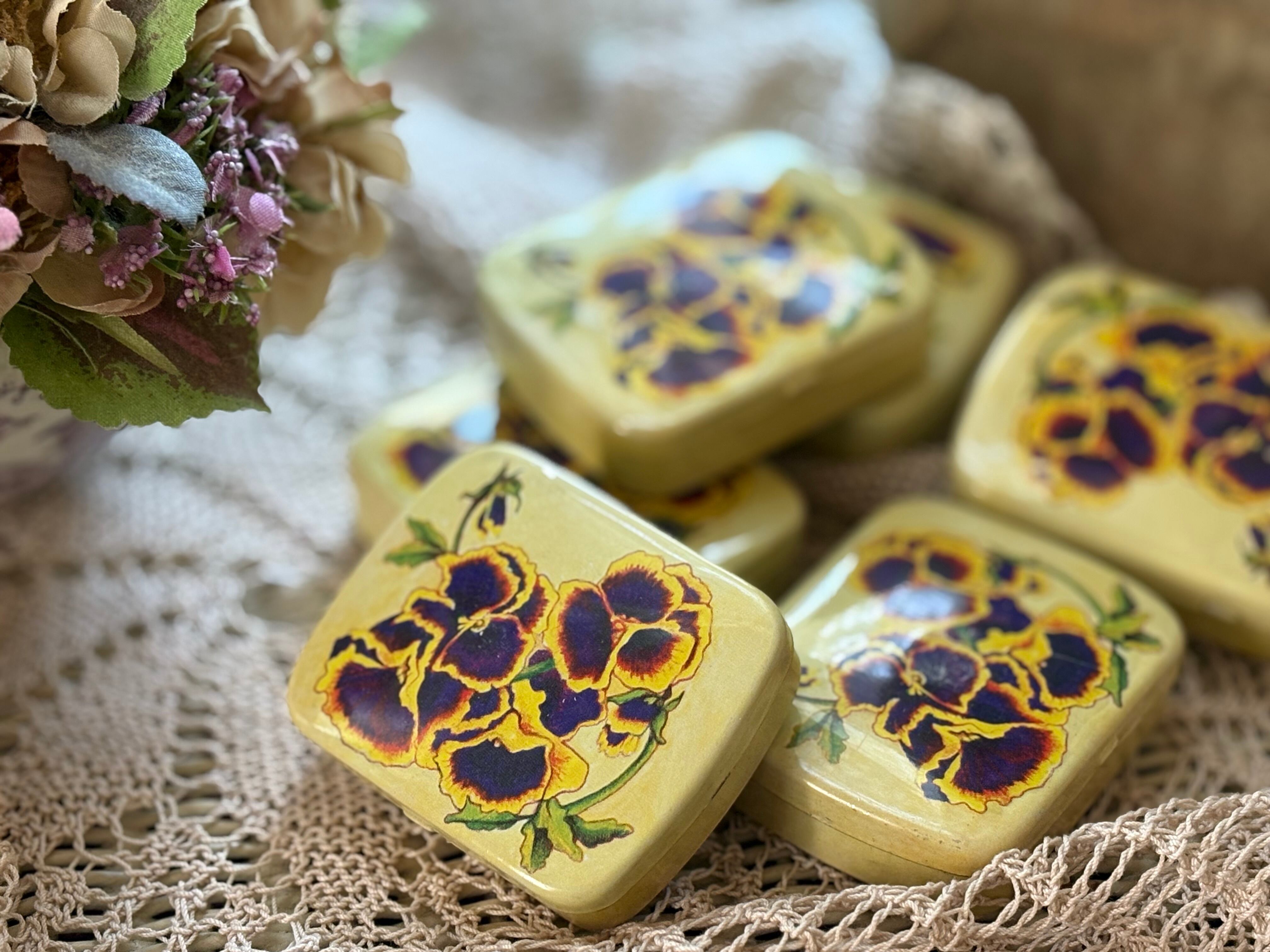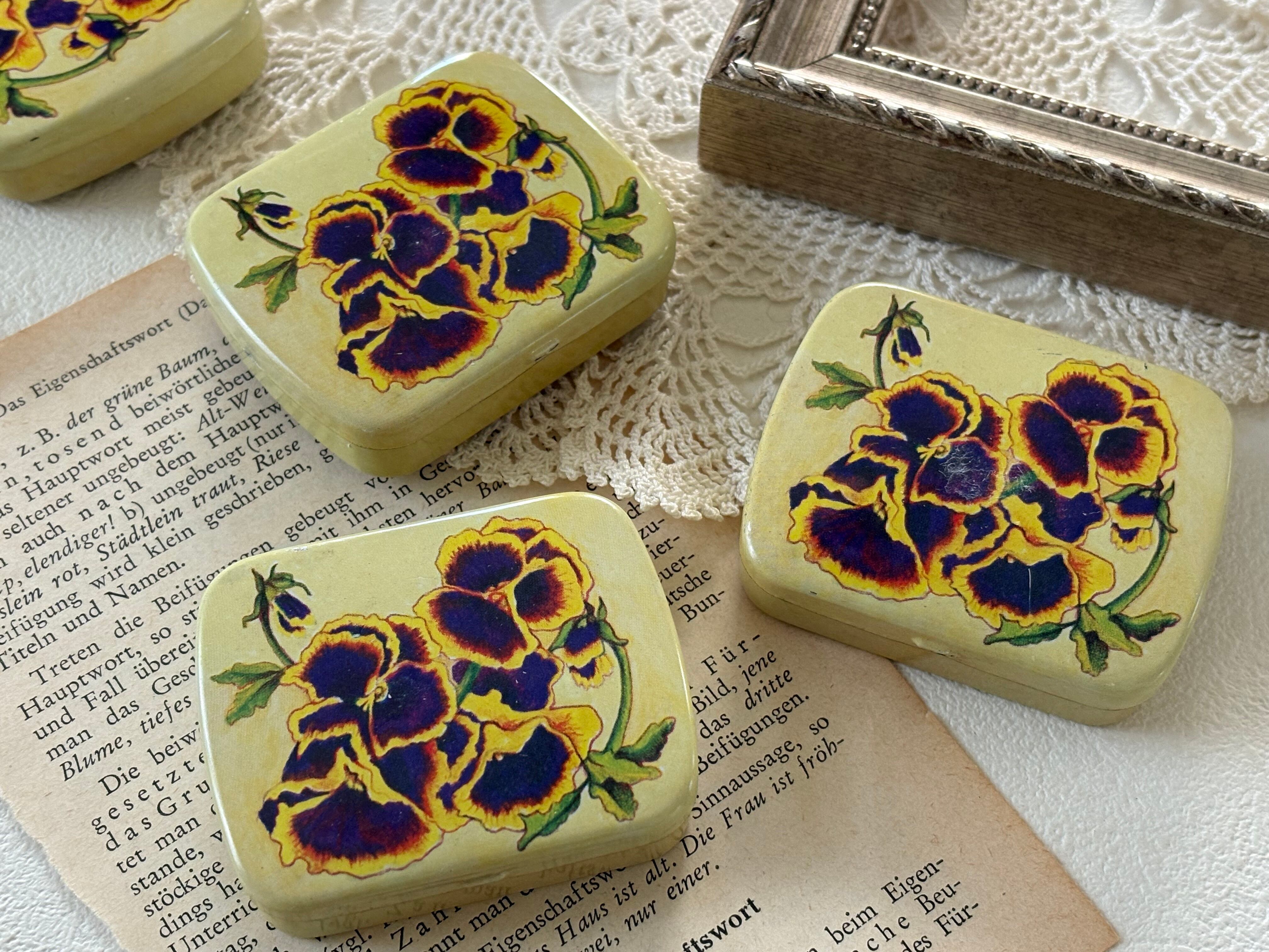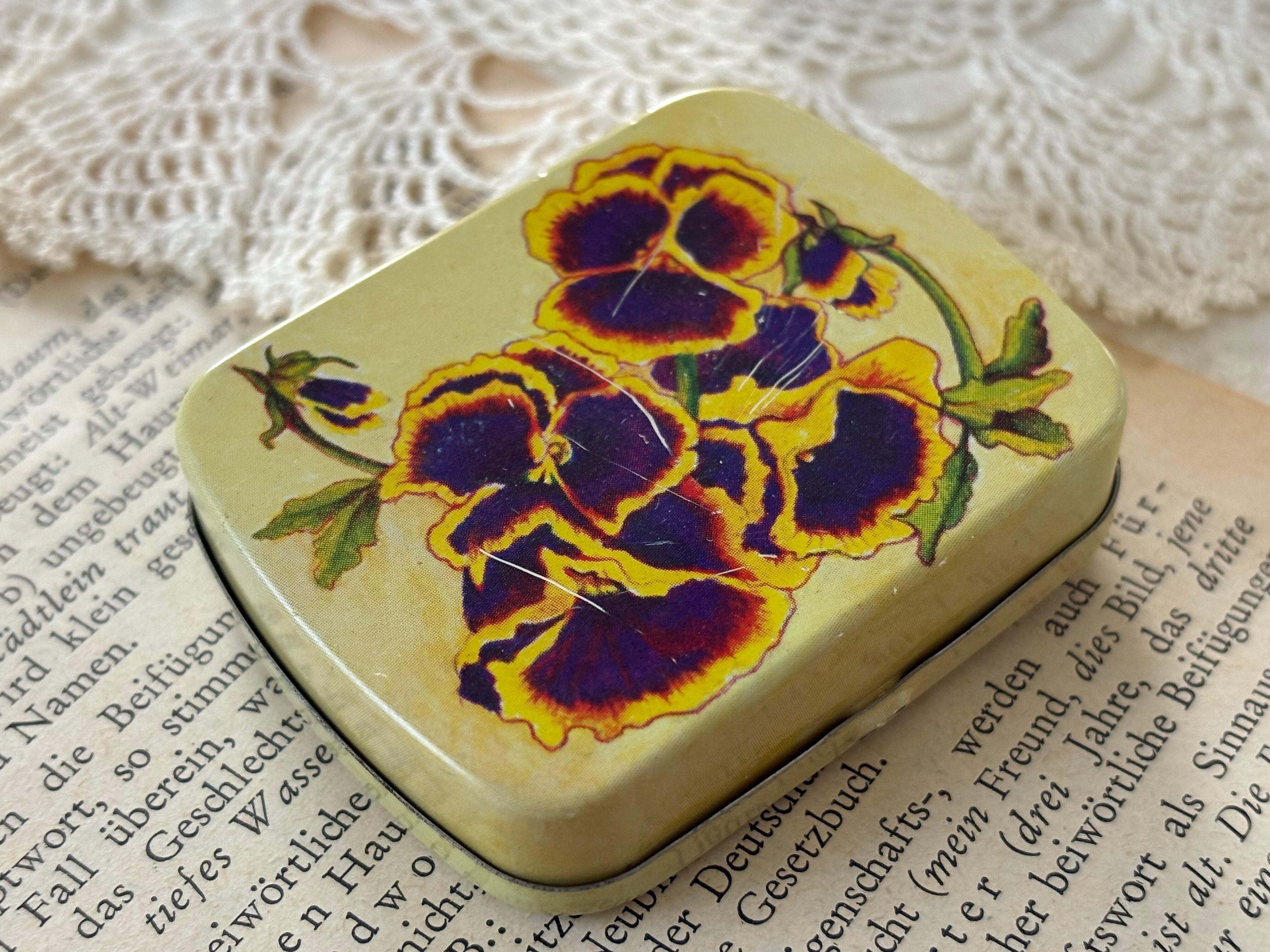 SALE スイス Vintage パンジー柄の小さなティン缶 デッドストック 撮影小物 インテリア小物 ヴィンテージ パンジー すみれ