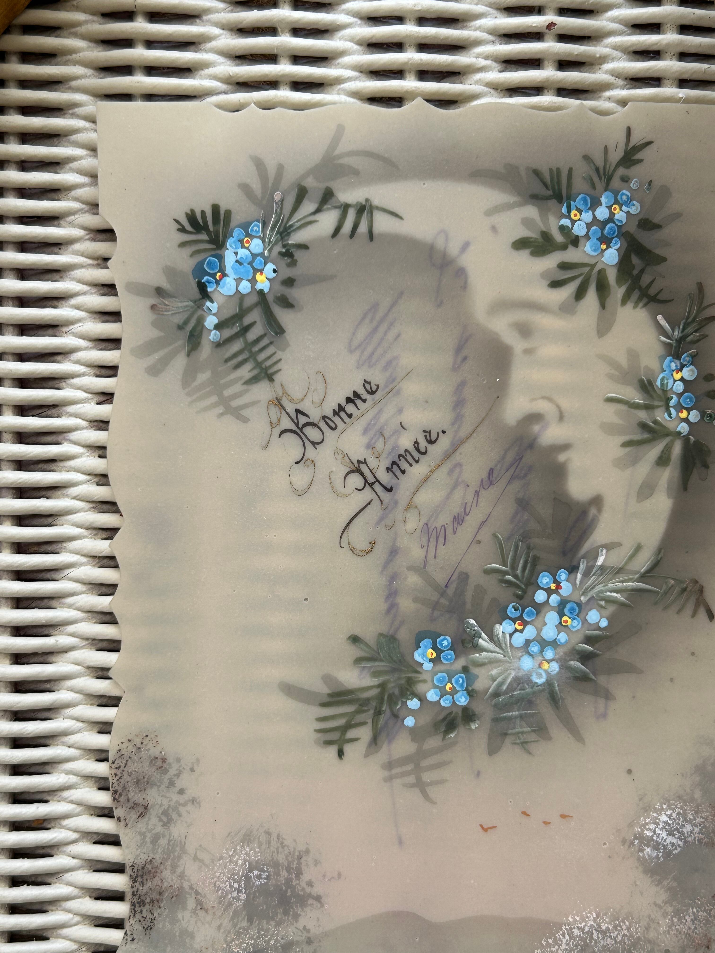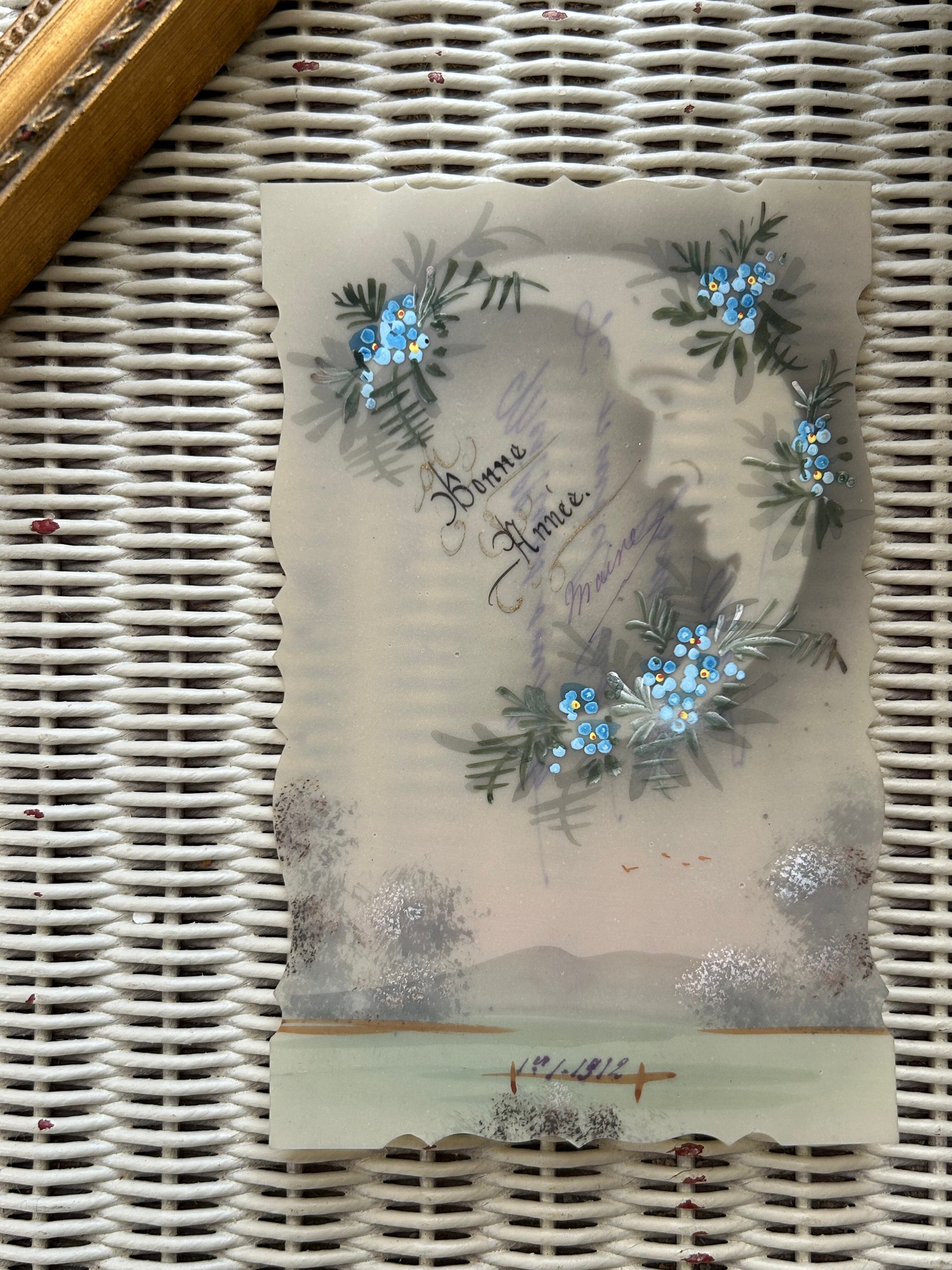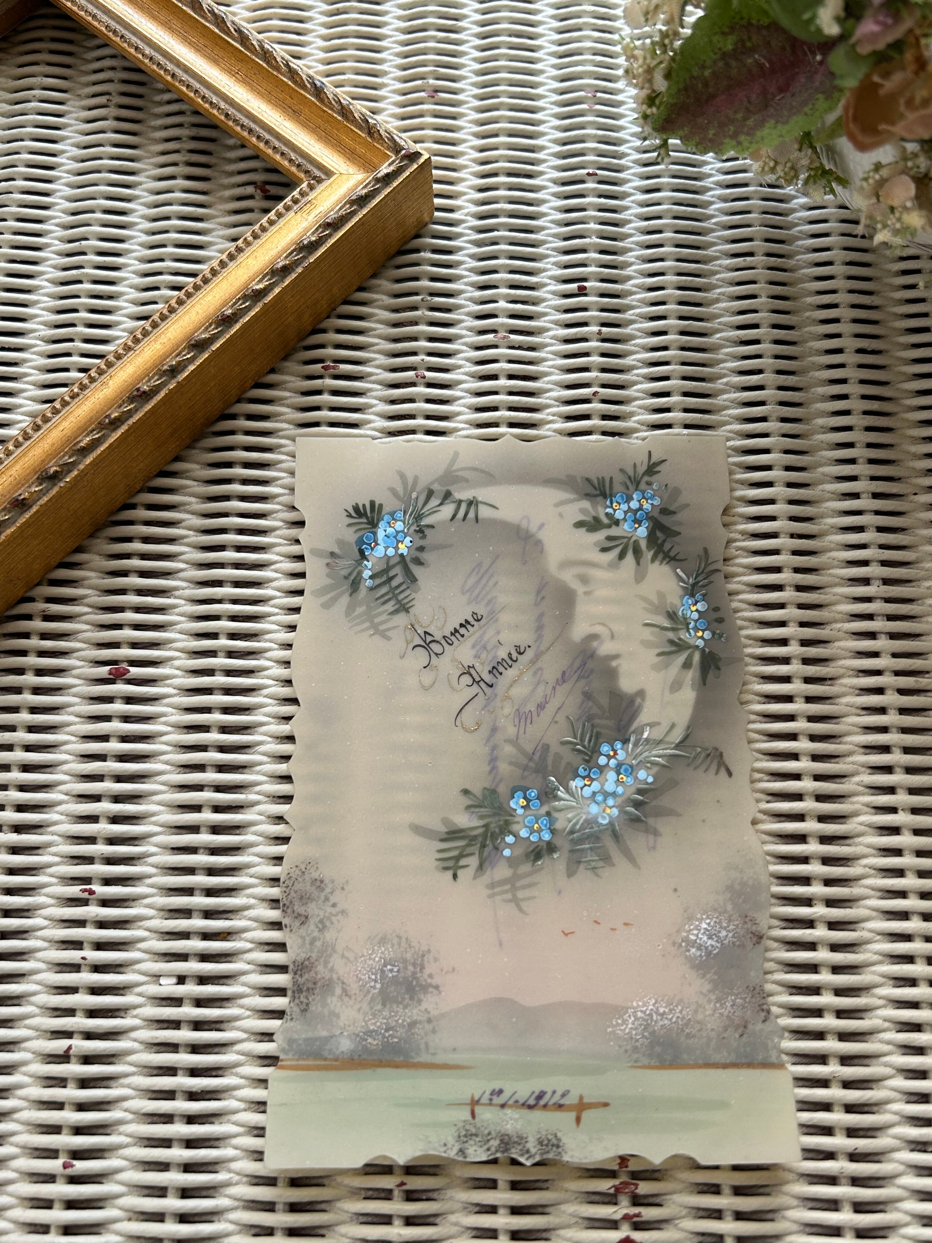 アンティークポストカード Bonne Annee クレッセントムーンと勿忘草 セルロイド フランス