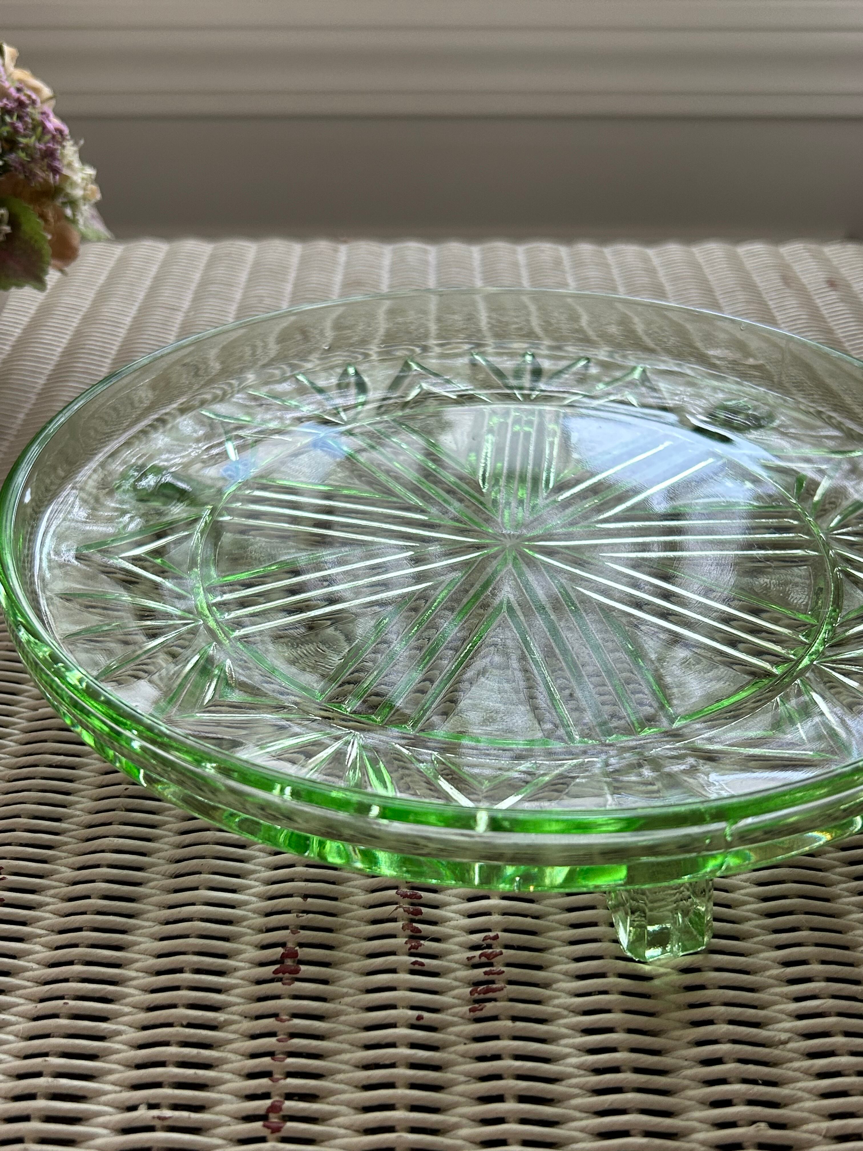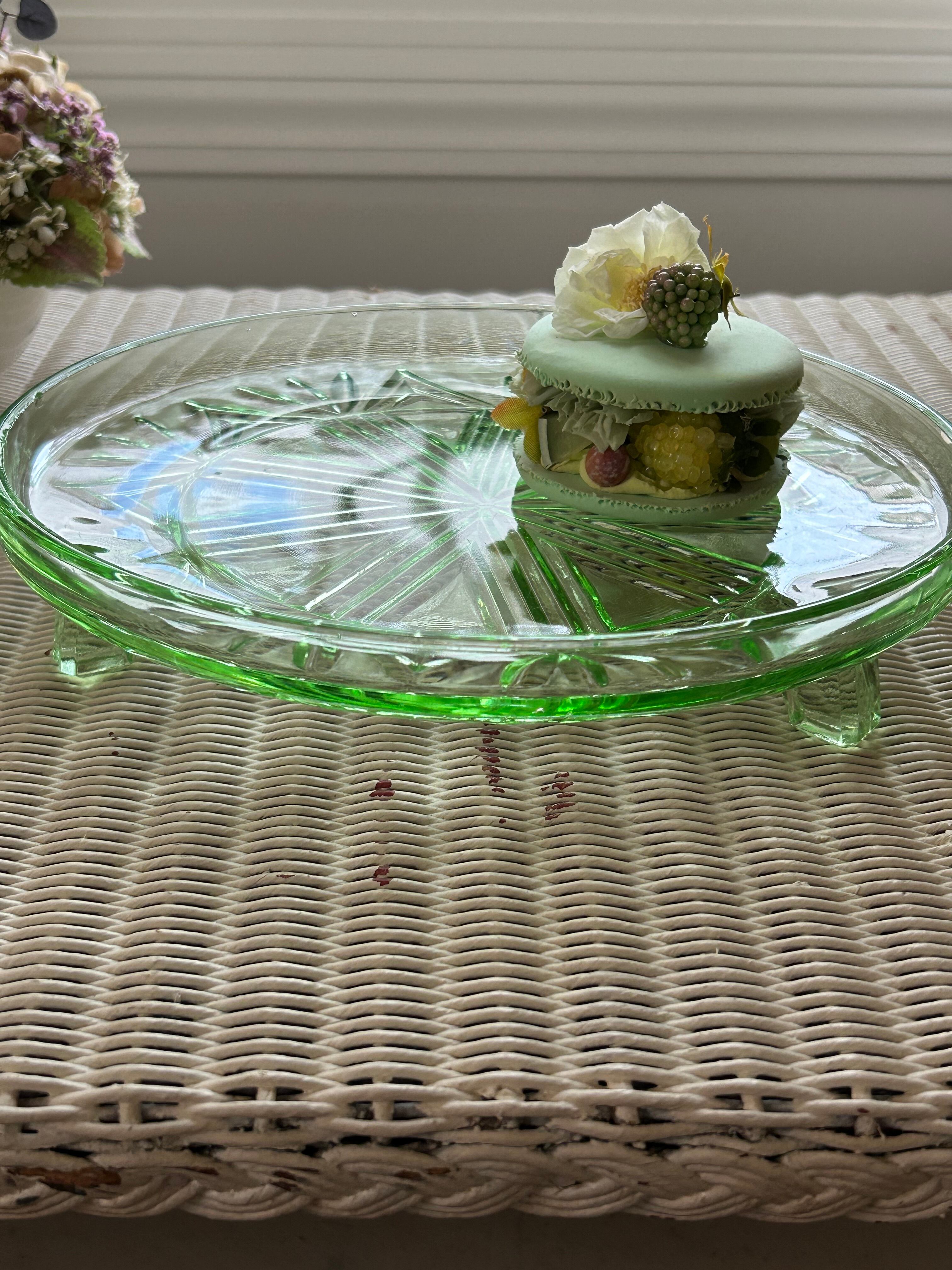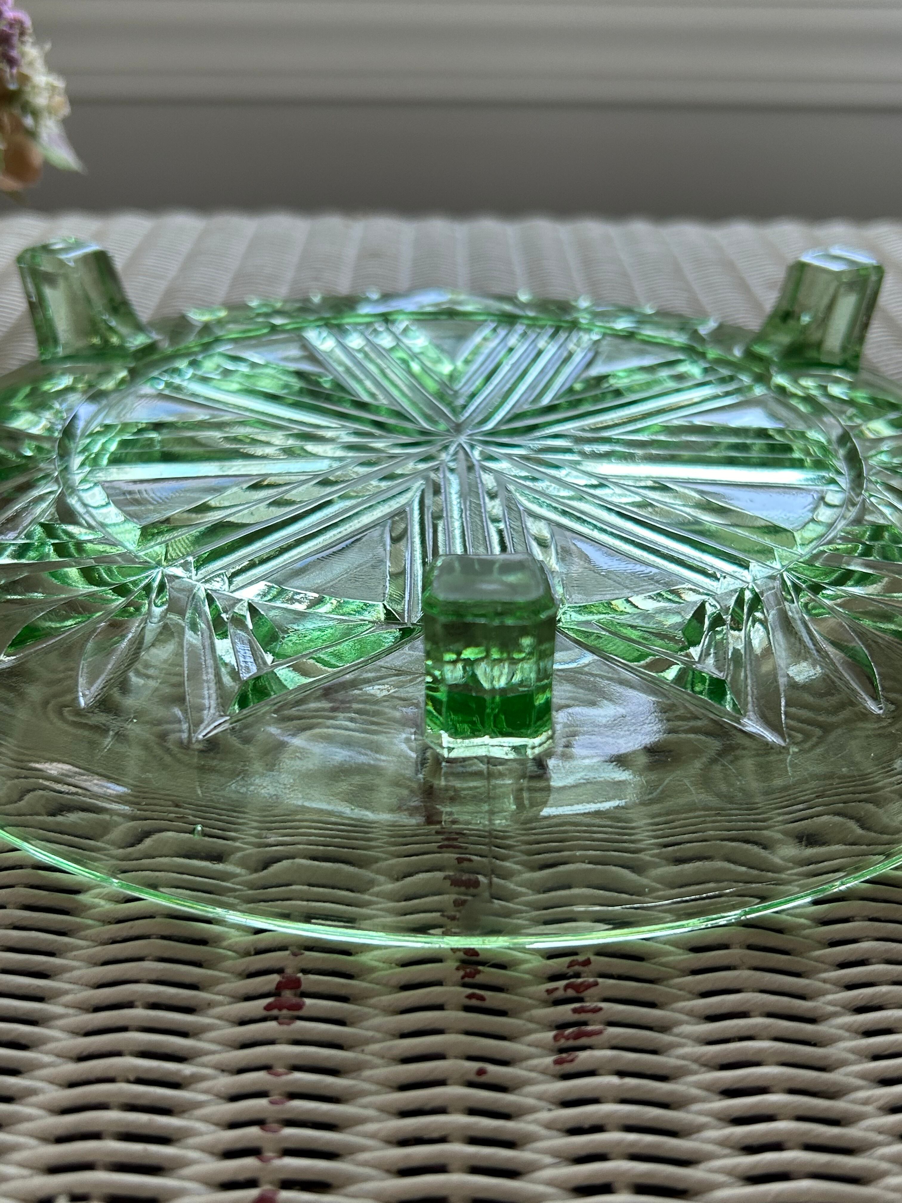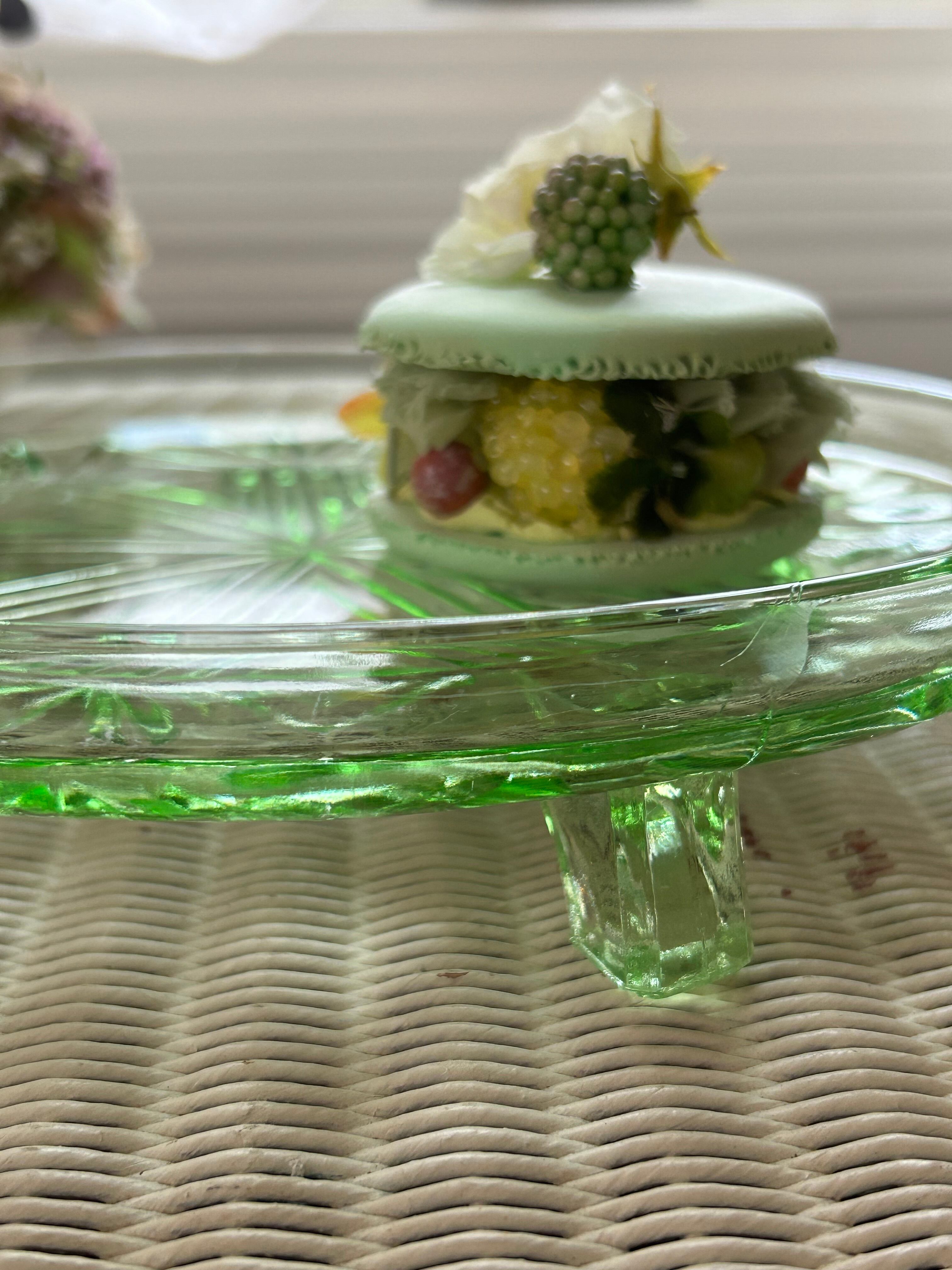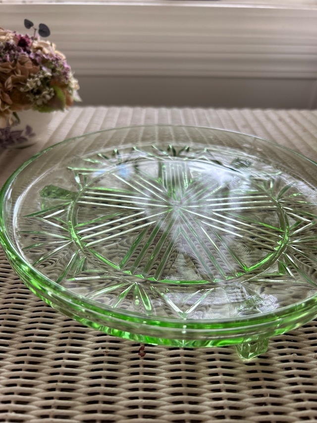 英国アンティーク グリーン ガラスの三脚ケーキスタンド コンポティエ 1940年代