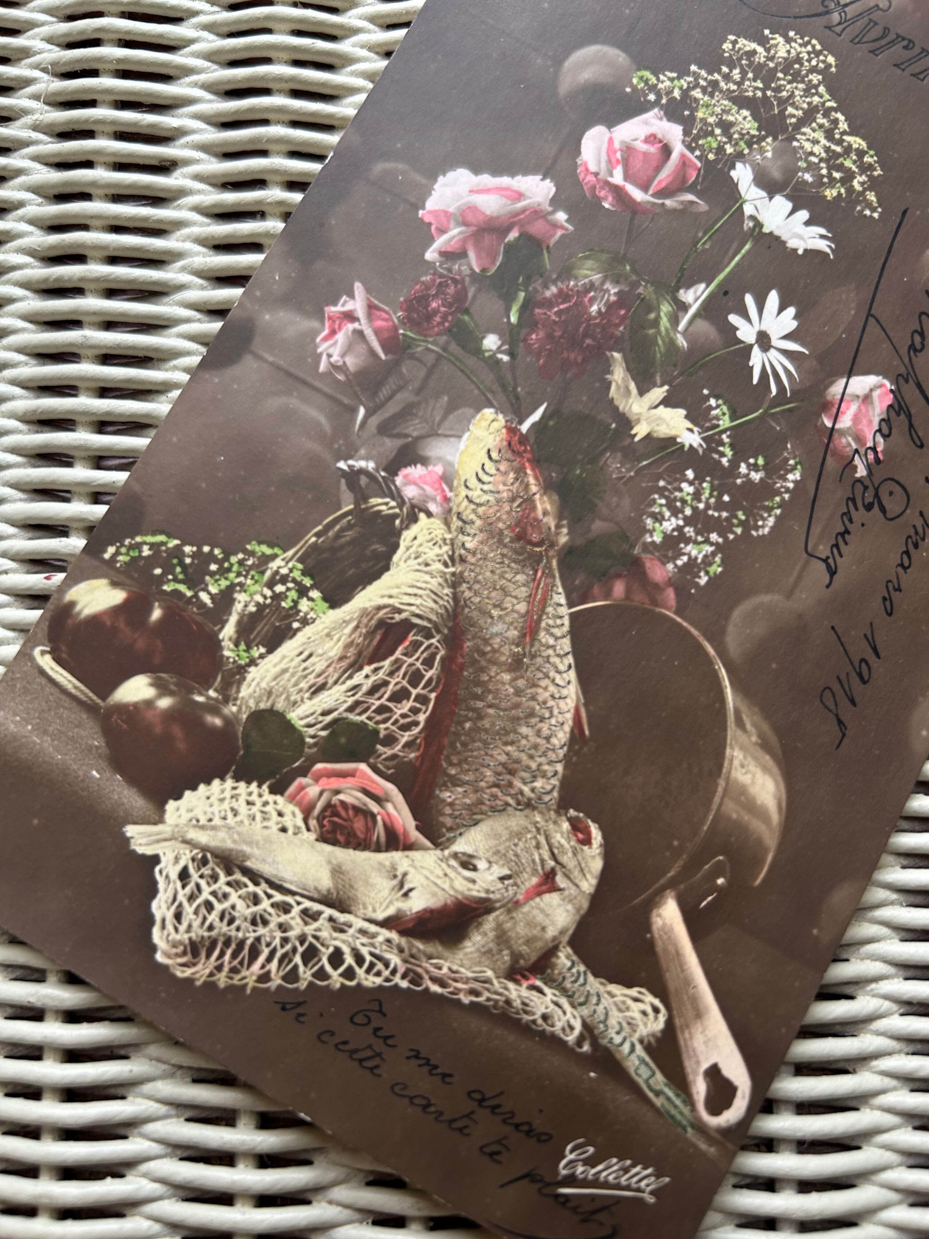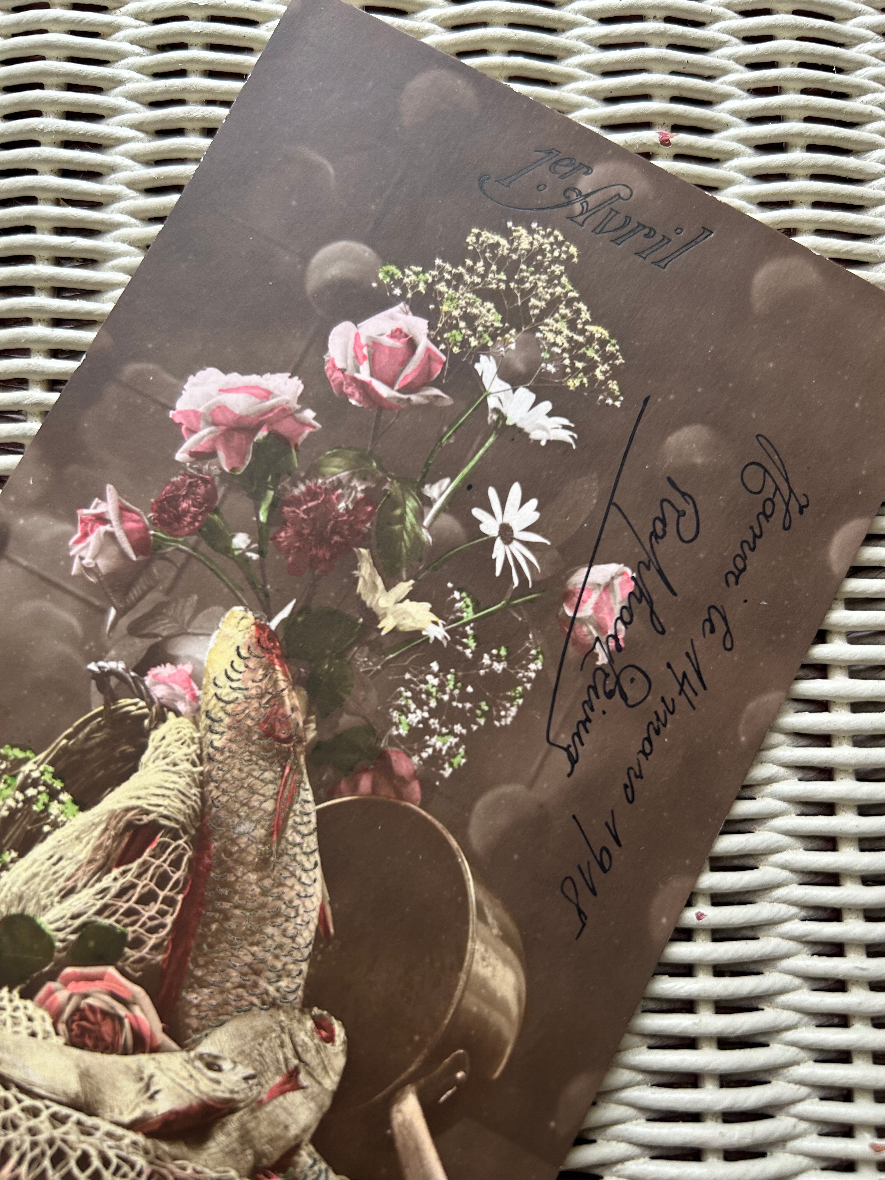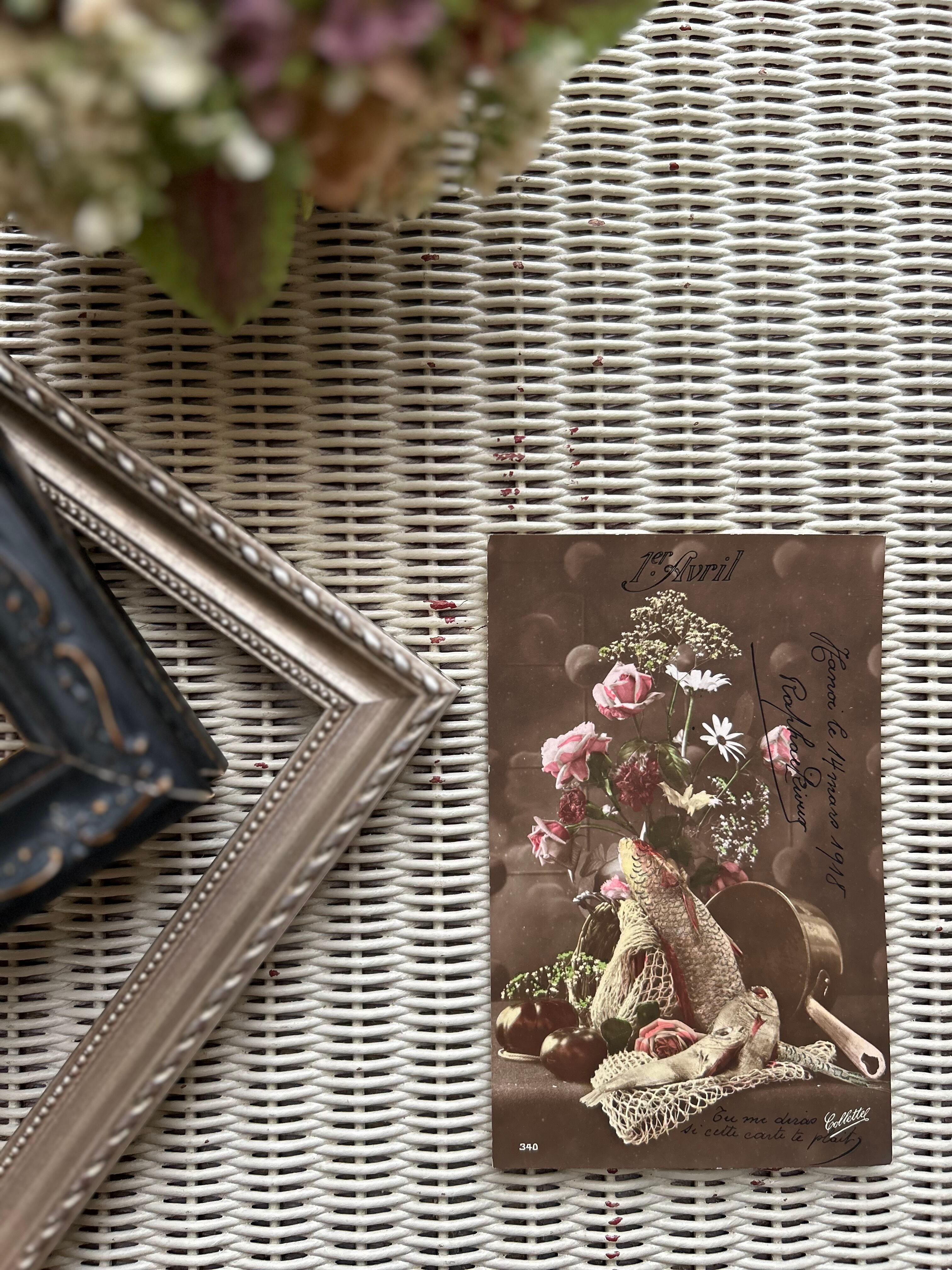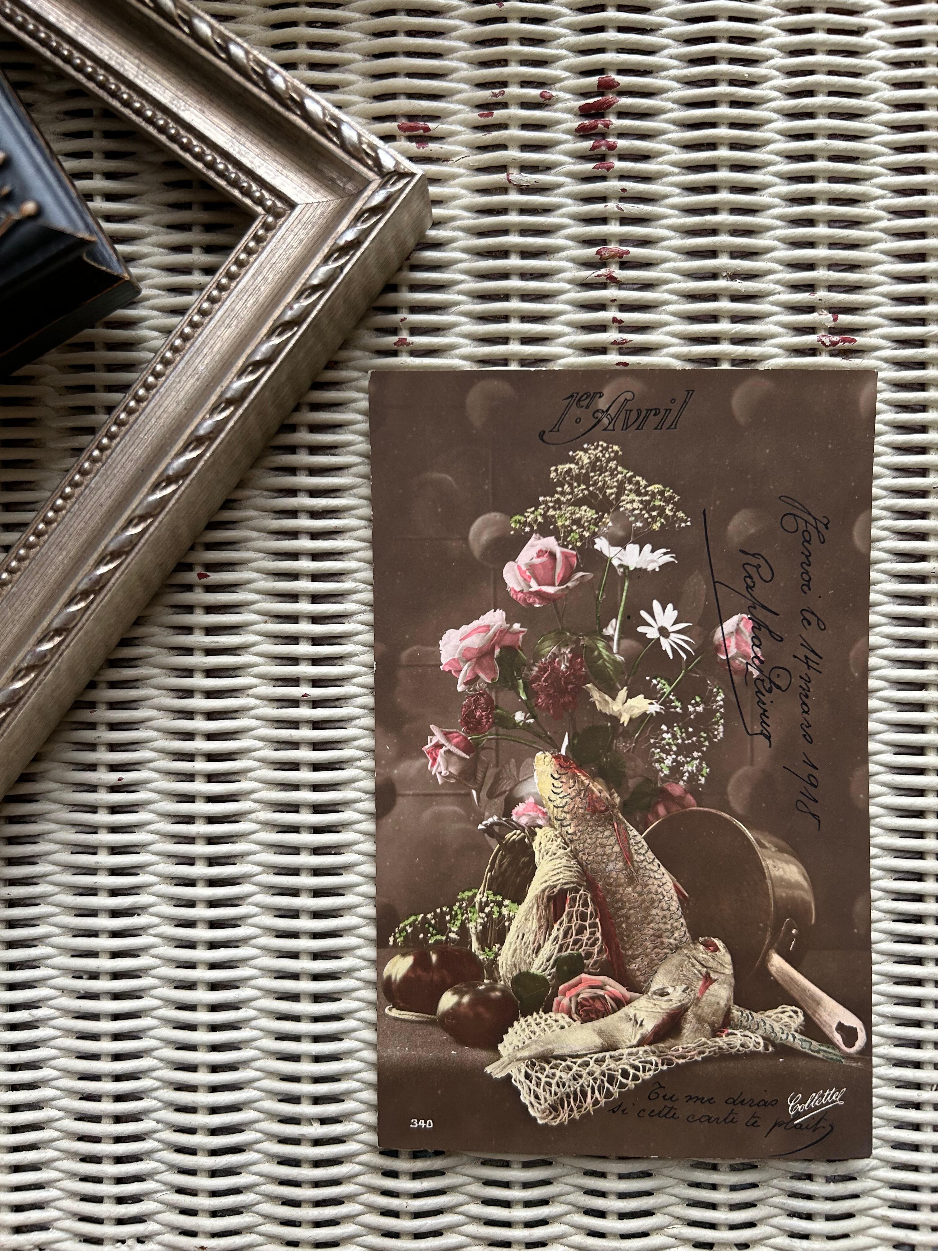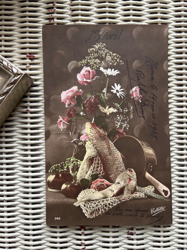 アンティークポストカード Poisson d'Avril 4月の魚 1918年 額装 インテリア フランス