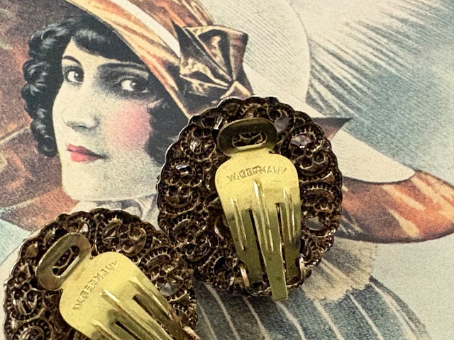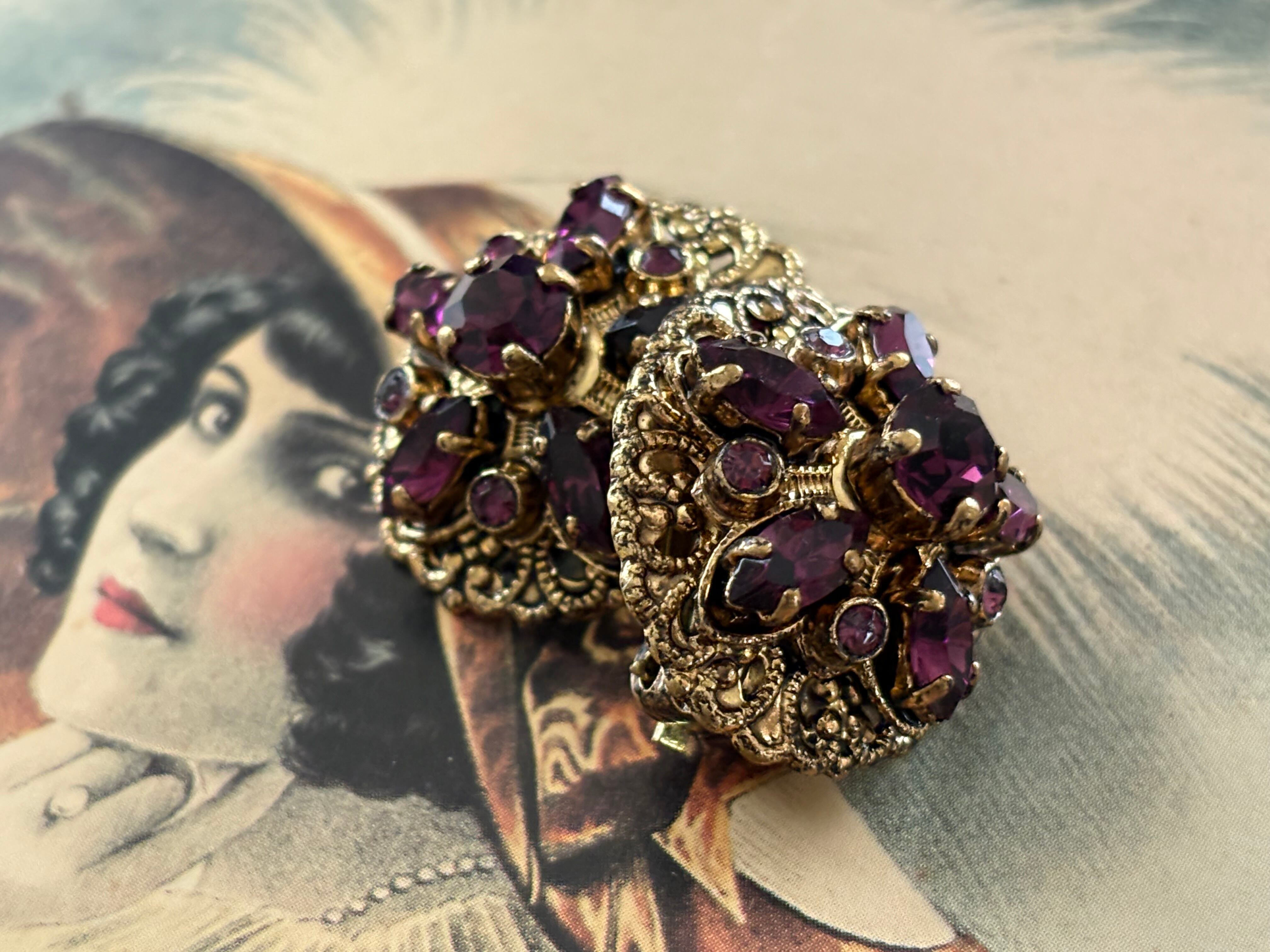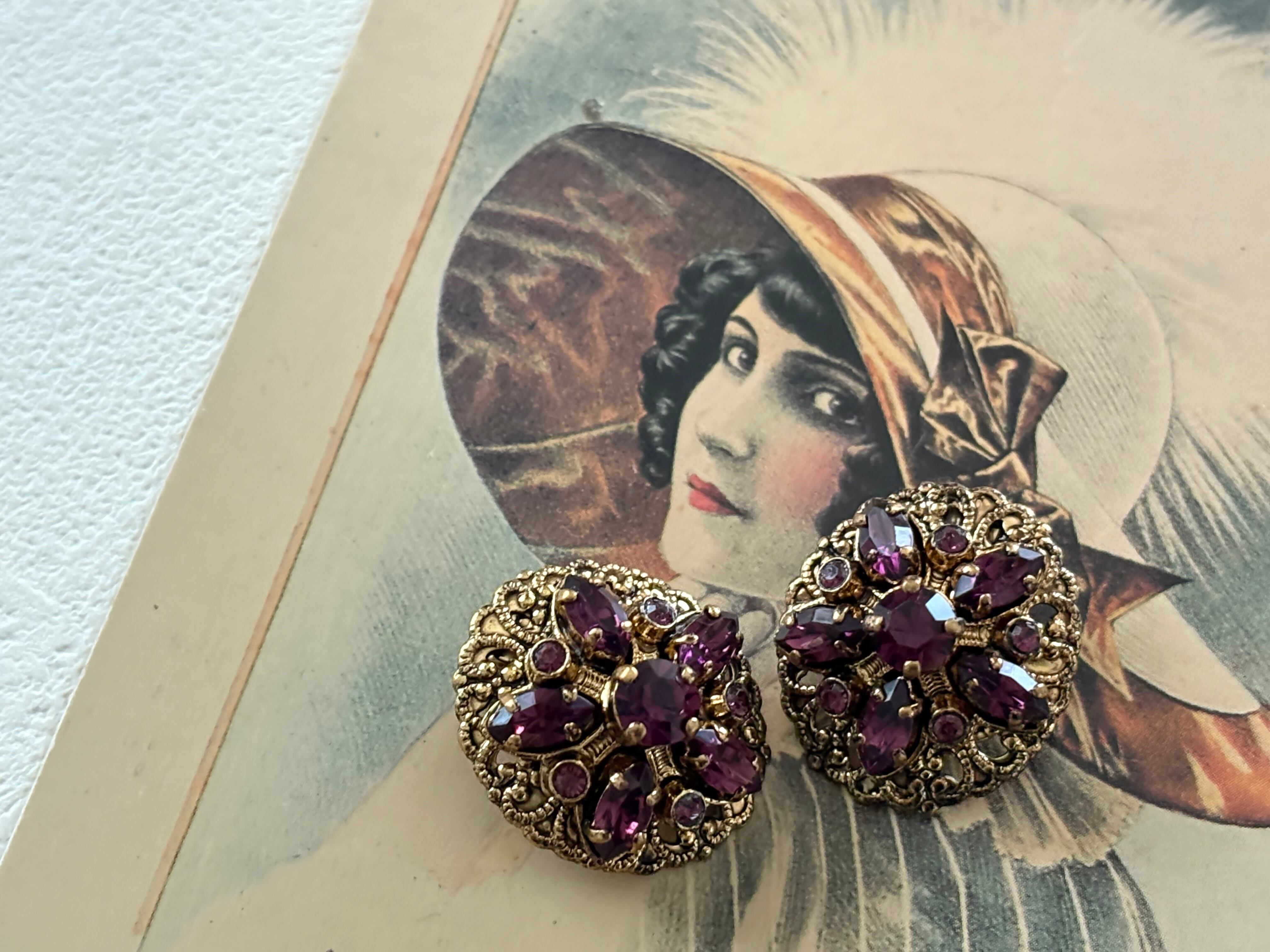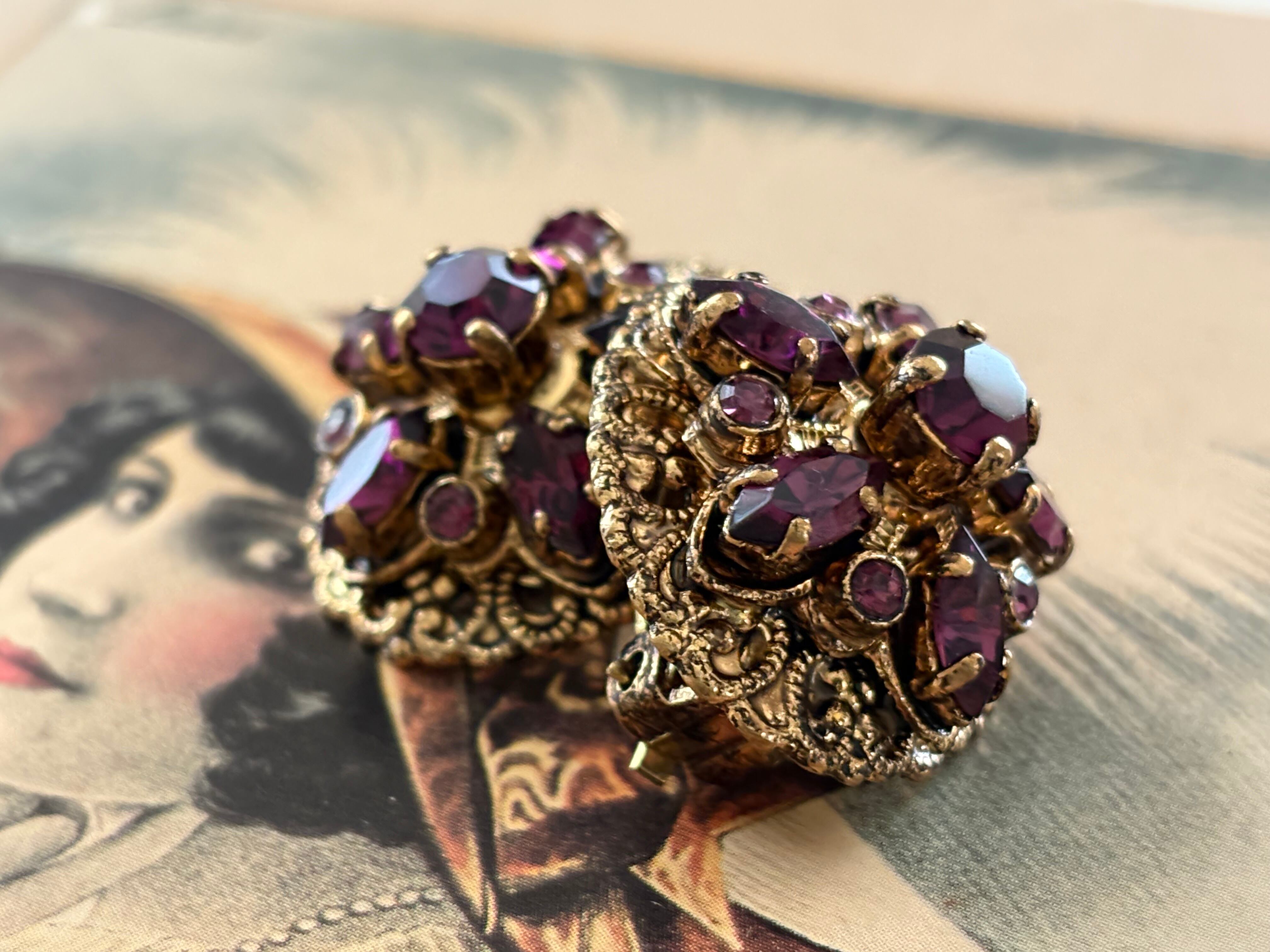 西ドイツ製の繊細な透かし装飾に、パープルカラーのガラスがセッティングされた素敵なイヤリングです。