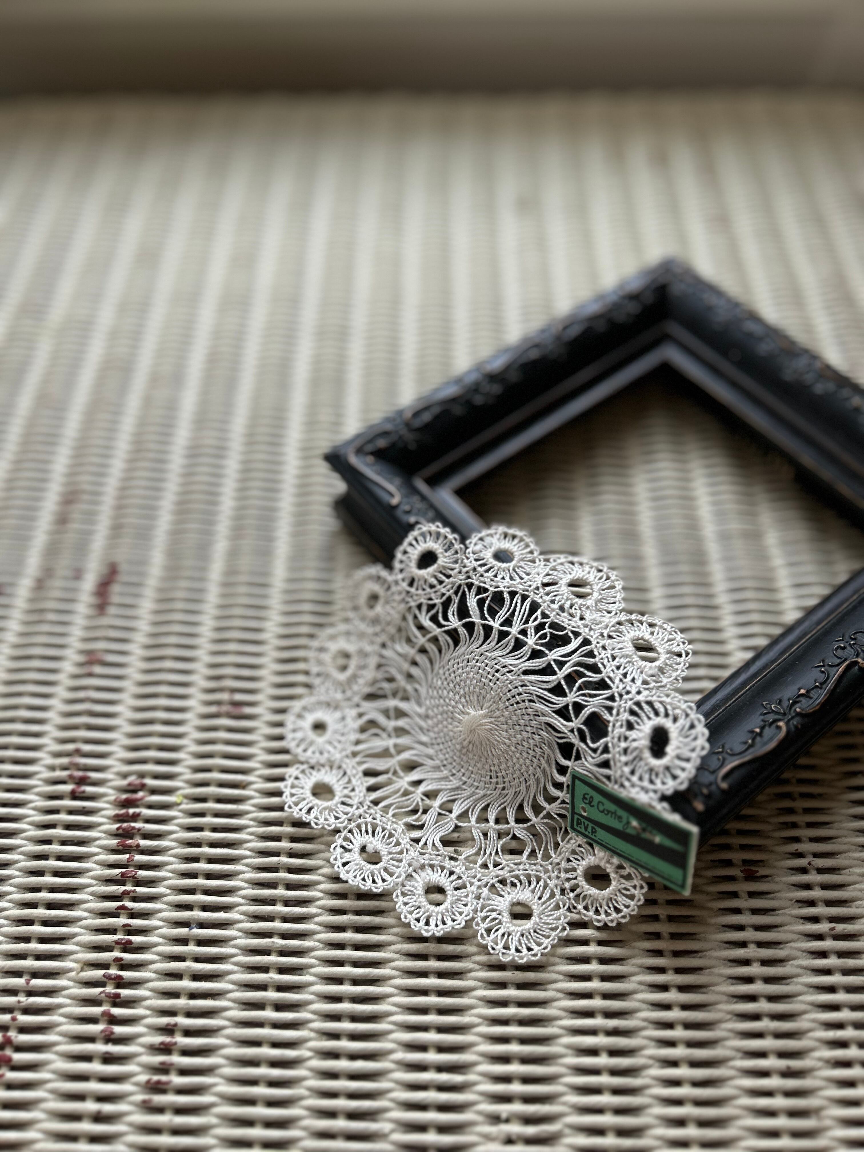 小さめサイズですが美しいお花が咲いたような、ヘアピンレースの技法を用いて編まれたドイリーです。