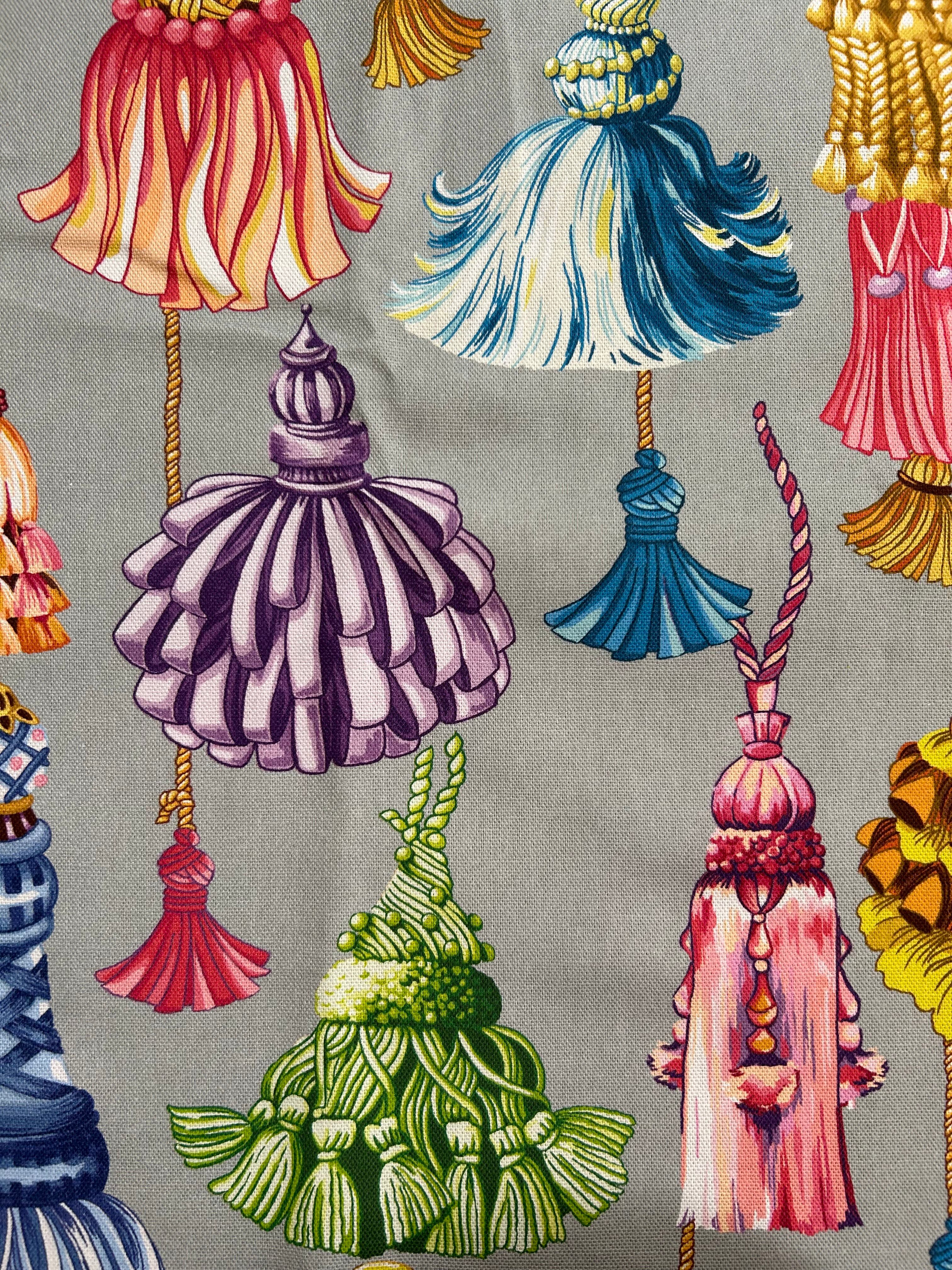 ライトグレーの地に色とりどり、様々なデザインのタッセル柄がプリントされています。