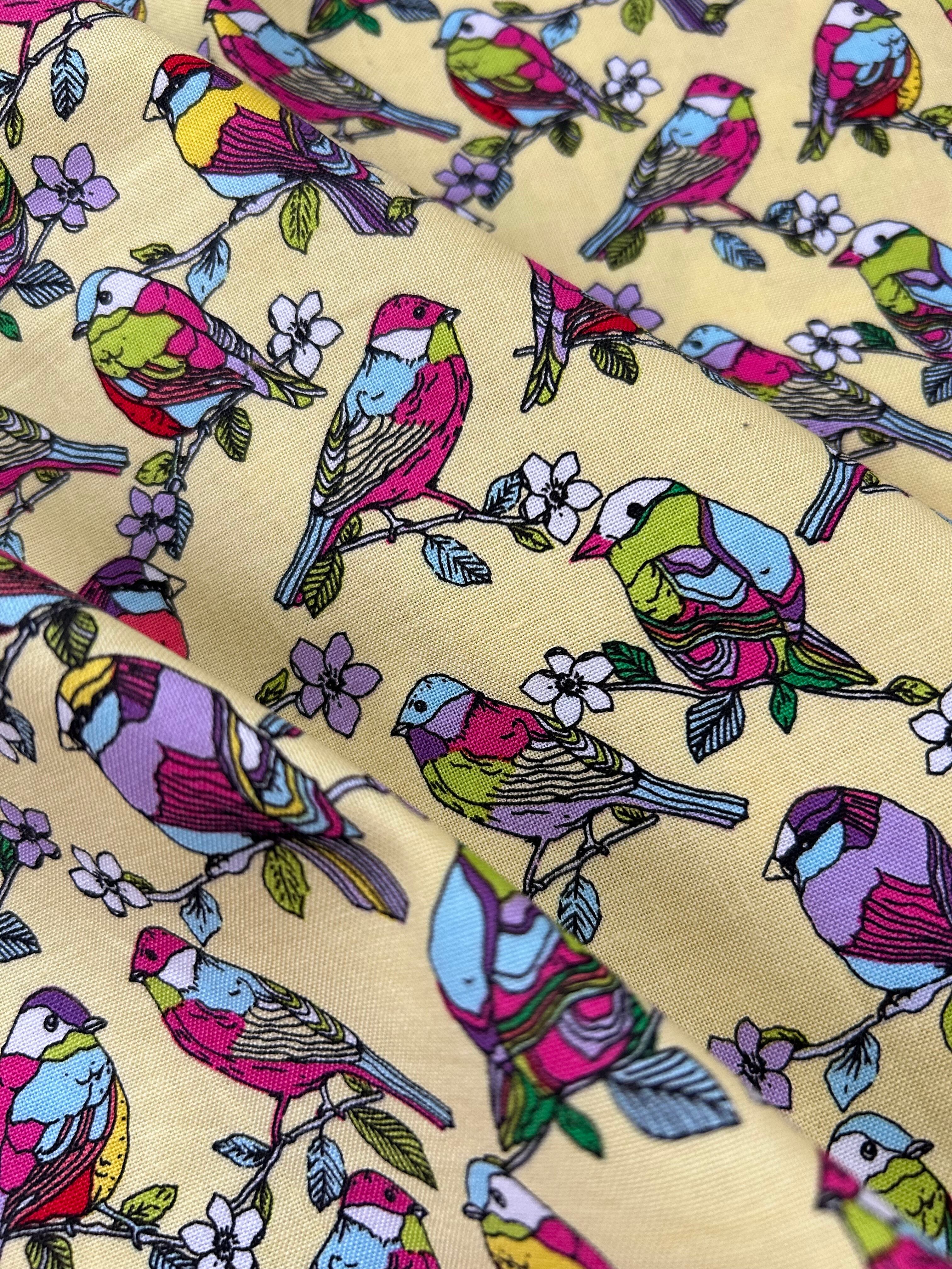 淡い爽やかなイエローの地一面に可愛い小鳥と小花のデザイン。