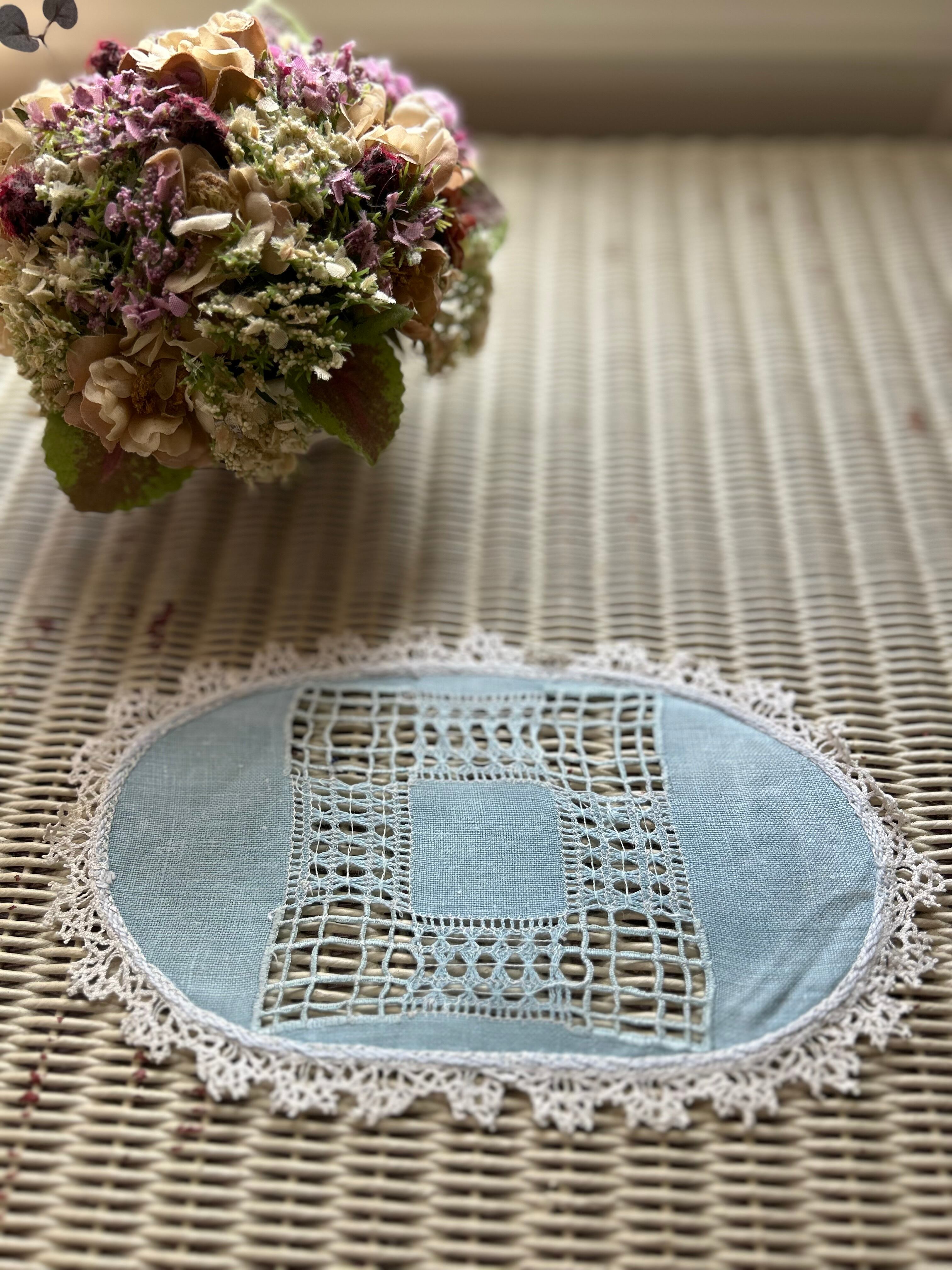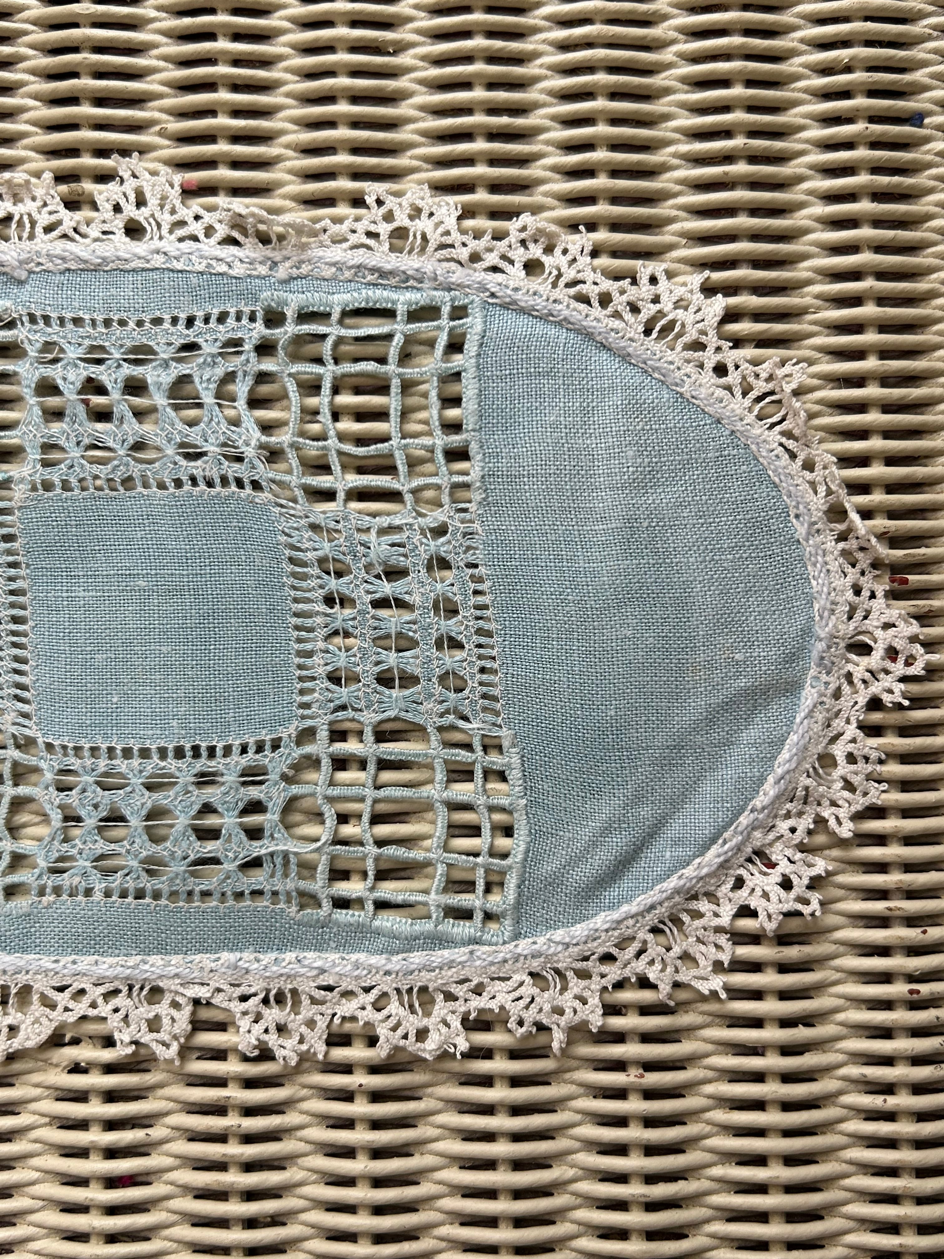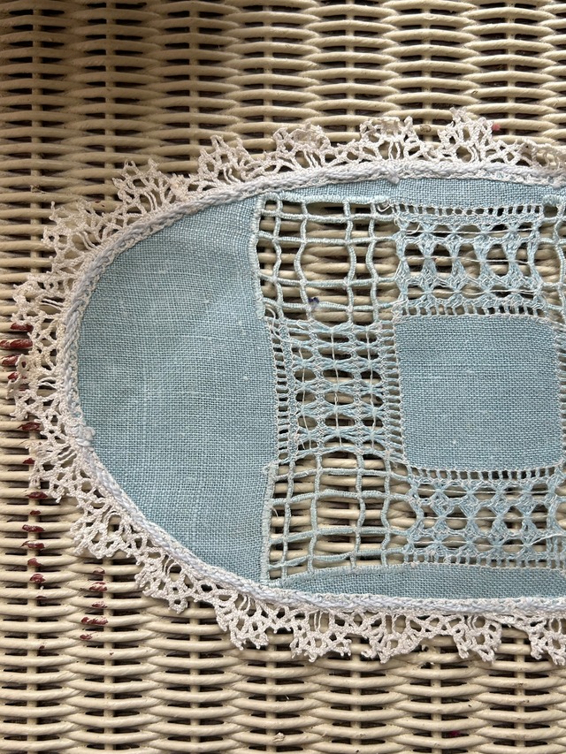 フランスVintage くすみブルーのオーバル型ドイリー カットワーク 敷物 インテリア