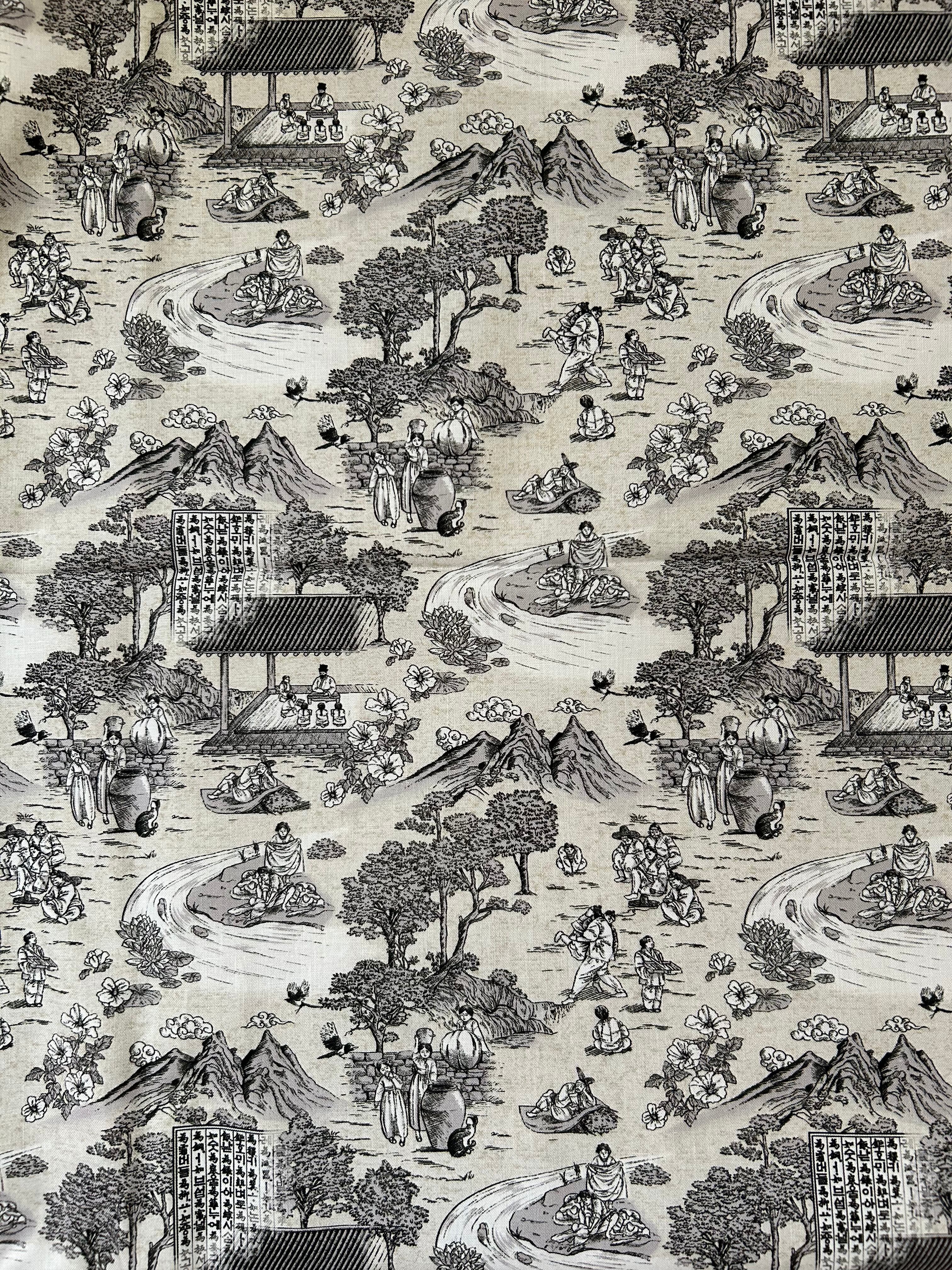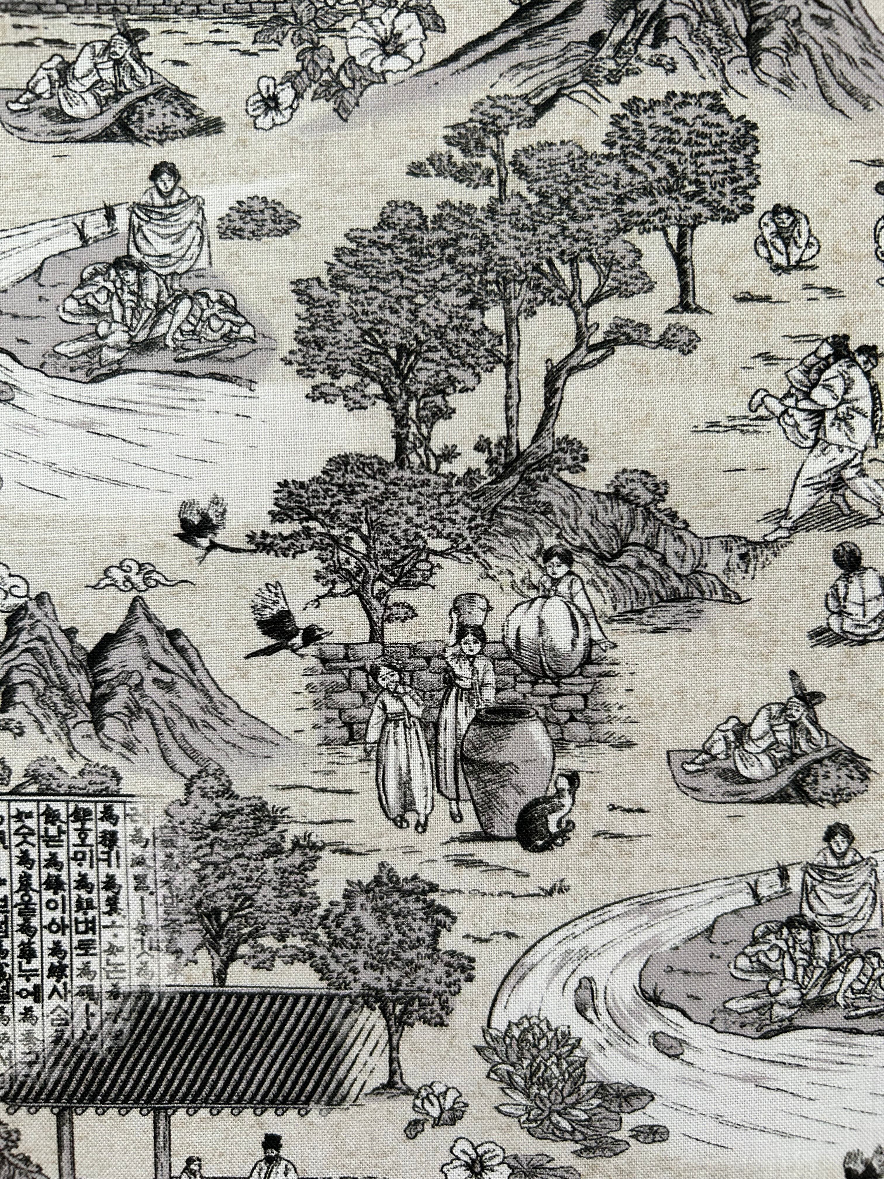 一面に昔の韓国の人物、風景がプリントされたコットンファブリックです。