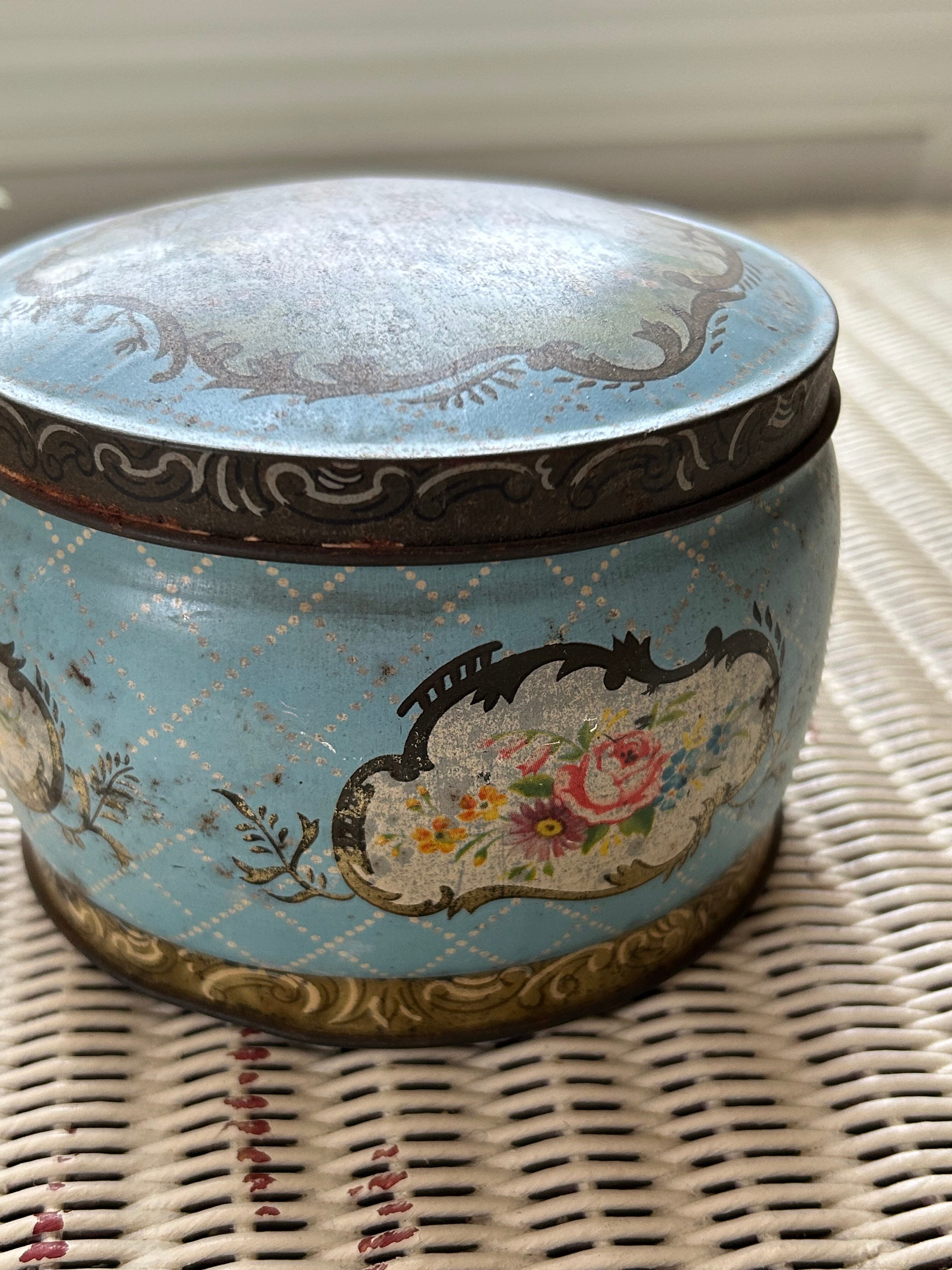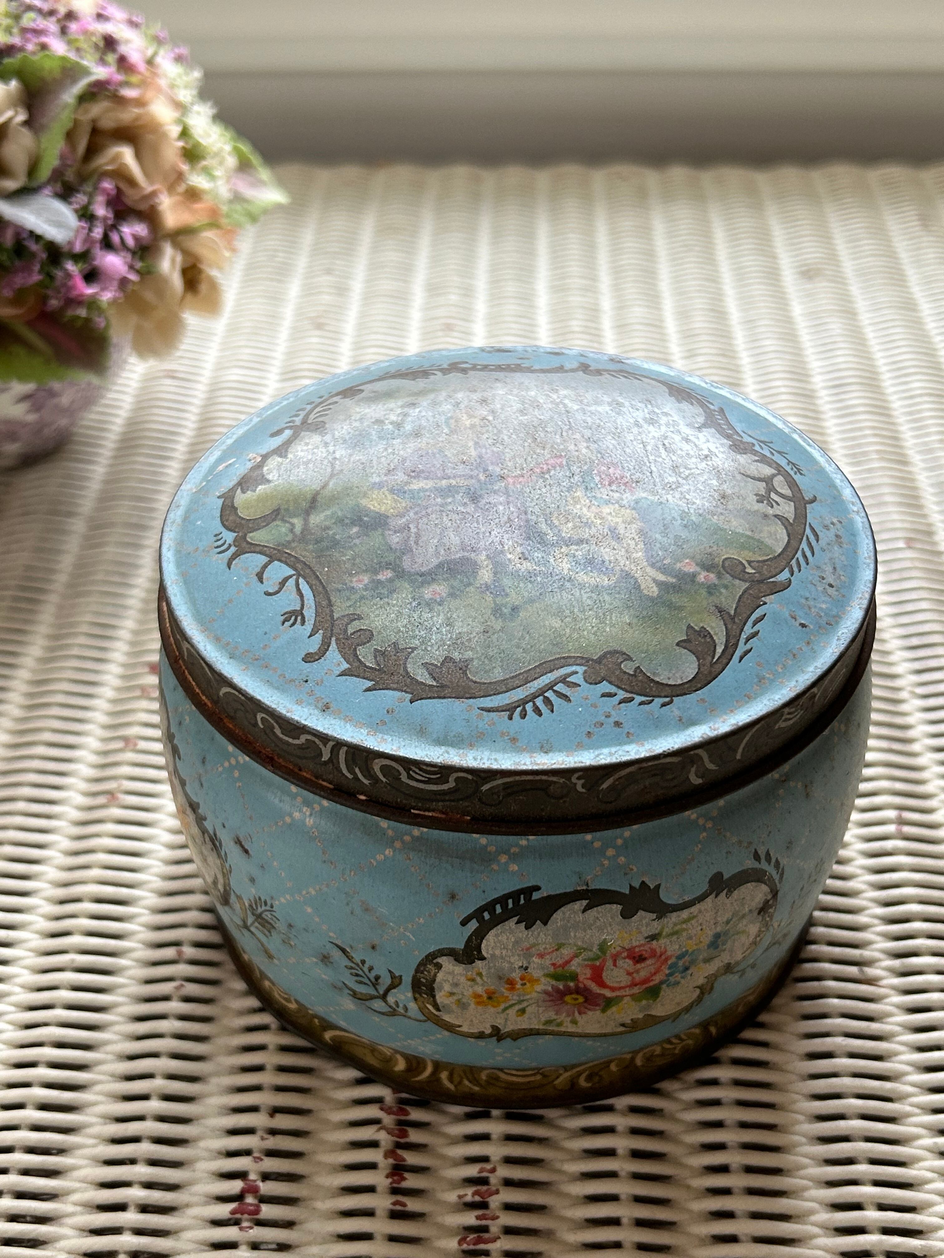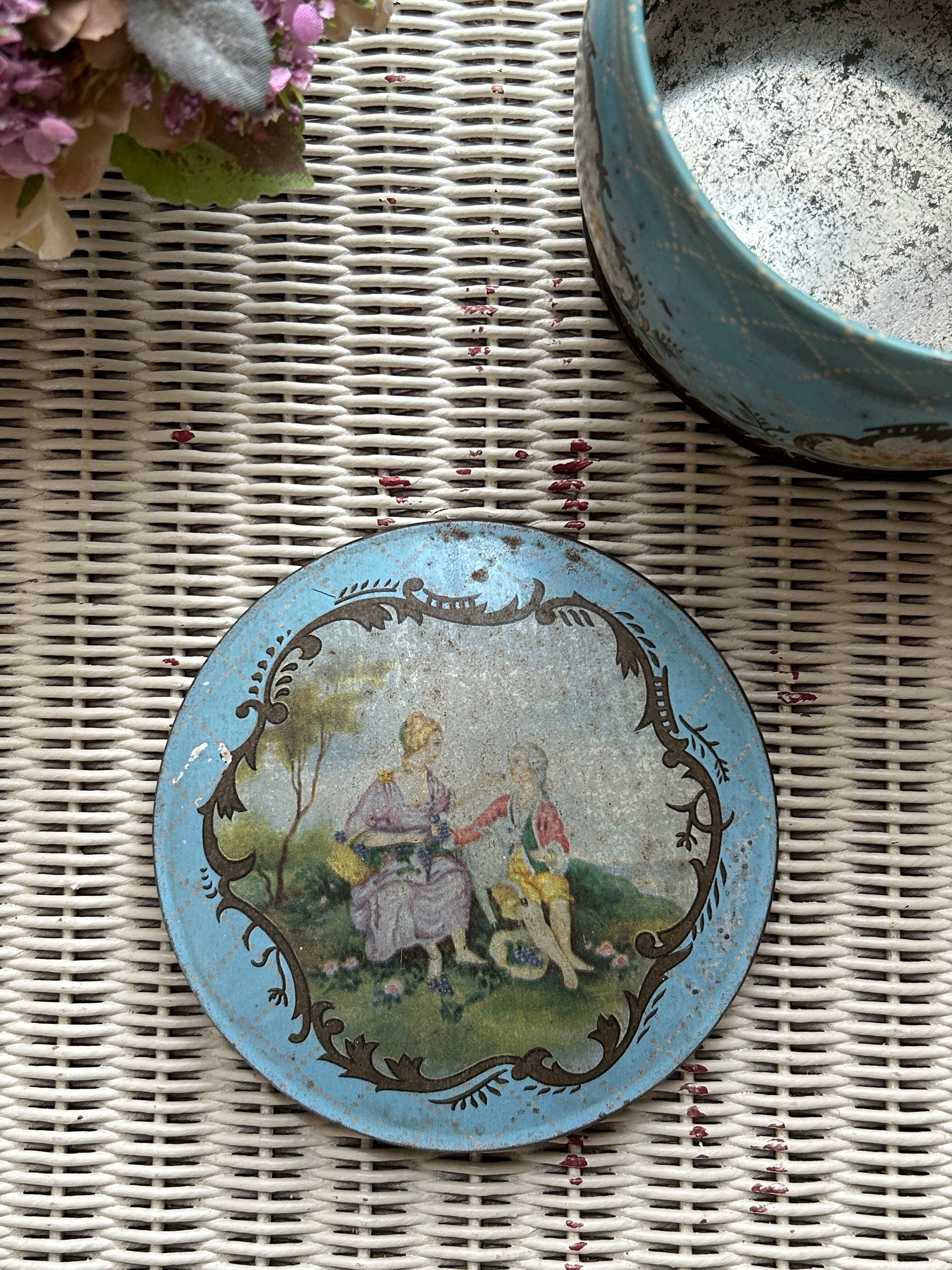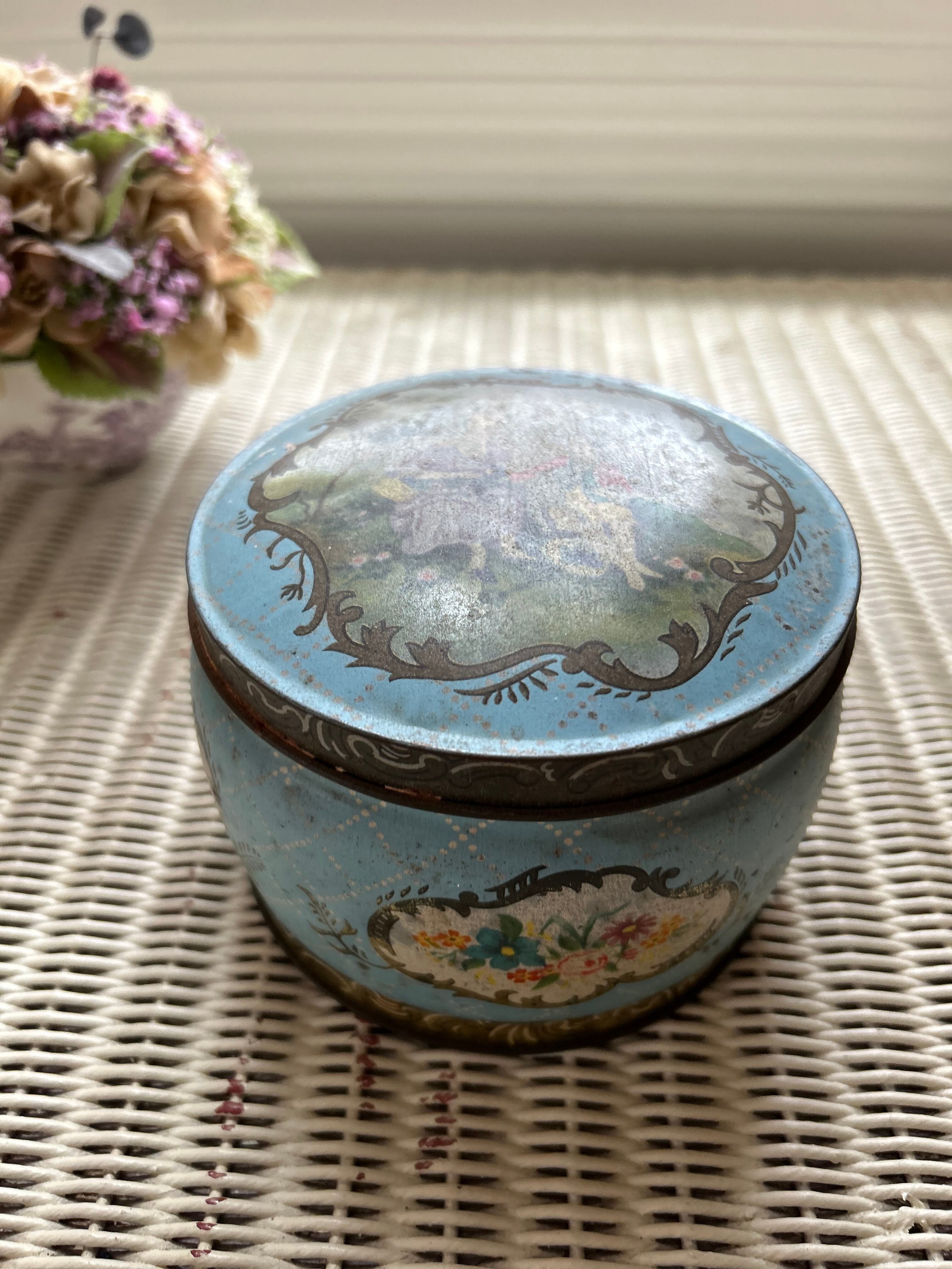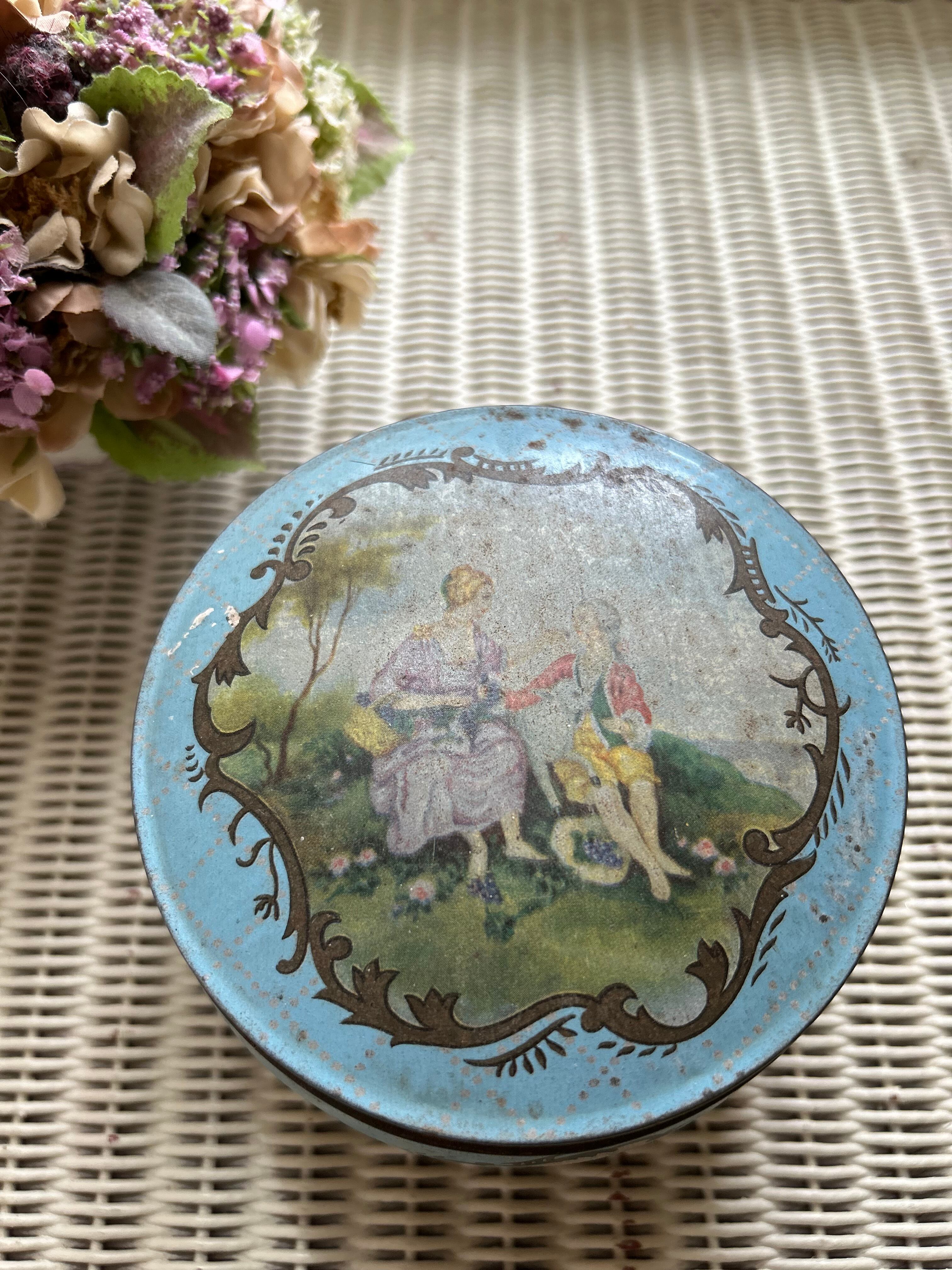 英国Vintage クラシカルなロマンス画 ラウンド型 Tin缶 小物入れ インテリア ディスプレイ