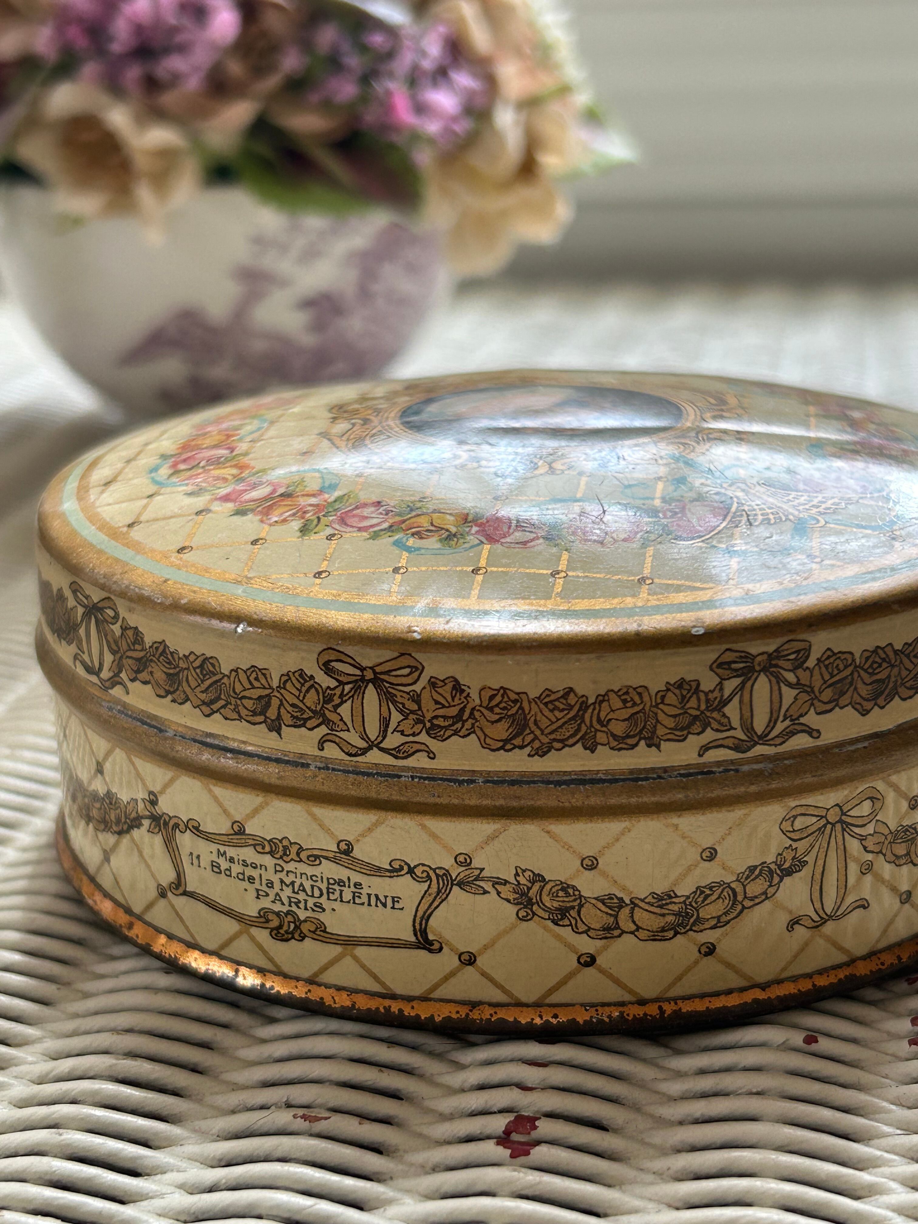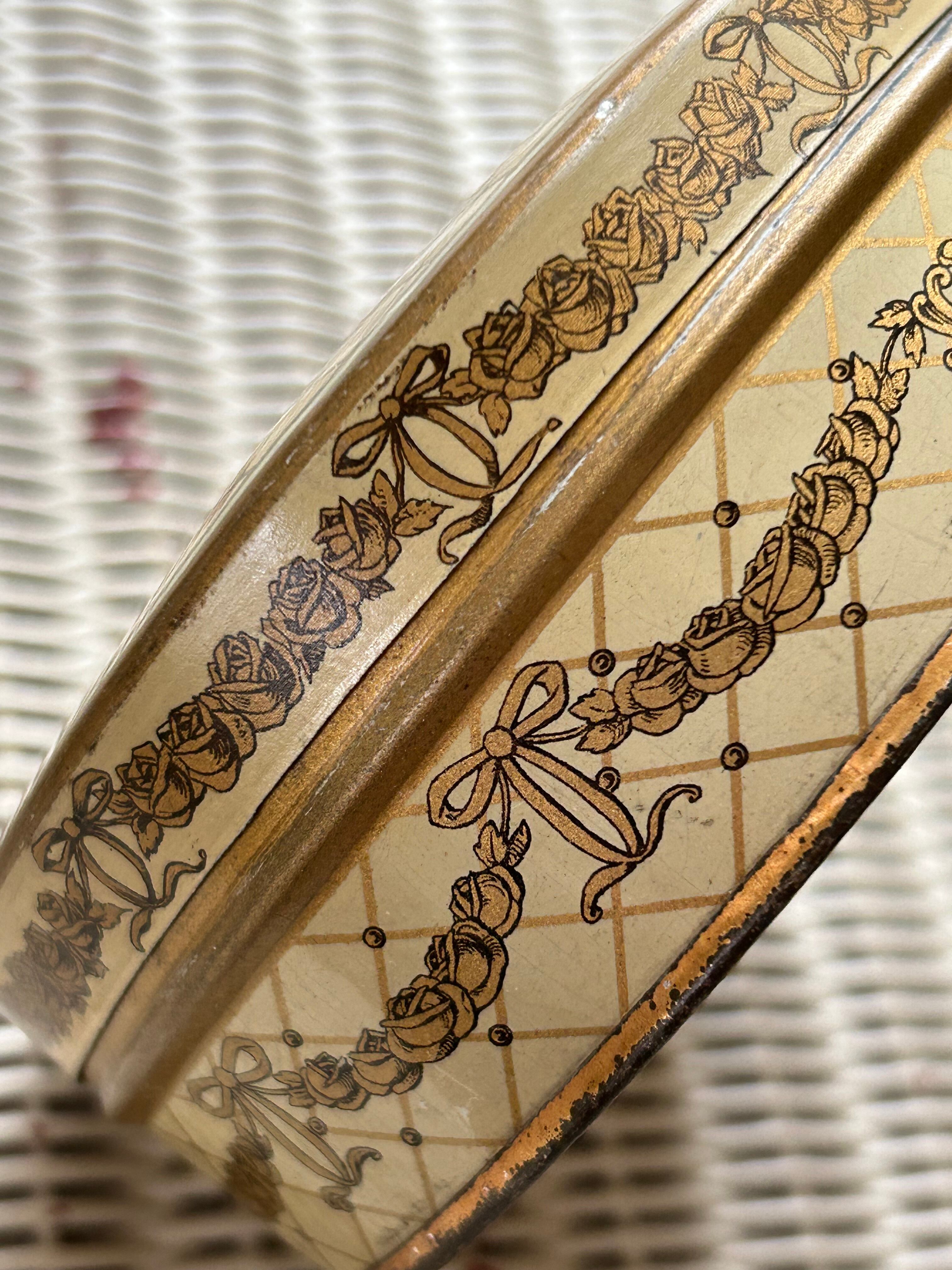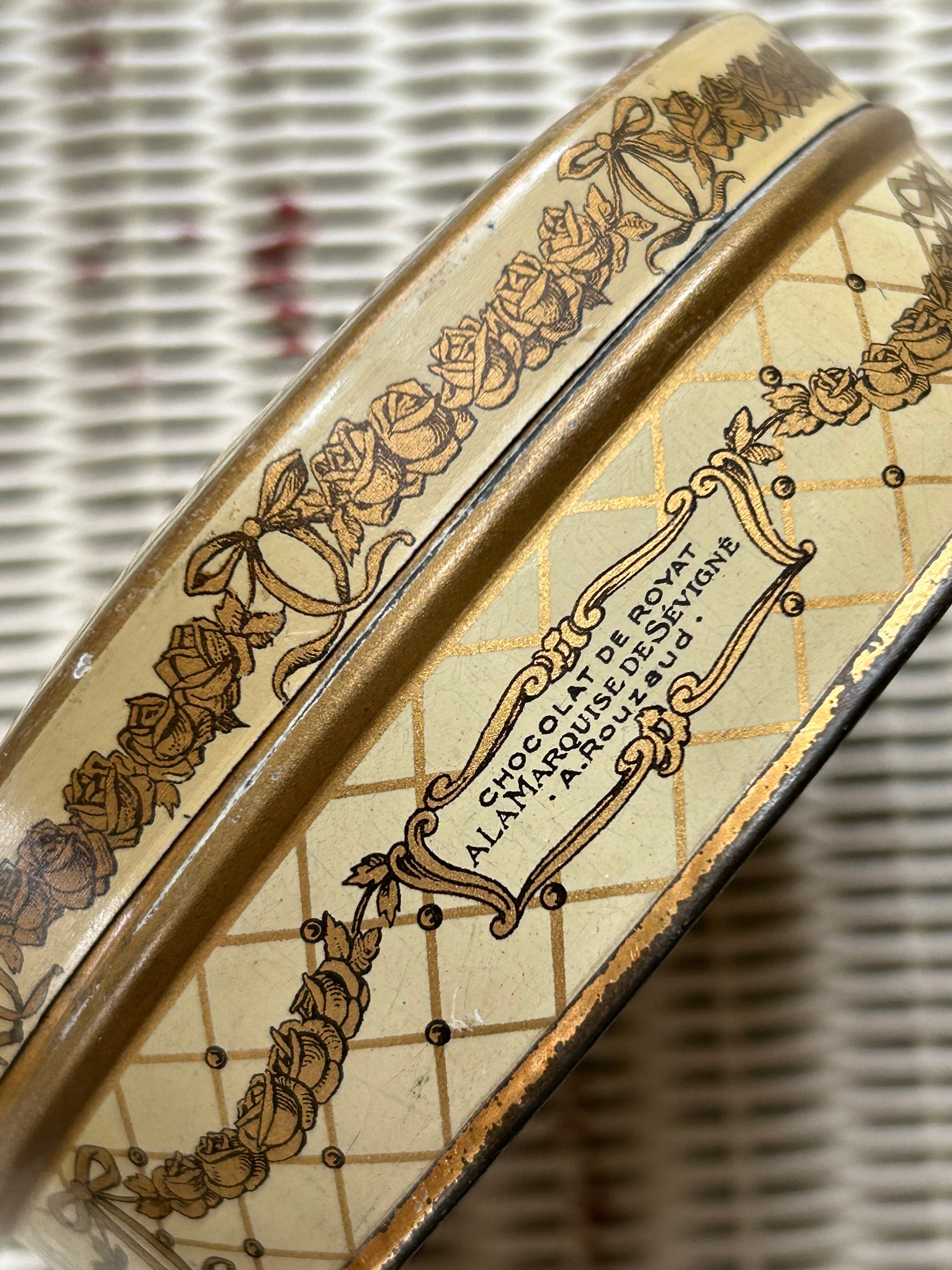 フランスVintage マルキーズ・ドゥ・セヴィニエ トフィー缶 リボンと薔薇のガーランド ロココ 小物入れ 撮影小物 インテリア