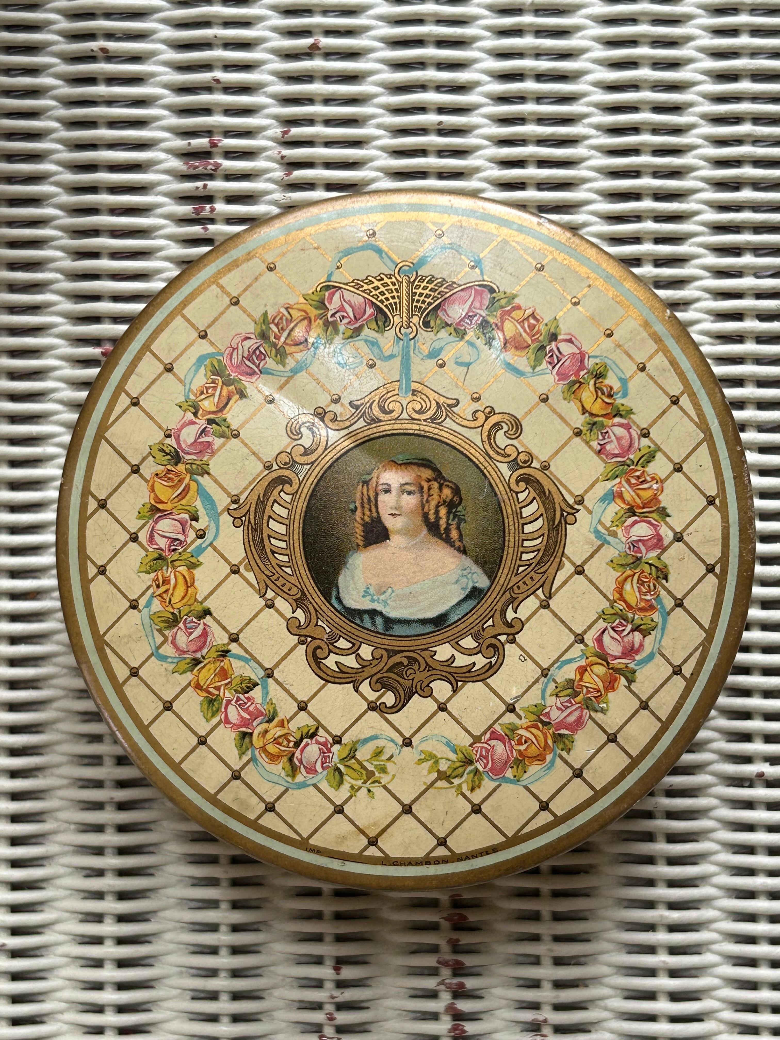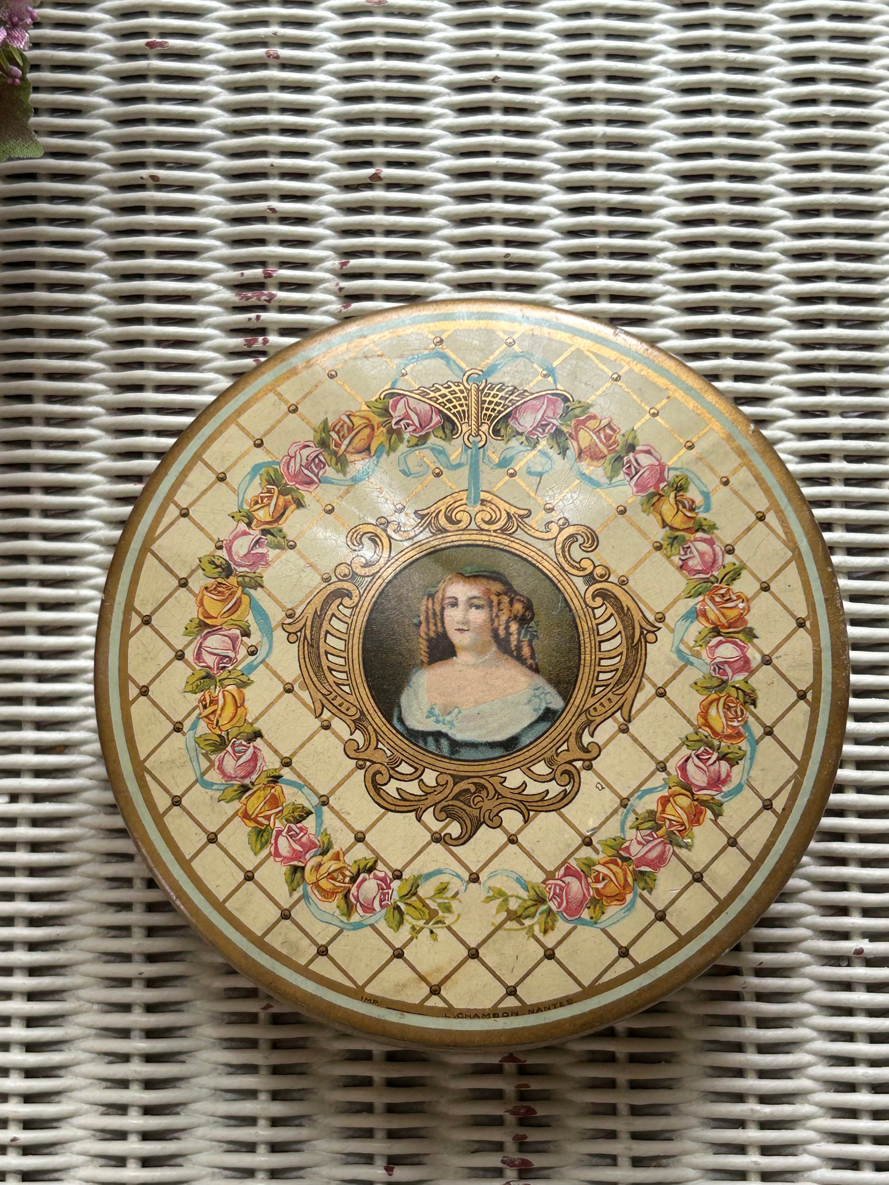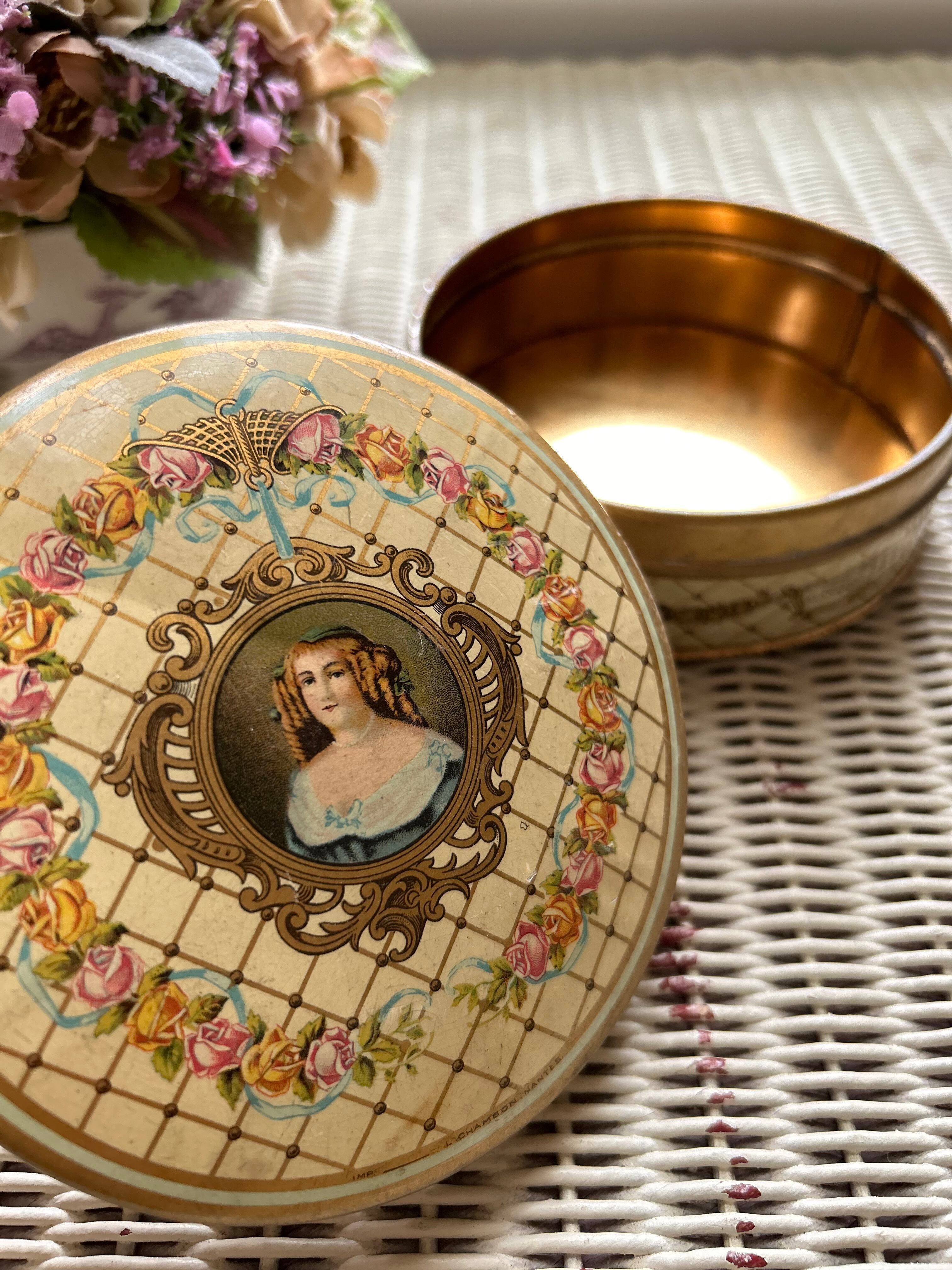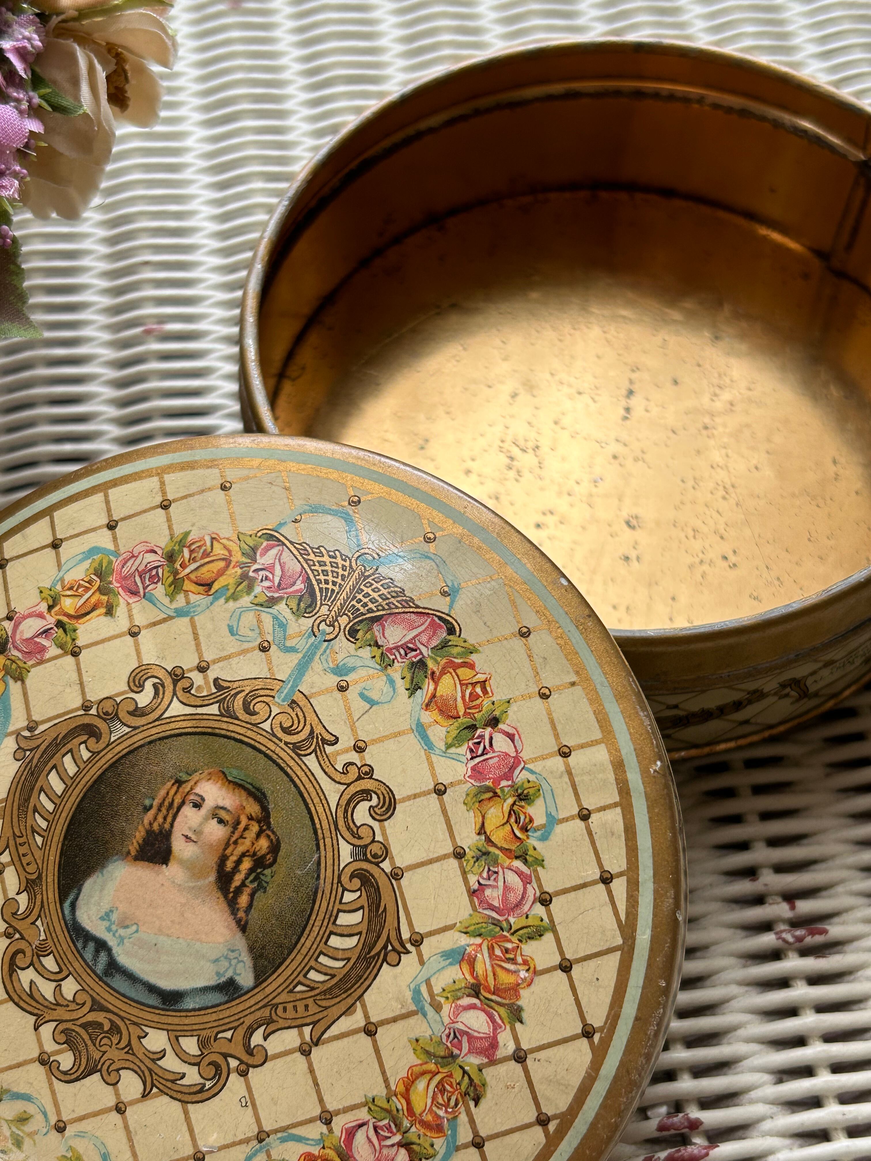 フランスVintage マルキーズ・ドゥ・セヴィニエ トフィー缶 リボンと薔薇のガーランド ロココ 小物入れ 撮影小物 インテリア