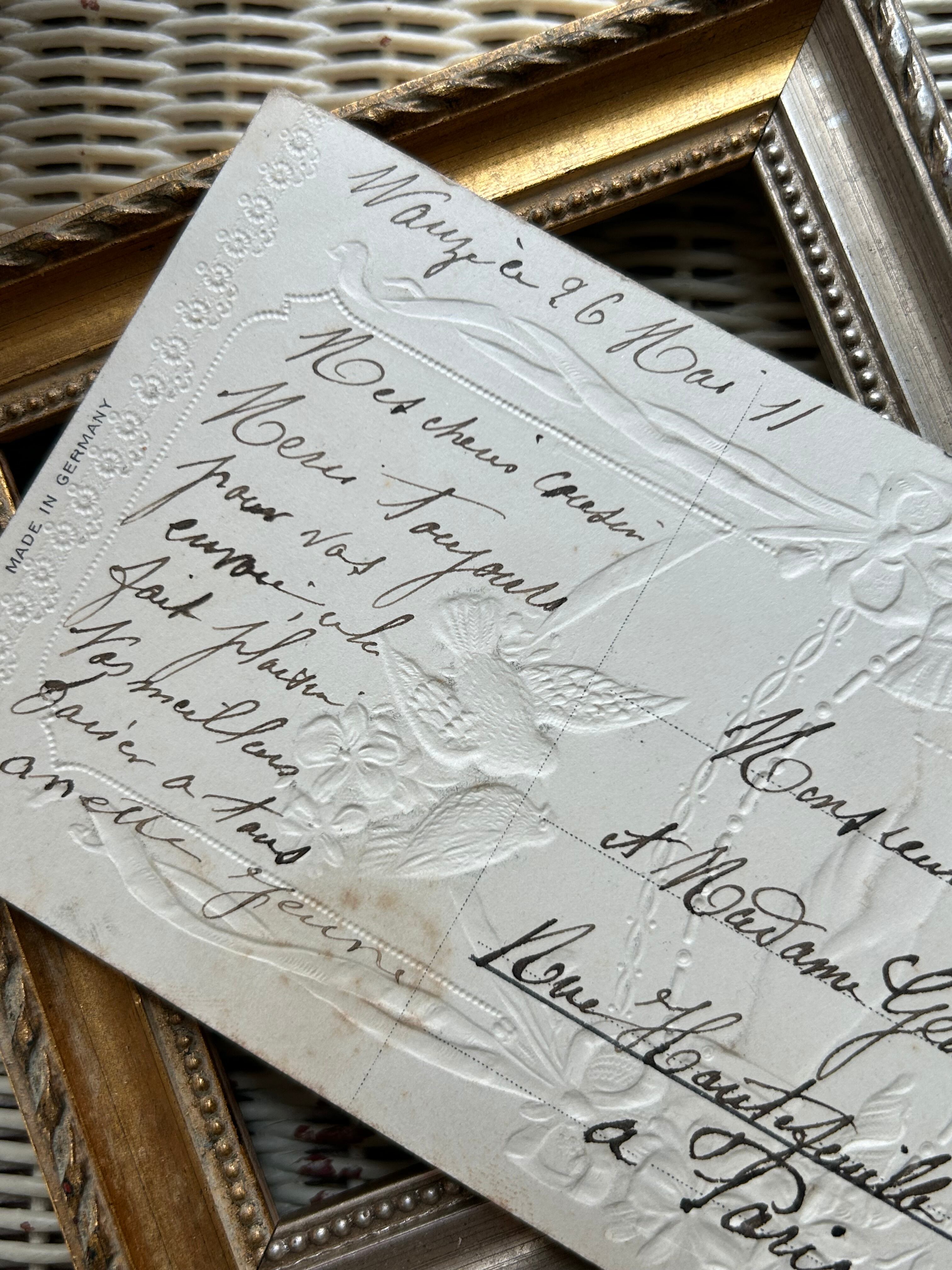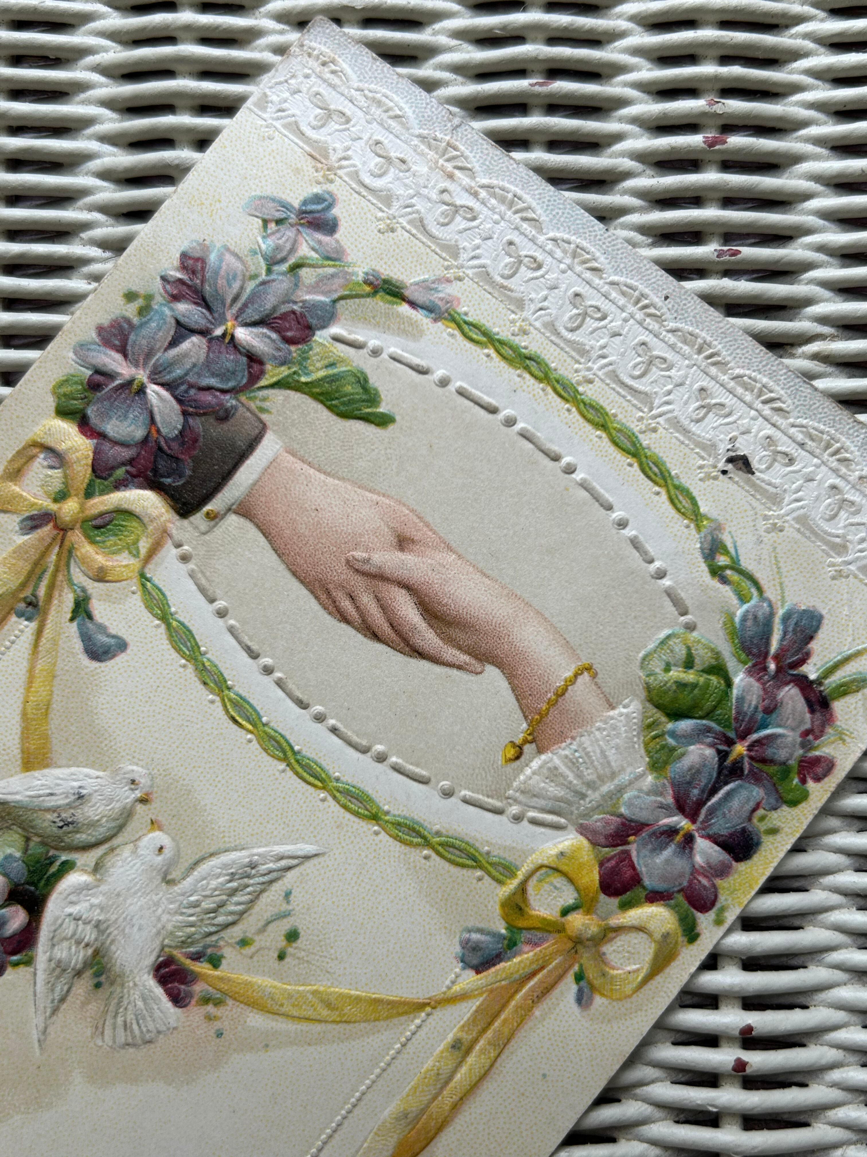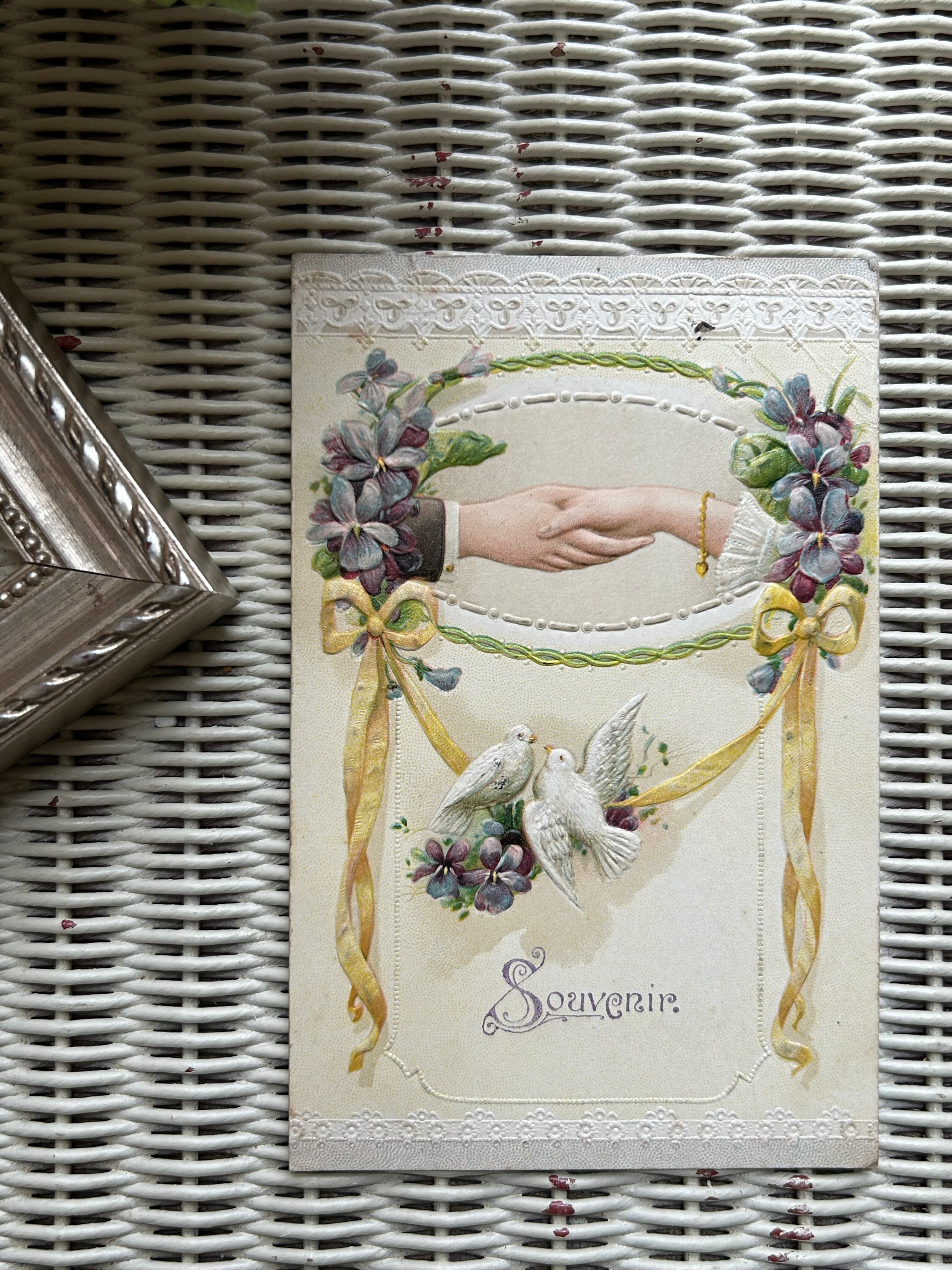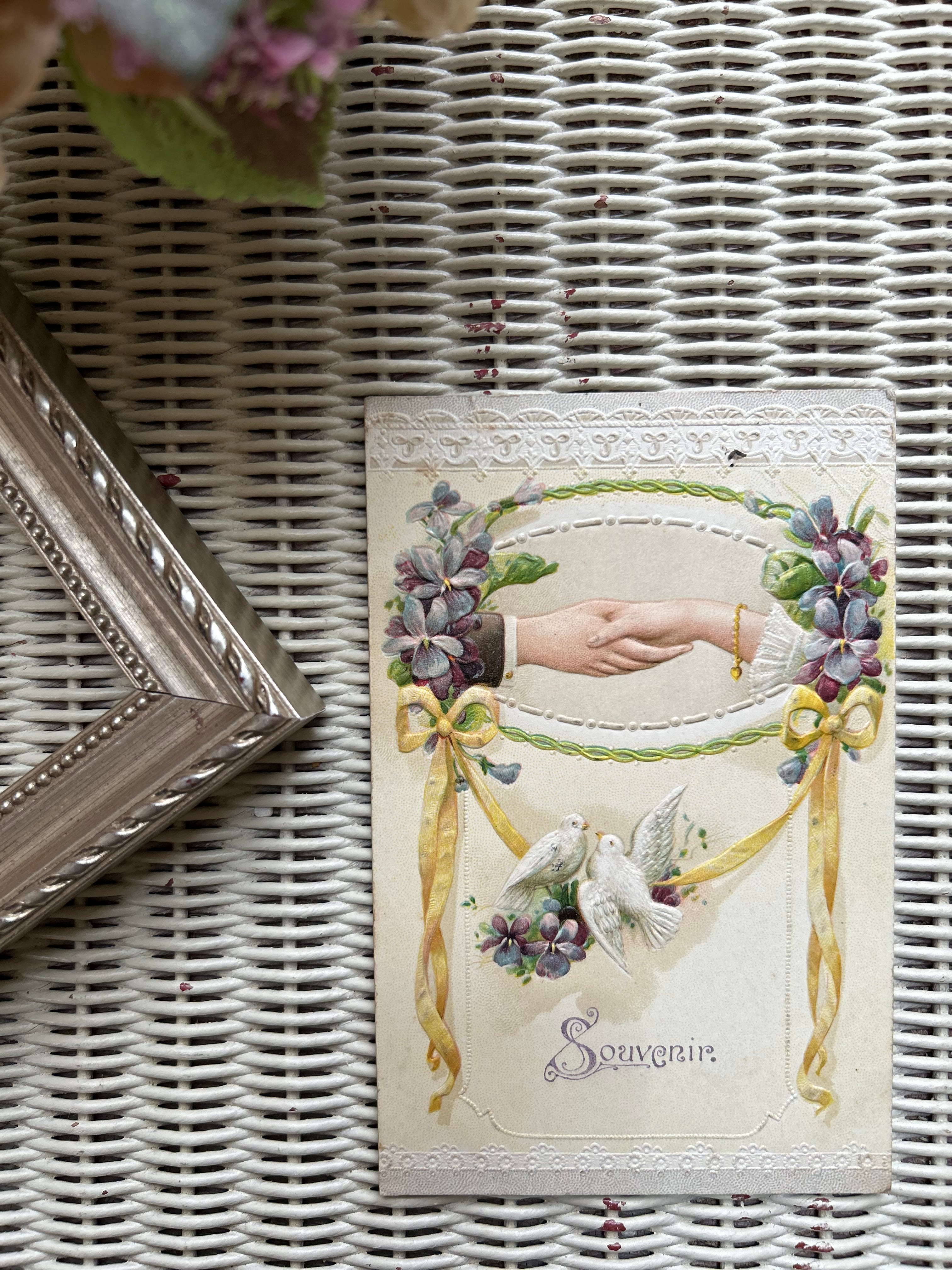 フランス アンティークポストカード すみれとリボンのガーランド 白鳩 ハンド レース エンボス加工 額装 インテリア