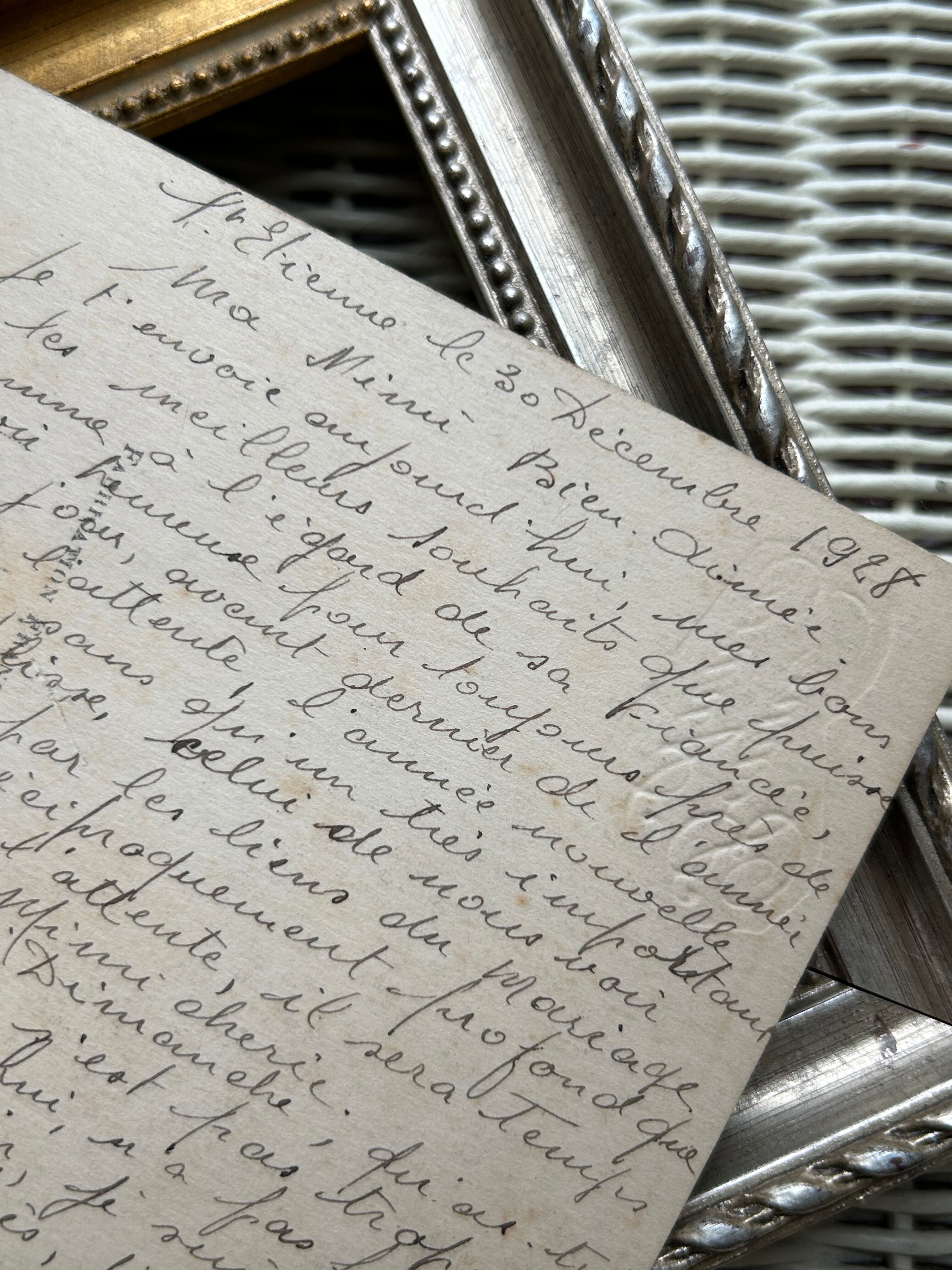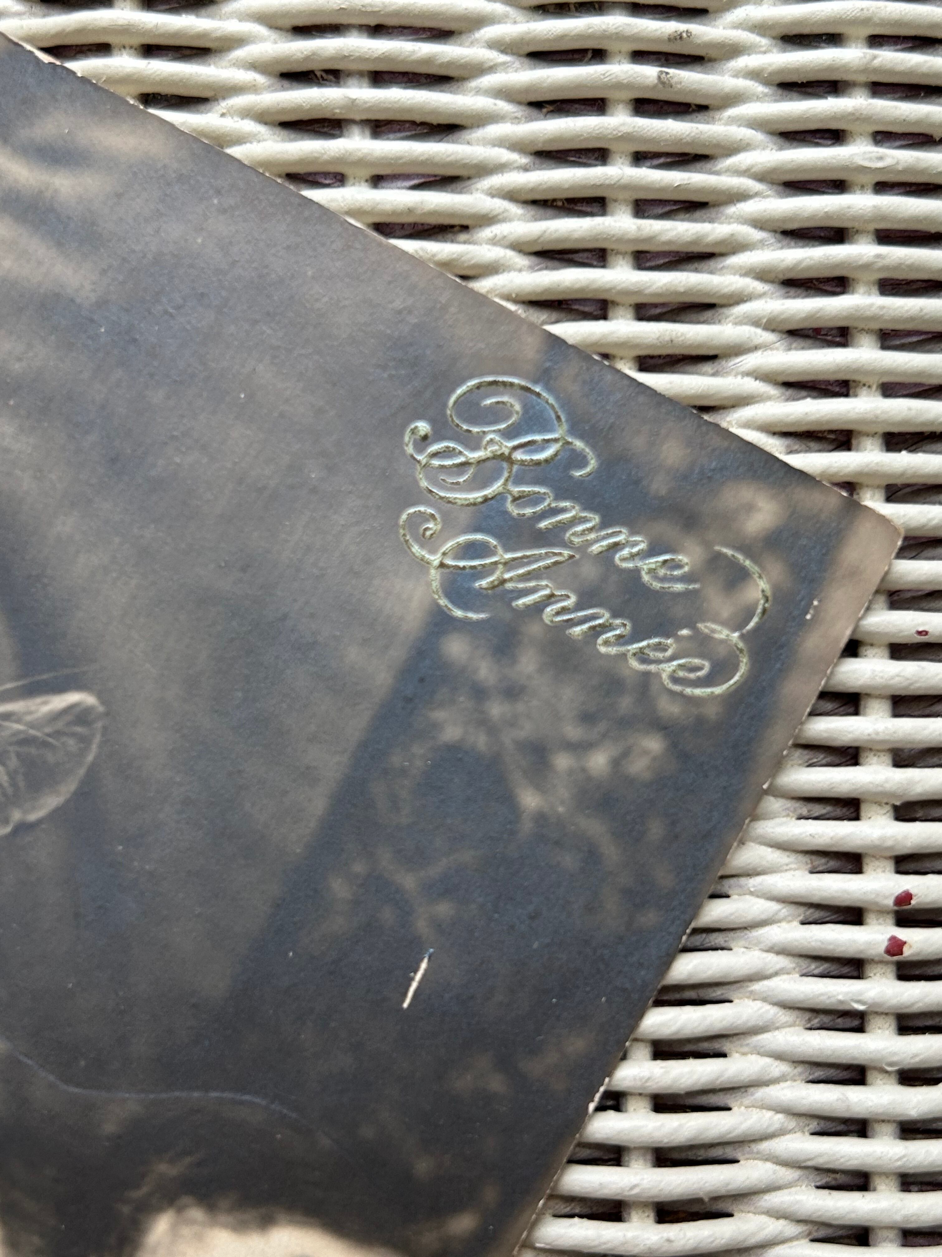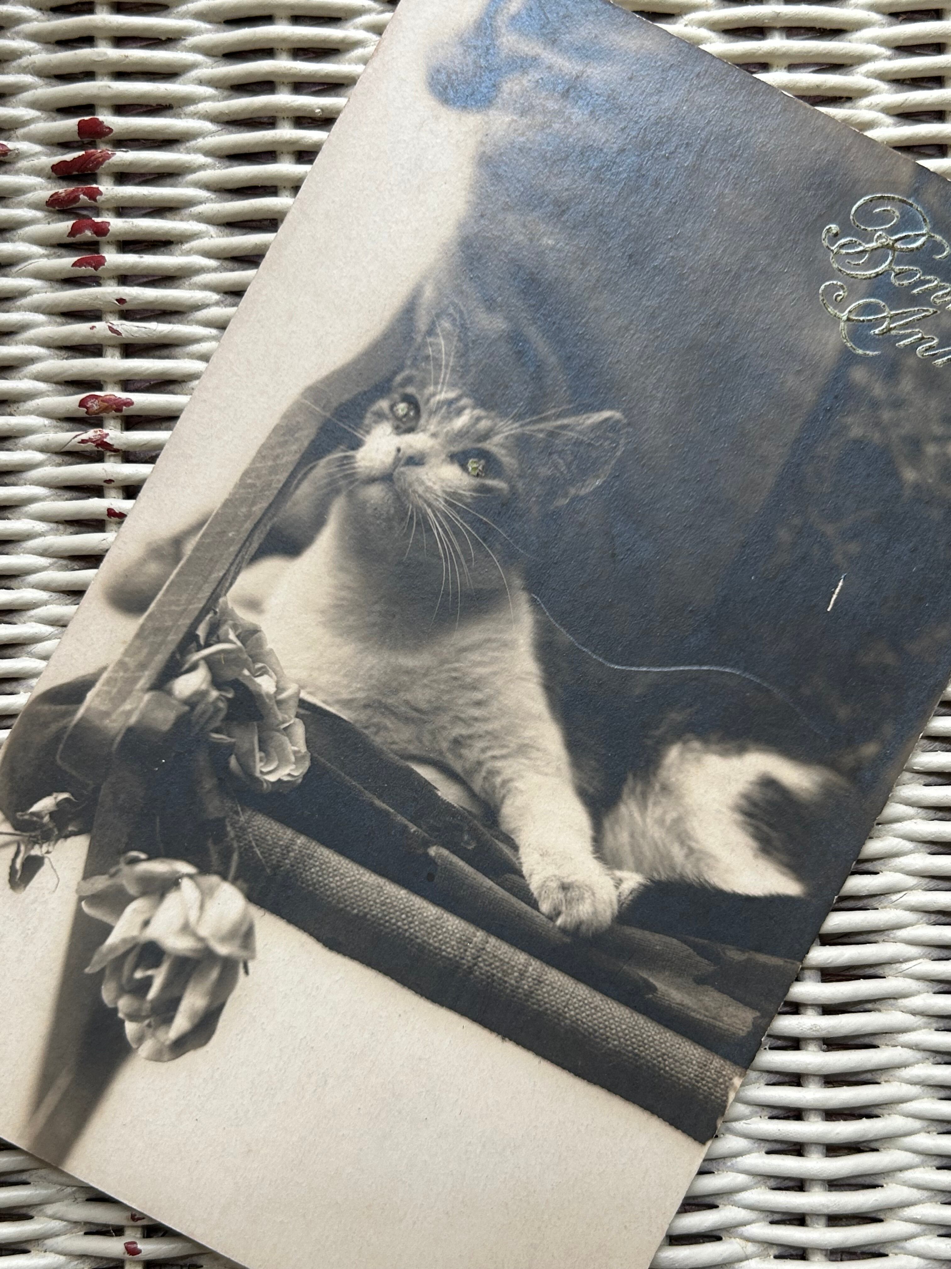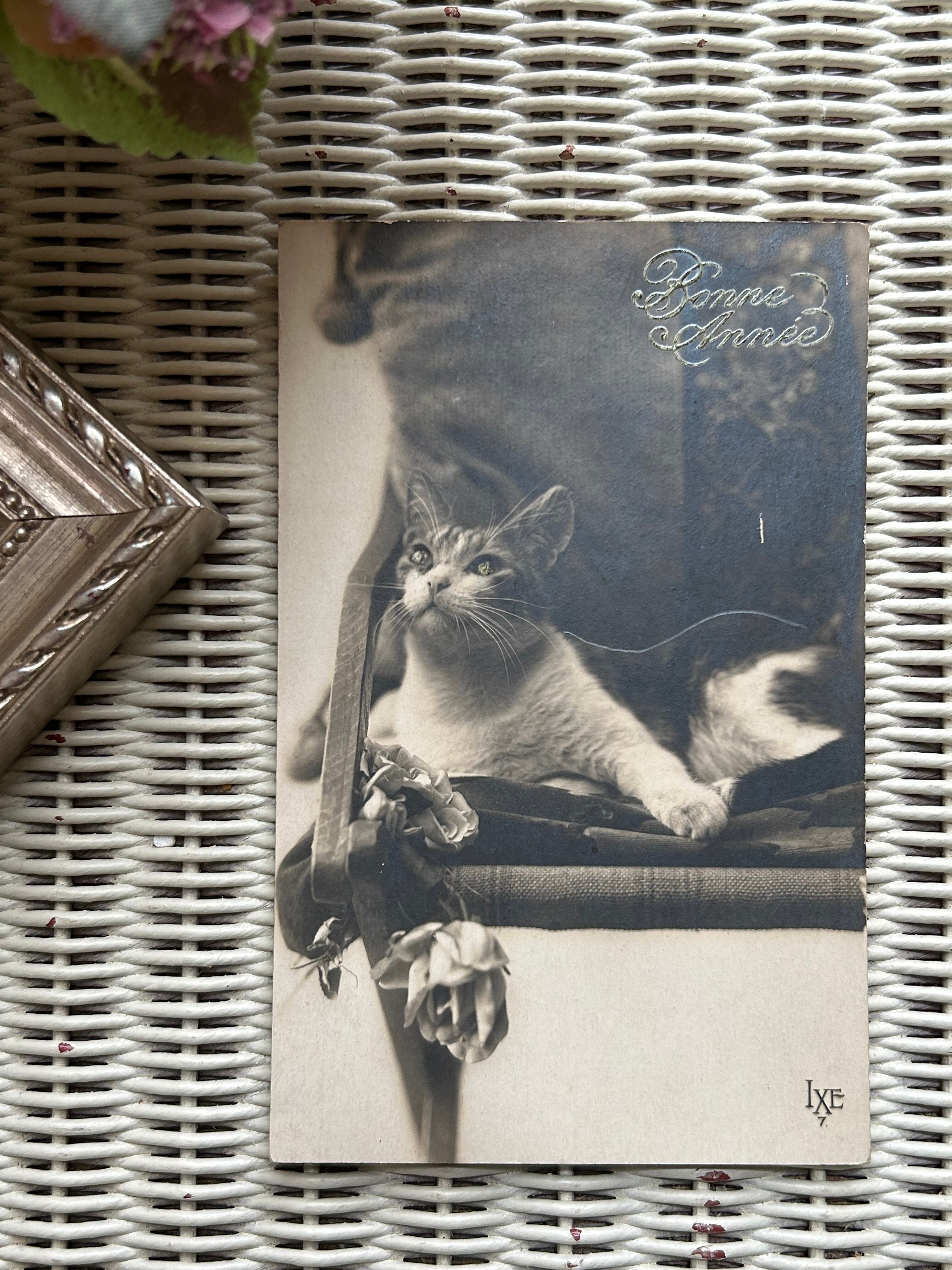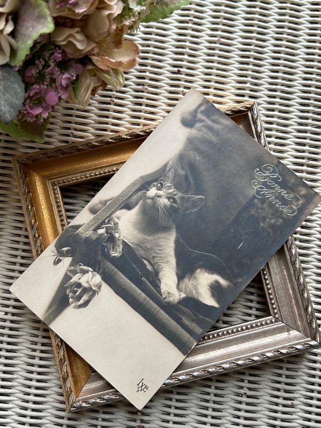 フランス アンティークカード 1928年 chat 猫 セピアカラー Bonne Annee 額装 インテリア