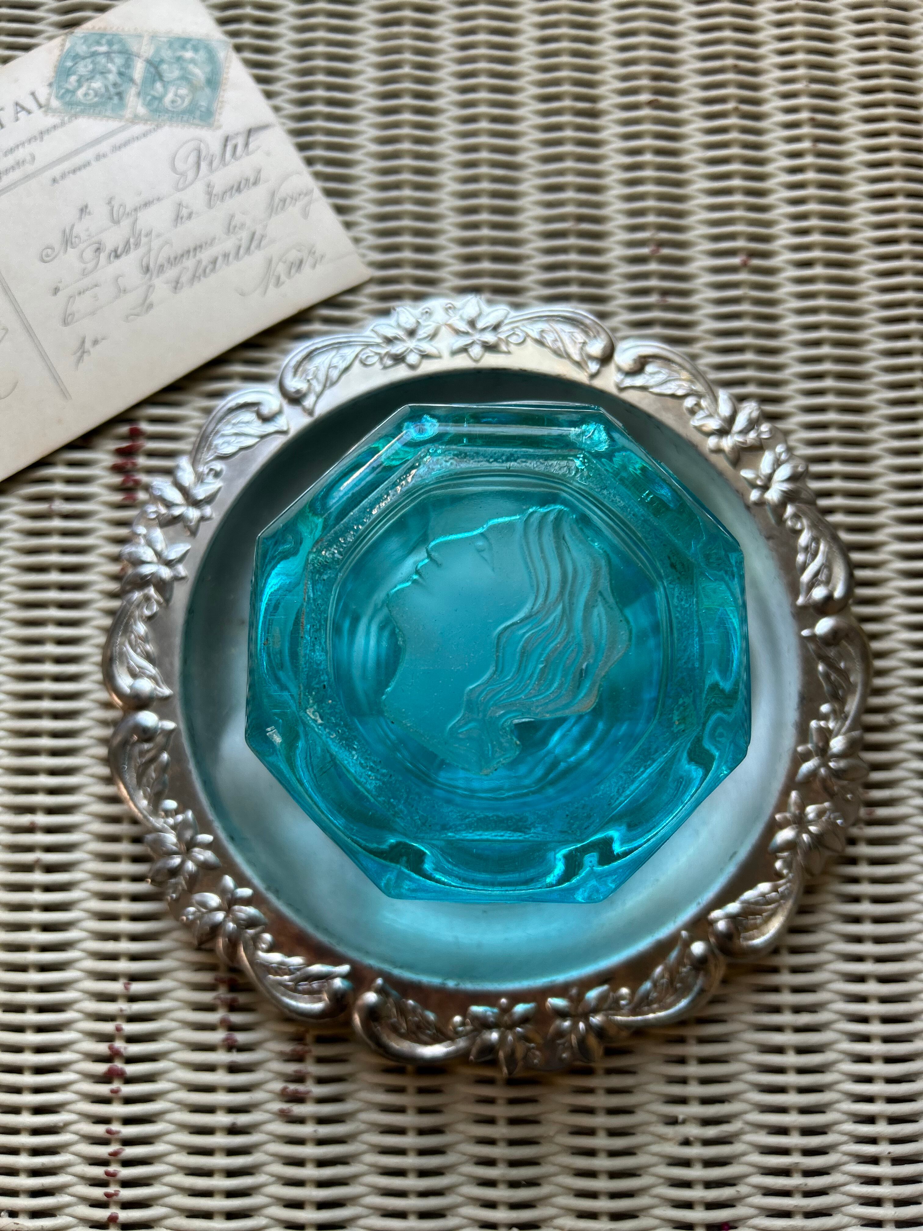 ブルーガラスが美しく、ギリシャ神話をモチーフにしたような人物の横顔はクラシカルで雰囲気のあるガラスの小物入れ。