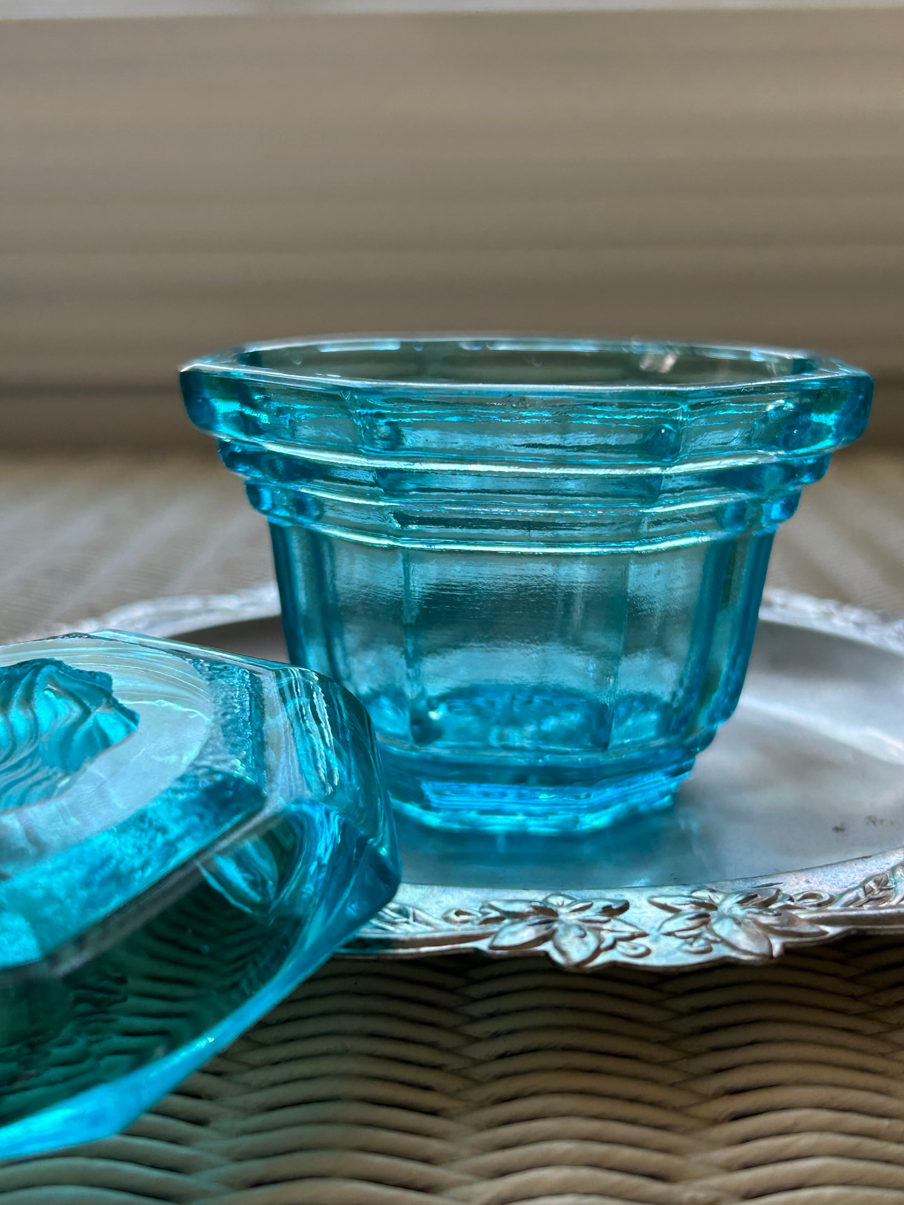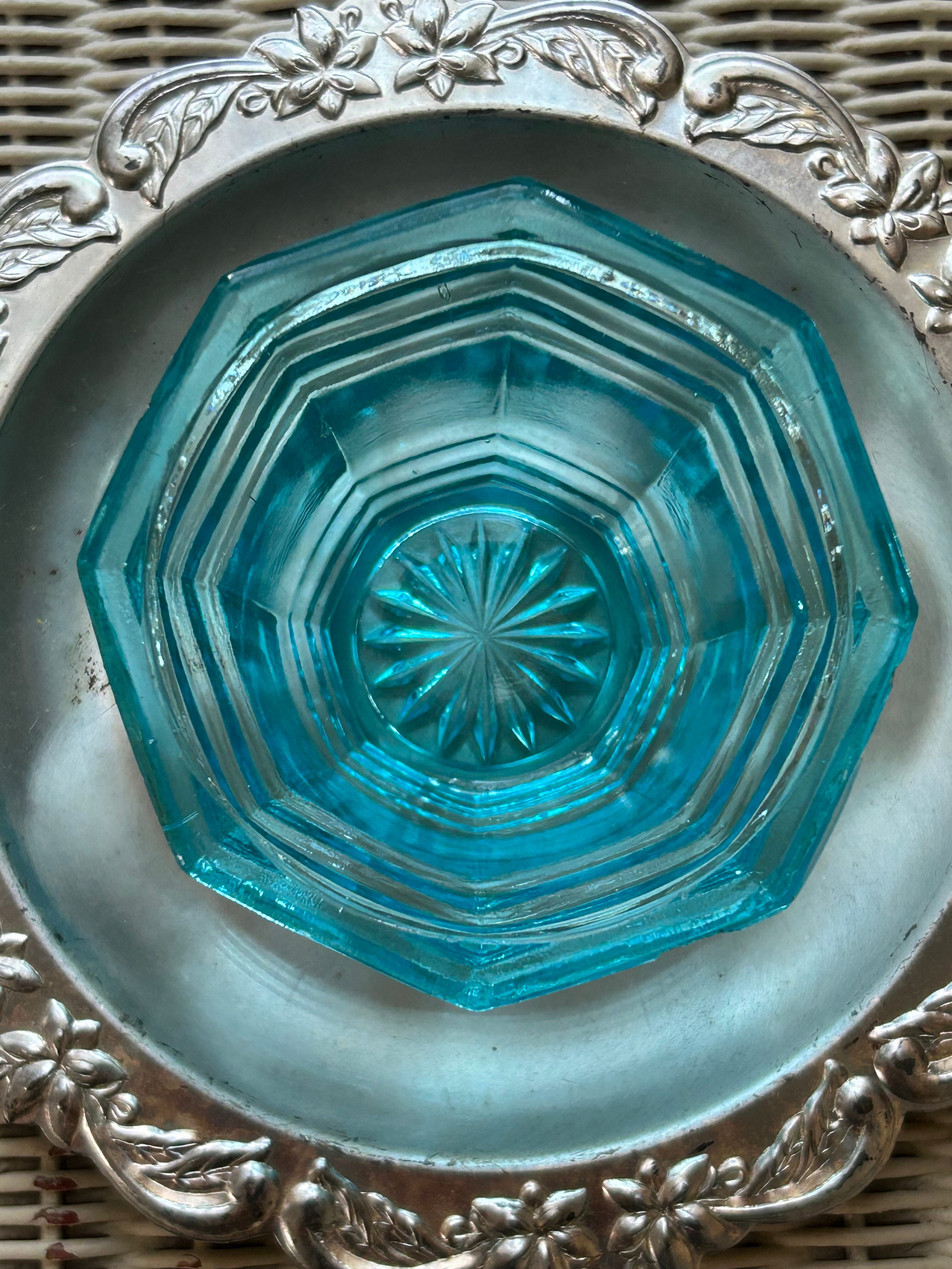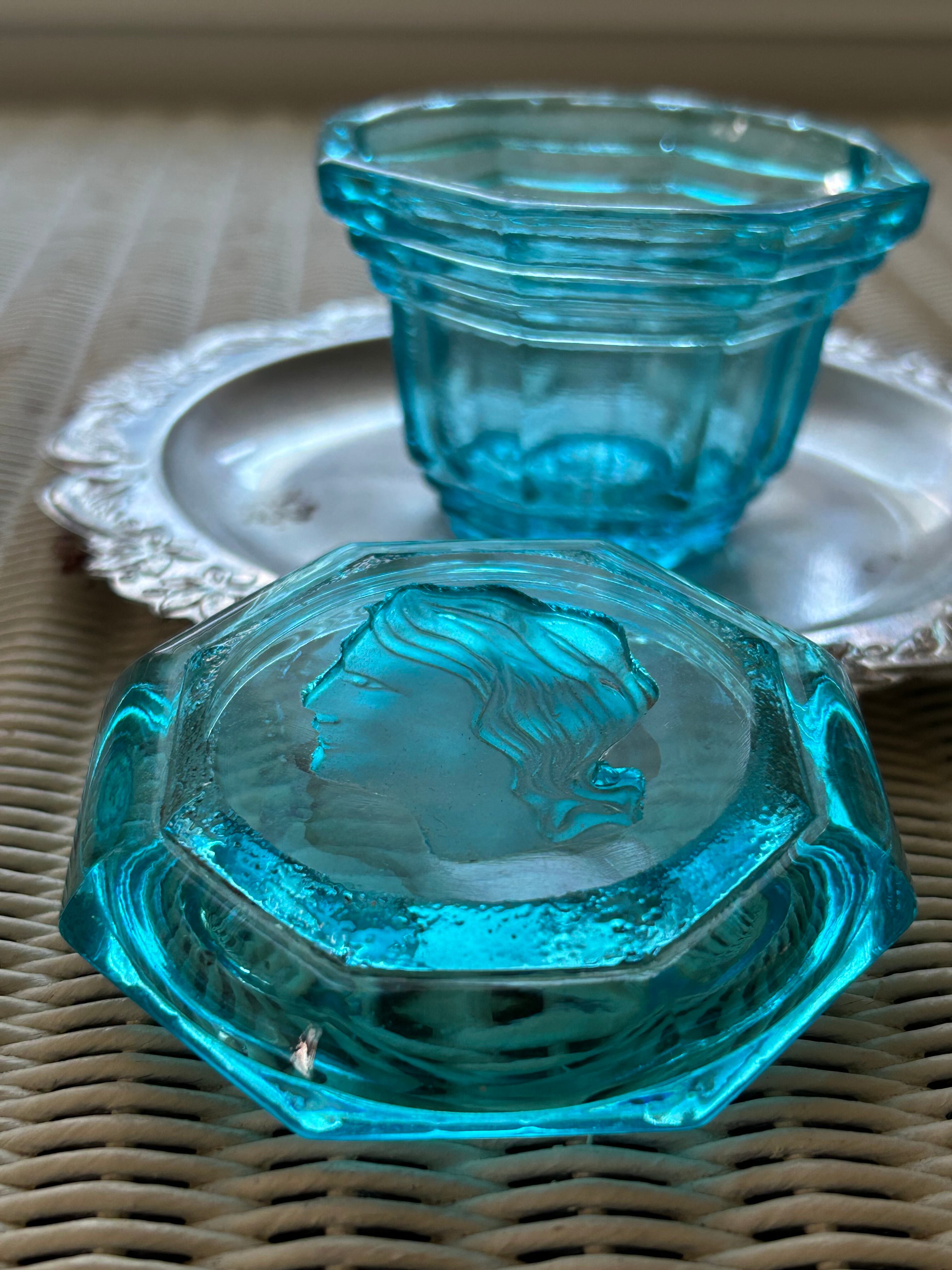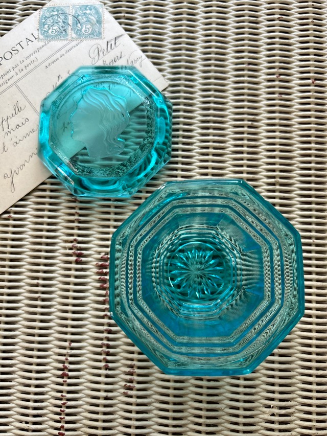 英国 アンティーク 八角形のガラスのトリンケット アルテミス ブルーガラス 小物入れ インテリア
