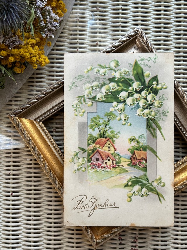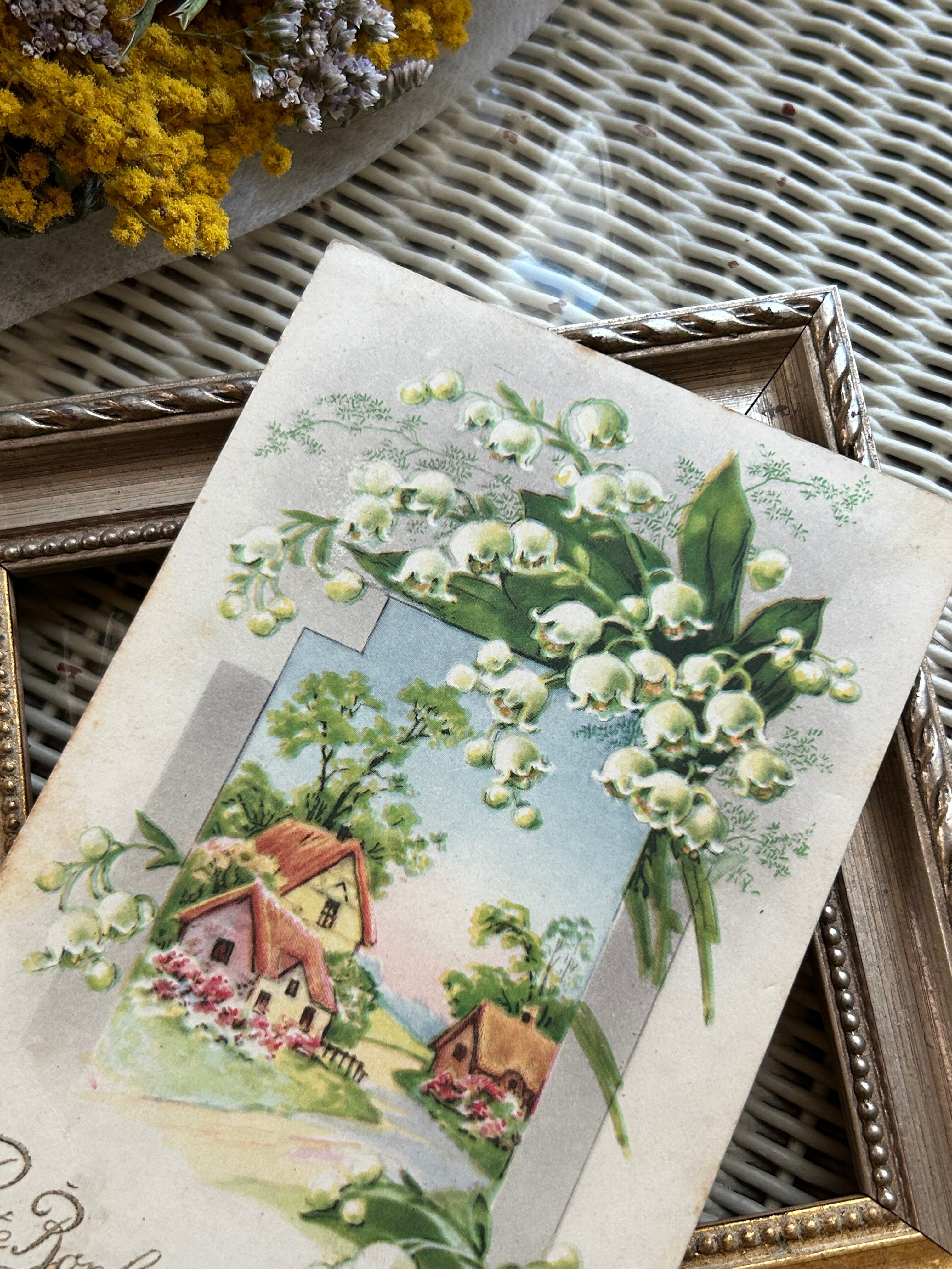 フランス アンティークカード porte-bonheur(ポルト-ボヌール) Muget すずらんのブーケ 1946年 額装 インテリア