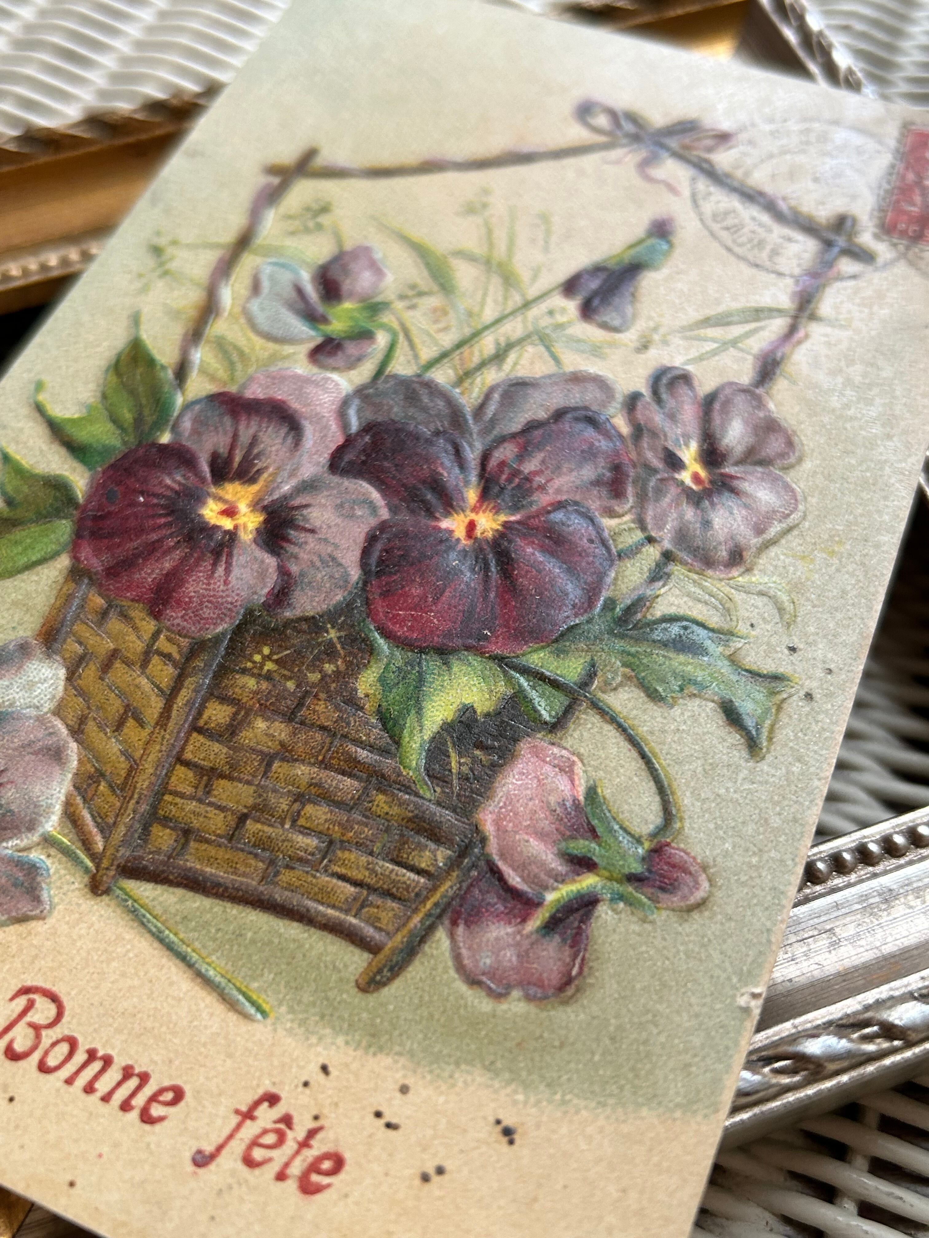 アンティークポストカード パンジーの花籠 Pansy 額装 インテリア フランス Bonne fete エンボス BE