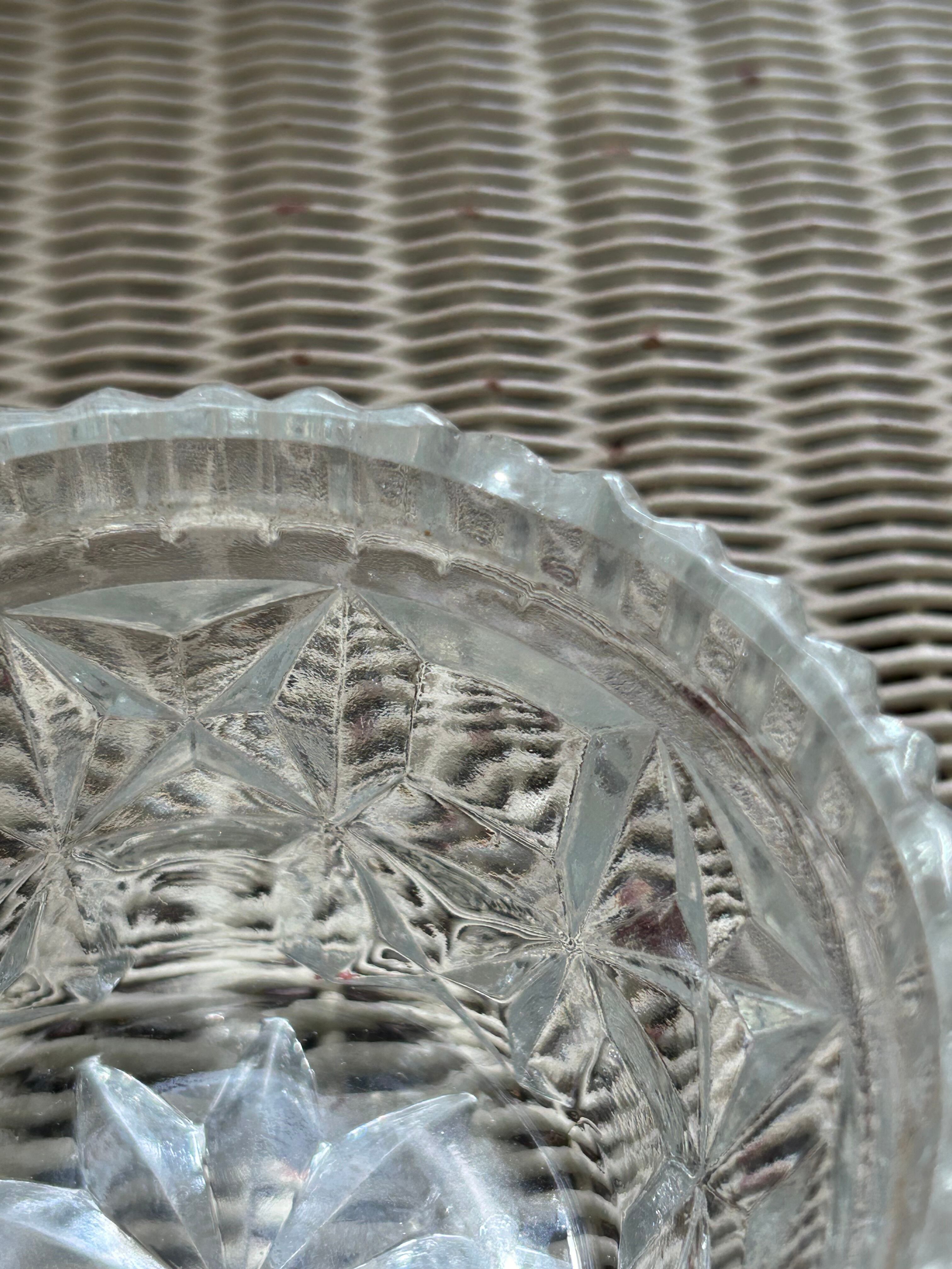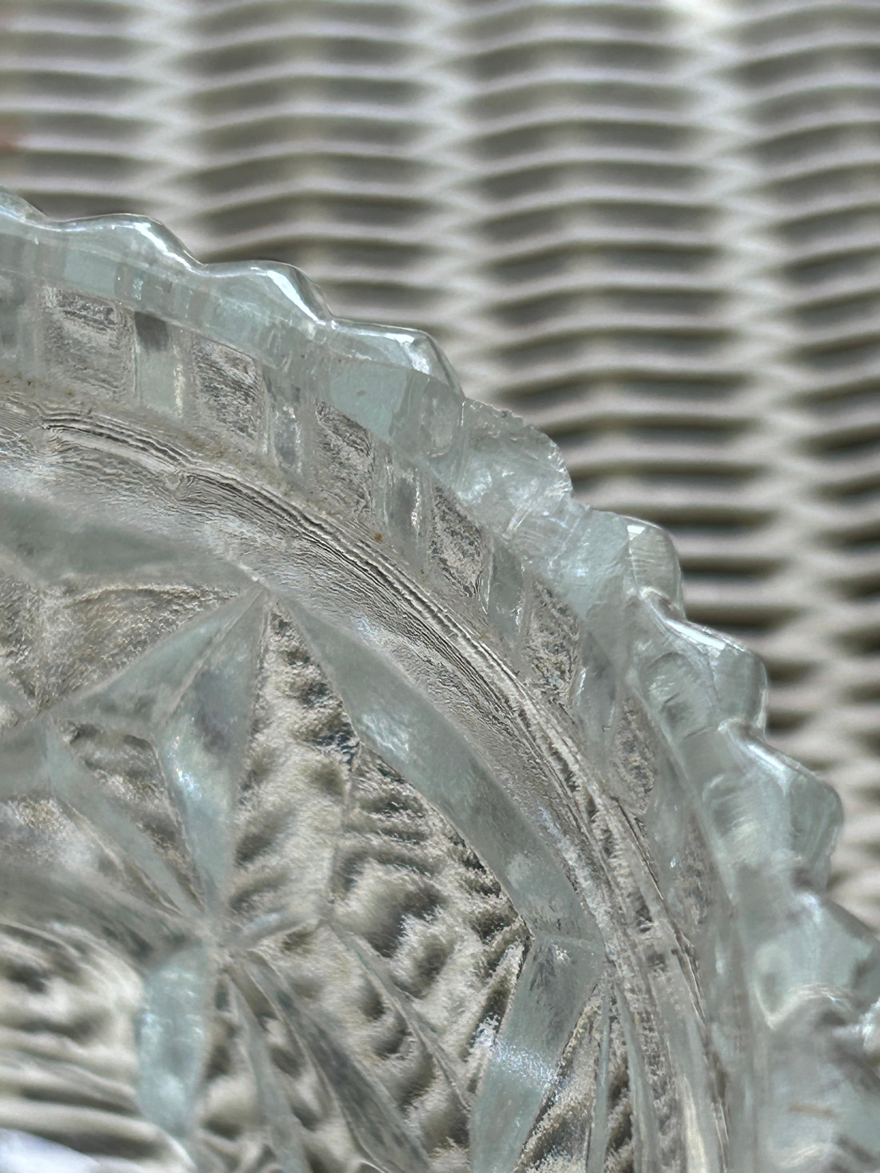 時代を経た古いガラスの小物入れでございます。 経年によるスレ、小傷、汚れ、くすみなどがございます。画像のようなな欠けがございます。どうぞご了承の上お買い求め下さい。