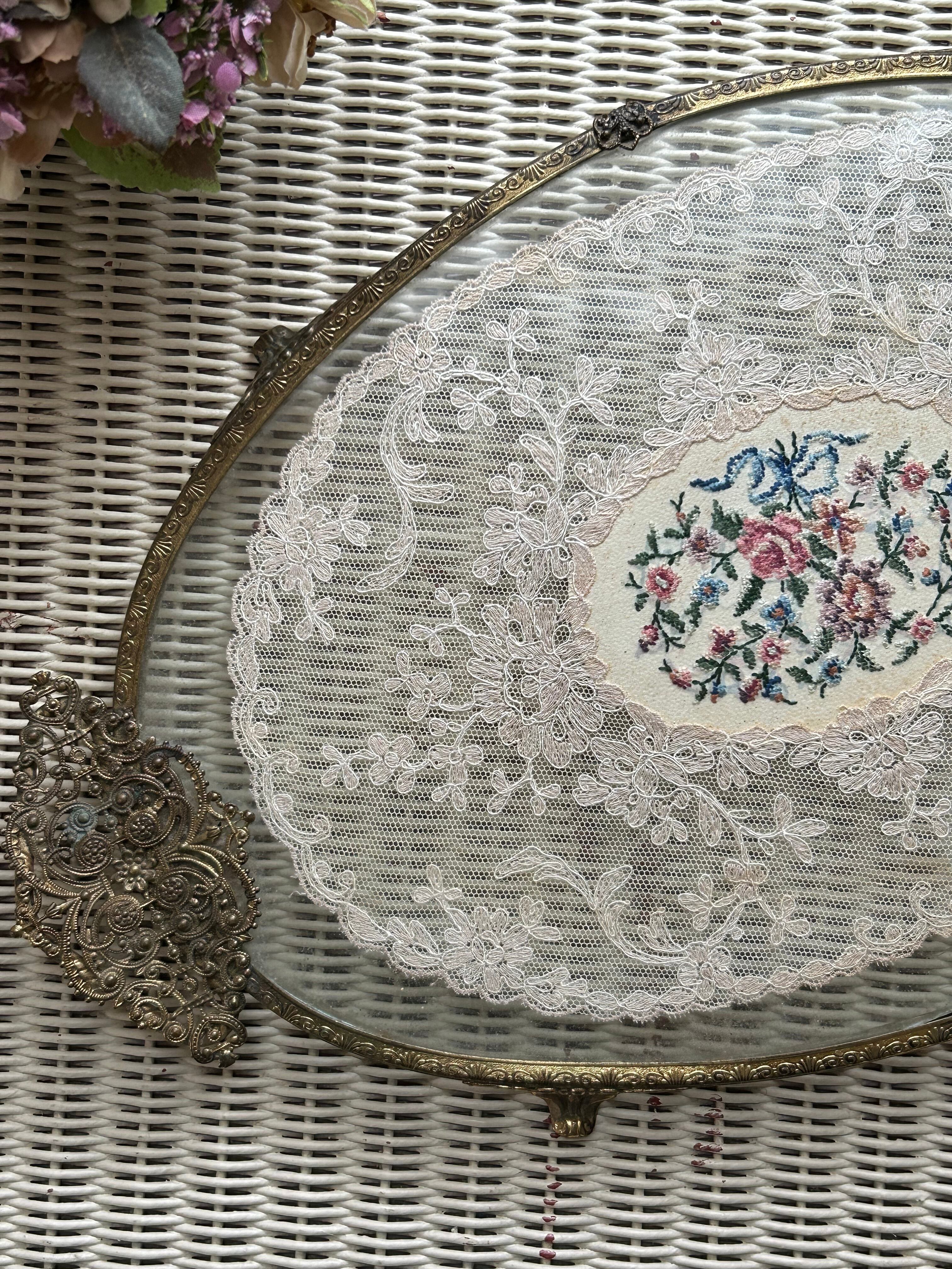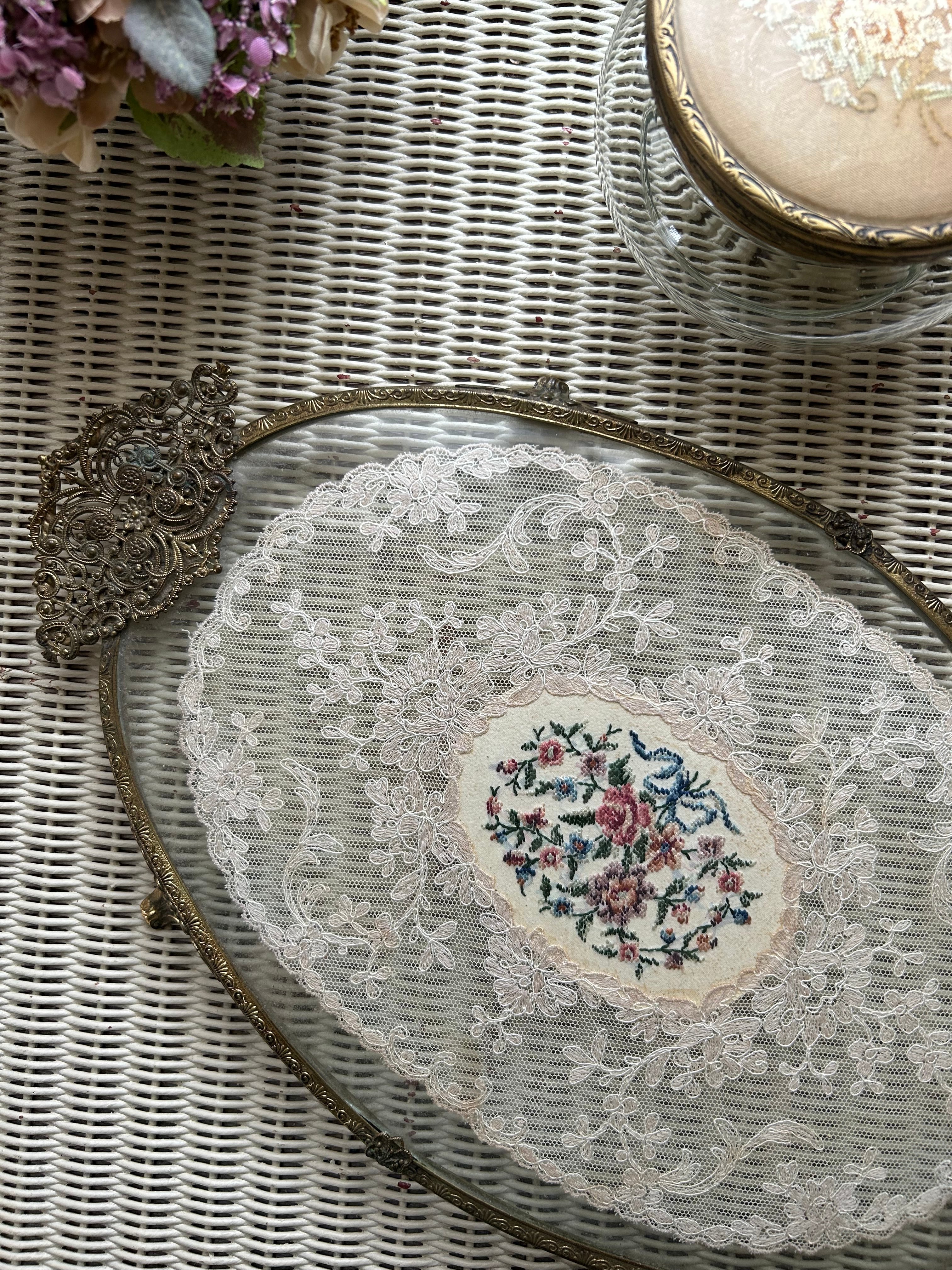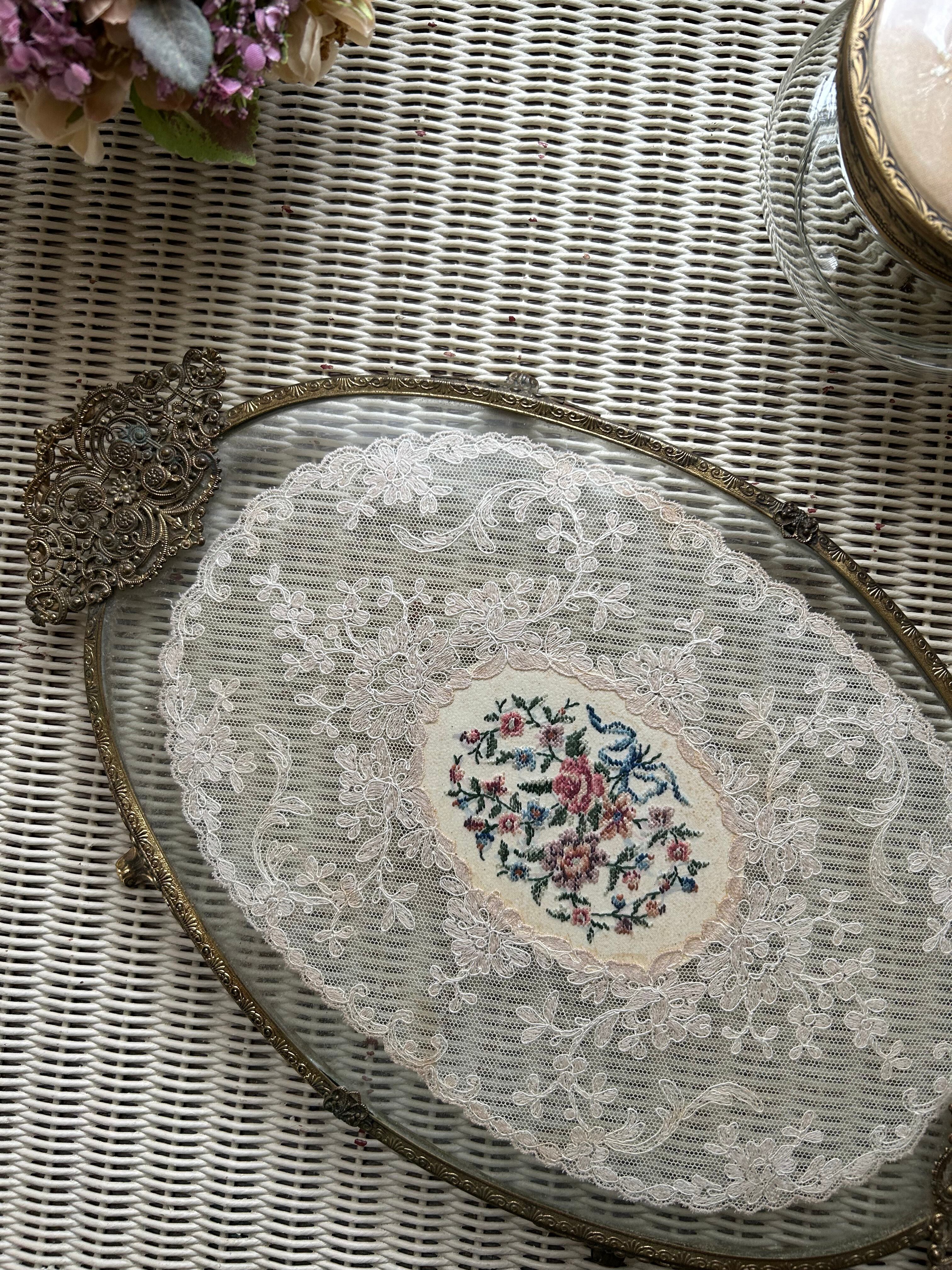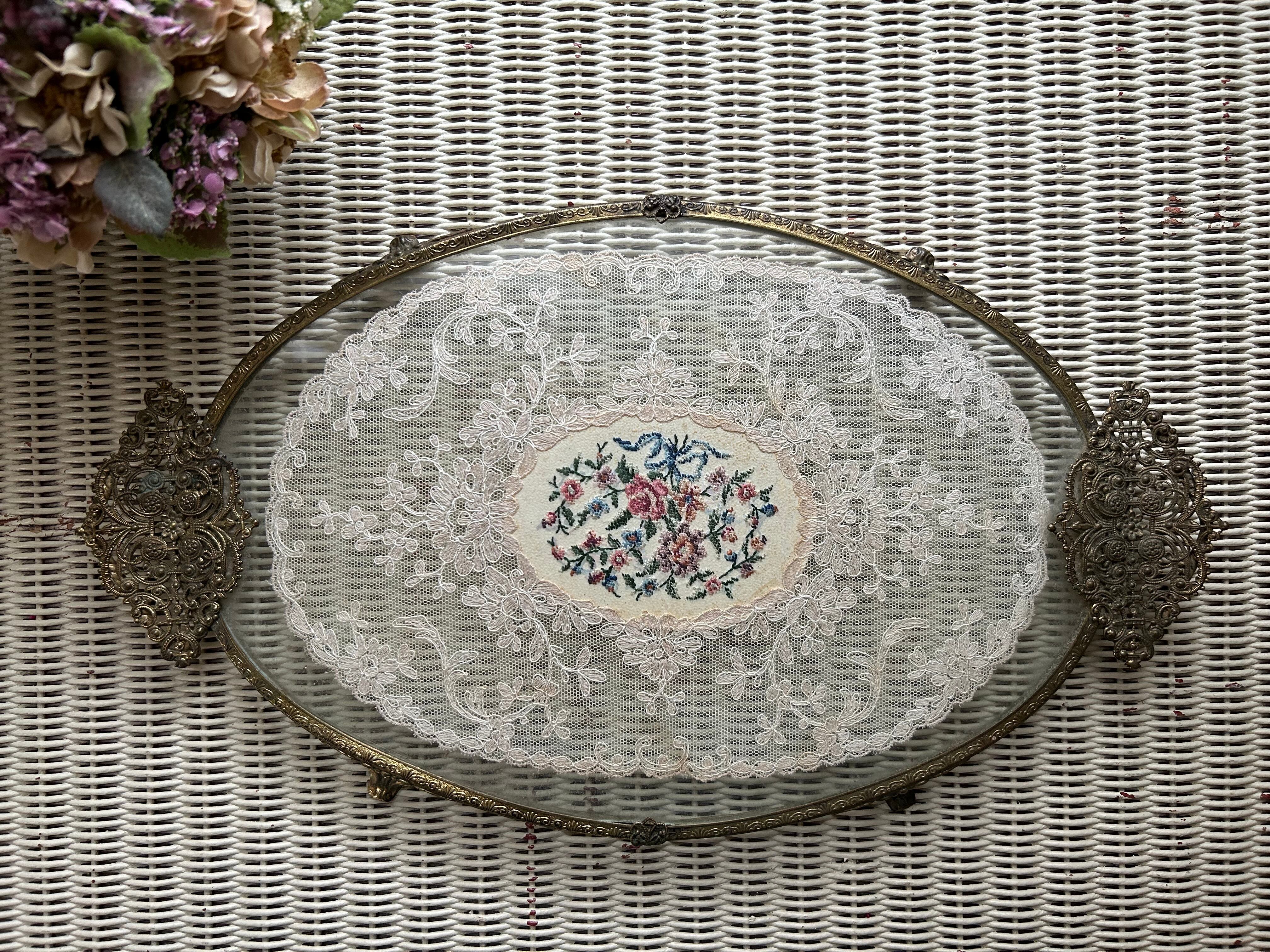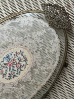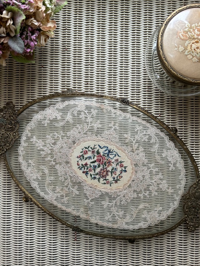 英国アンティーク プチポワン ドレッシングトレイ イギリス 刺繍 ガラス オーバル型 インテリア 店舗什器