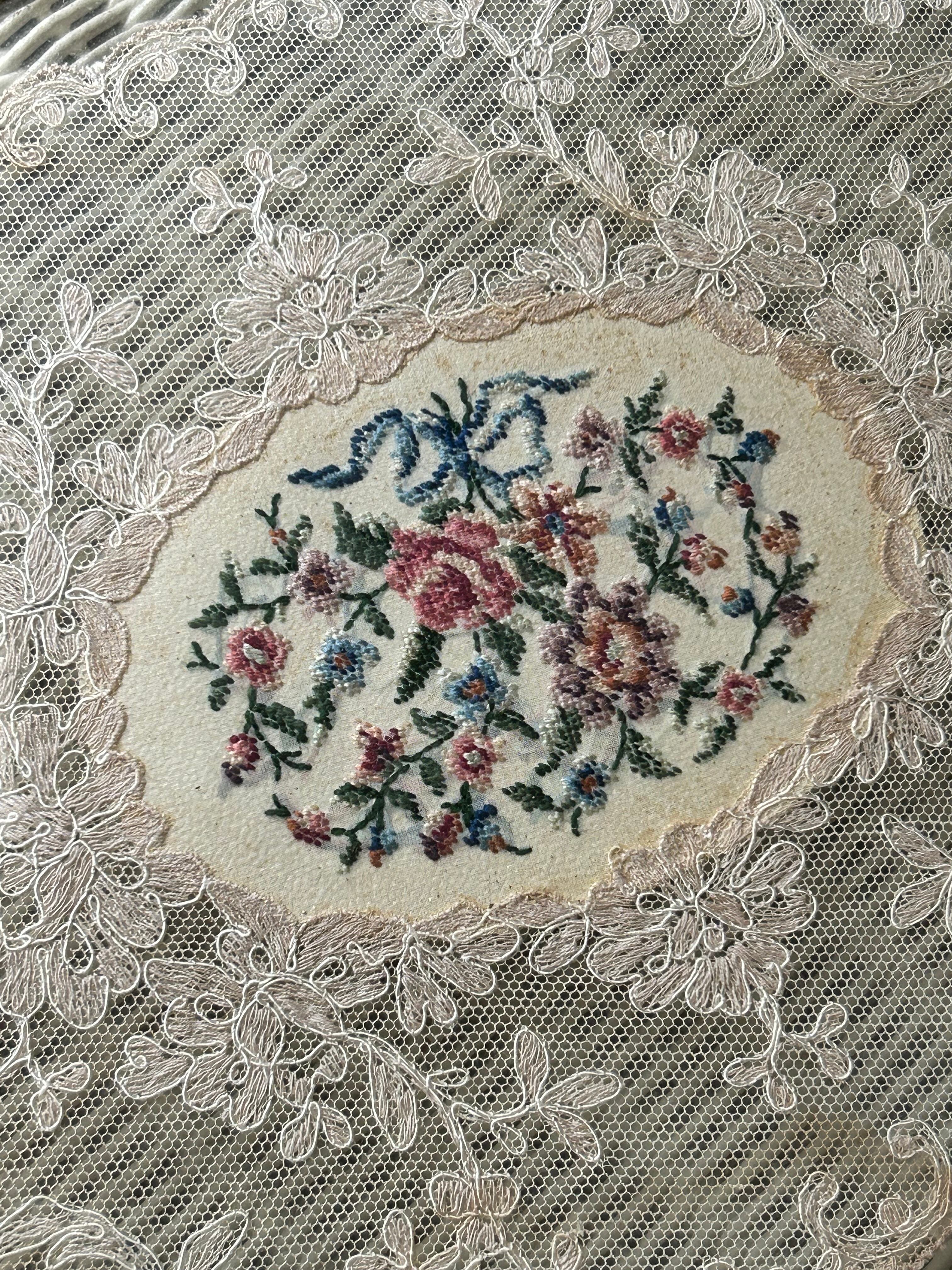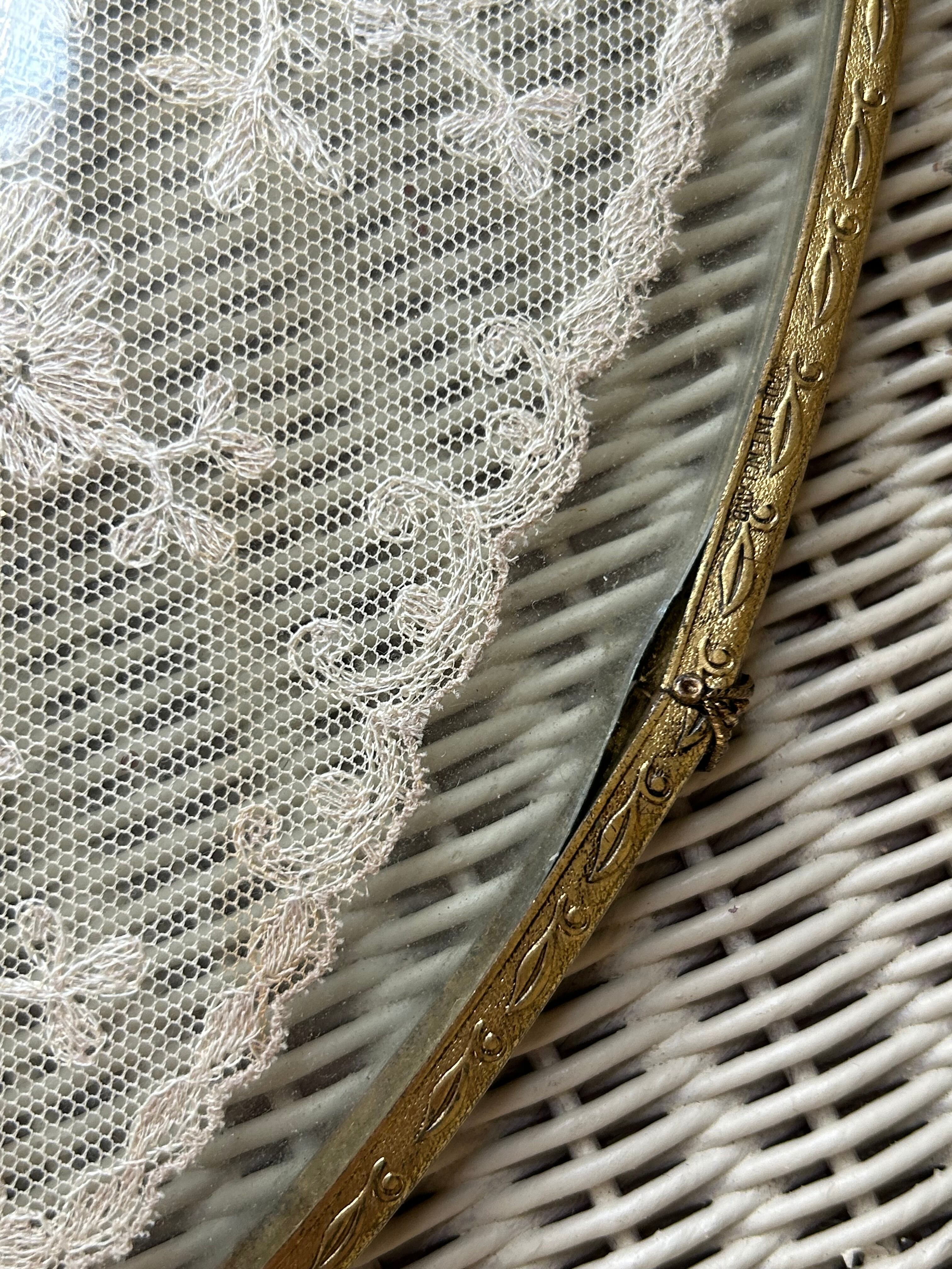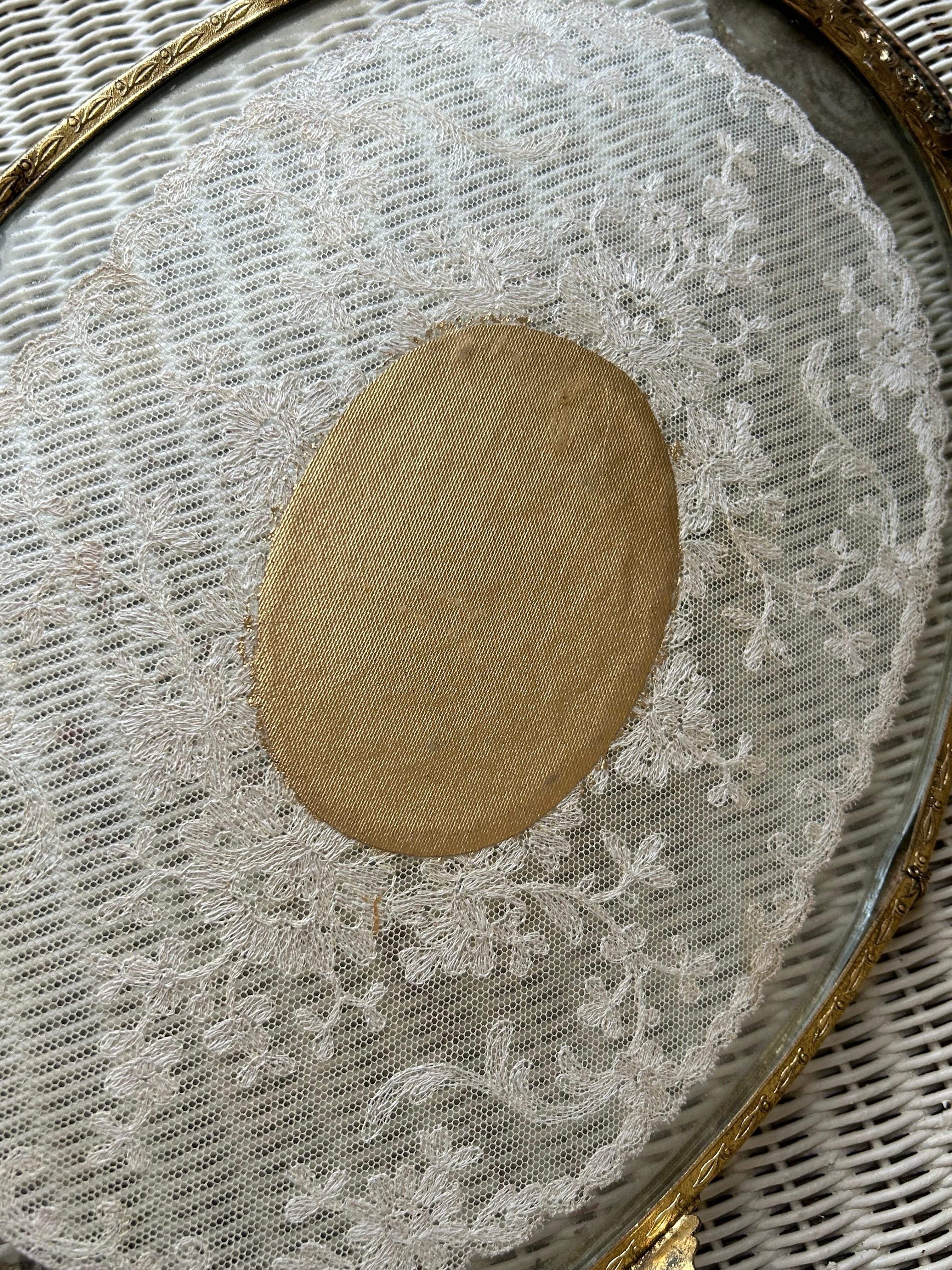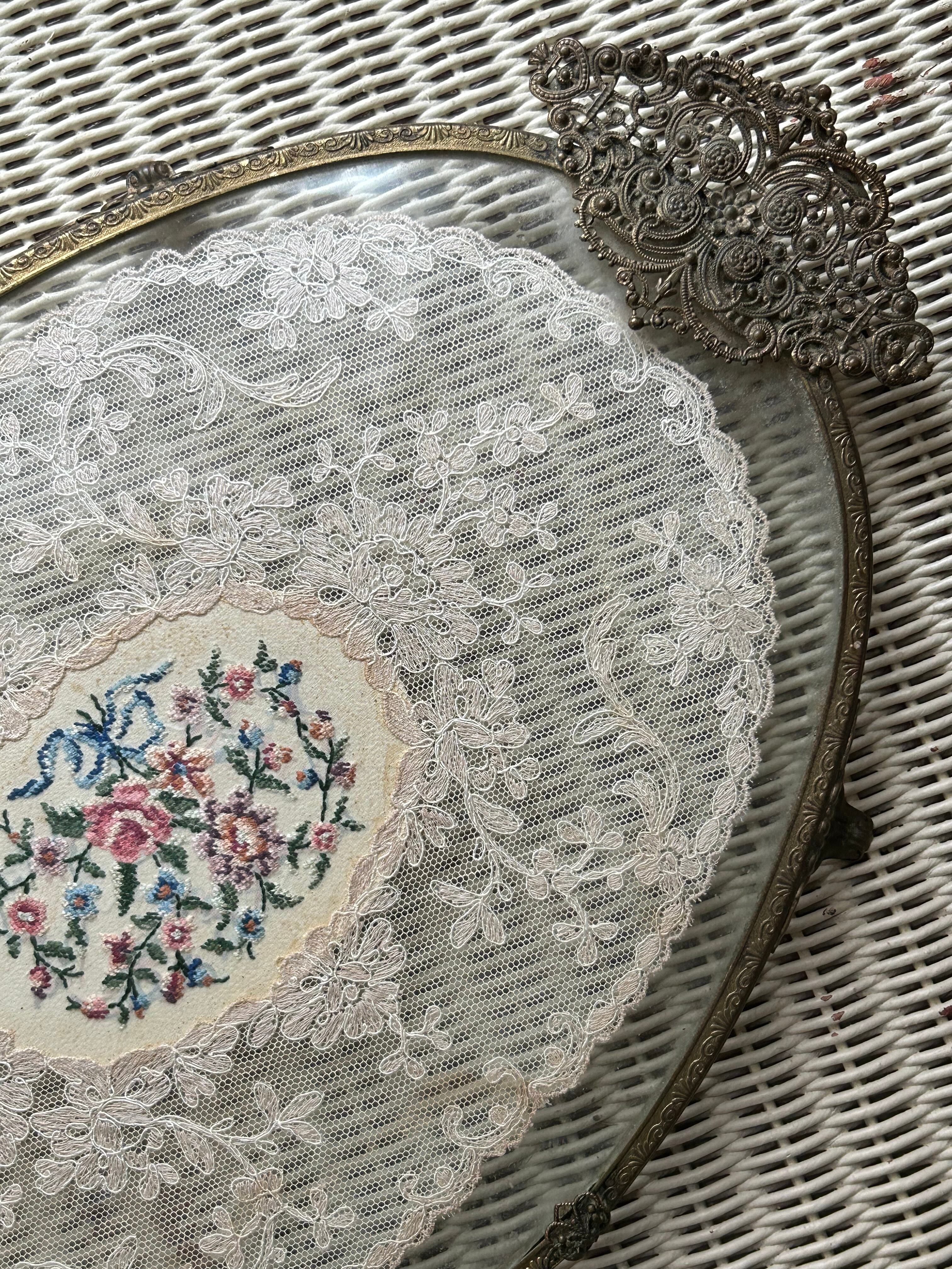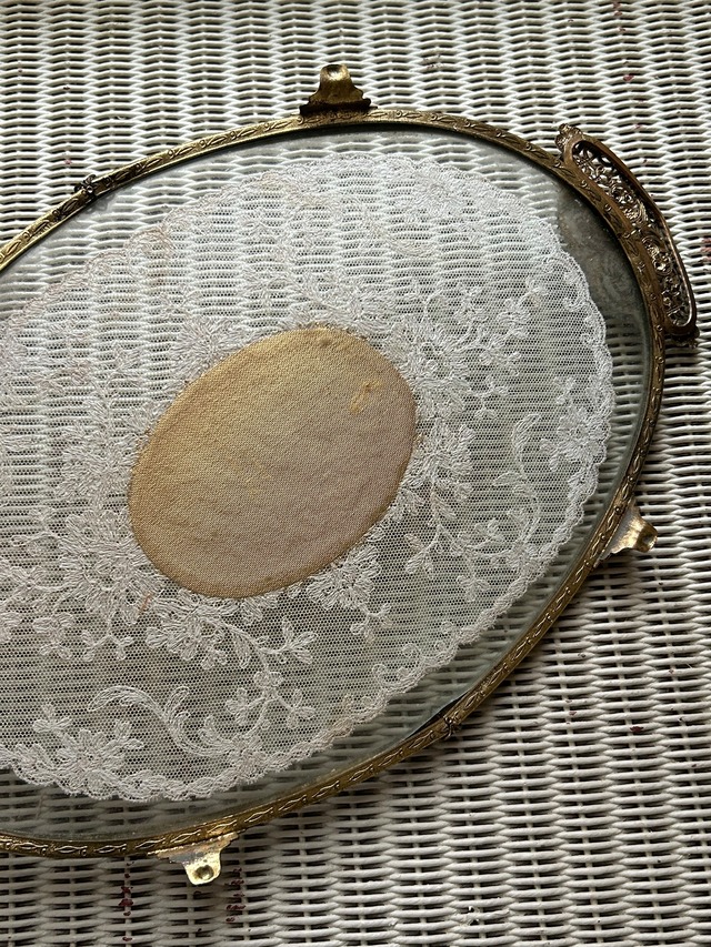 英国アンティーク プチポワン ドレッシングトレイ イギリス 刺繍 ガラス オーバル型 インテリア 店舗什器