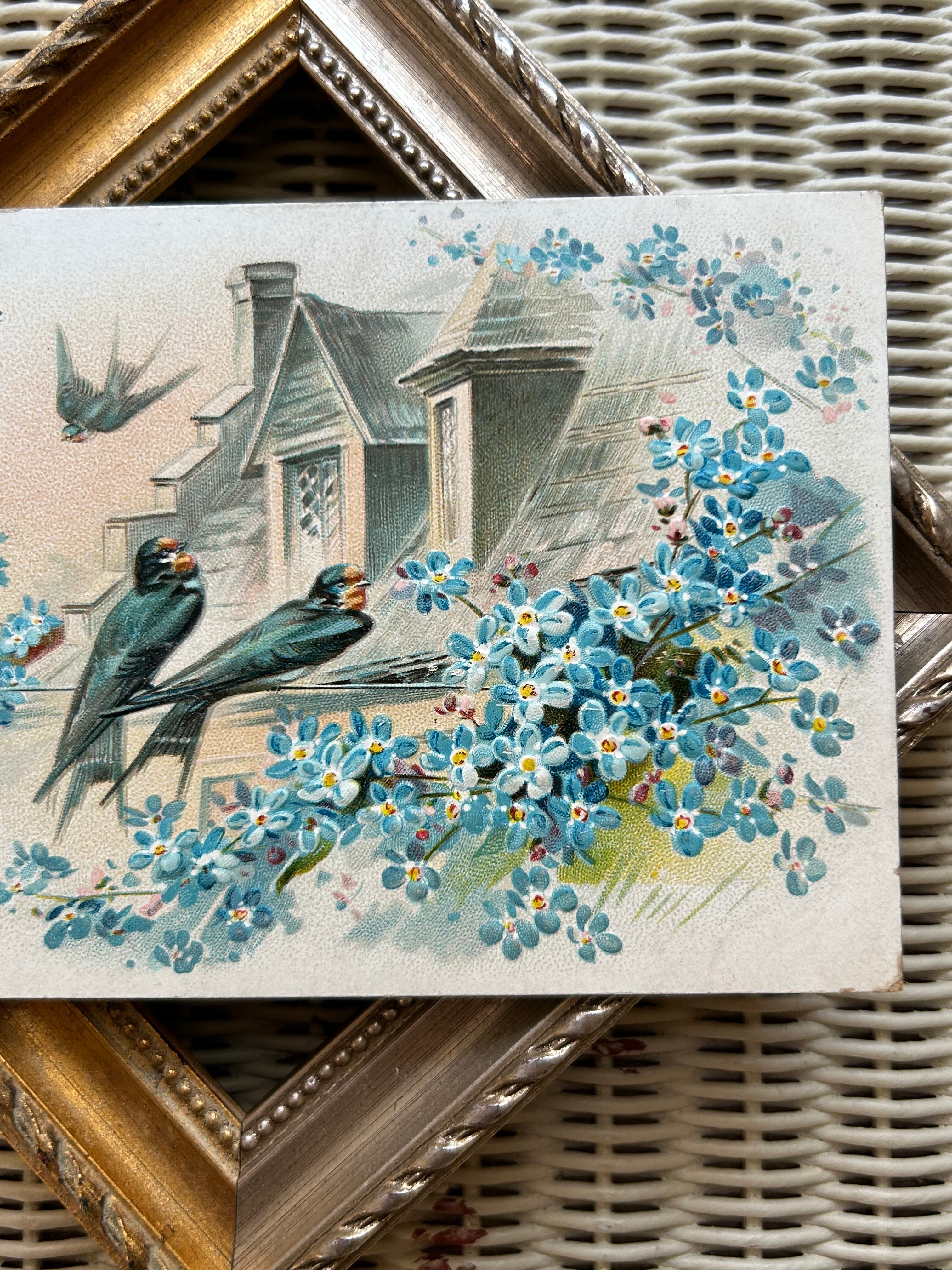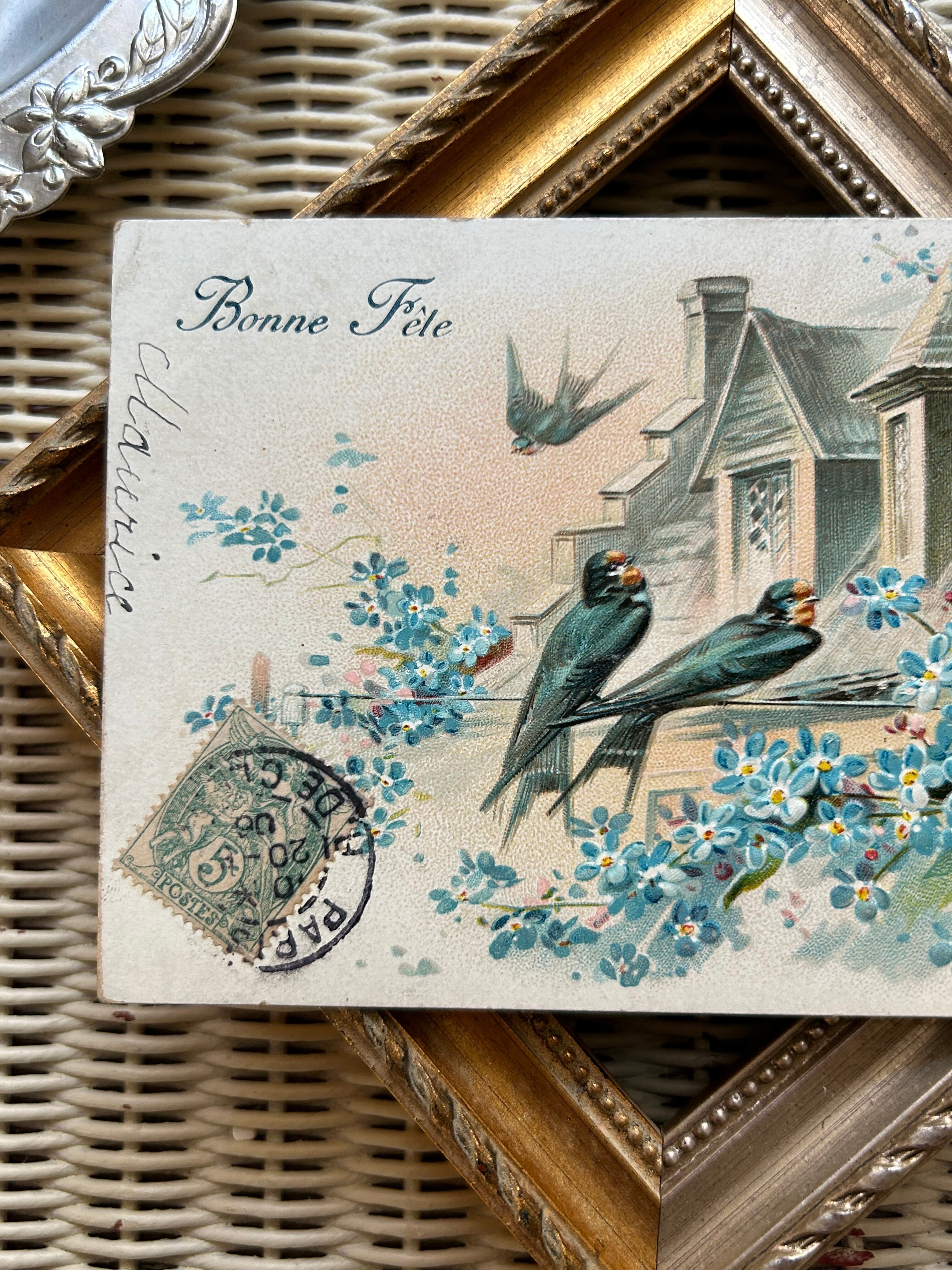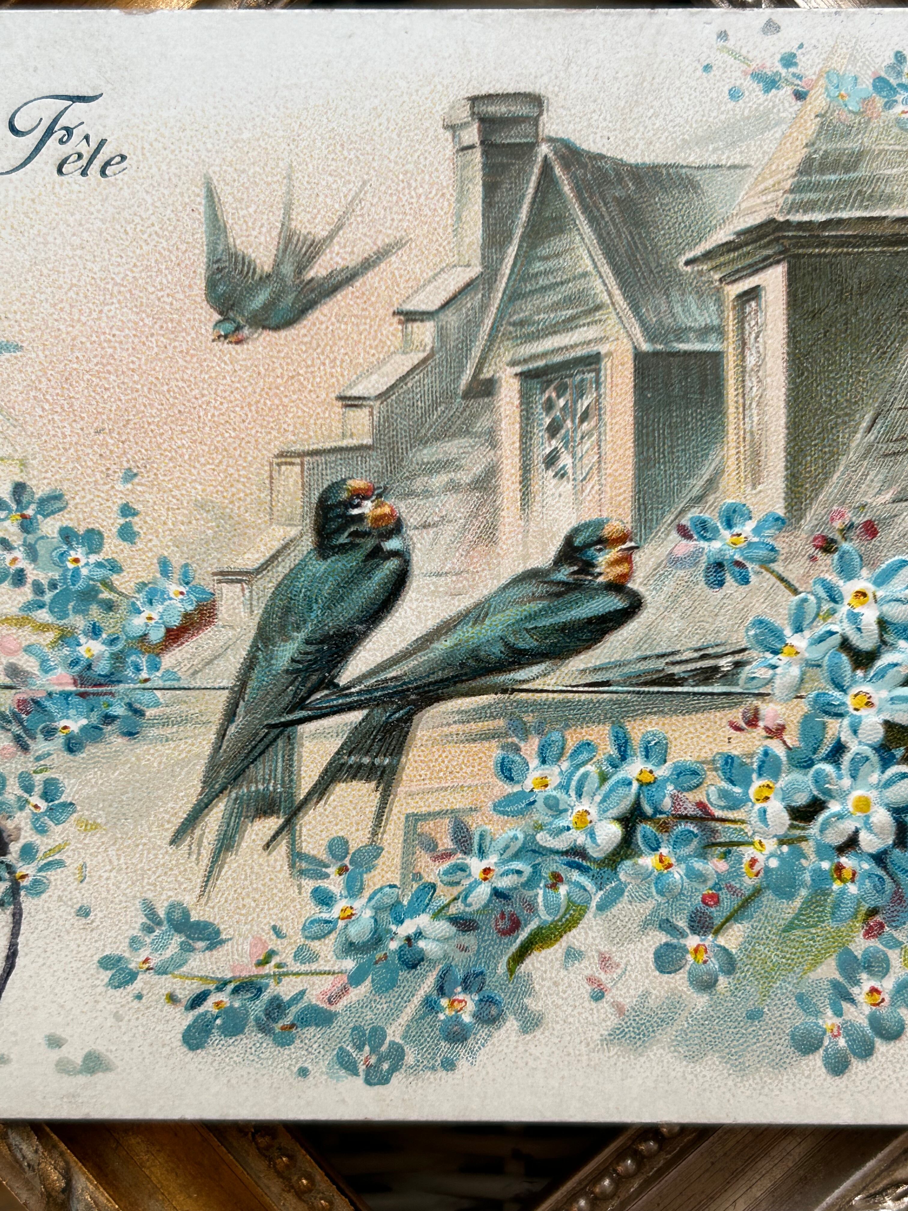 アンティークポストカード つばめと勿忘草 額装 インテリア フランス Bonne fete エンボス