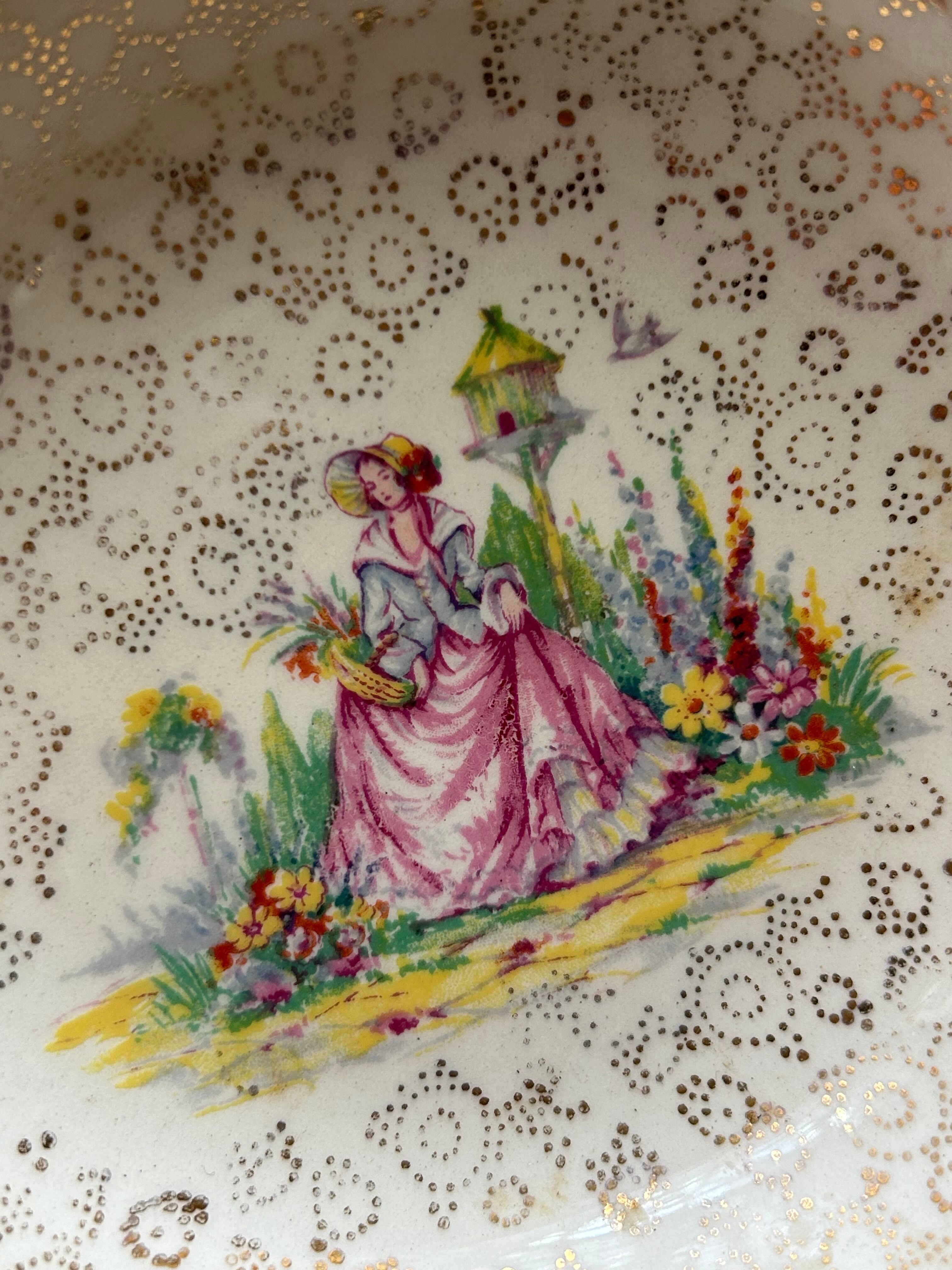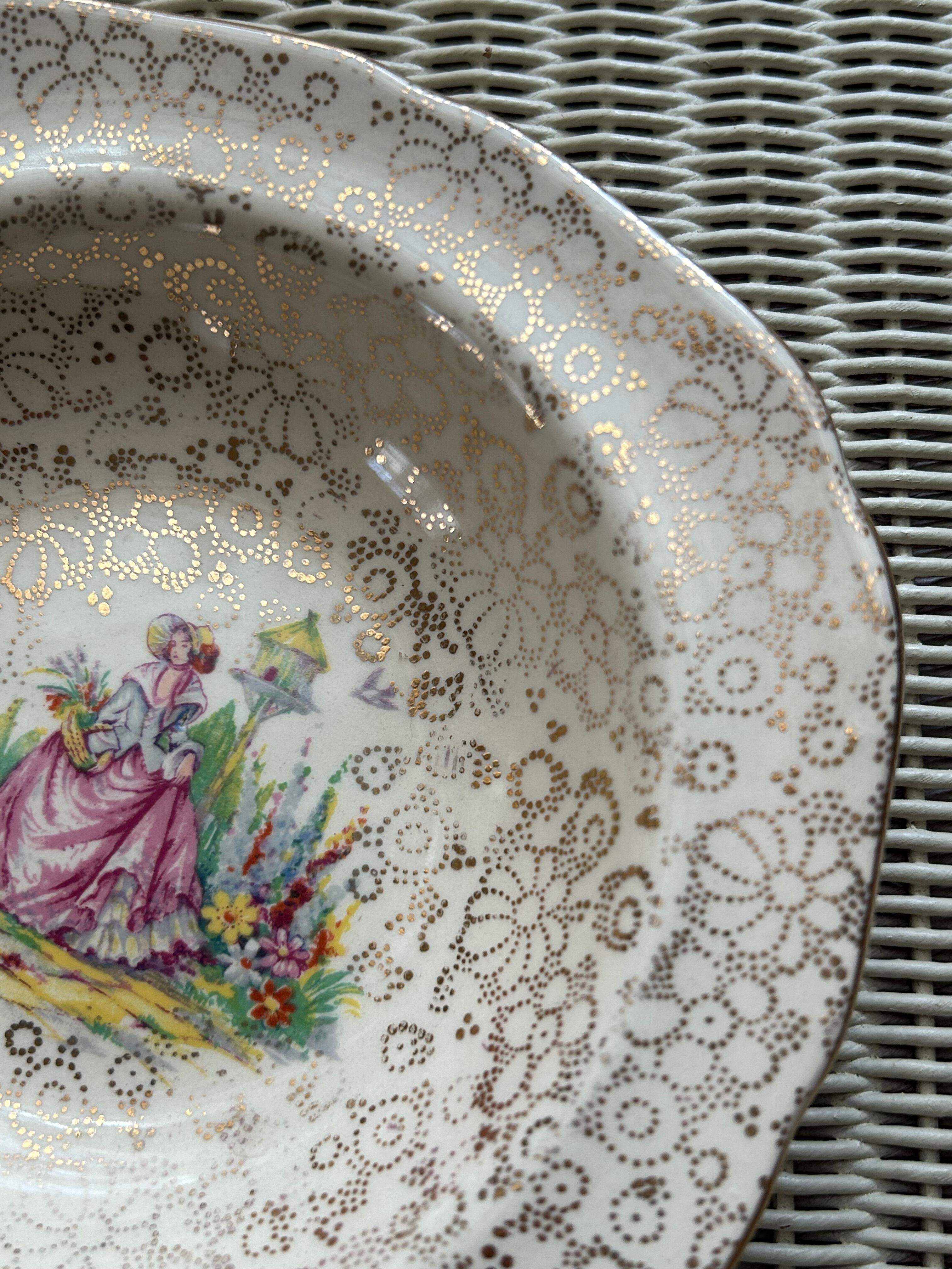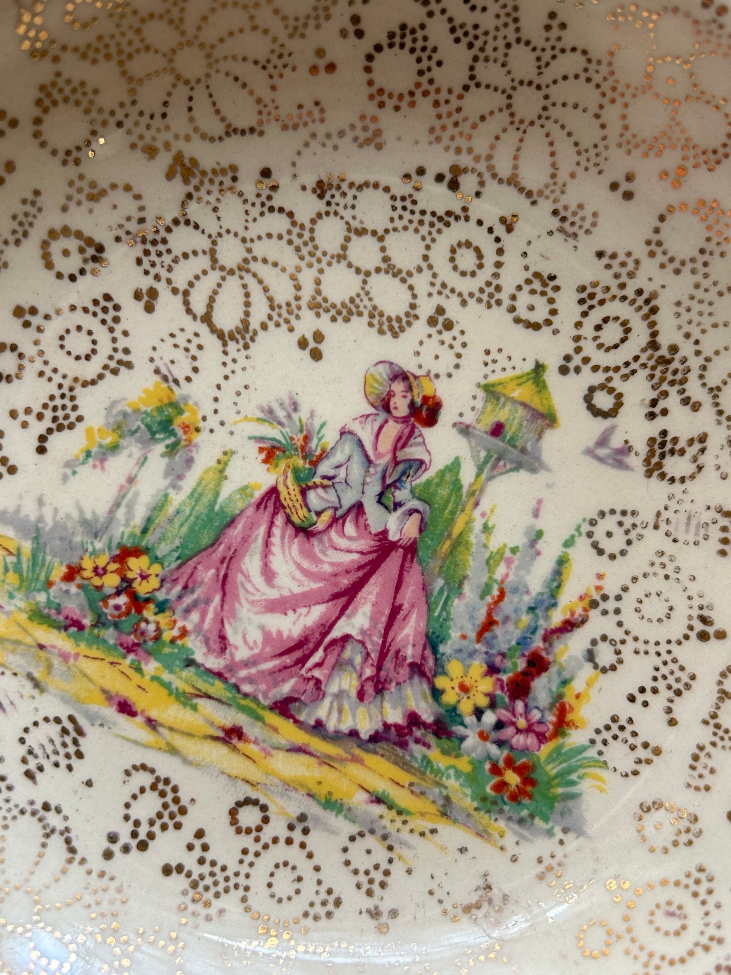 一面に金彩の小花のチンツ柄。中央にお花畑と貴婦人のデザイン。
