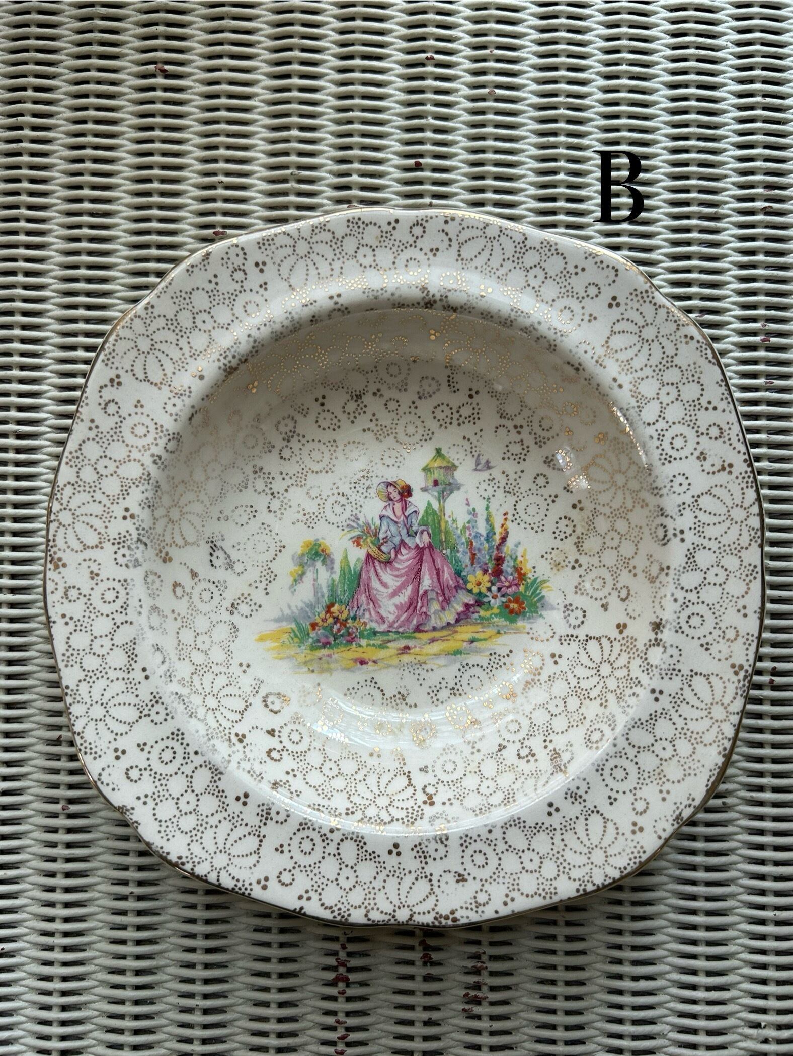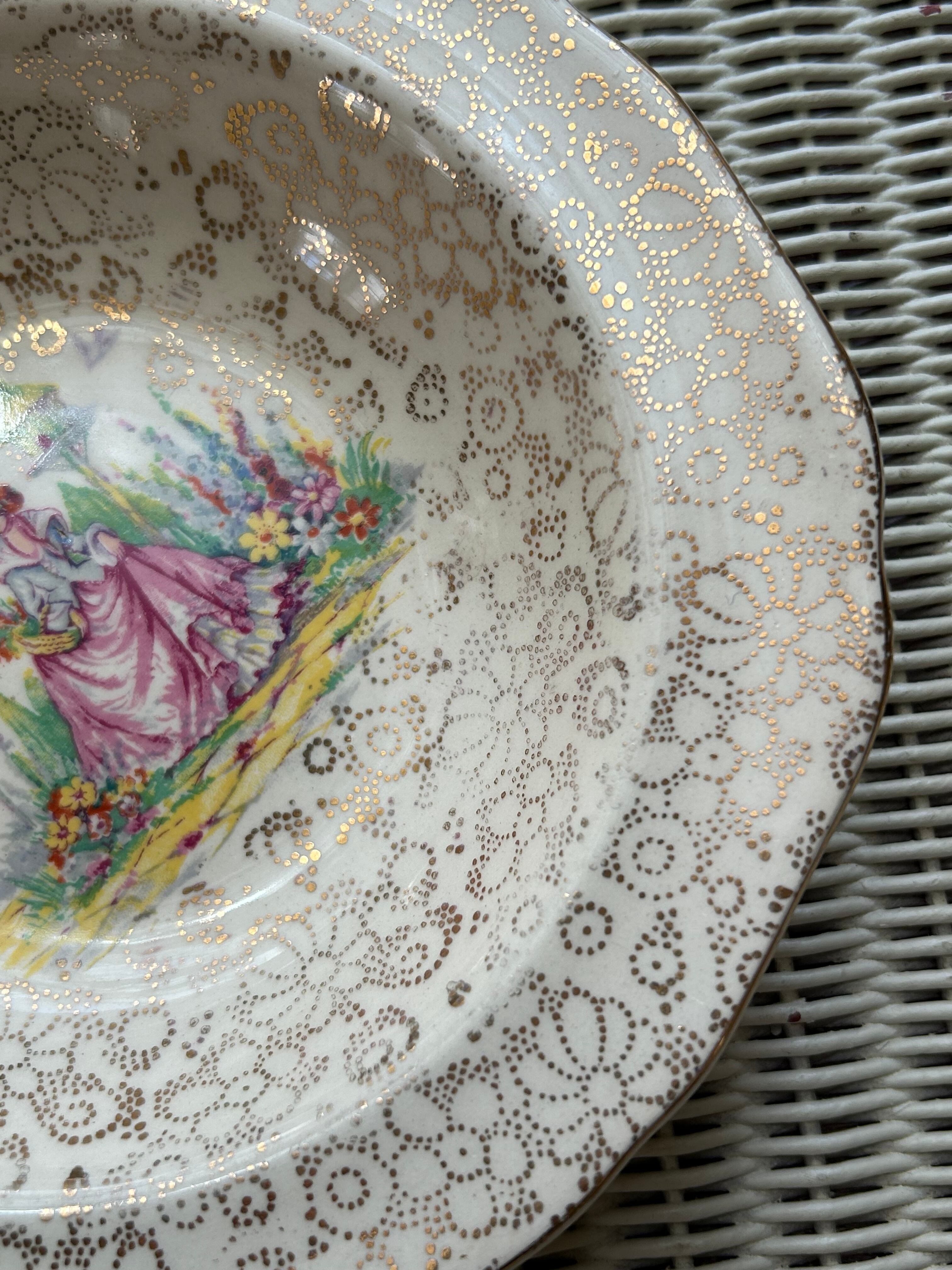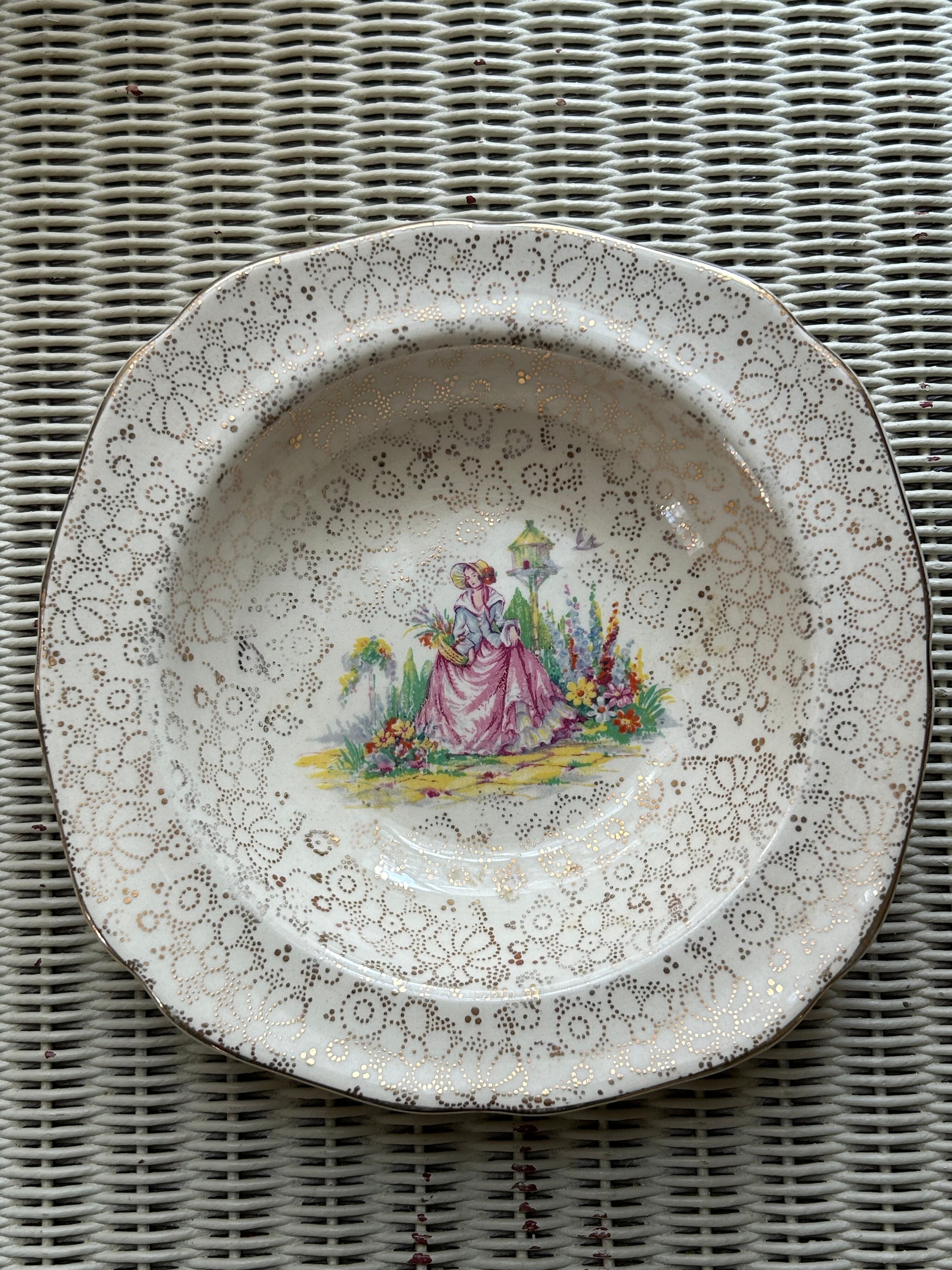 一面に金彩の小花のチンツ柄。中央にお花畑と貴婦人のデザイン。