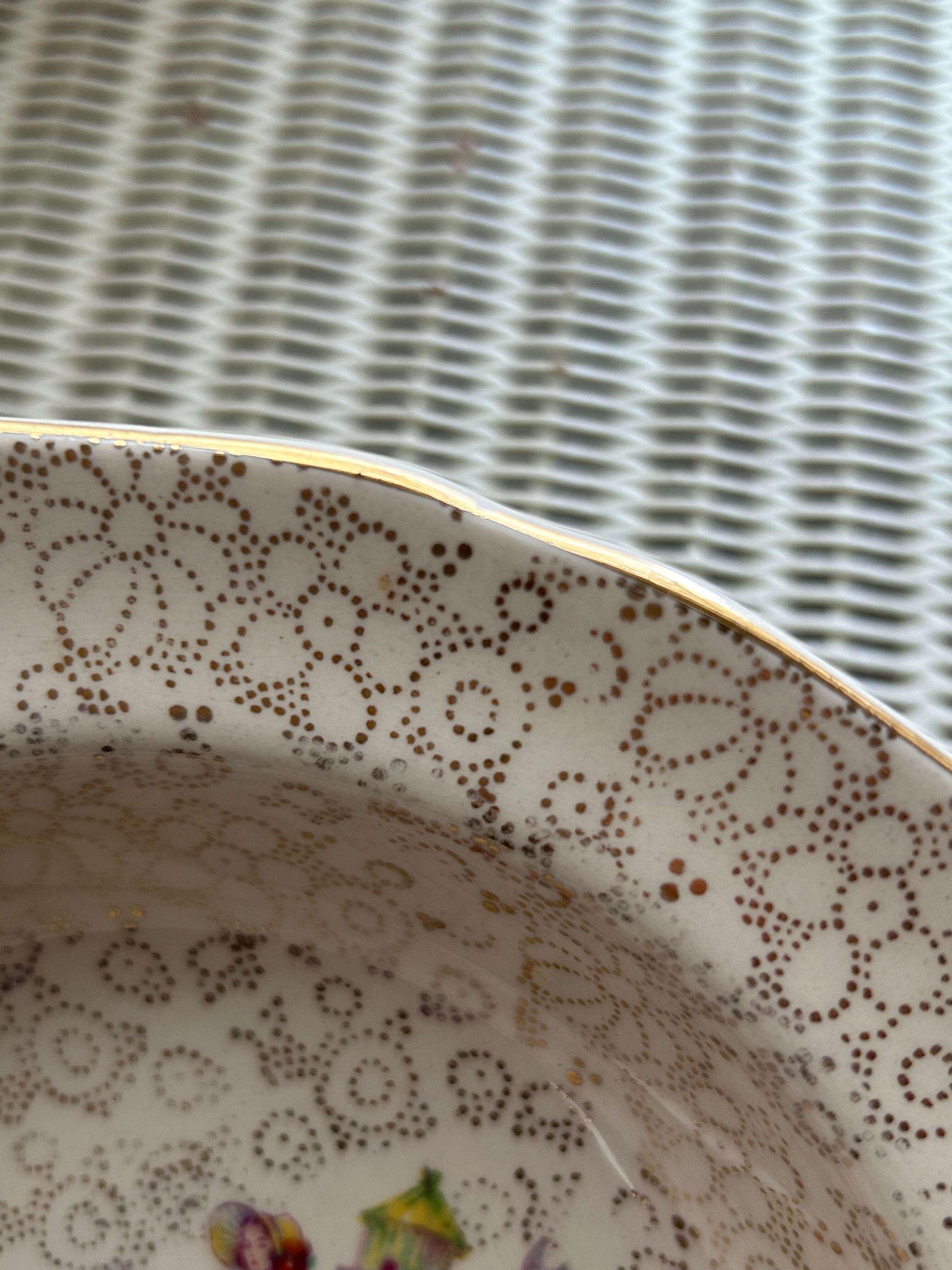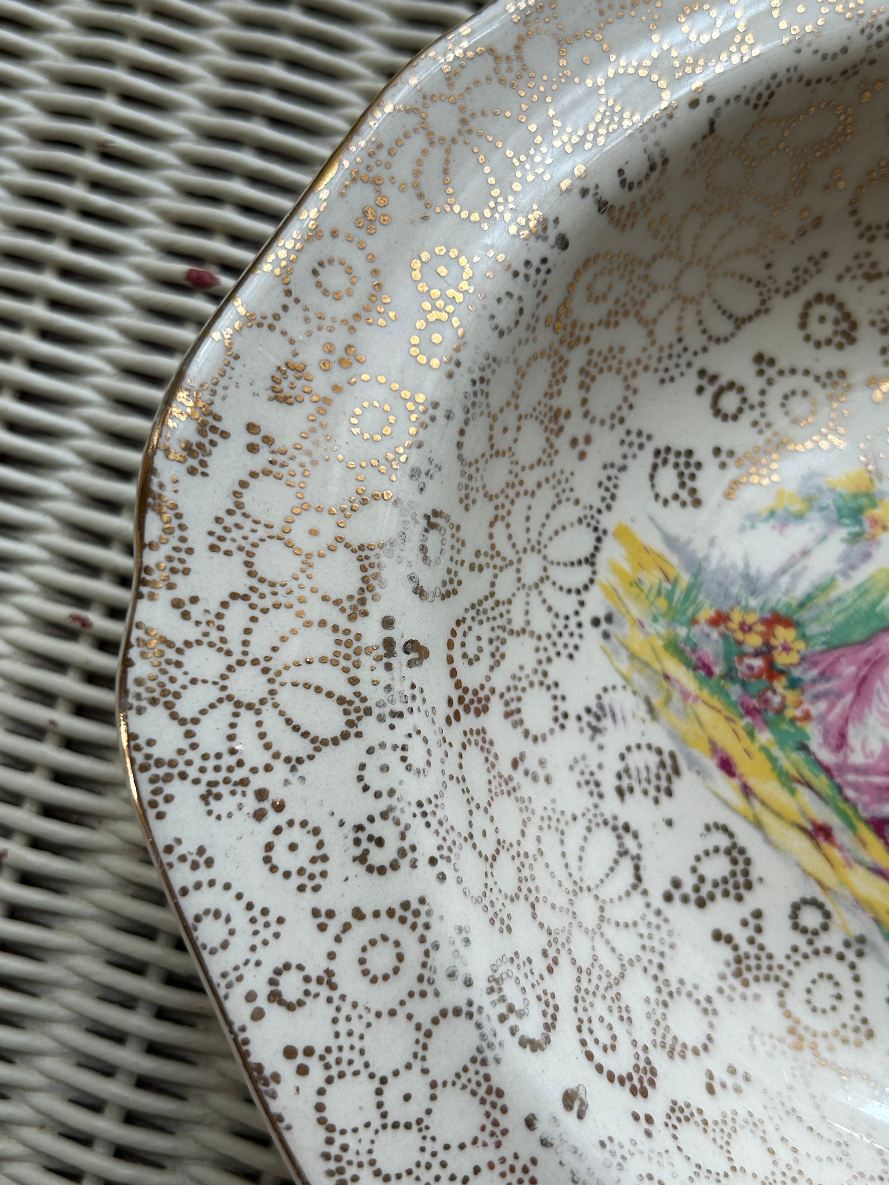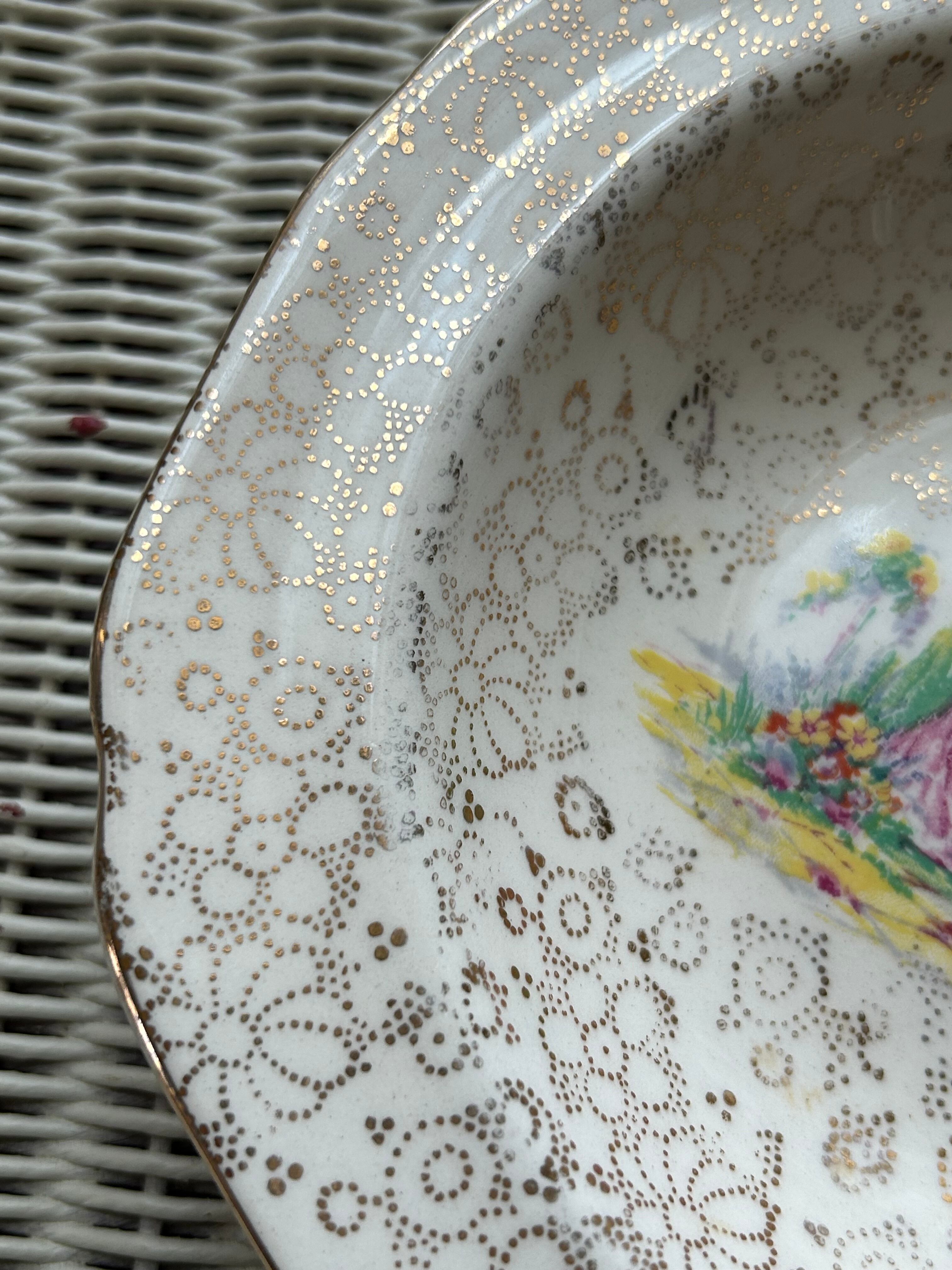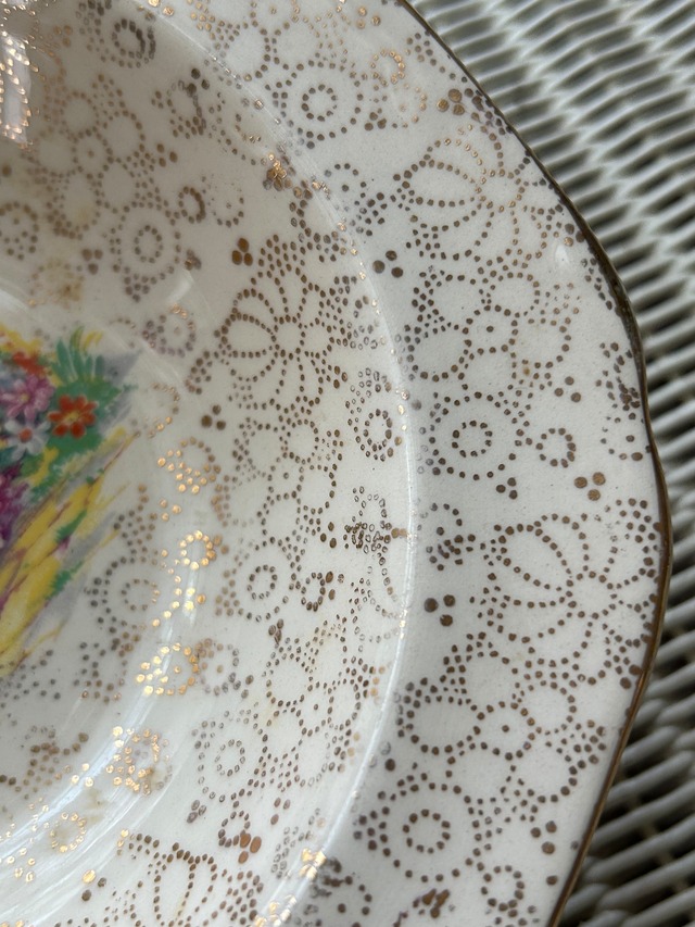 英国アンティーク H&K tunstall ホリンスヘッド&クーカム タンストール 貴婦人柄のボウルプレート 花柄 金彩
