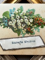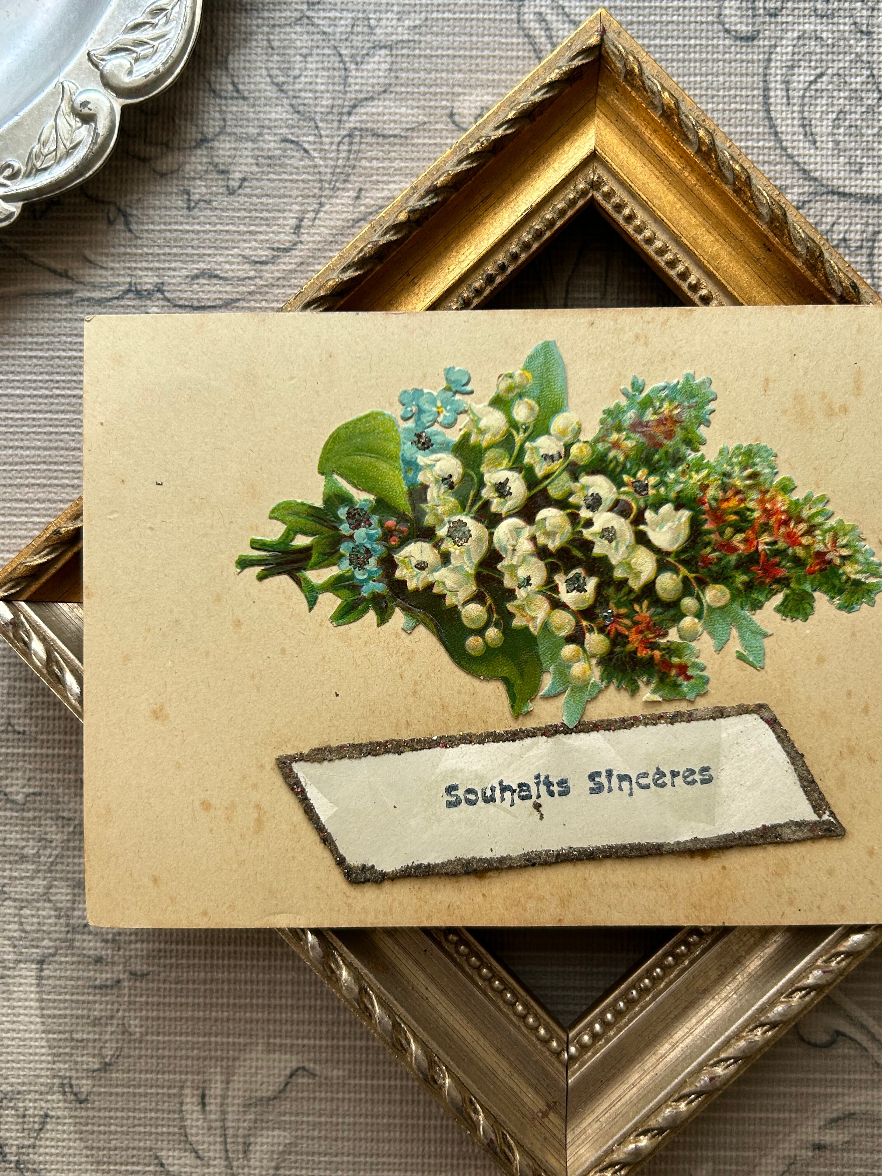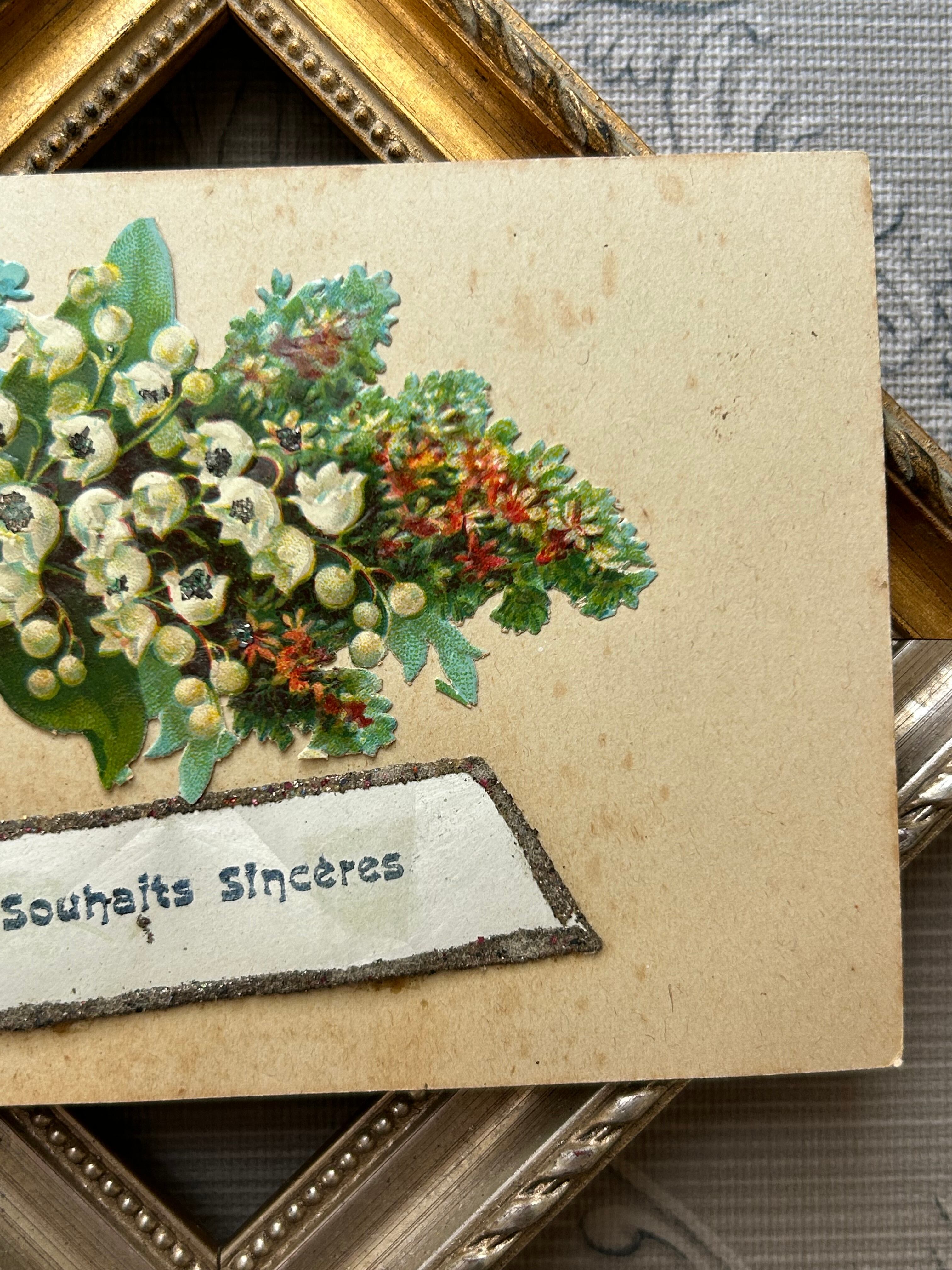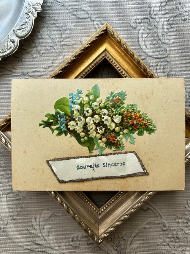 フランス アンティークポストカード Muguet すずらん 勿忘草 クロモス グリッター加工 額装 インテリア