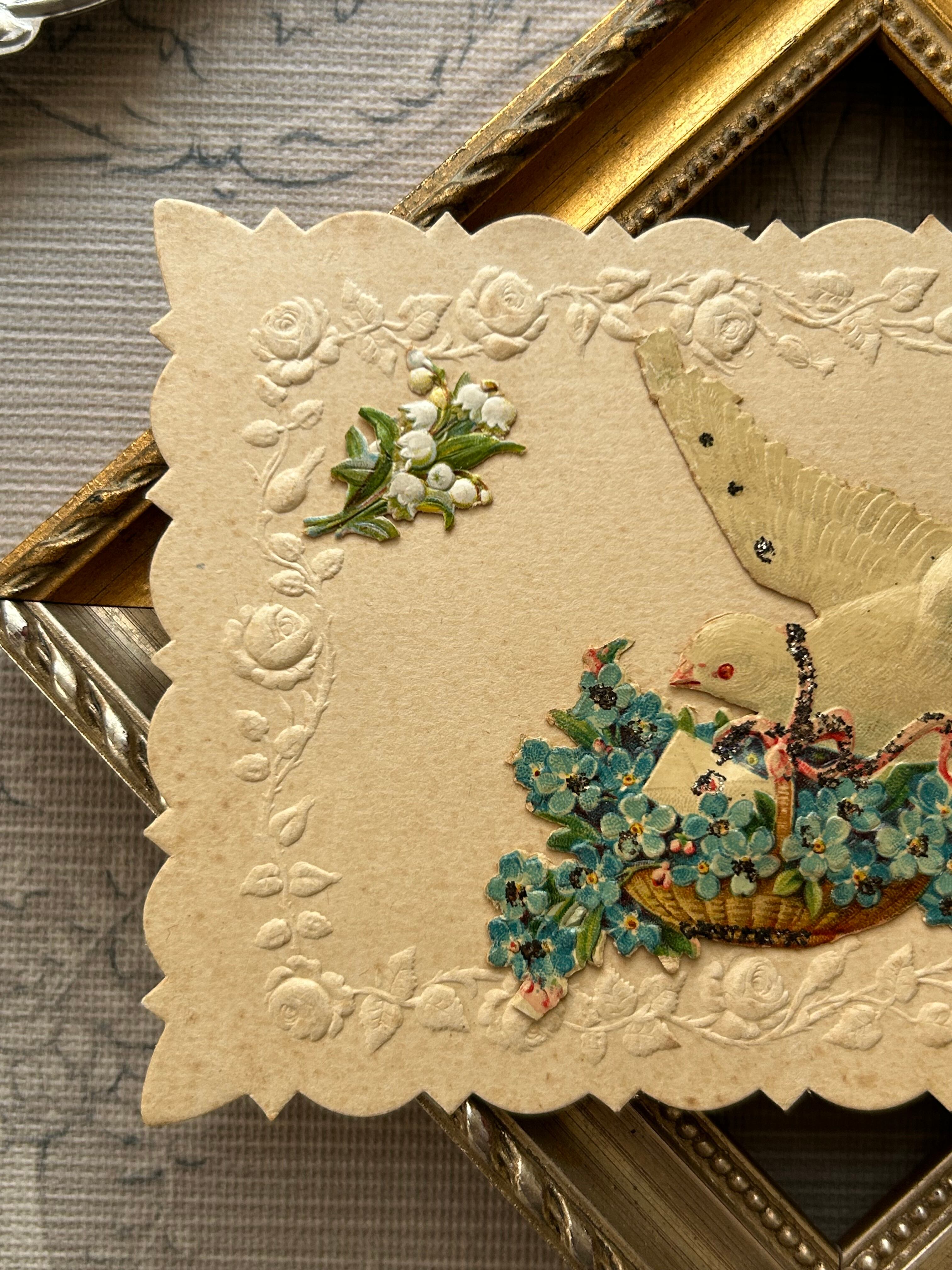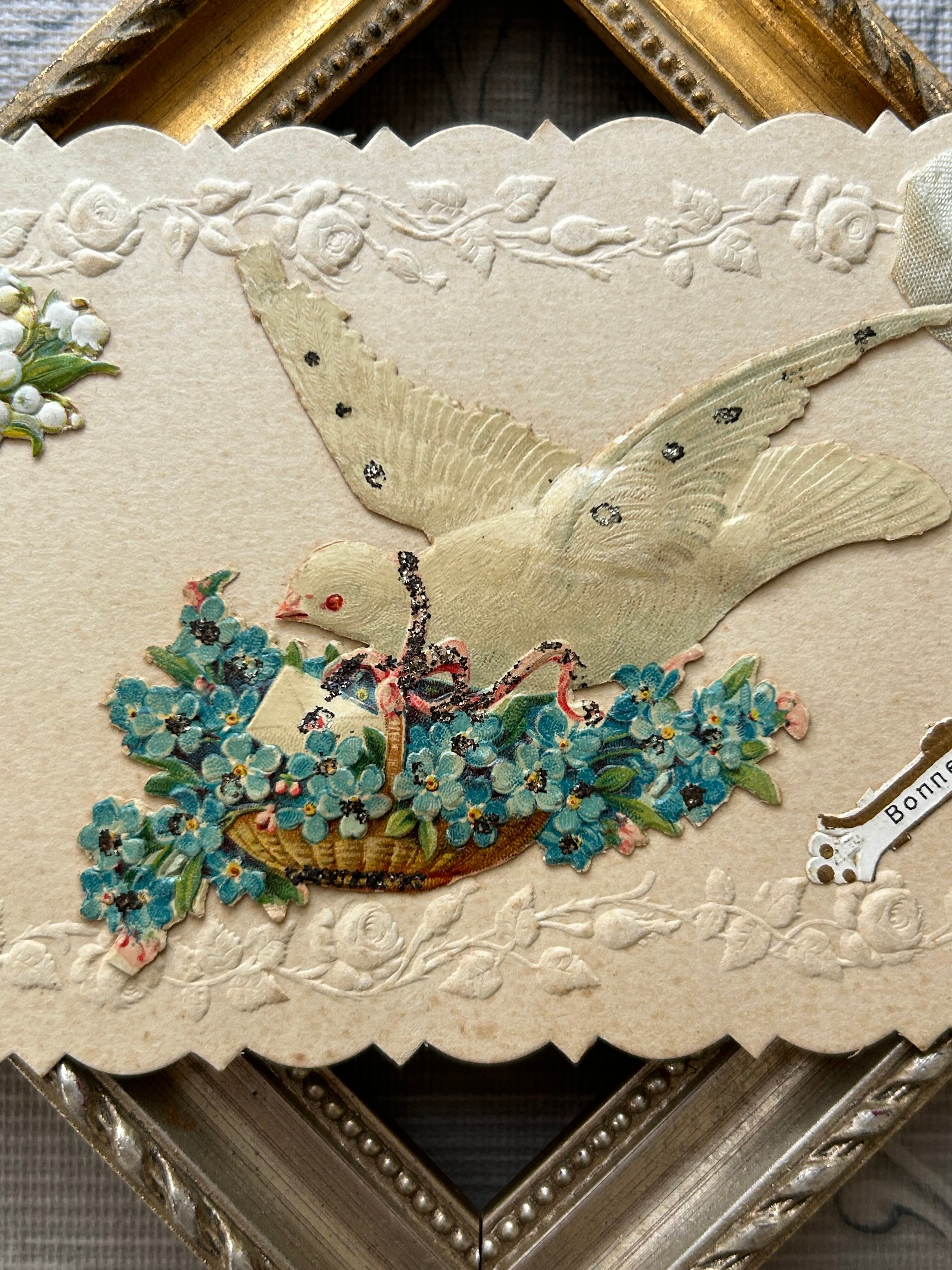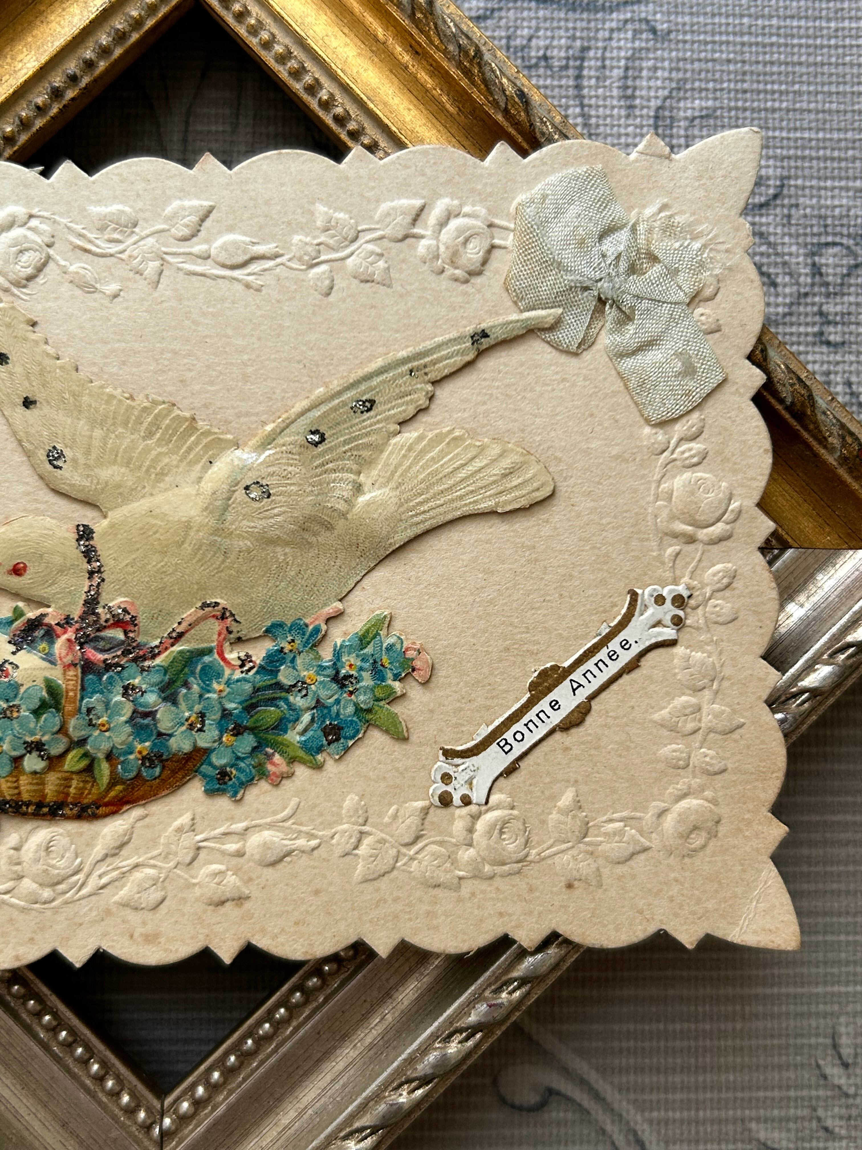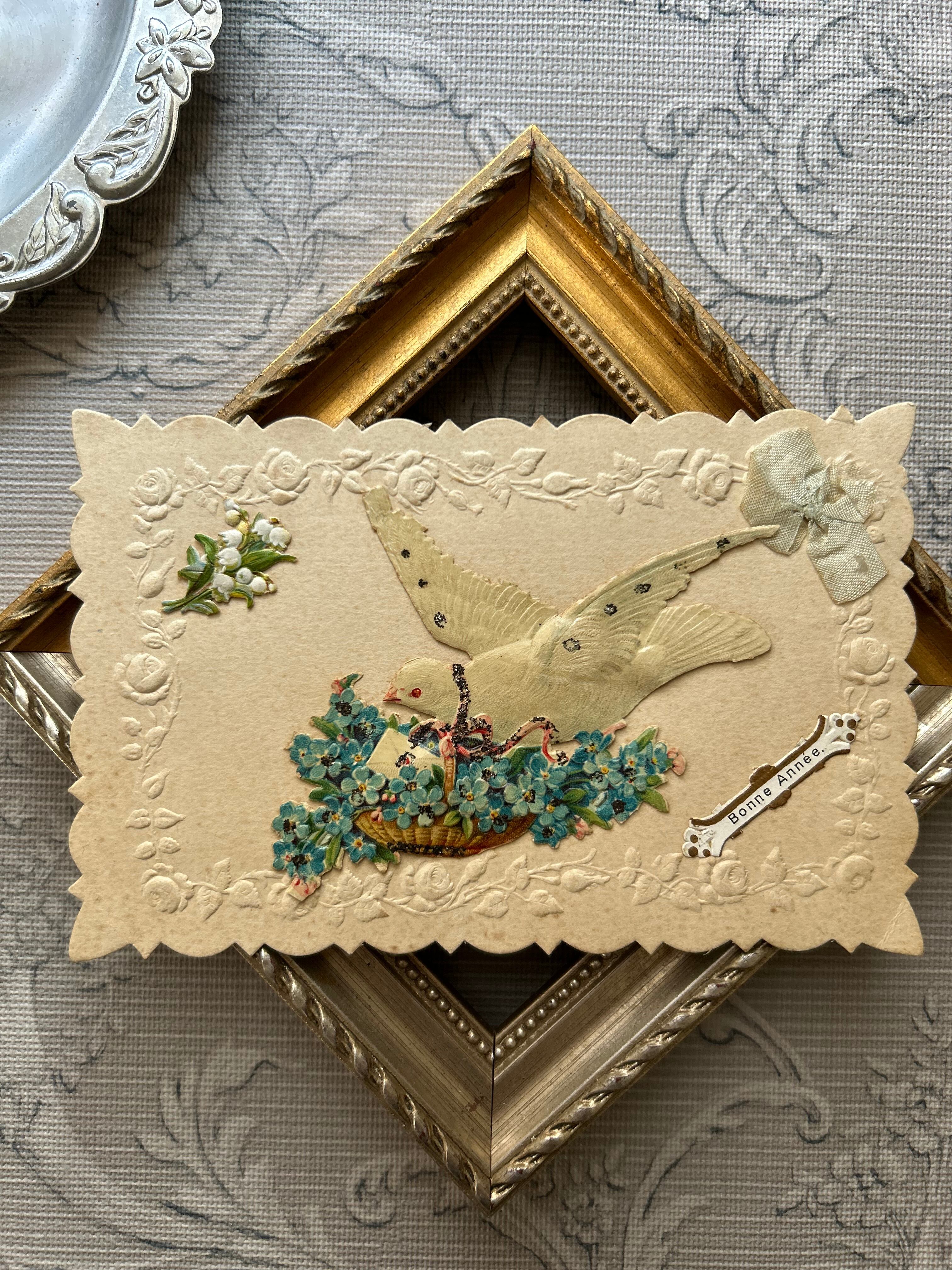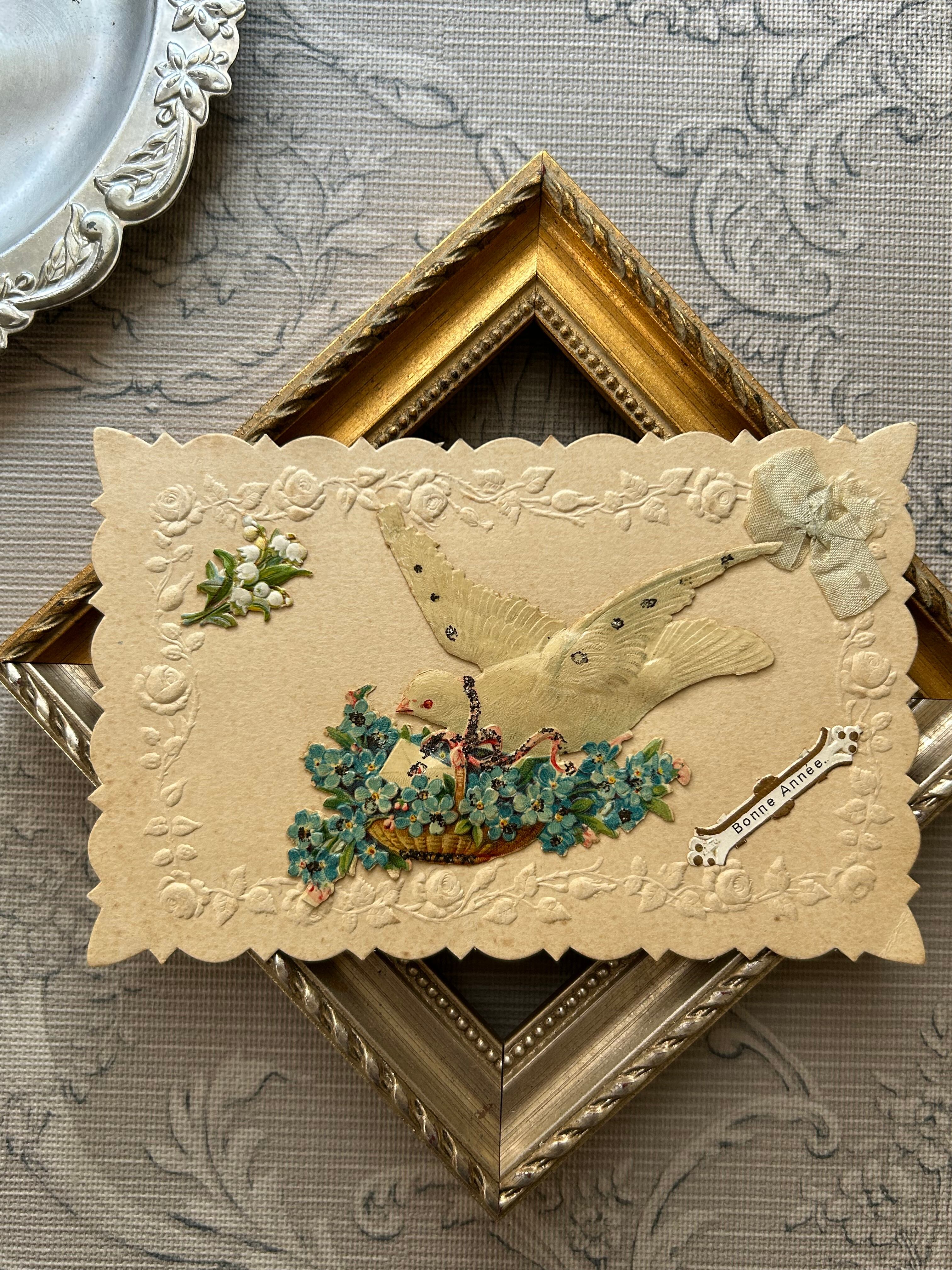 アンティークポストカード Bonne Anee 勿忘草の花籠 フラワーバスケット 白鳩 Muget すずらん クロモス エンボス グリッター加工 フランス