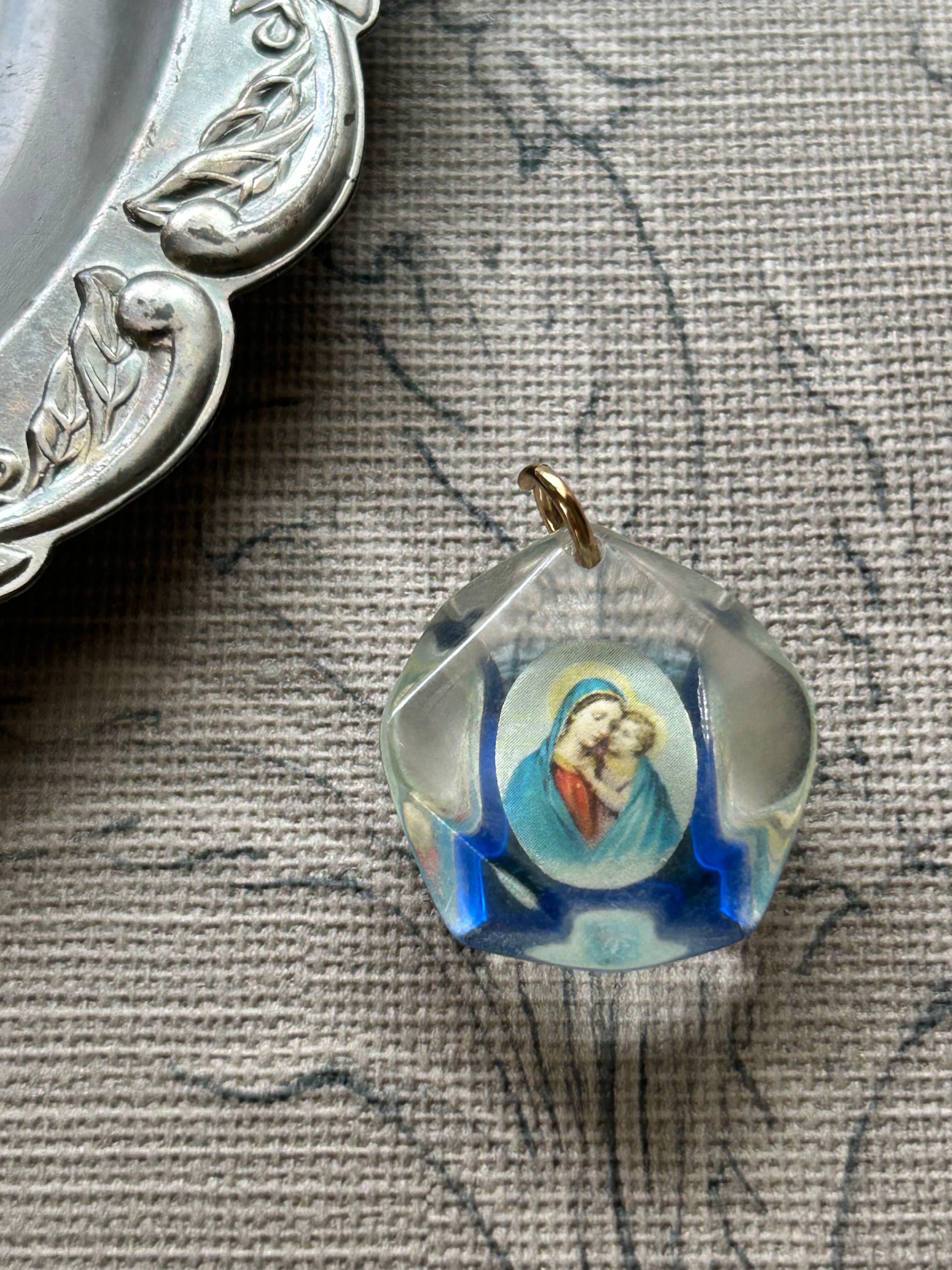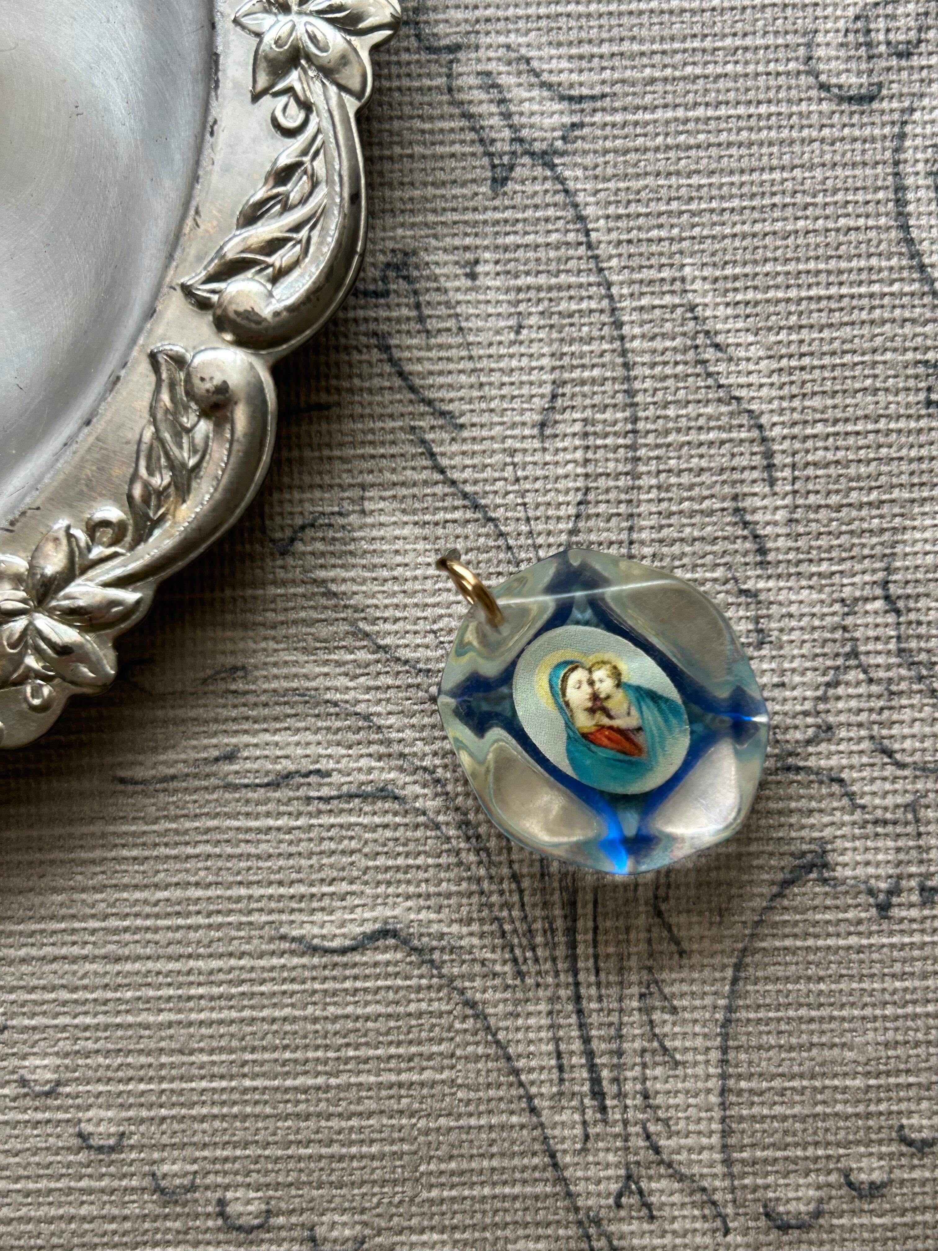 立体的なアクリルのチャーム。中に聖母マリアとキリストのデザイン。