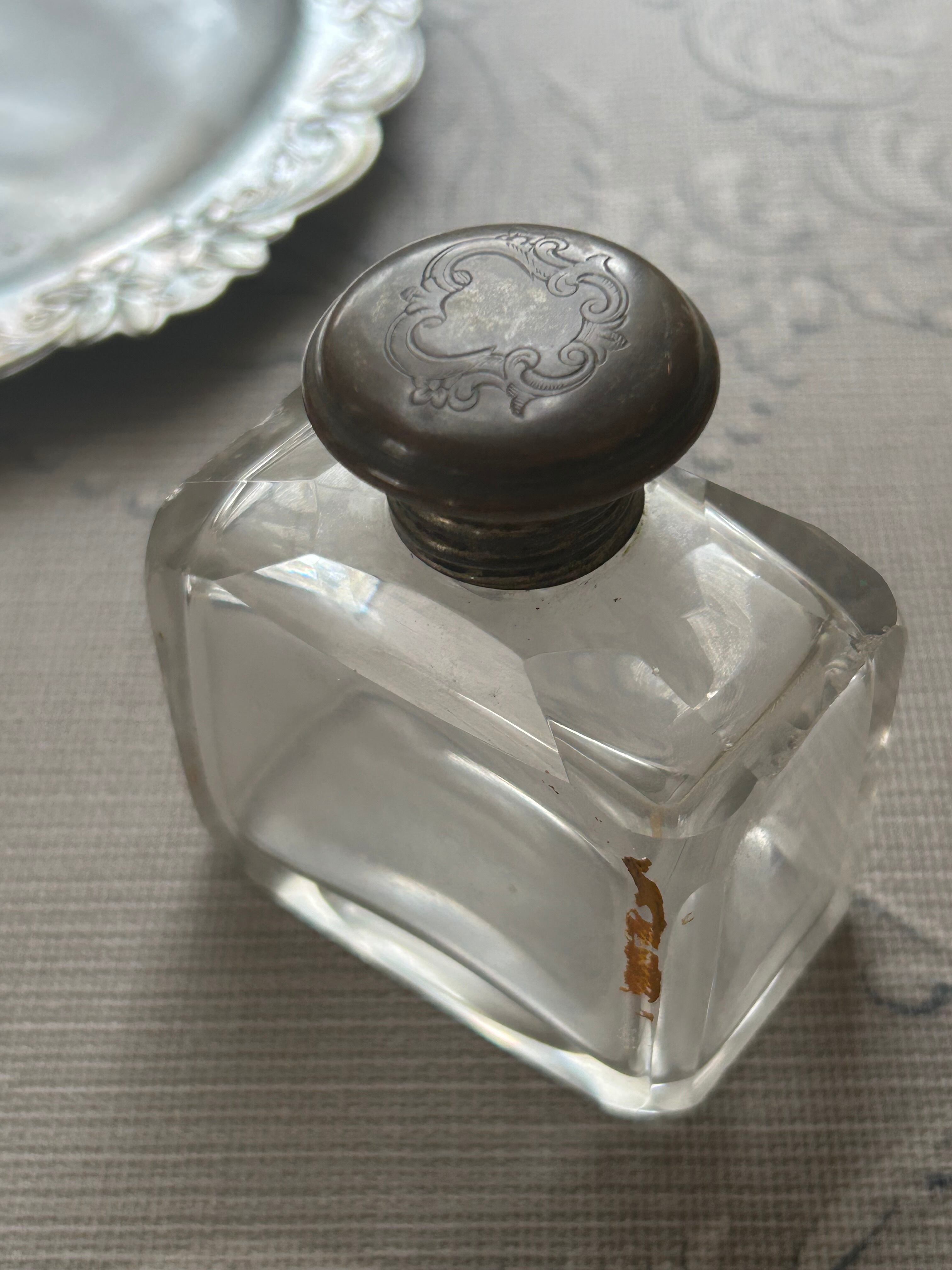 フランスアンティーク 真鍮製の蓋付きインクボトル 彫り模様 蓋付角瓶 インテリア 撮影小物 店舗什器