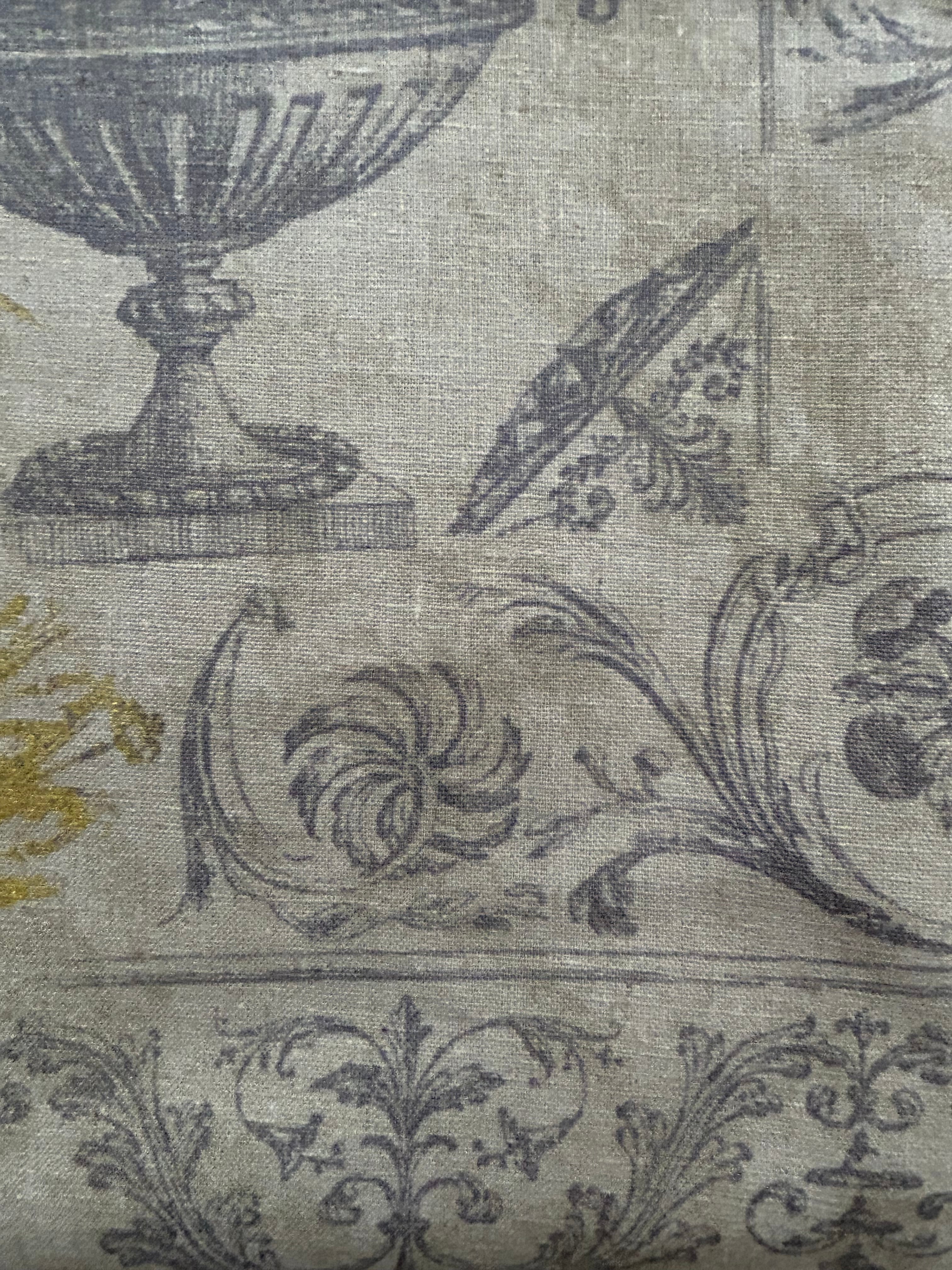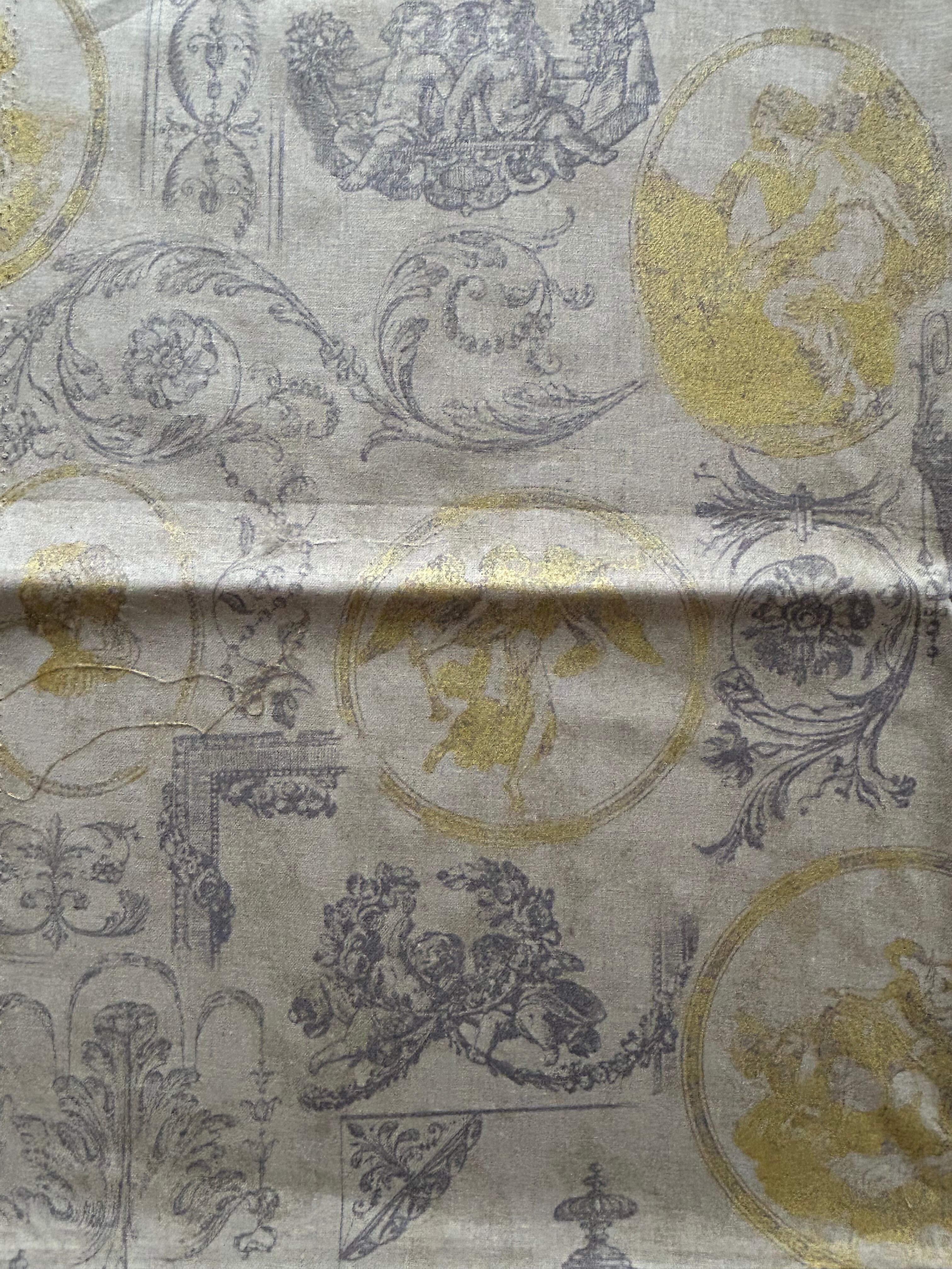 ギリシャ神話に登場する神々やエンジェル、装飾のデザインが描かれたトワルドジュイのファブリックです。