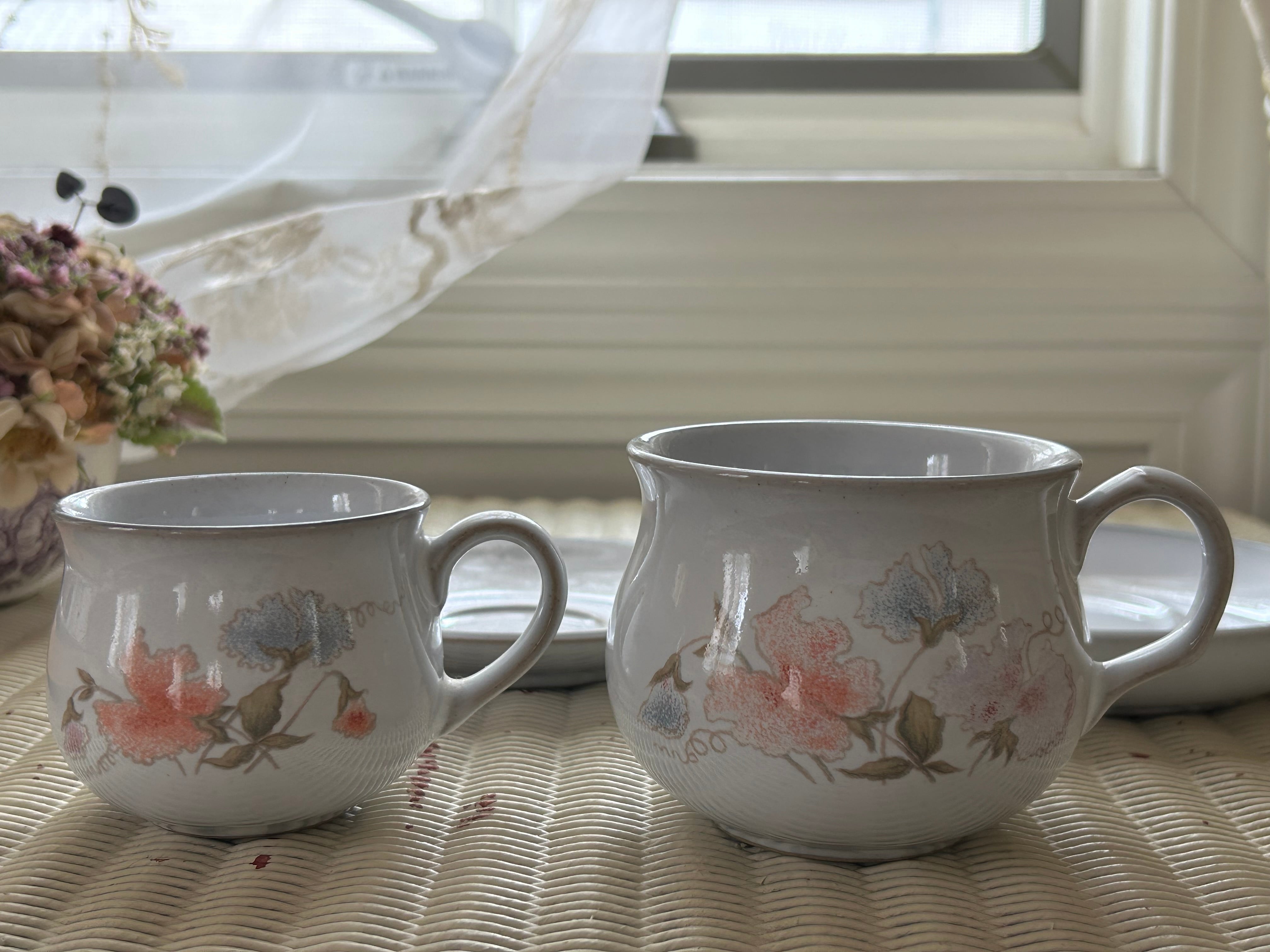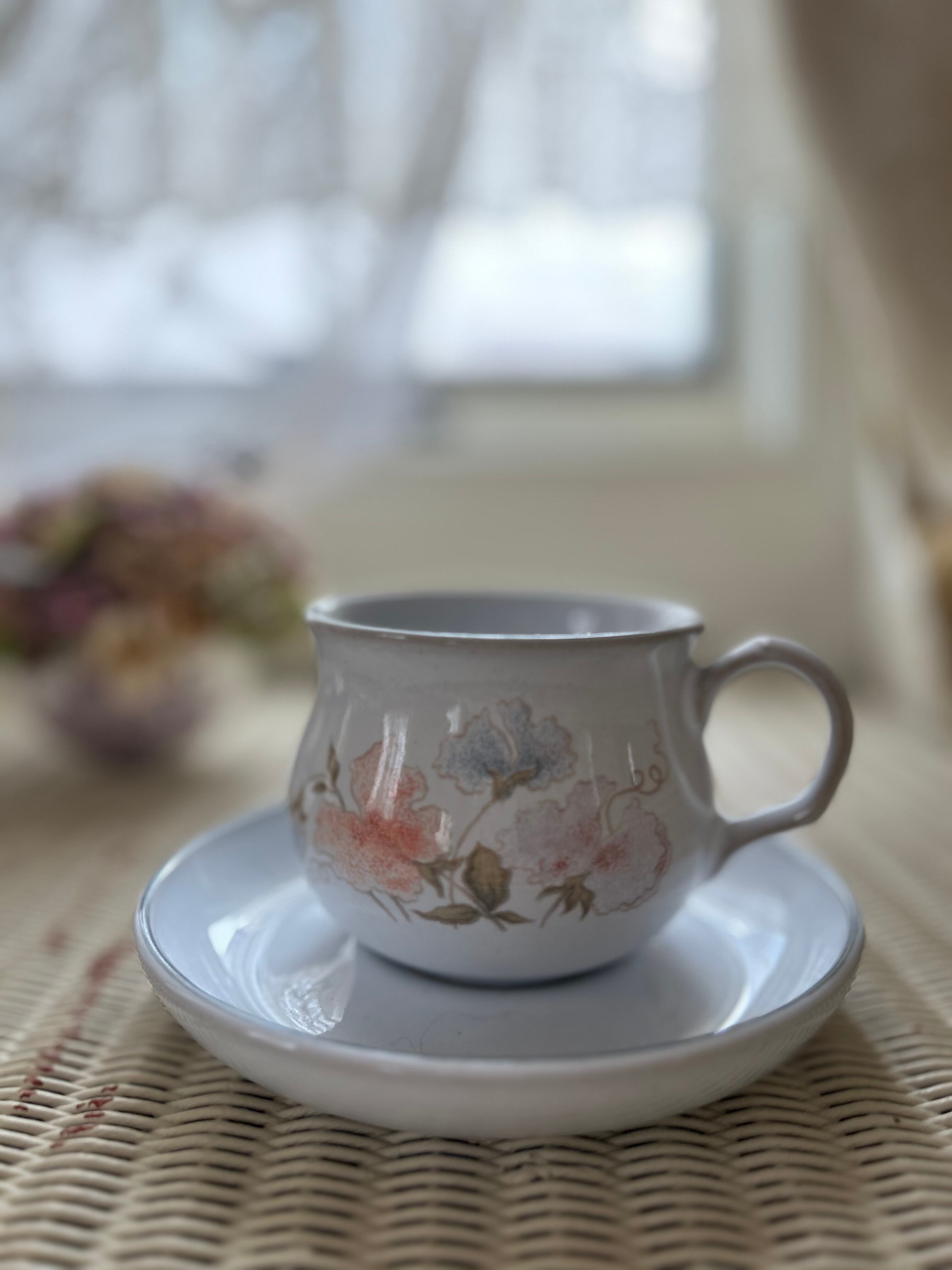 ぽってりと丸くくぼみのある形、手描きされた優しい絵柄や釉薬の風合いに味のあるカップ&ソーサーです。