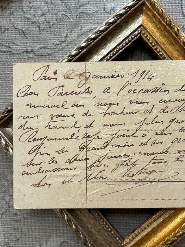 フランスアンティークカード Bonne Annee ヴィクトリアン 勿忘草の花籠を持つ少女 四葉 エンボス 1914年 額装 インテリア
