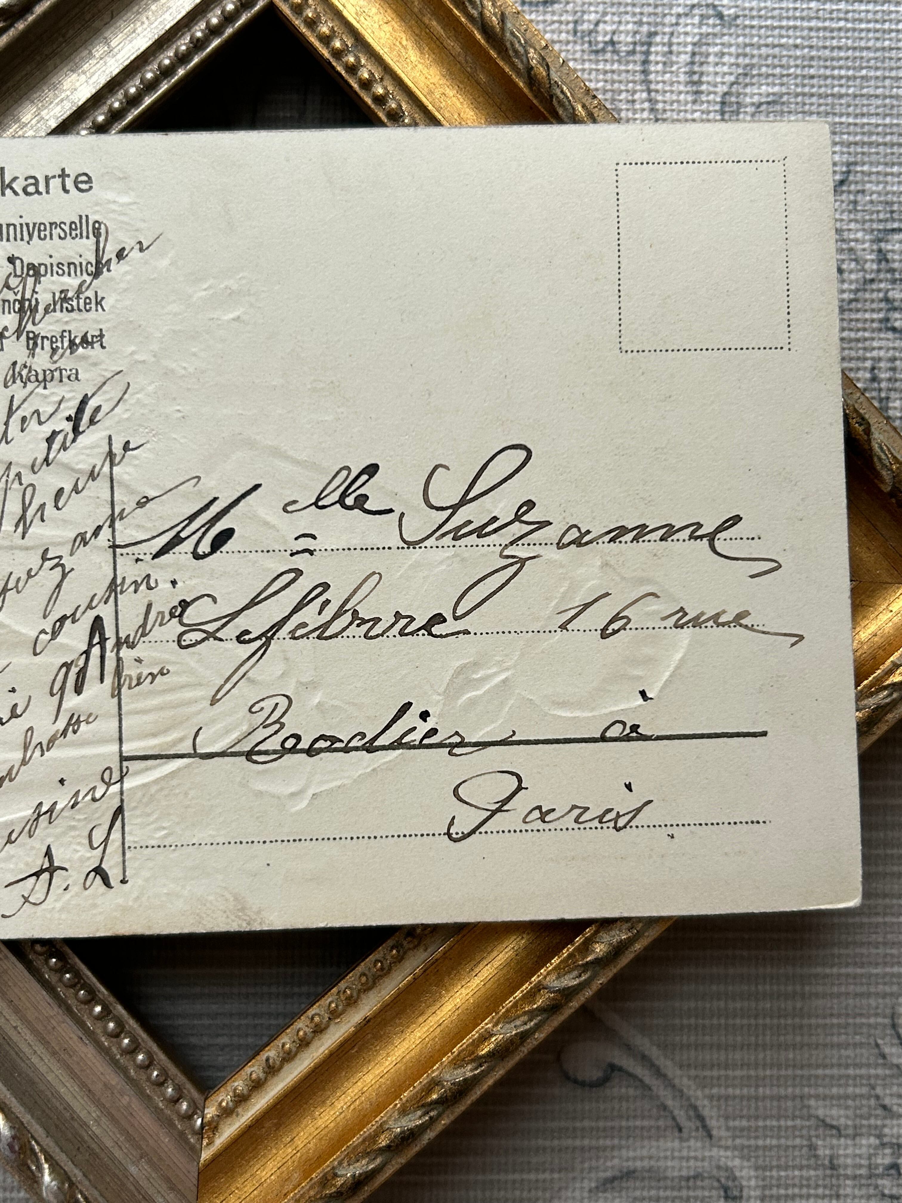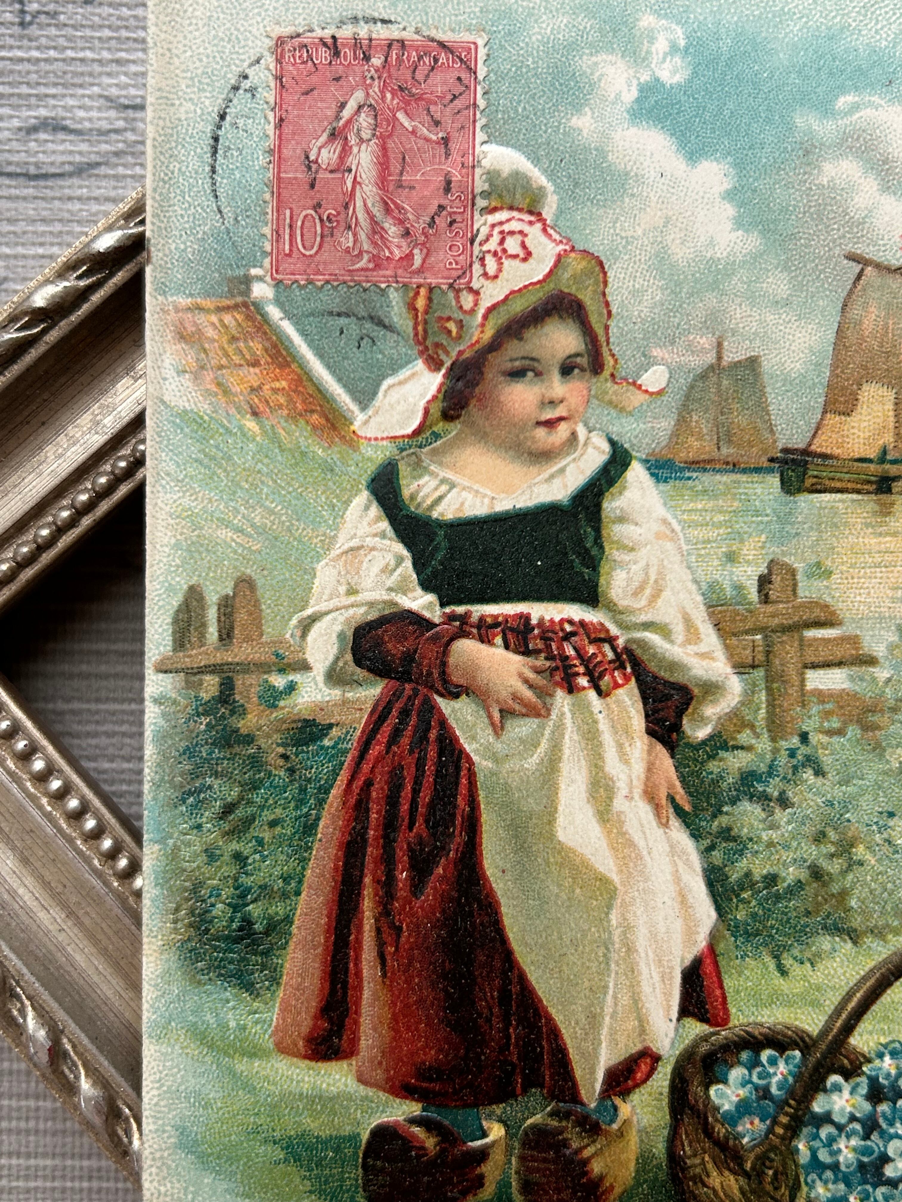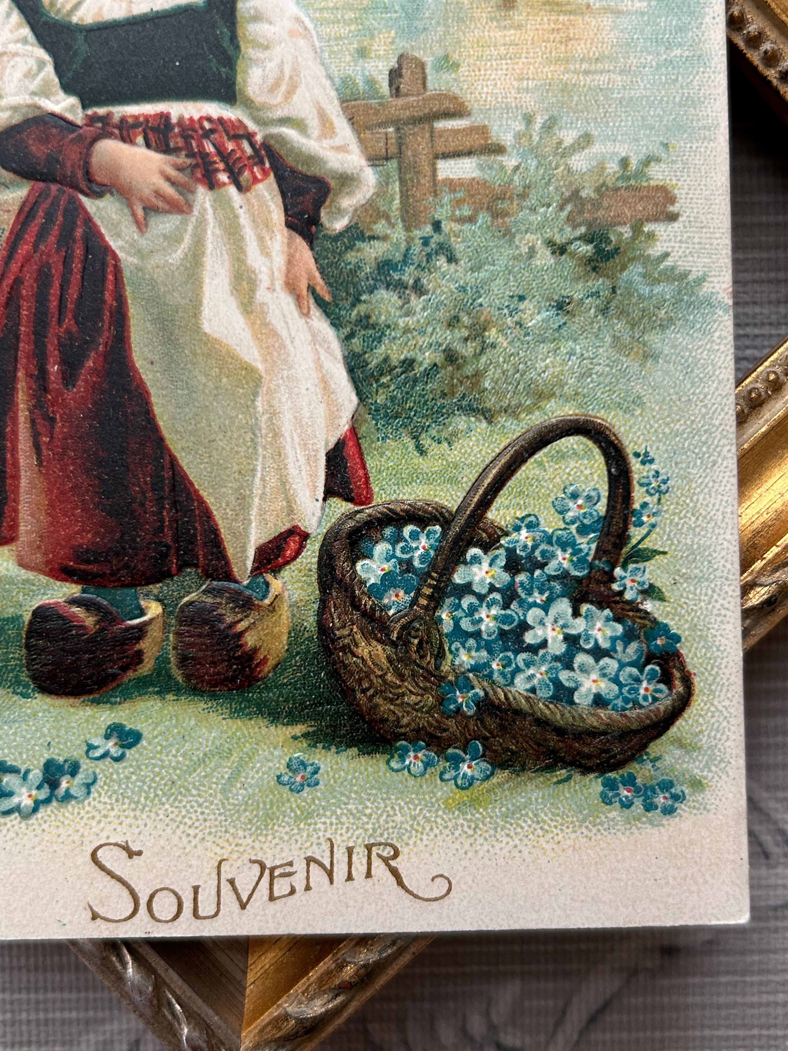 フランスアンティークカード 勿忘草の花籠と少女 エンボス加工 ヴィクトリアン 額装 インテリア小物 コラージュ BE