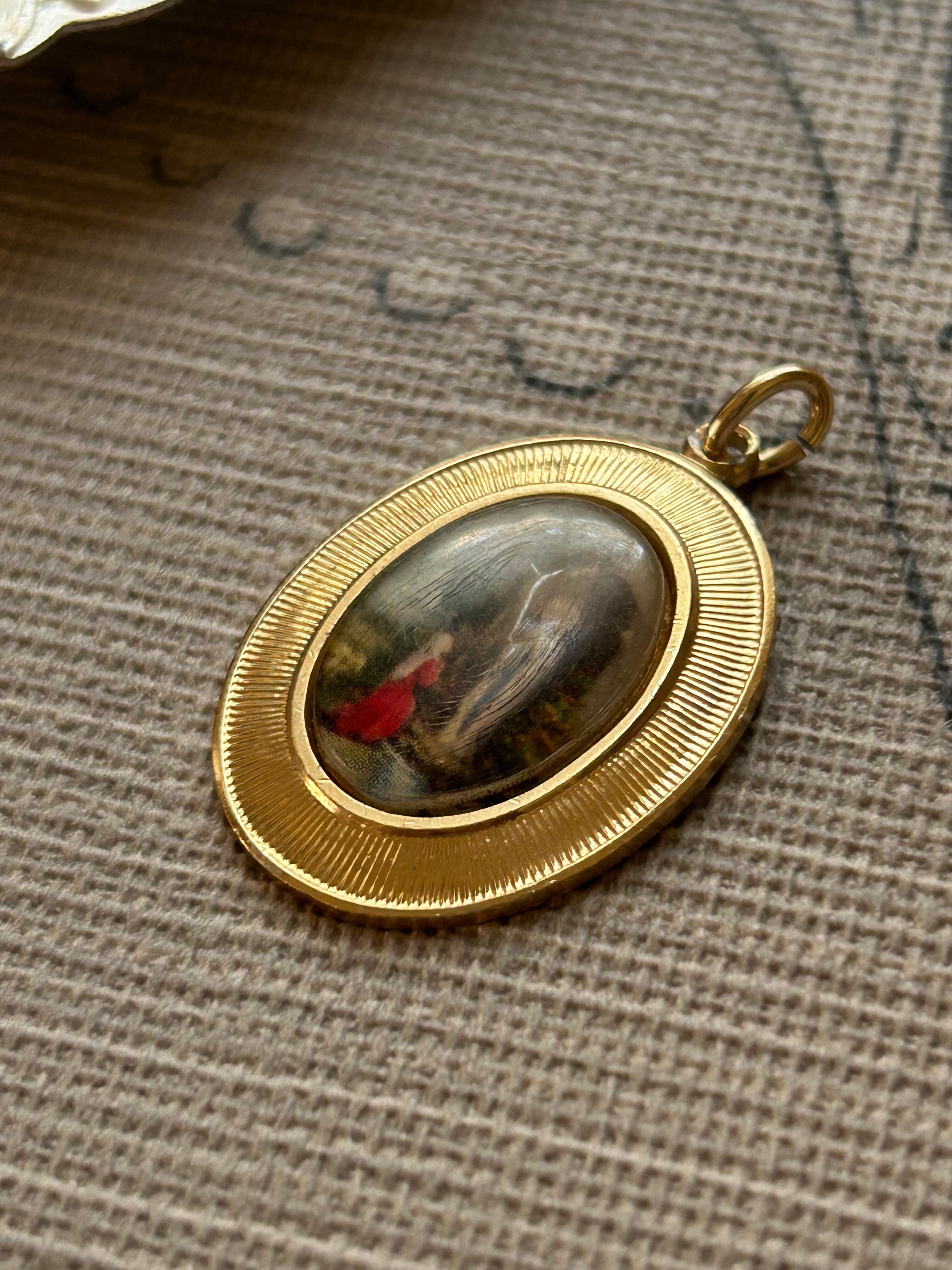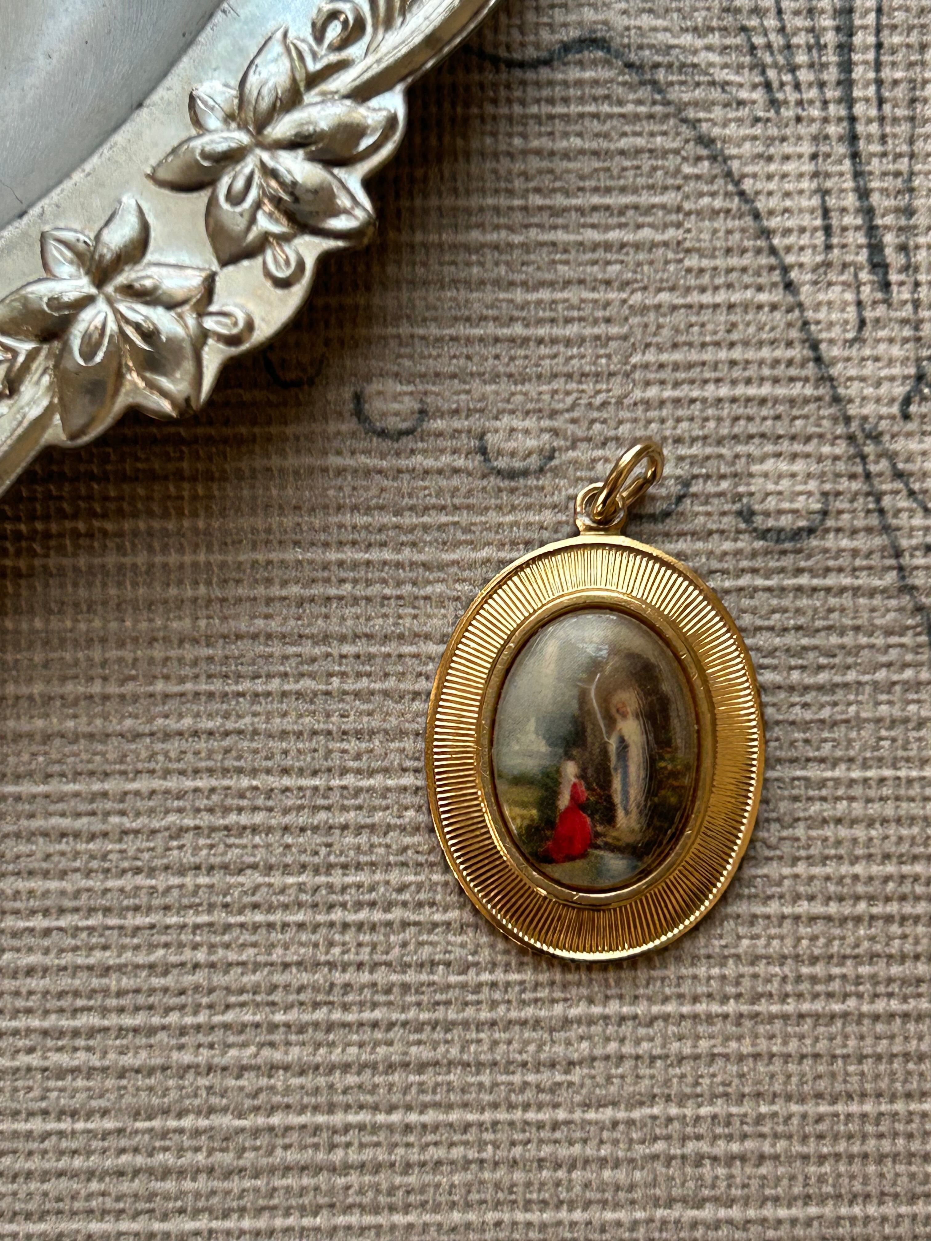 立体的なドーム状になったアクリル×プラスチックのチャーム。ベルナデッタとルルドのマリアのデザイン。