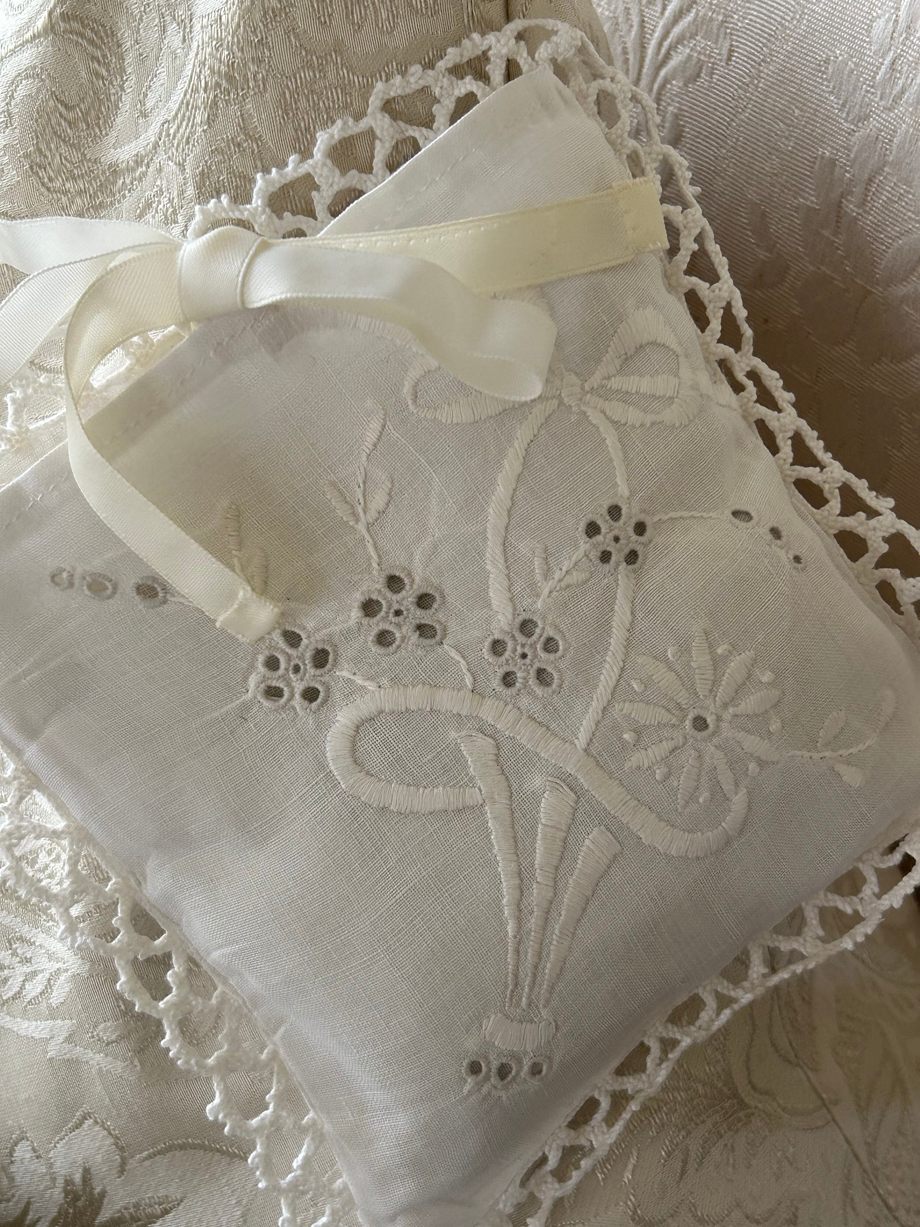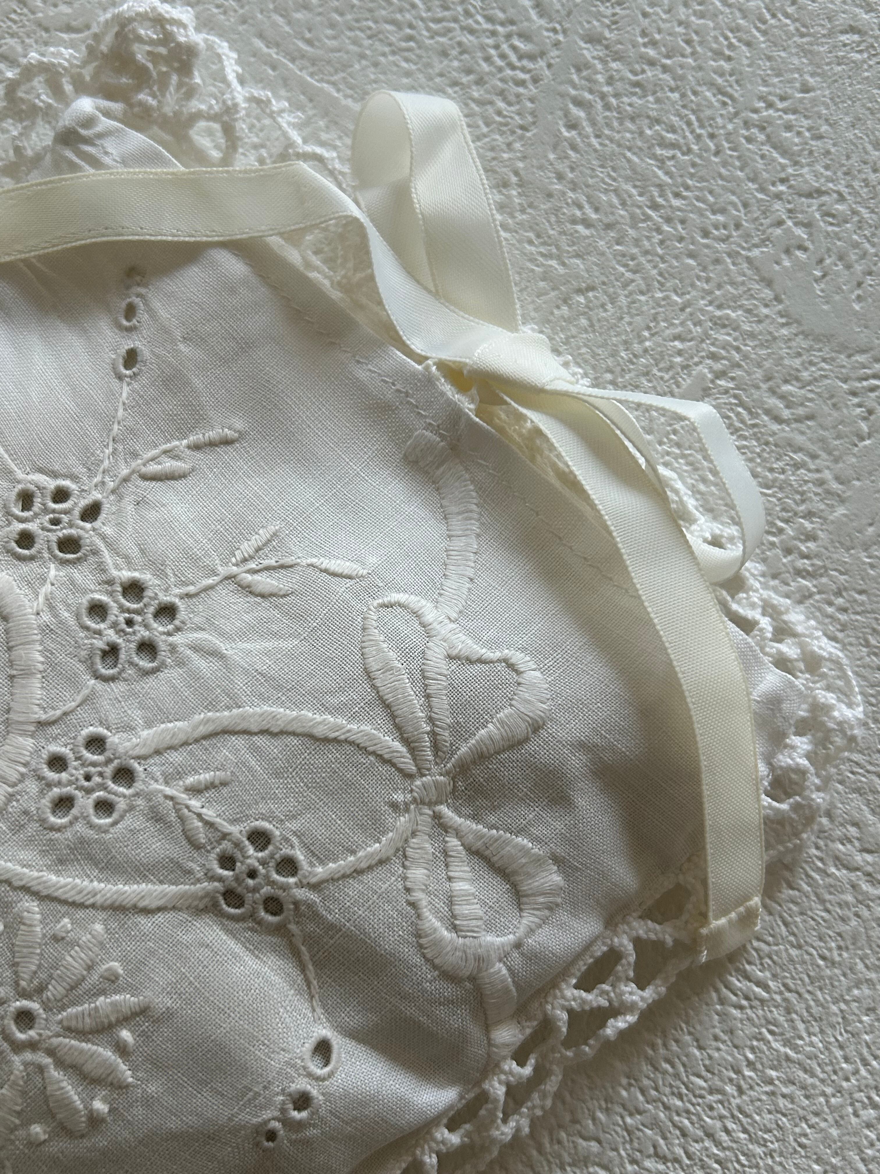 英国Vintage ラベンダーのサシェバッグ サシェ ホワイト刺繍 花籠 Ruban リボン柄 インテリア 撮影小物