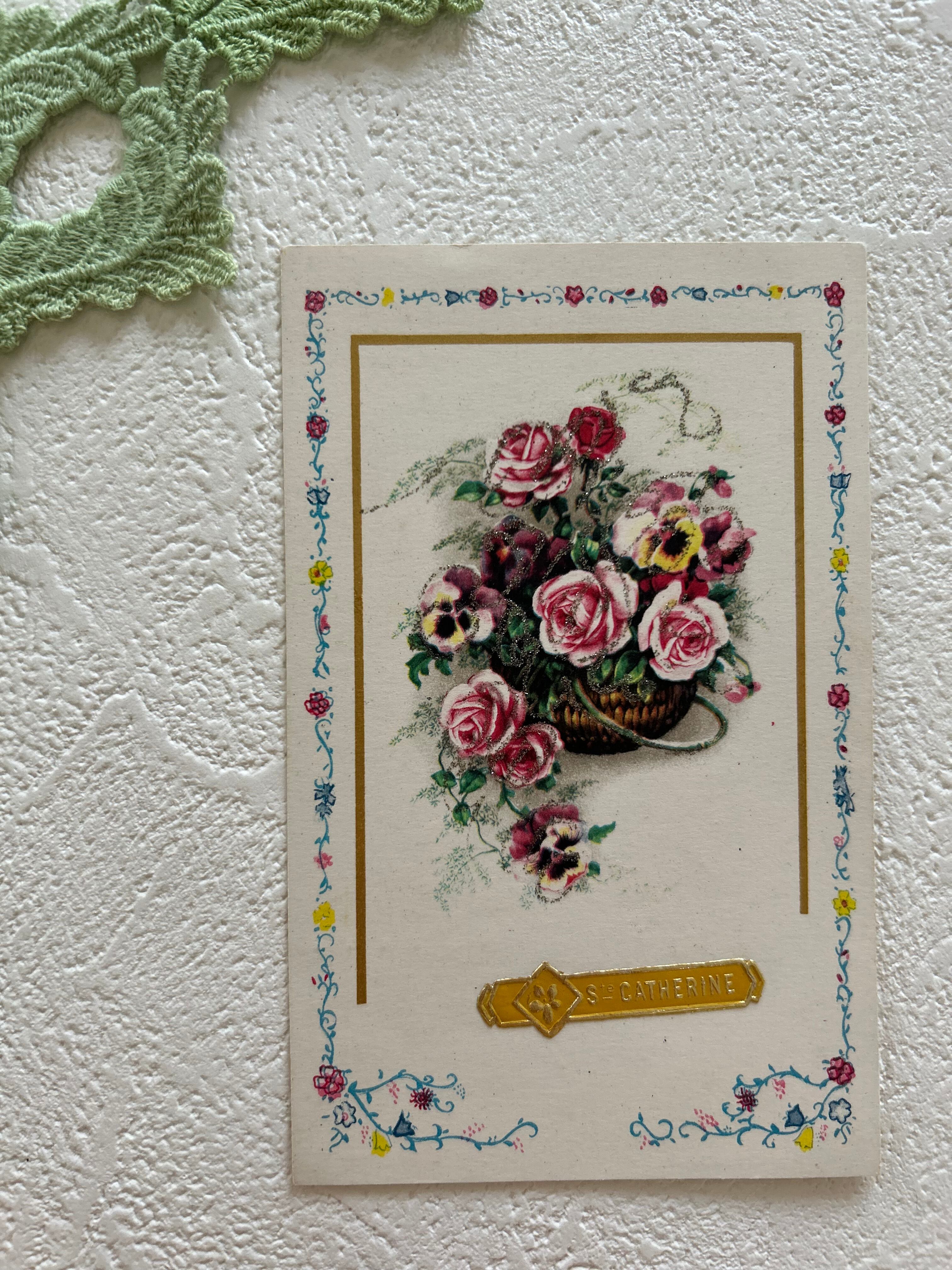 アンティークポストカード パンジーの花籠 PansyとRose 額装 インテリア フランス グリッター BE