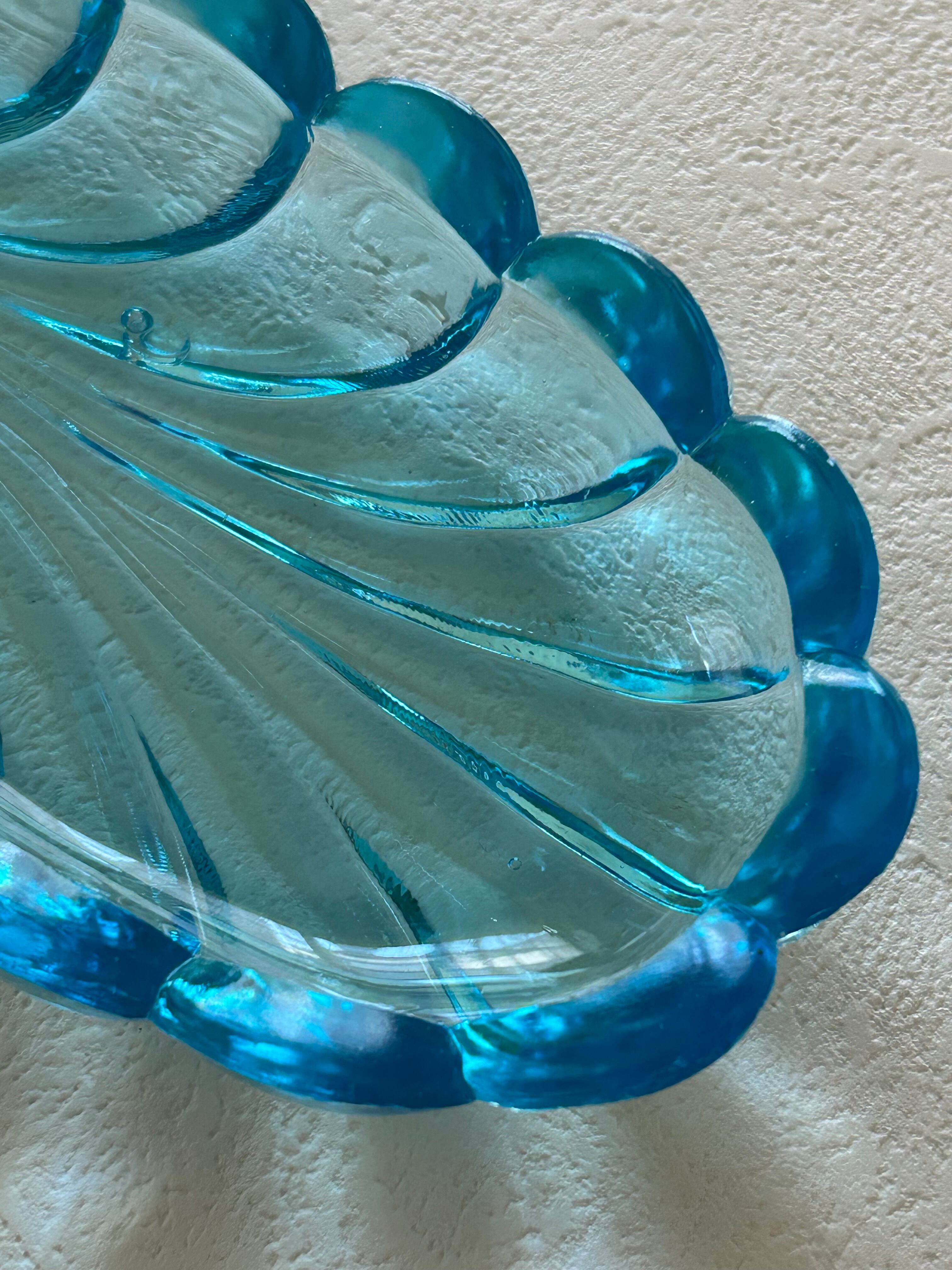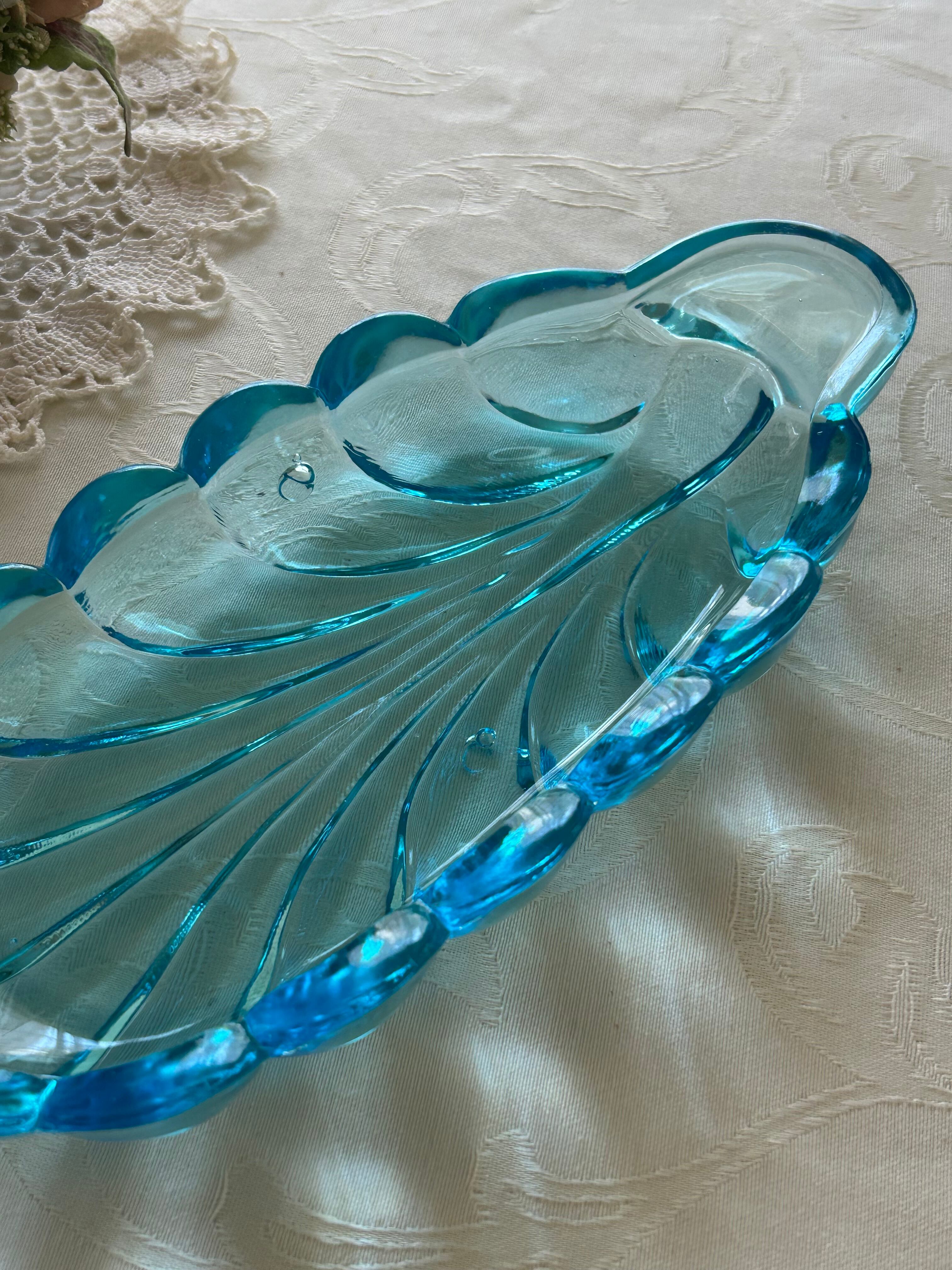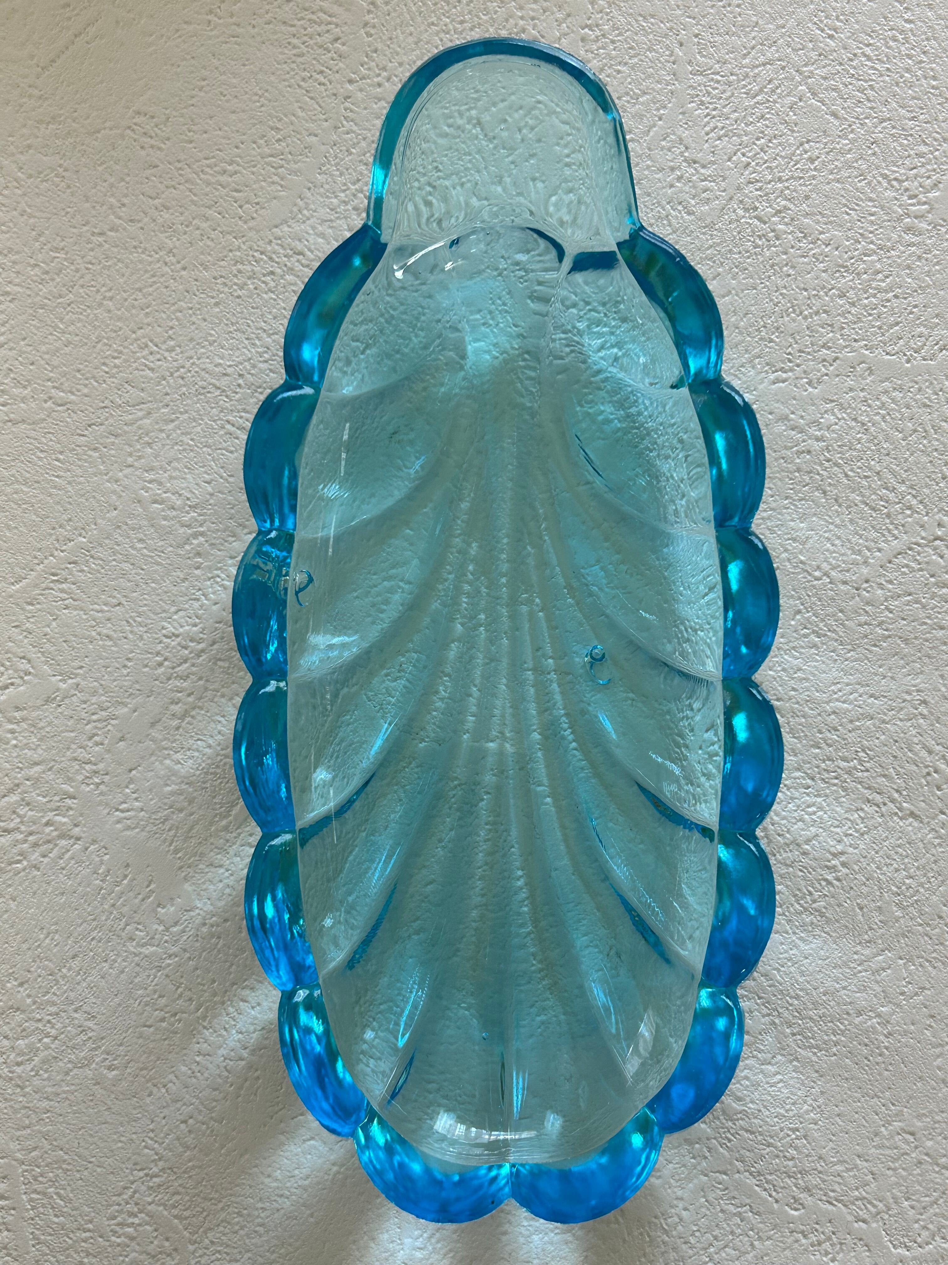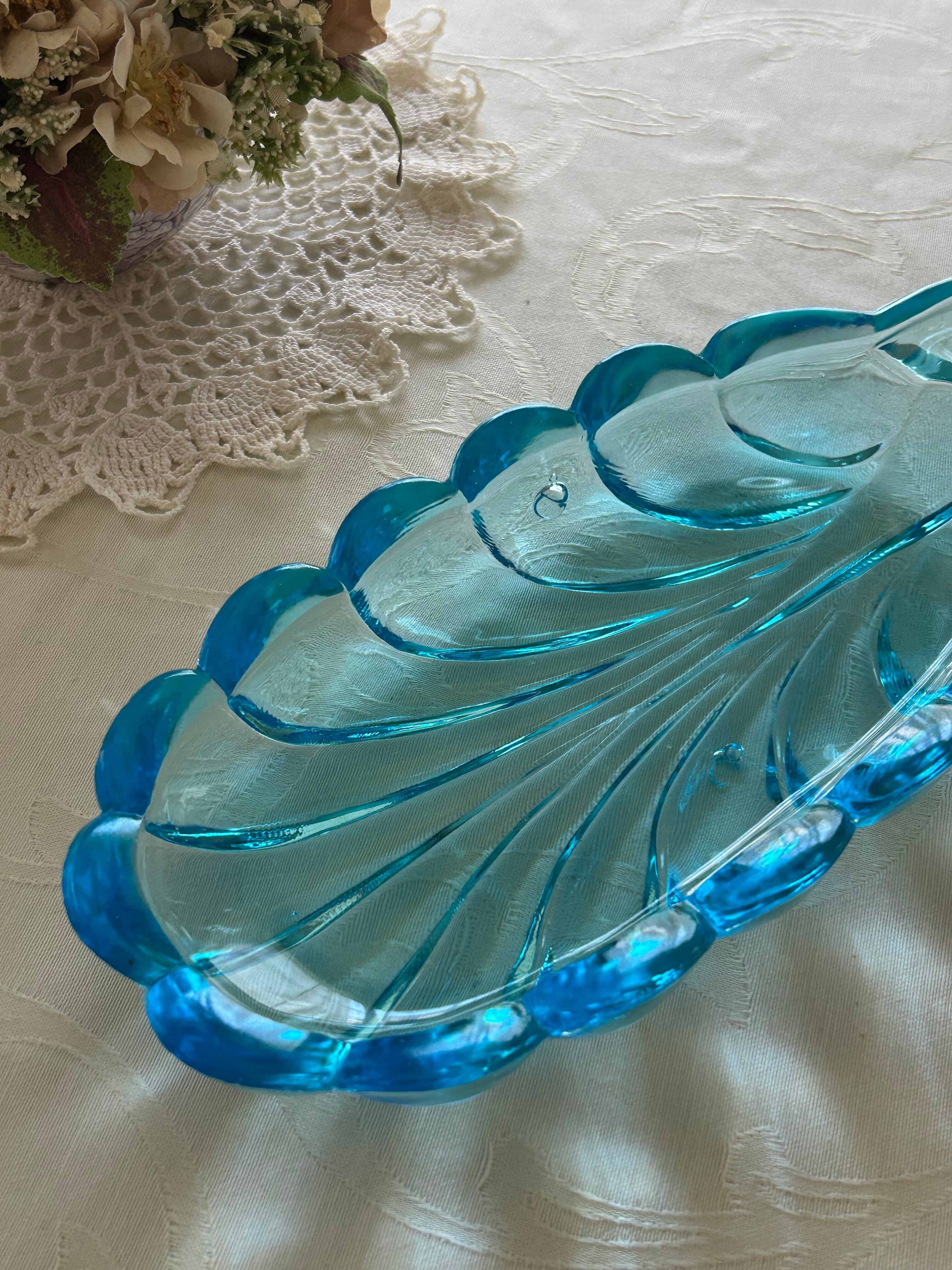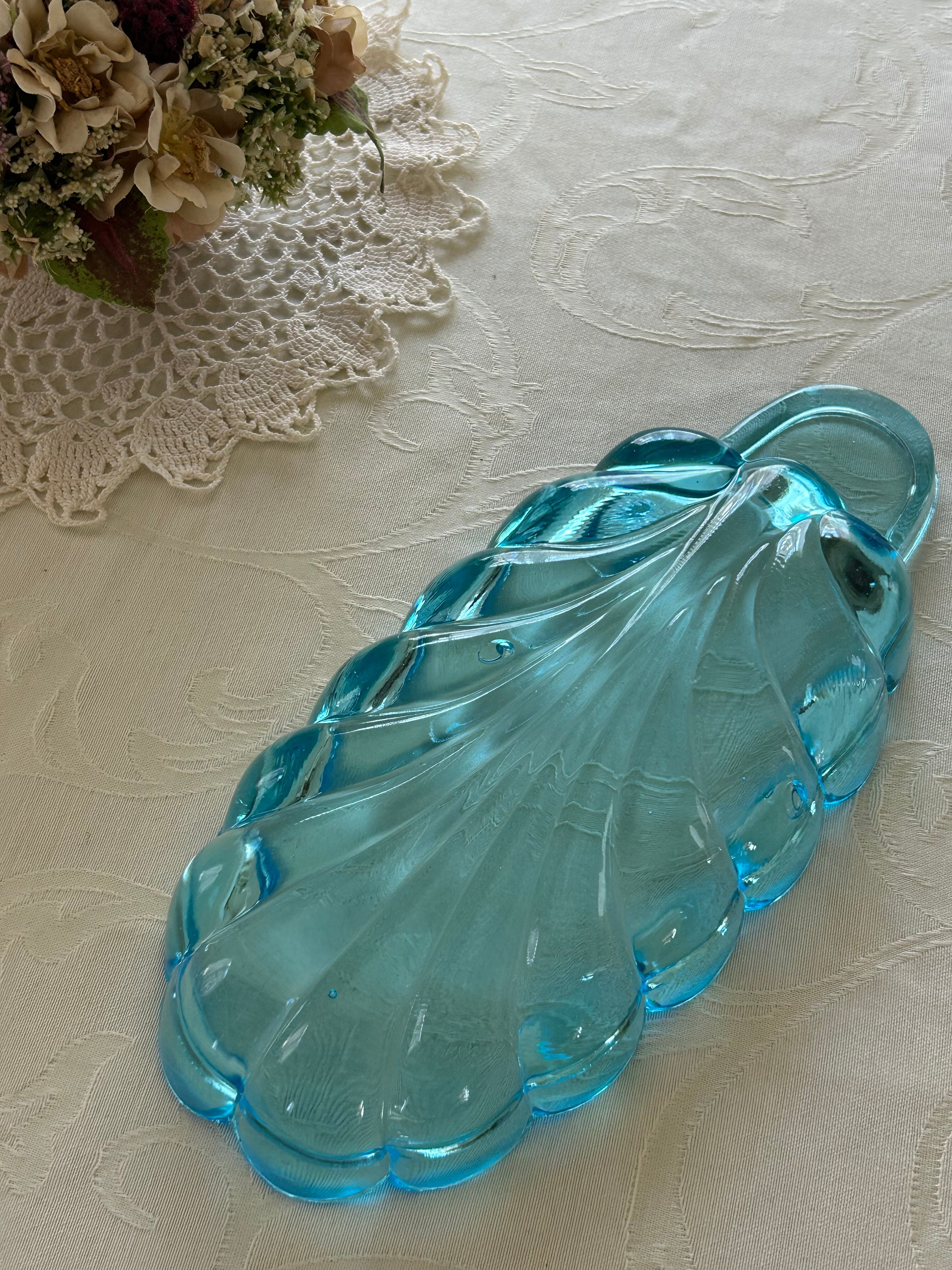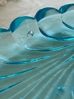 英国Vintage シェル型 ガラスプレート クリアブルー テーブルウェア 小物置き トレイ 撮影小物 インテリア小物