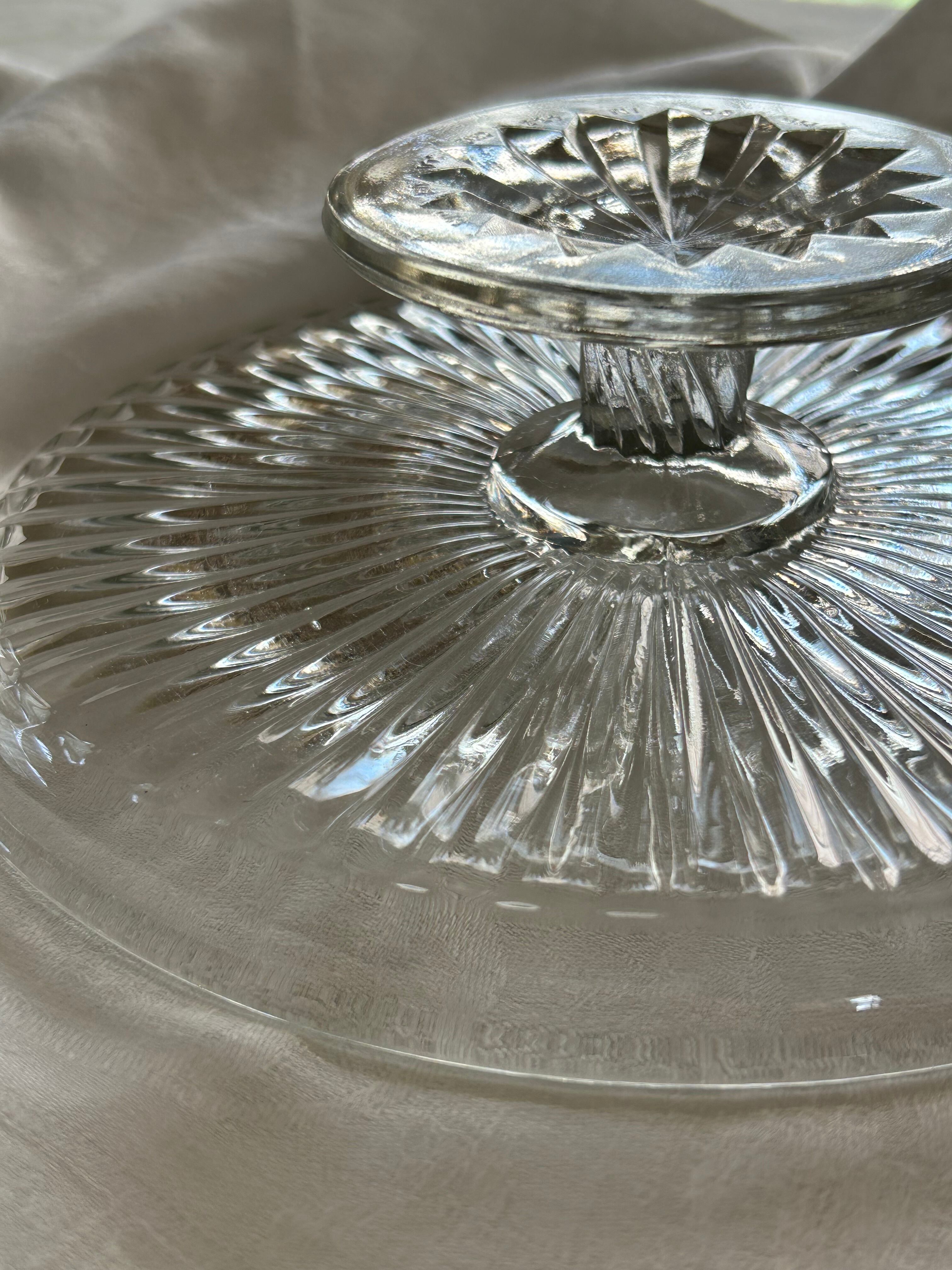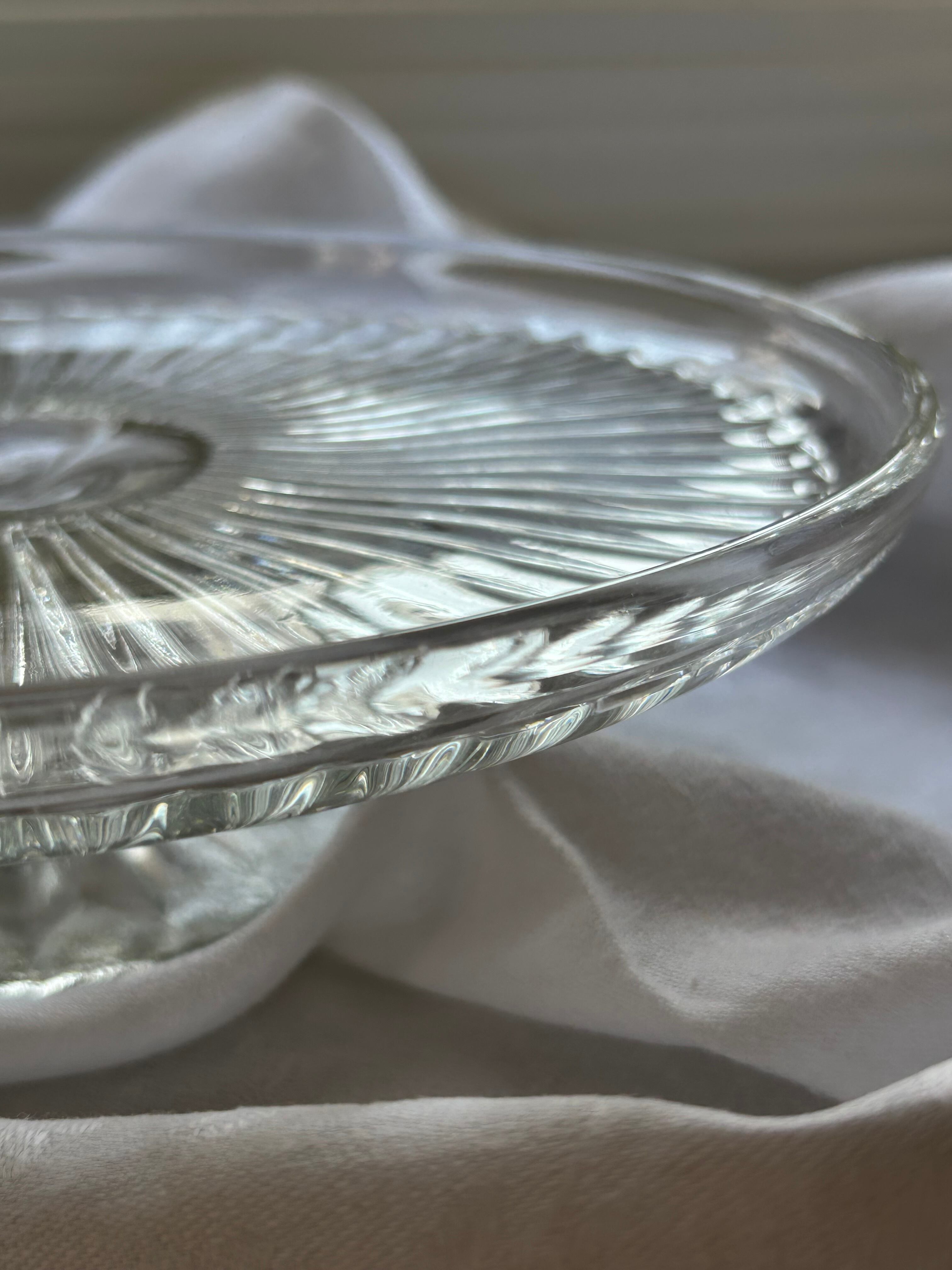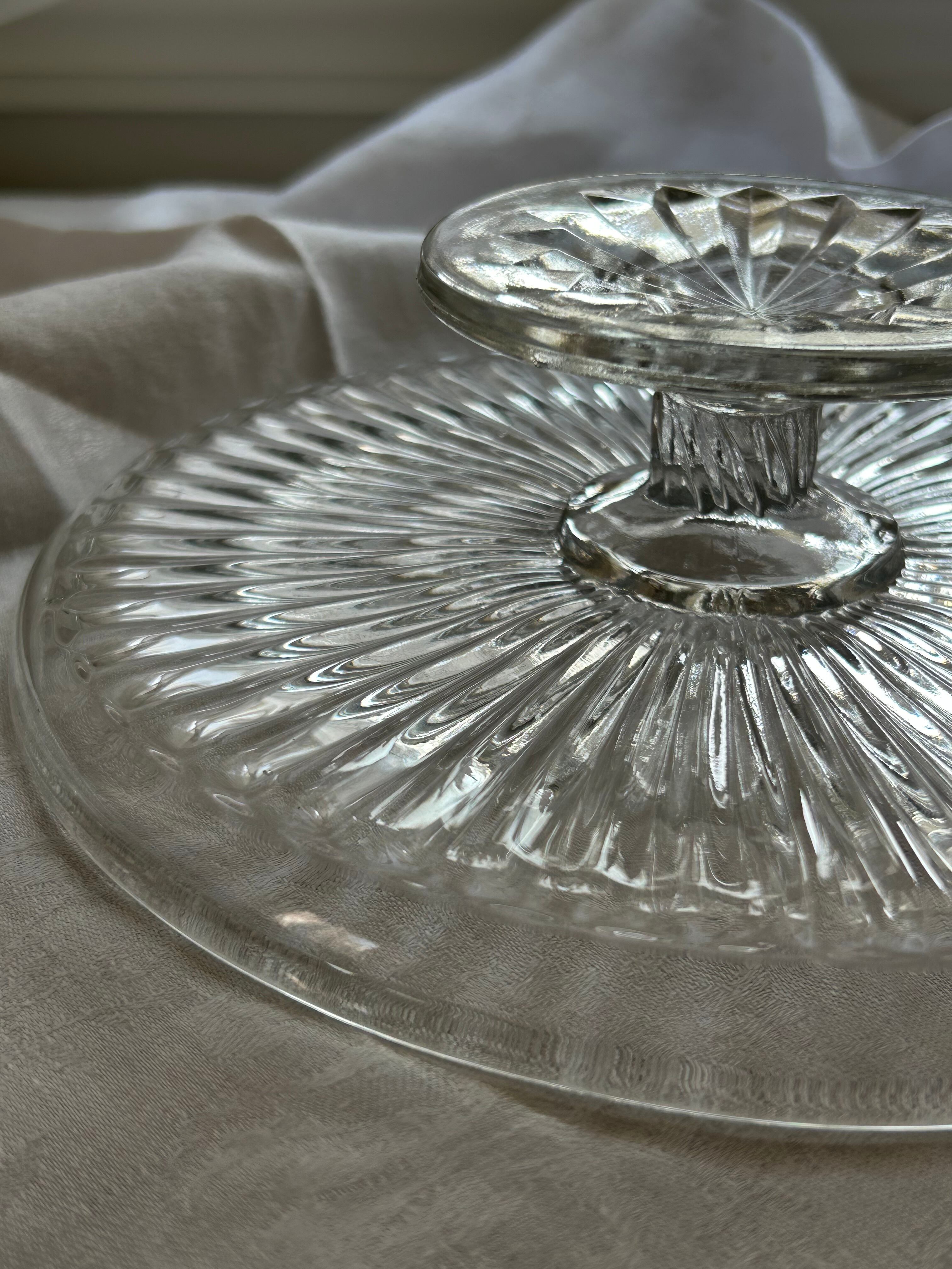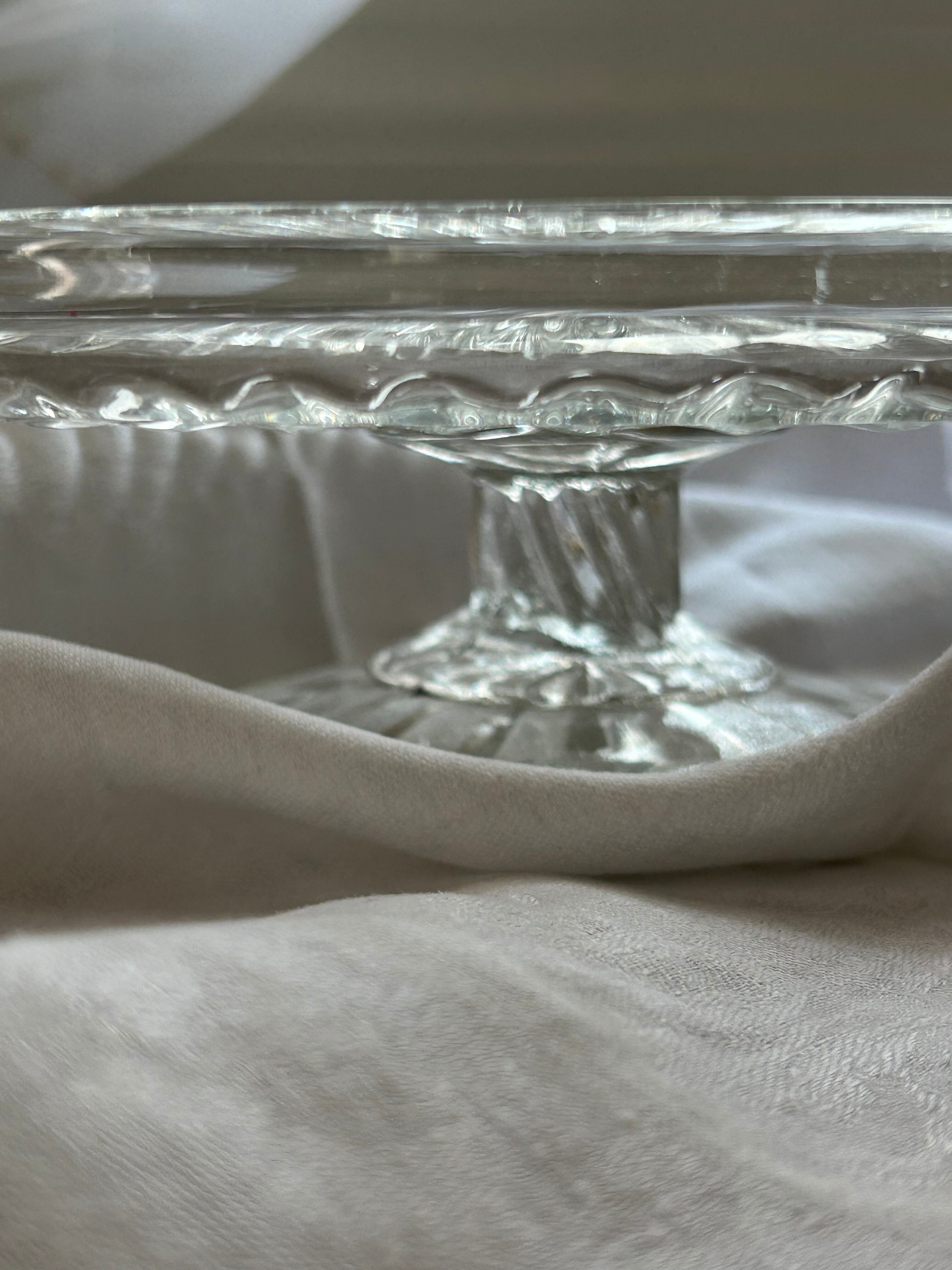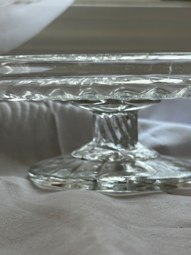 溶かしたガラスを型に流し込んで形成するプレスガラスで作られたケーキスタンド。