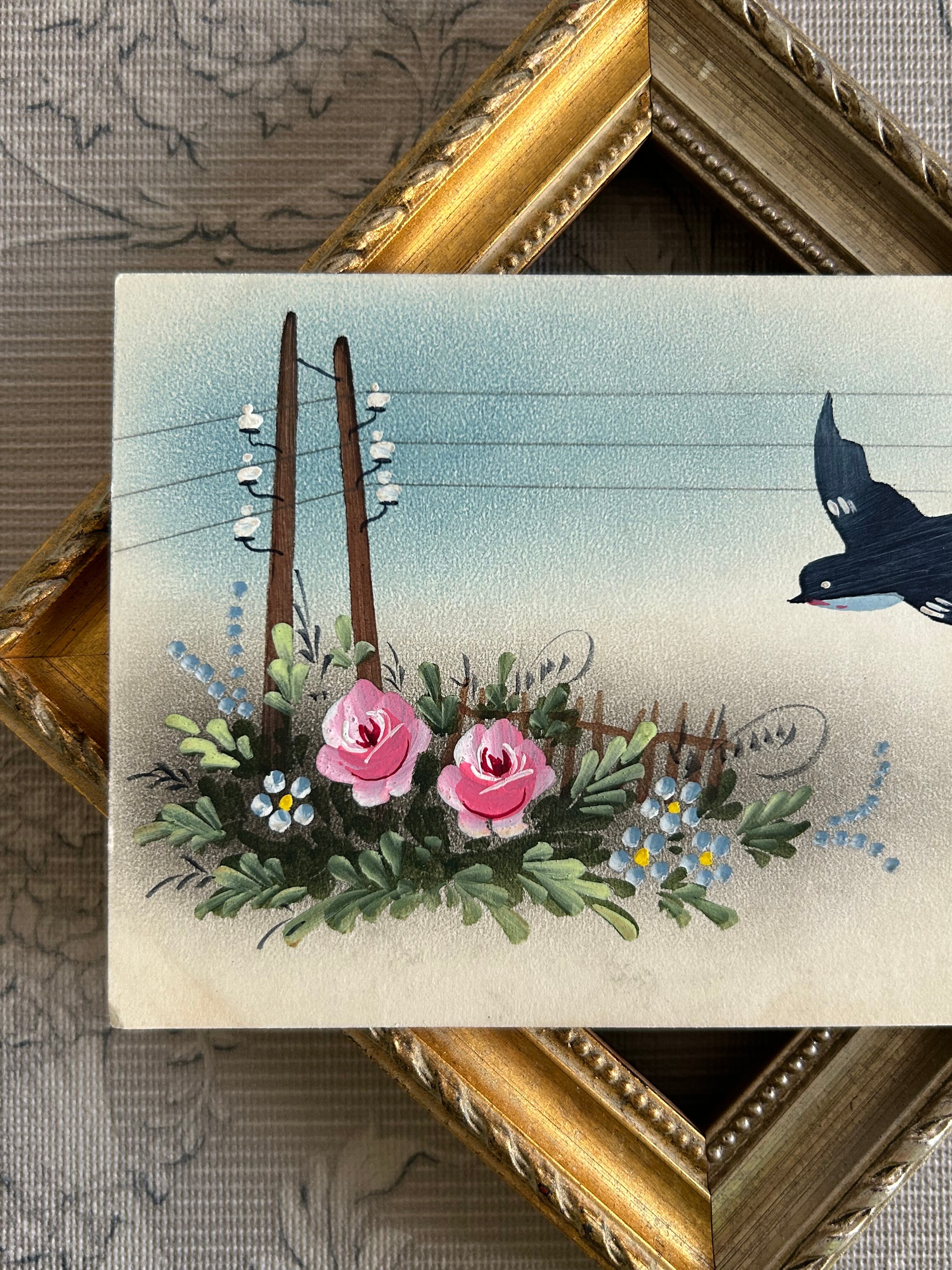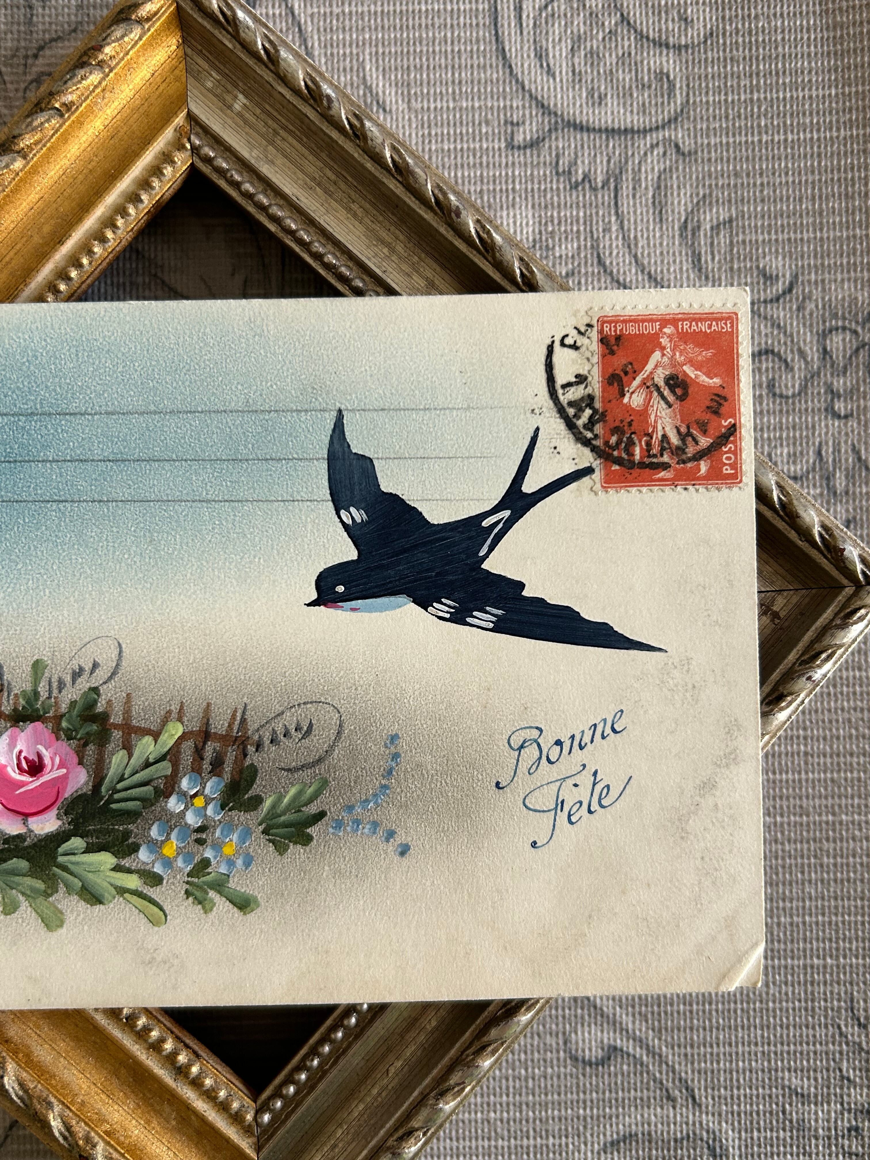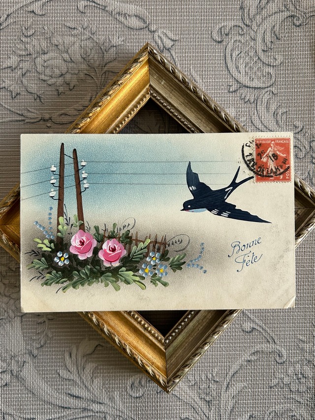 アンティークポストカード つばめ 勿忘草 Rose Bonne Fete 額装 インテリア フランス コレクション BE