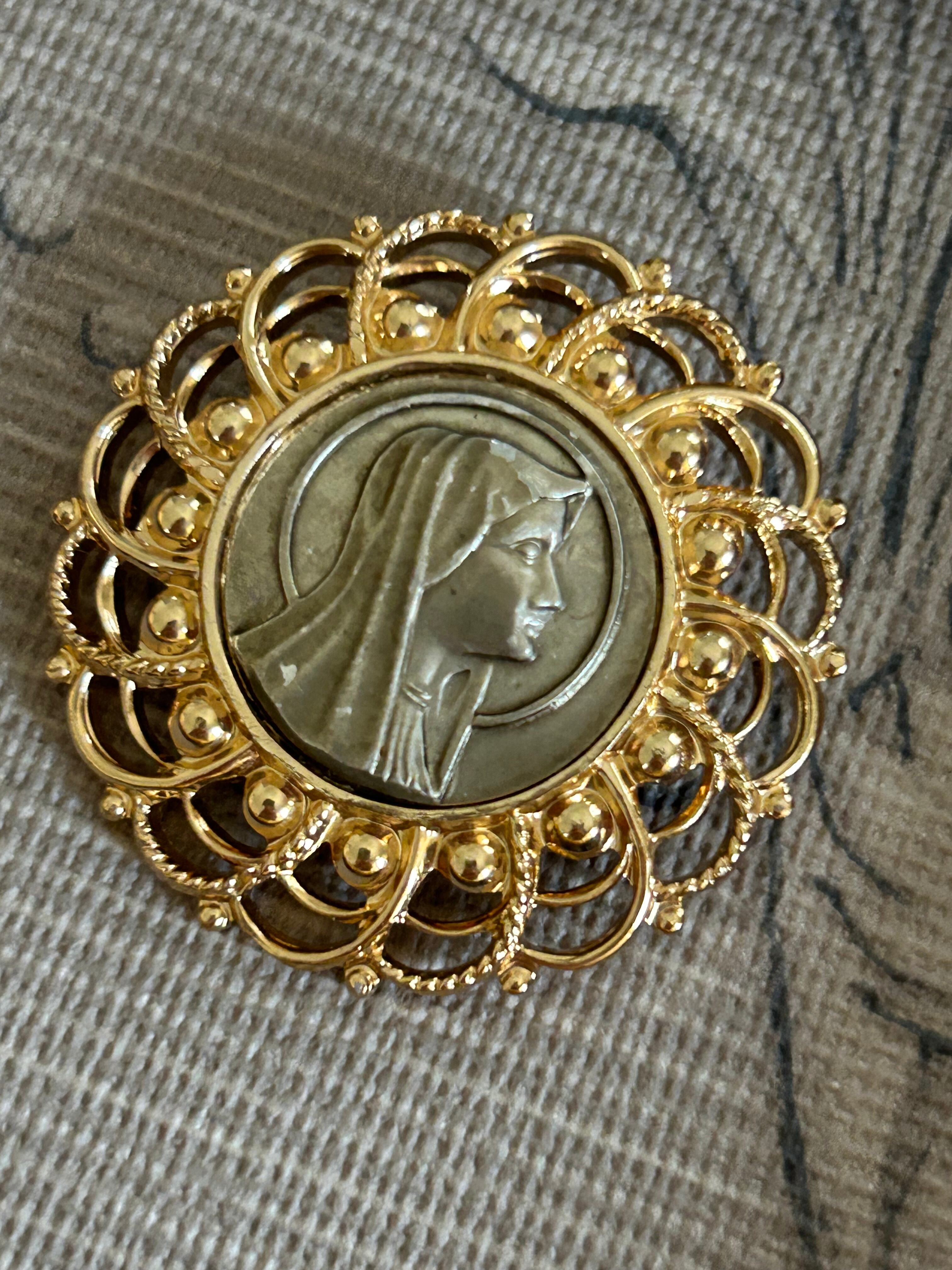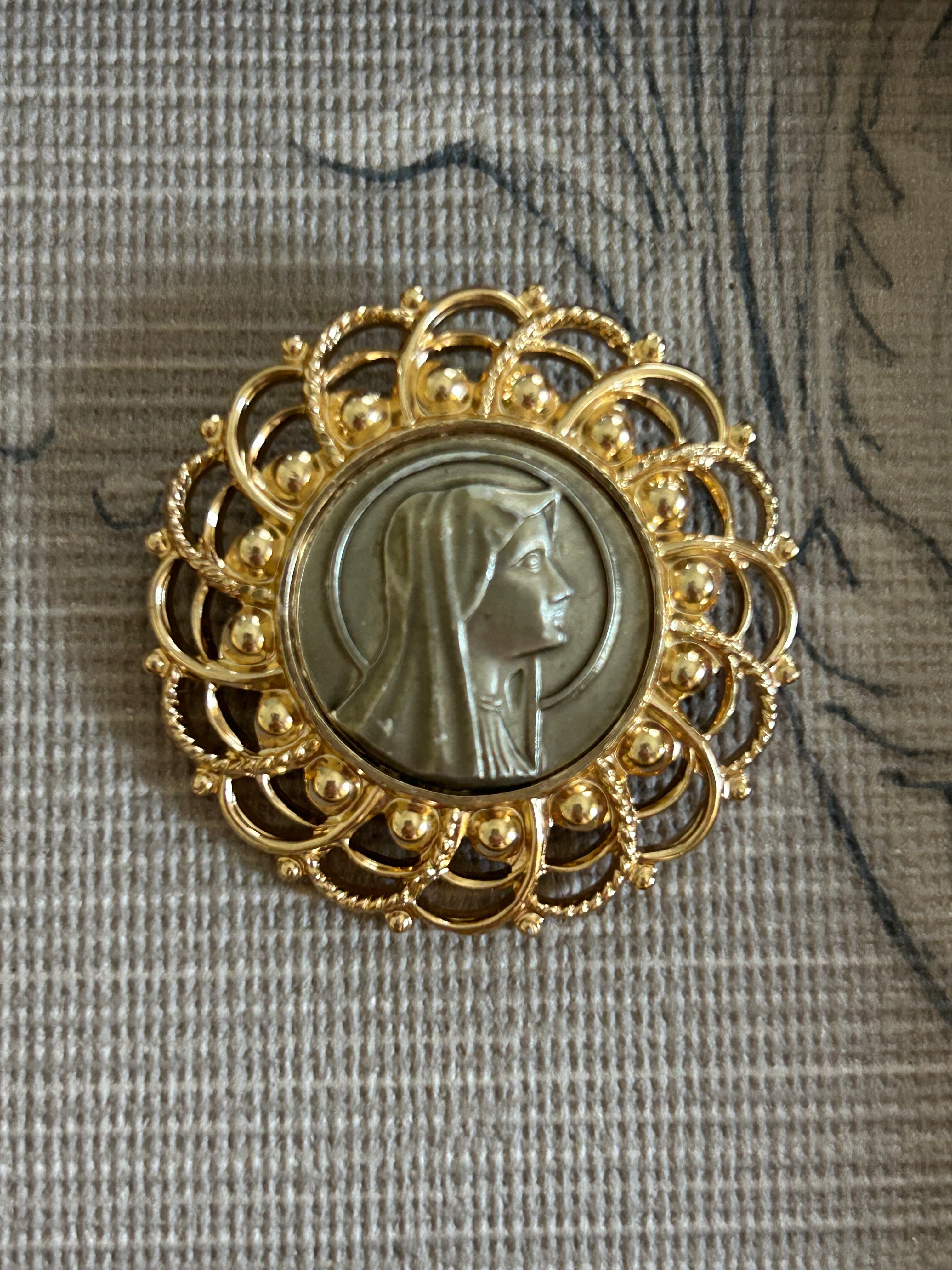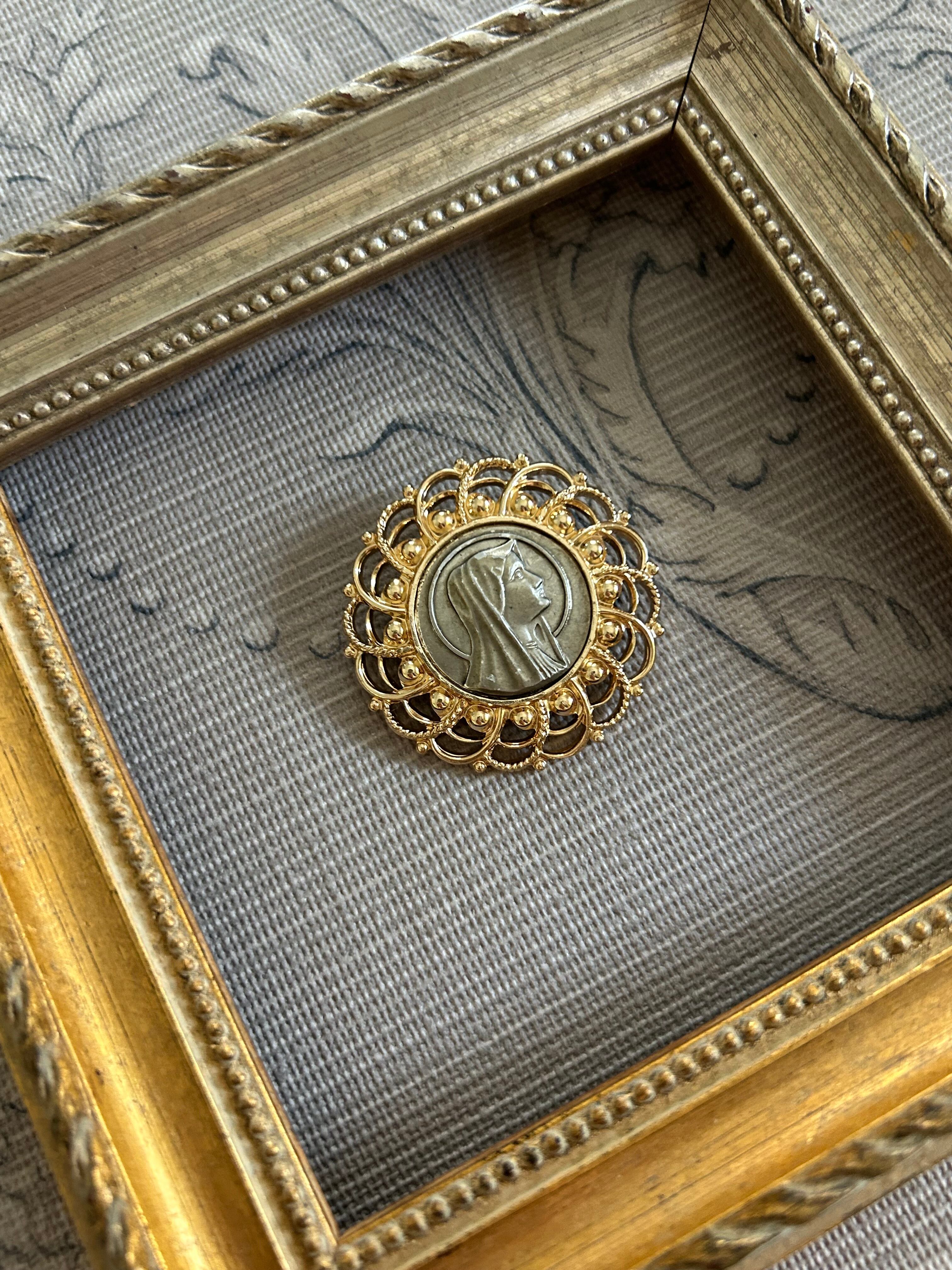 華やかなゴールドの透かしのフレームに聖母マリア様のカボションがセッティングされたクラシカルで美しいブローチです。