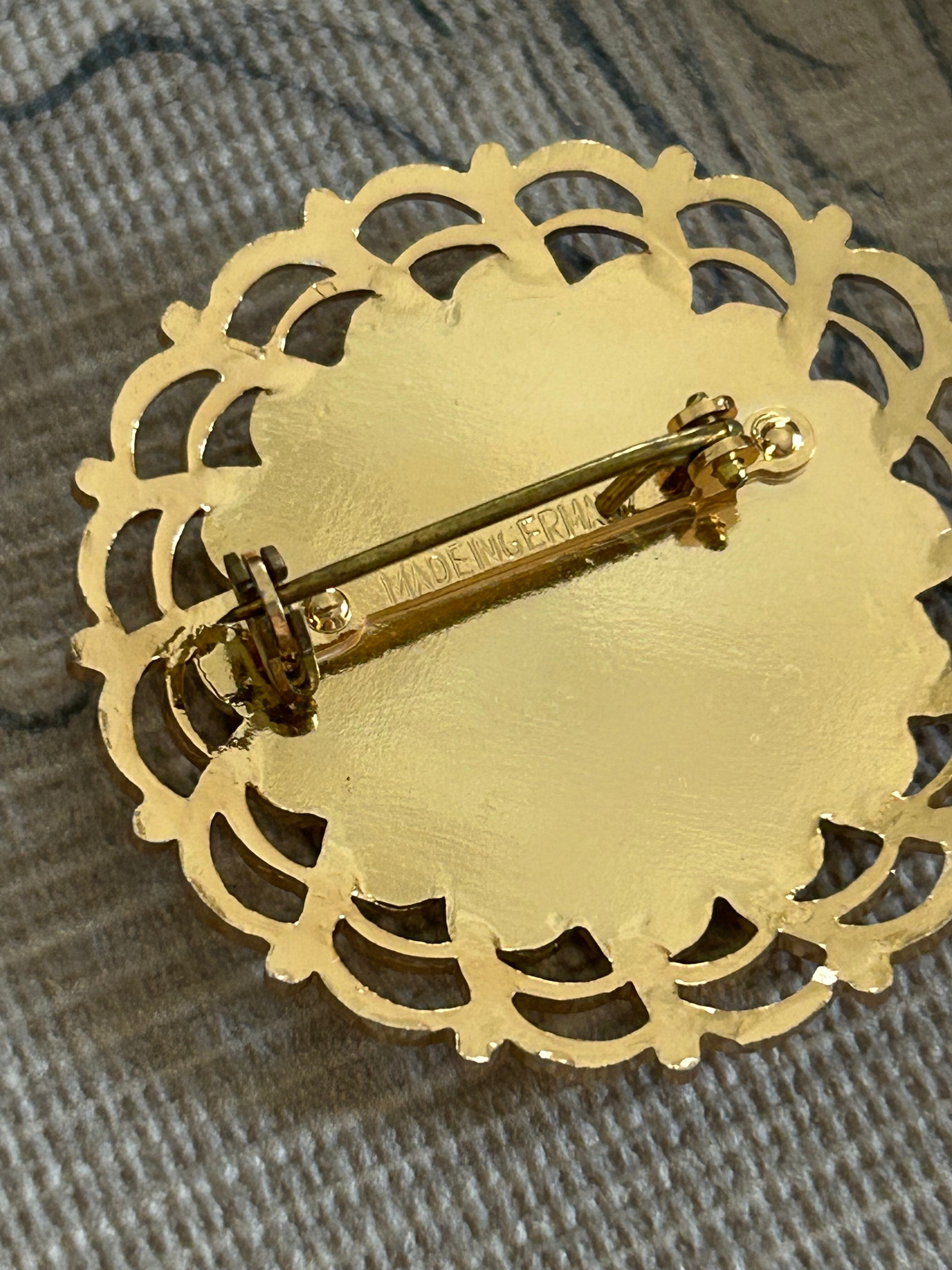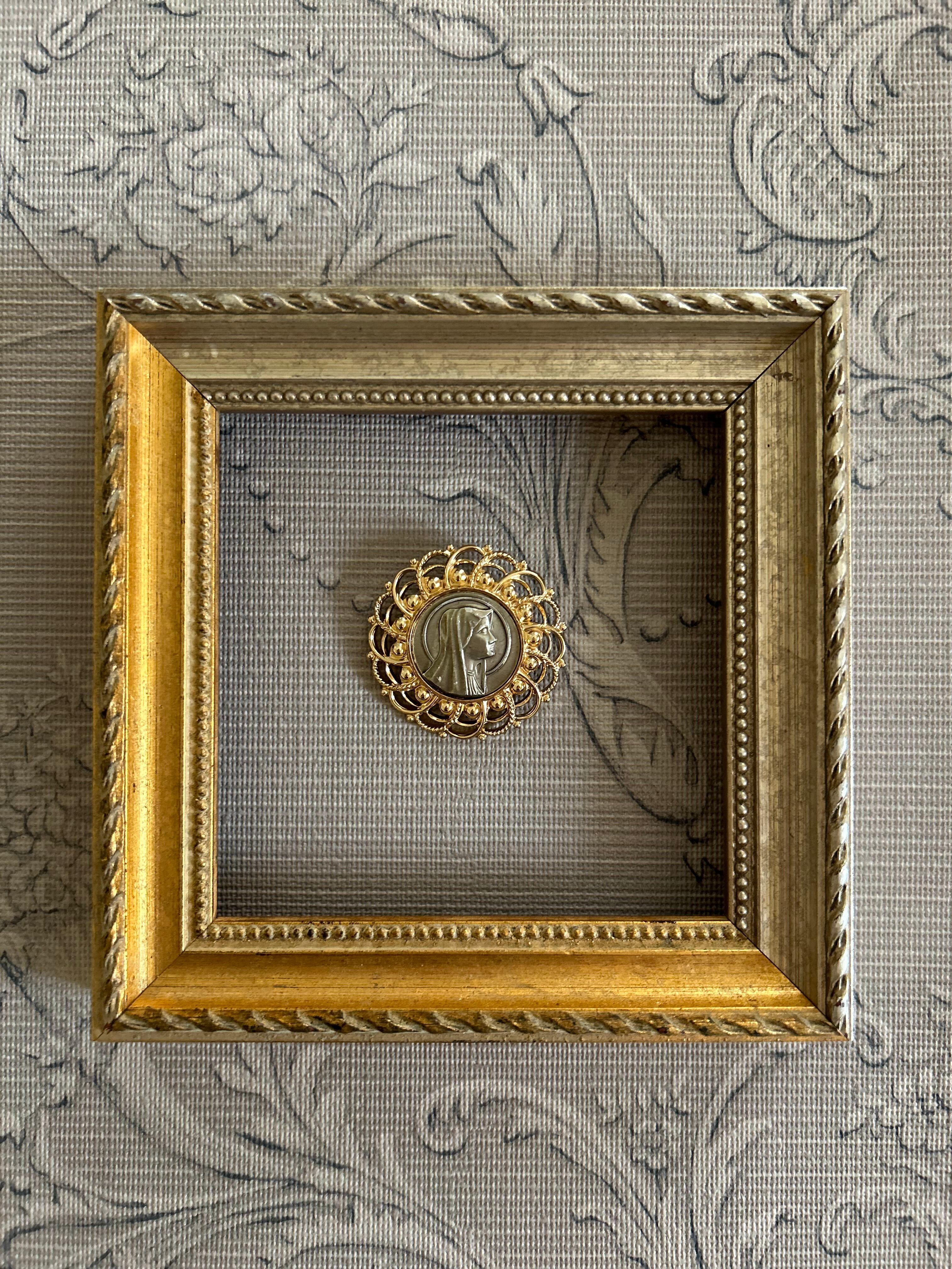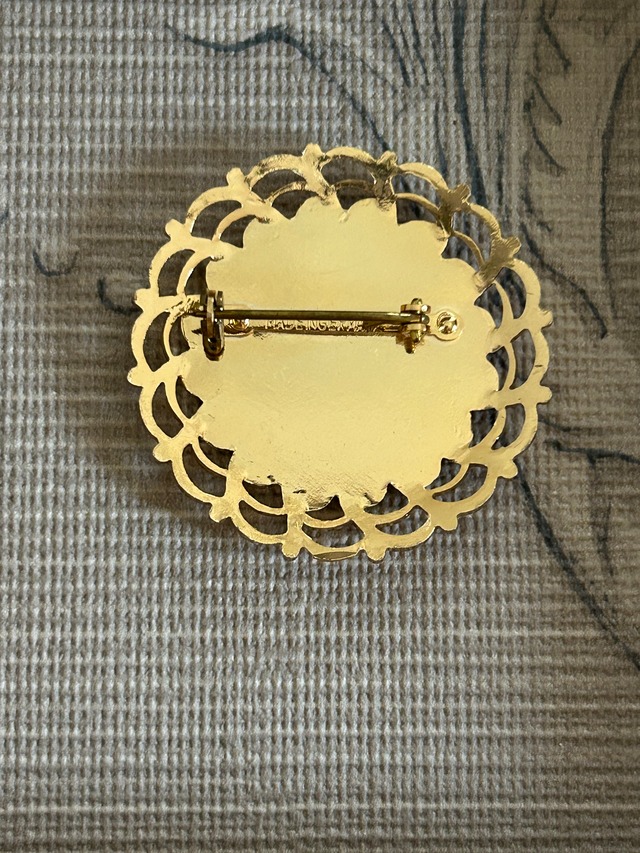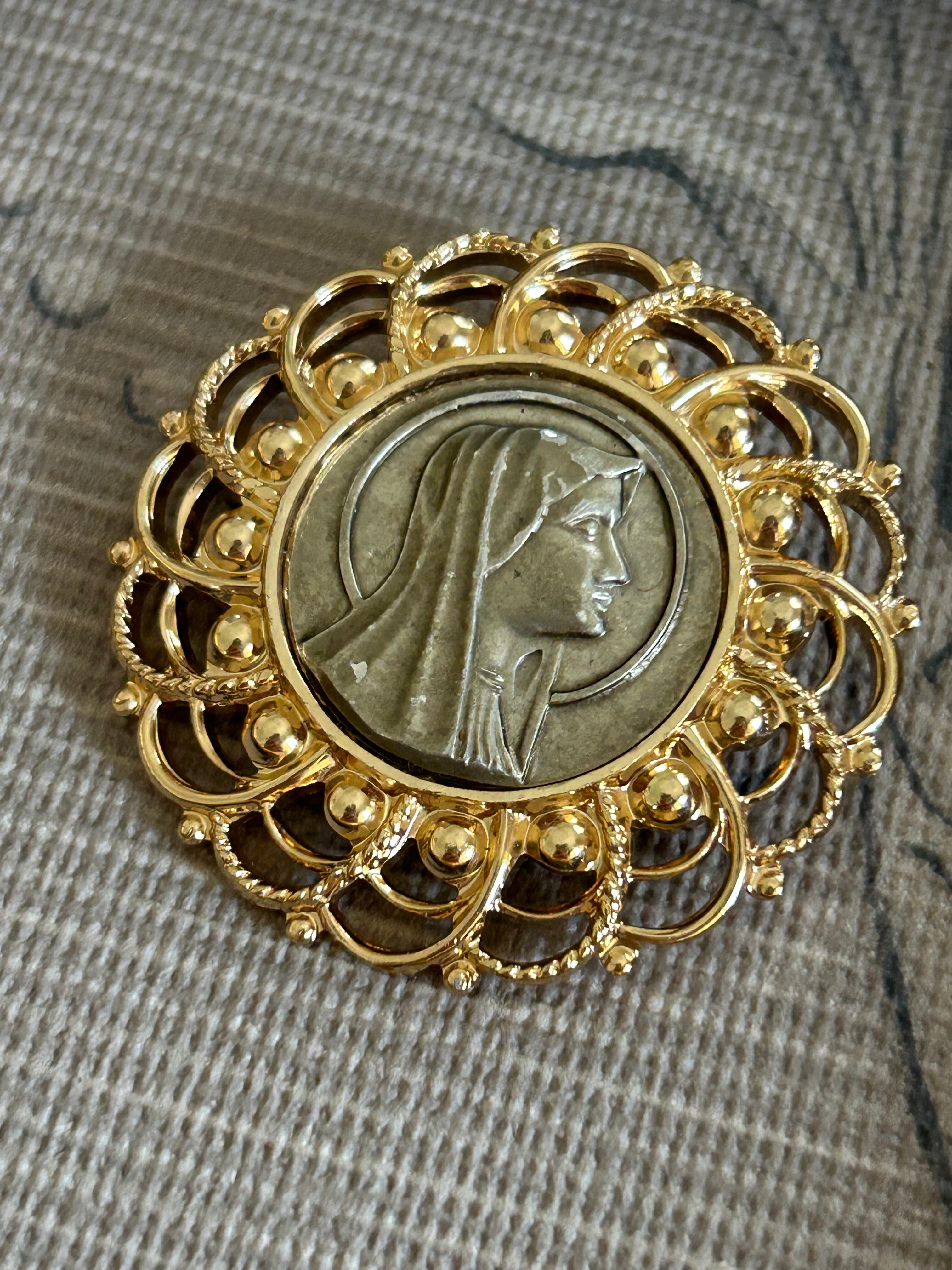 華やかなゴールドの透かしのフレームに聖母マリア様のカボションがセッティングされたクラシカルで美しいブローチです。