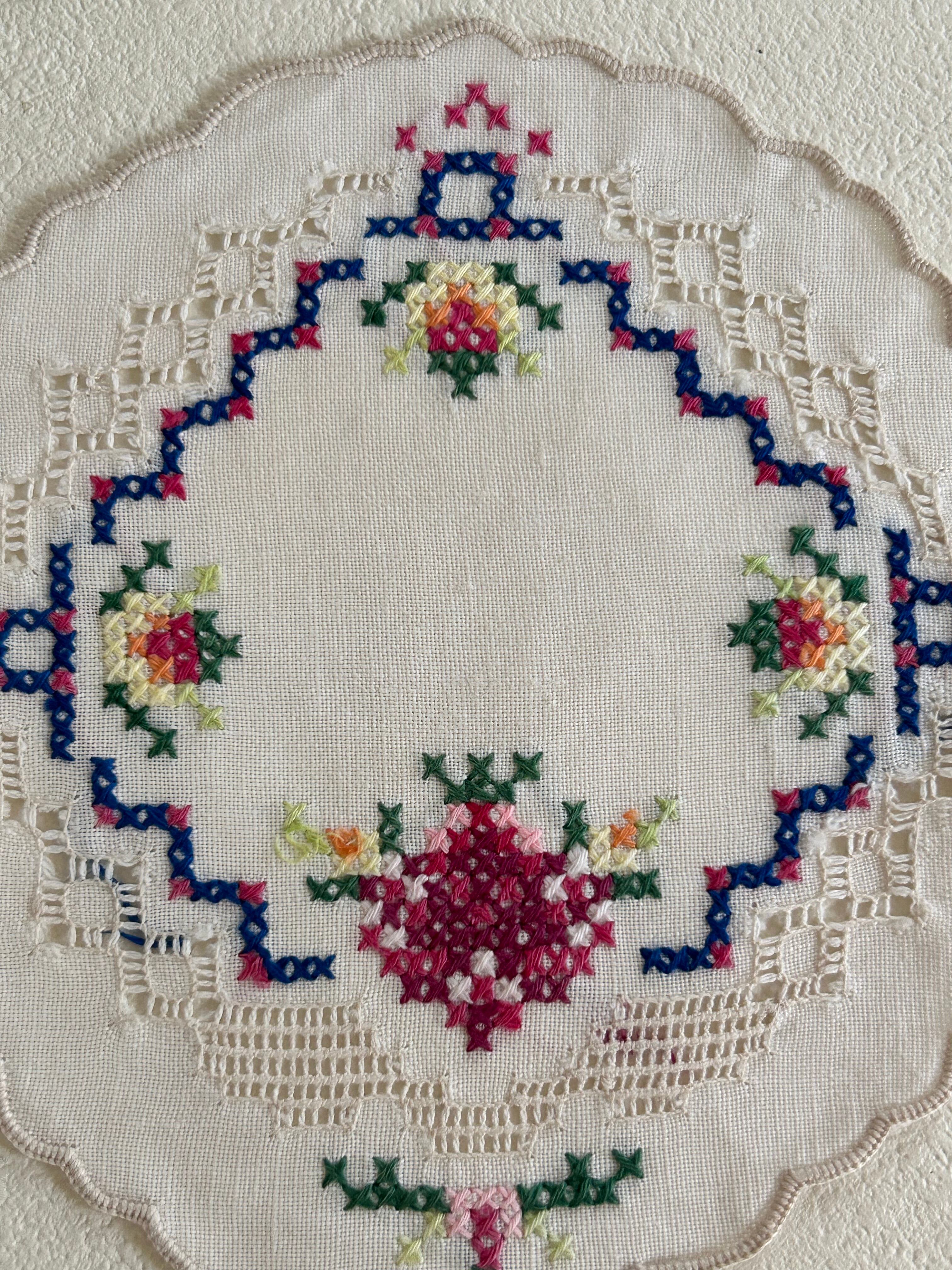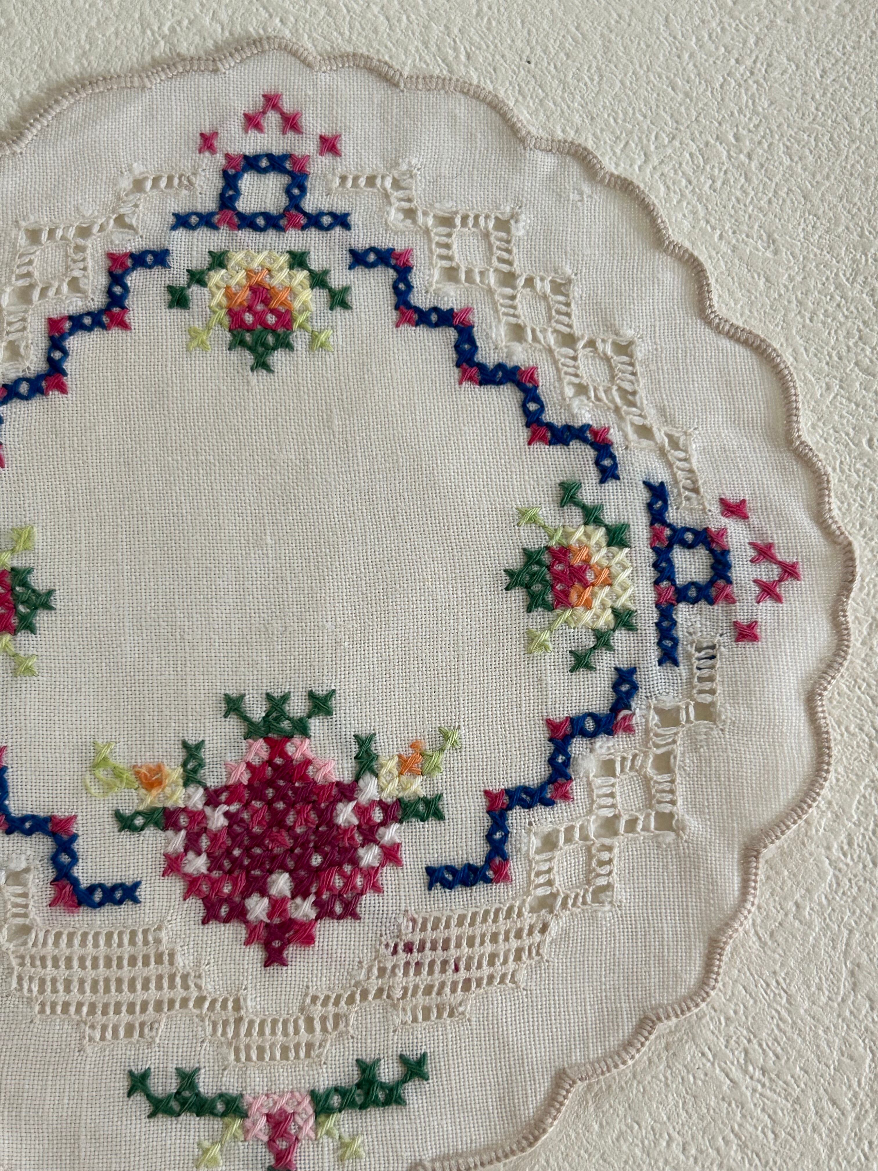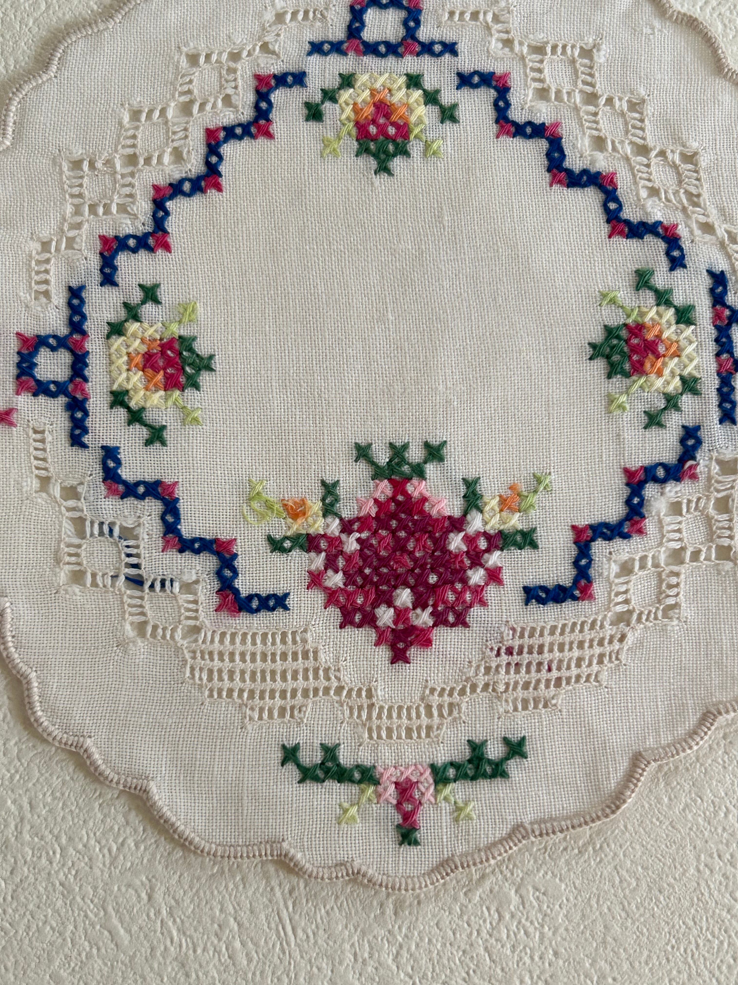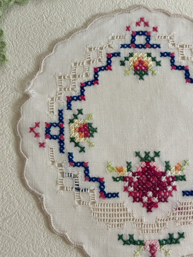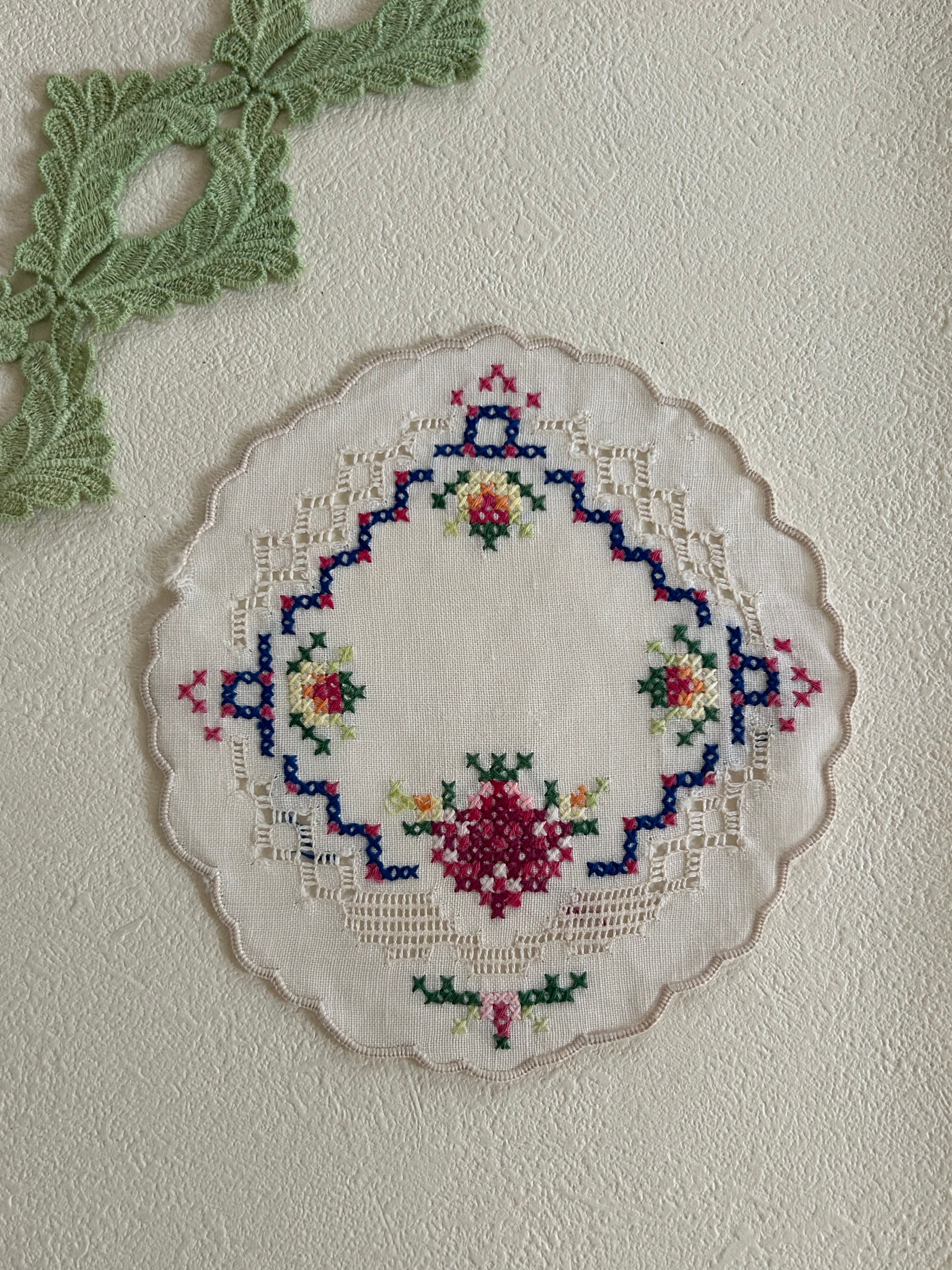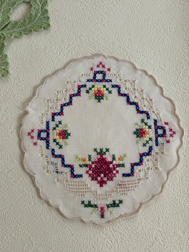 手仕事のドイリーです。カットワーク、クロスステッチのお花が素敵です。