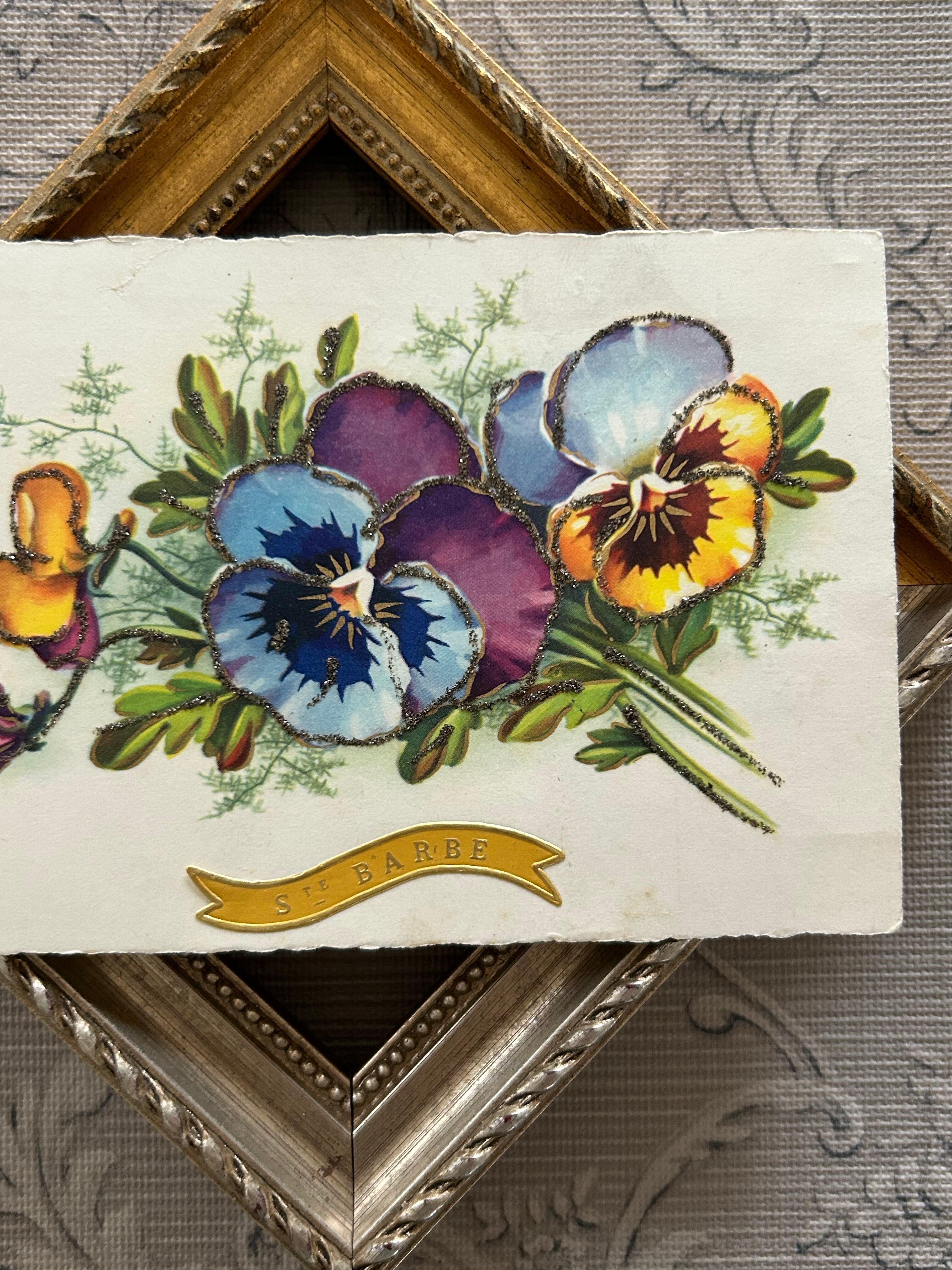 アンティークポストカード フランス パンジー グリッター 額装 インテリア小物 コレクション BE
