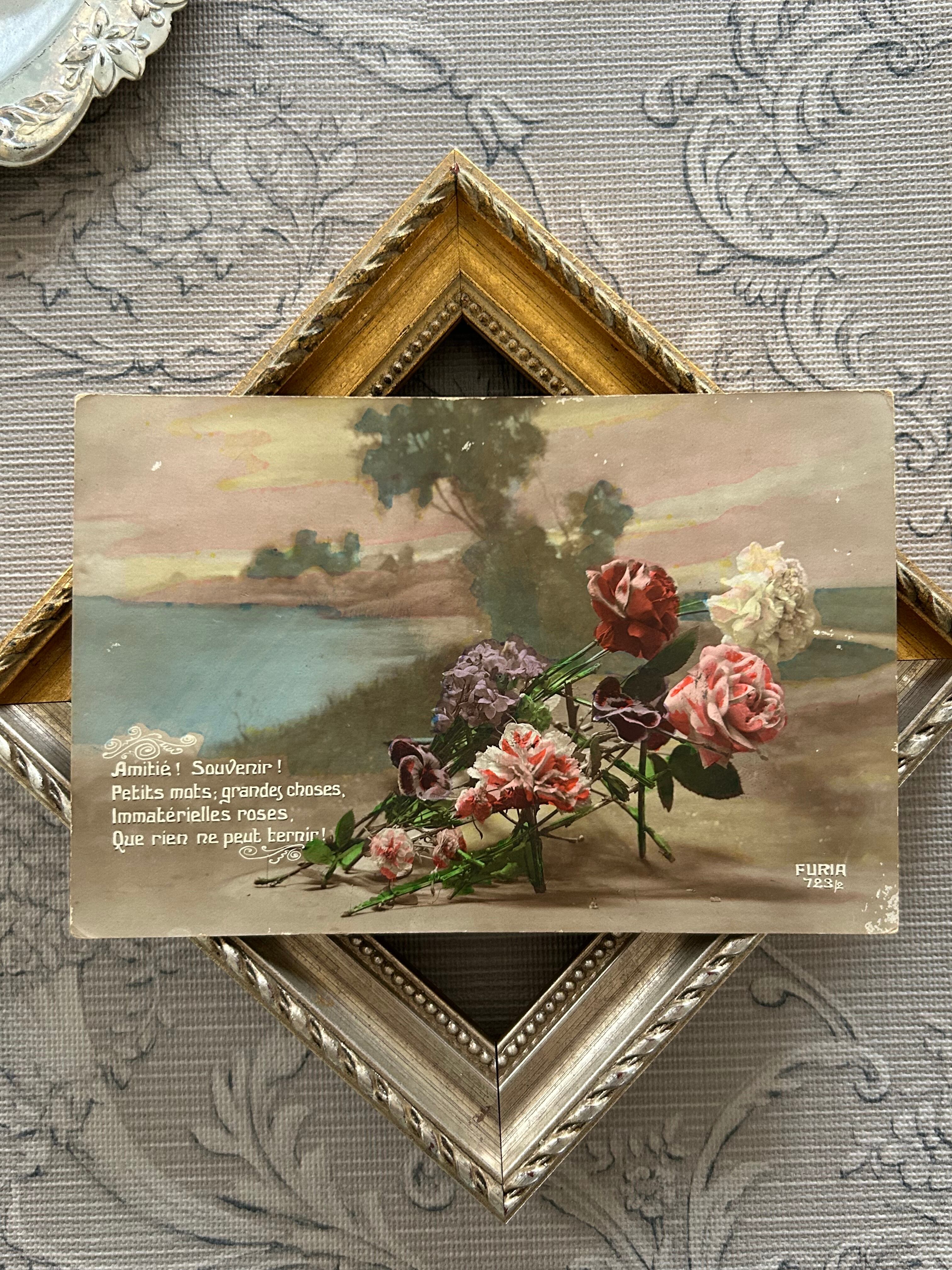 フランスアンティークポストカード パンジー 1917年 薔薇 Rose 風景 セピアカラー 額装 インテリア小物 コレクション BE