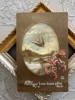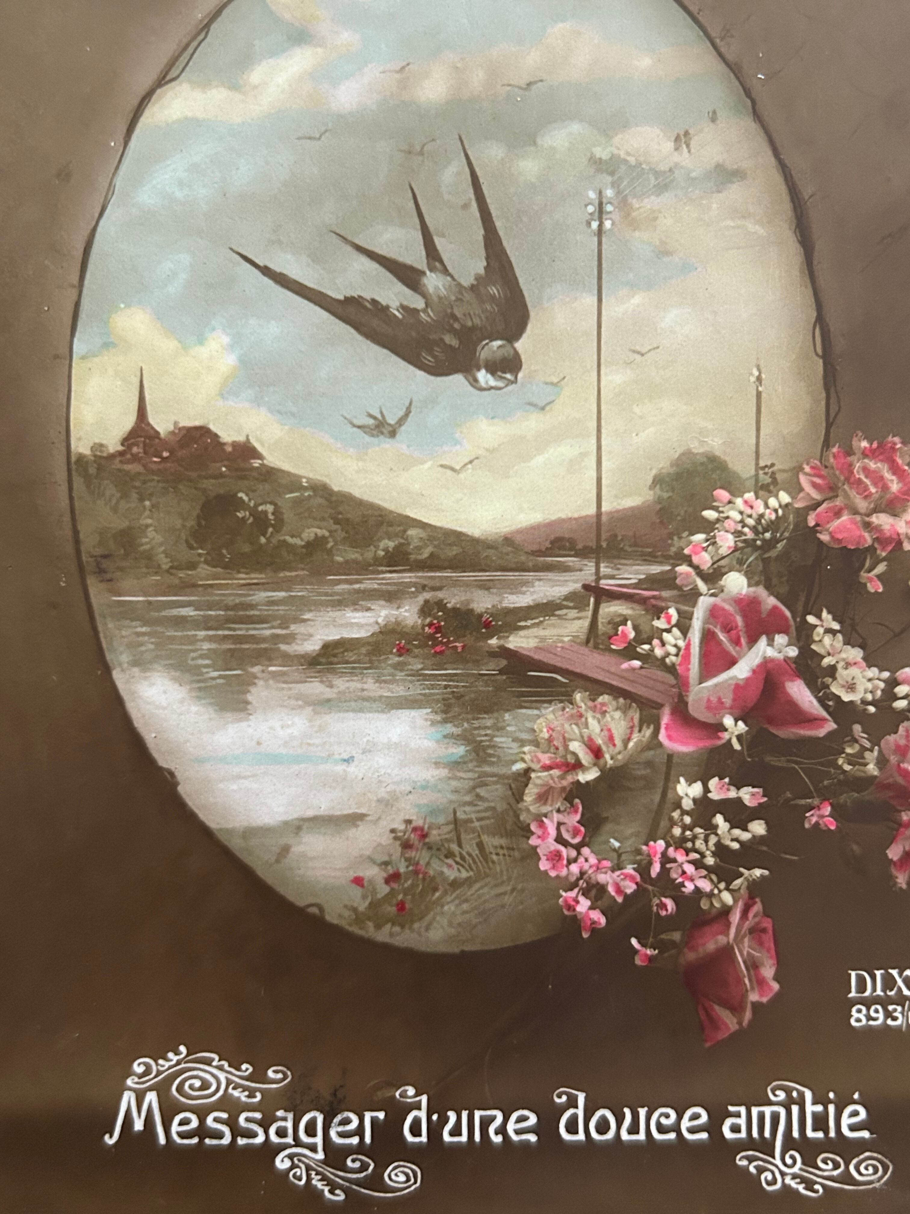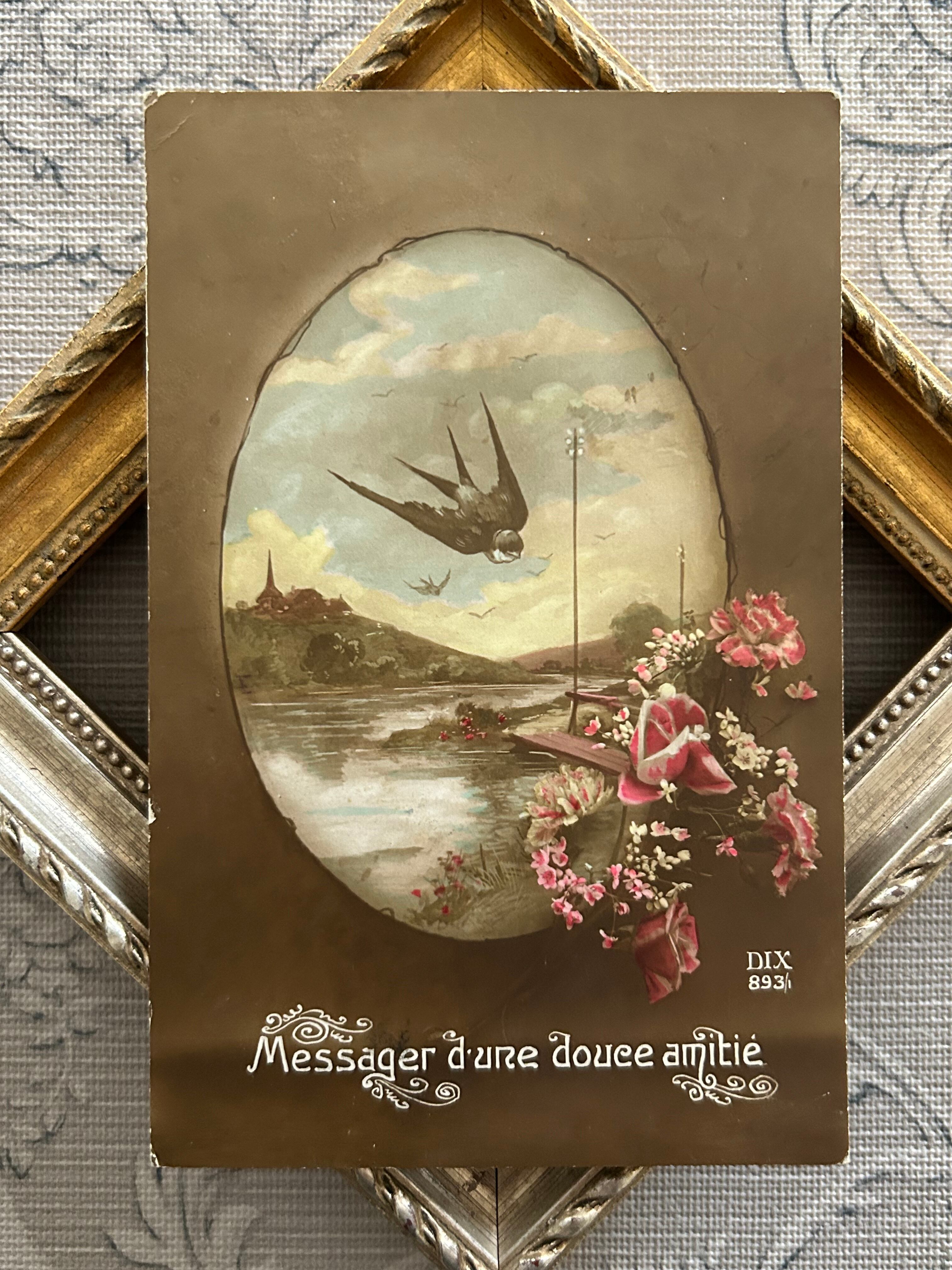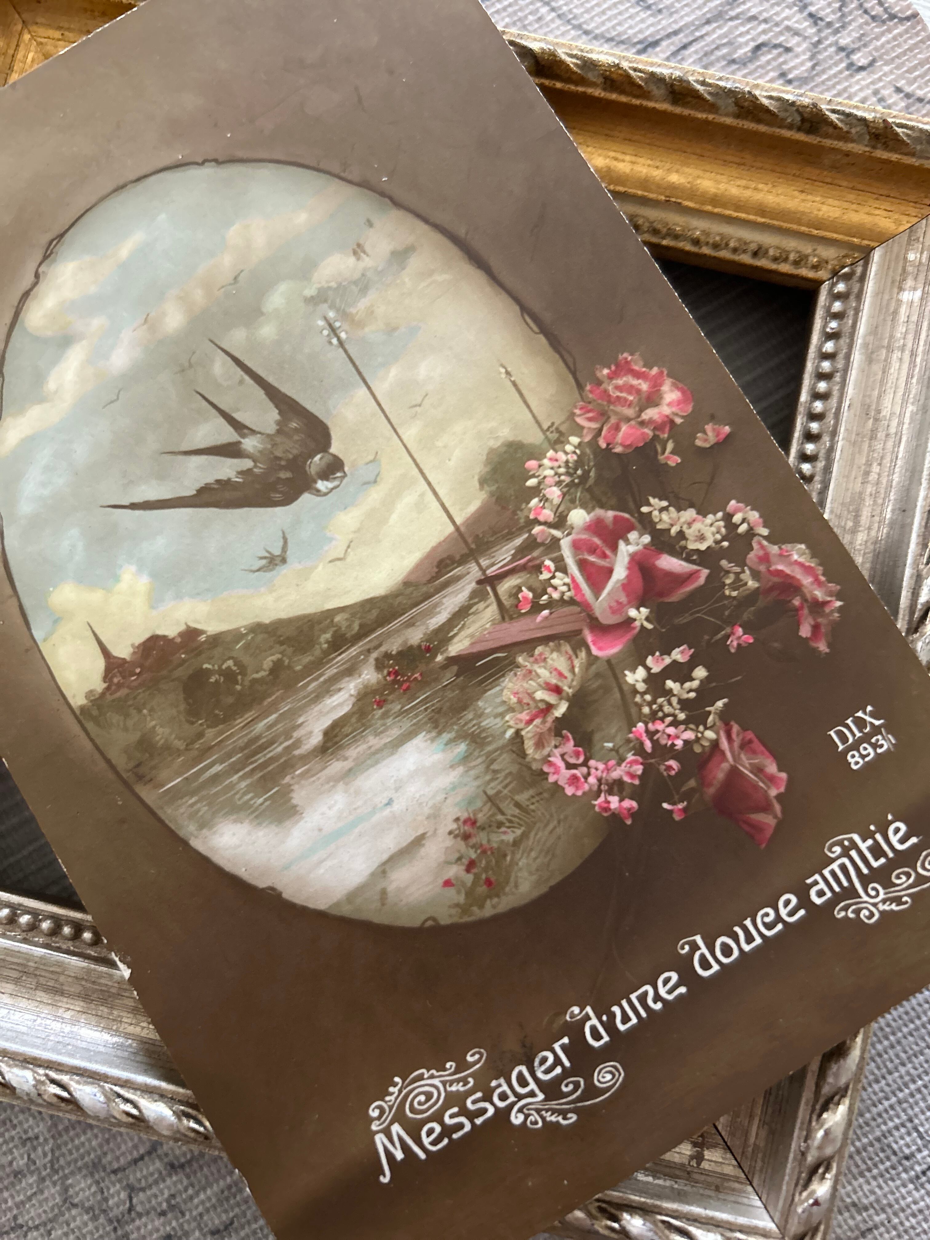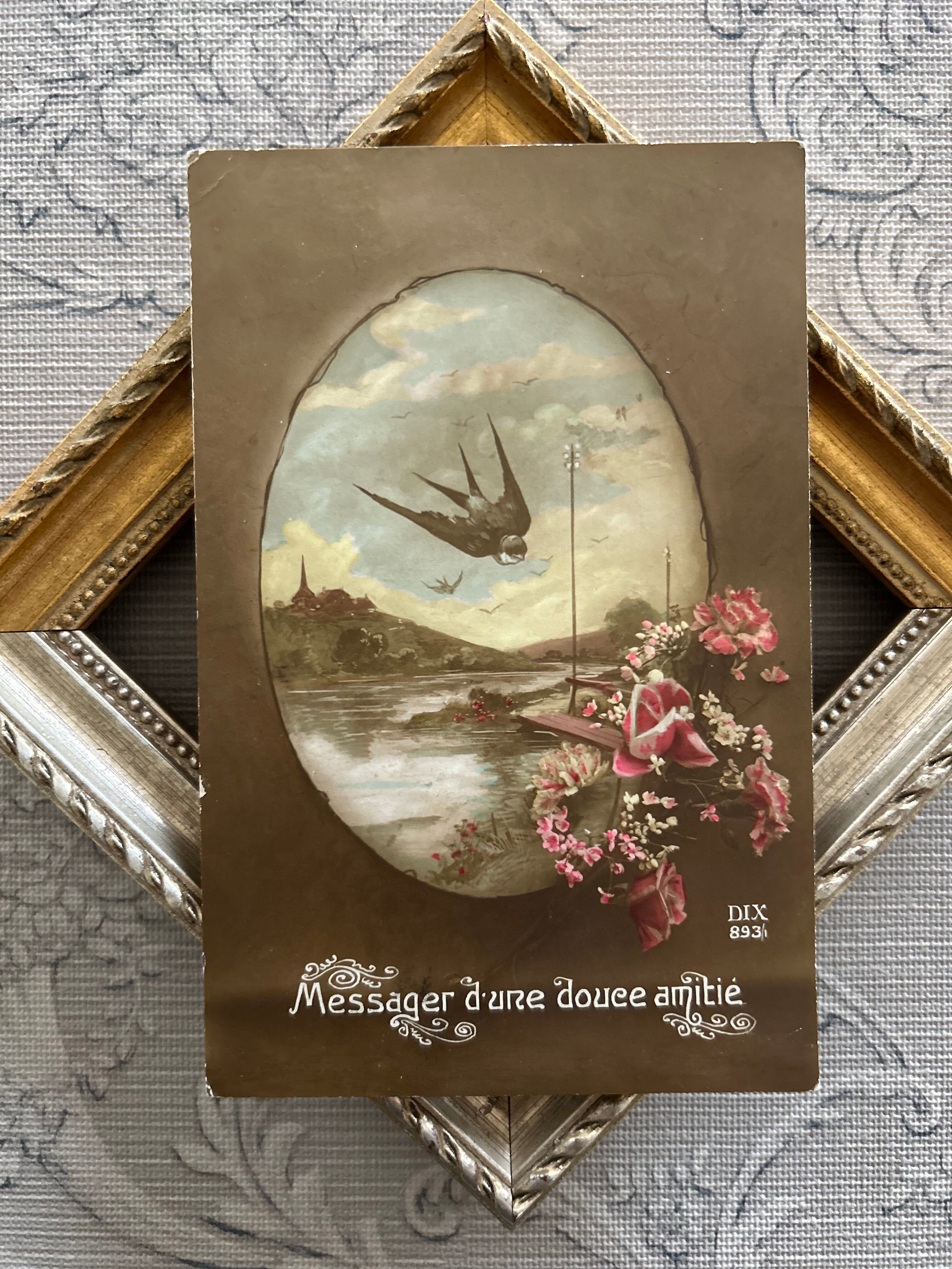 アンティークポストカード つばめ 勿忘草 風景 フラワー 1918年 額装 インテリア フランス コレクション M
