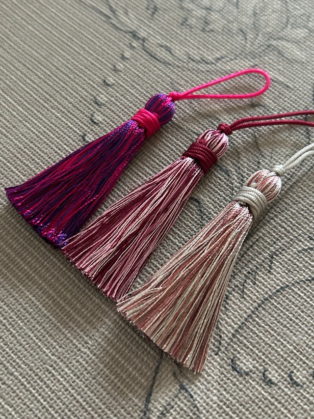 画像のようなピンク系のMIXカラーのタッセル1本づつ計3本になります。