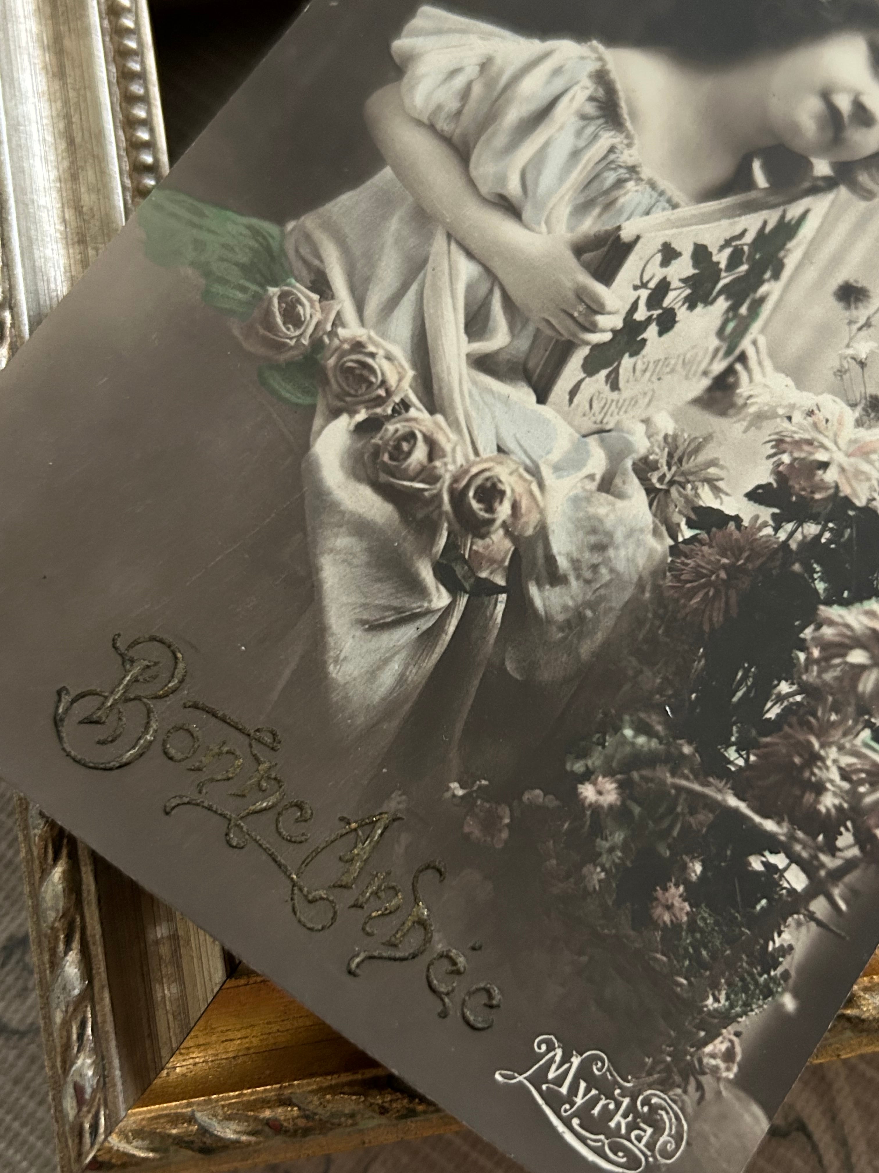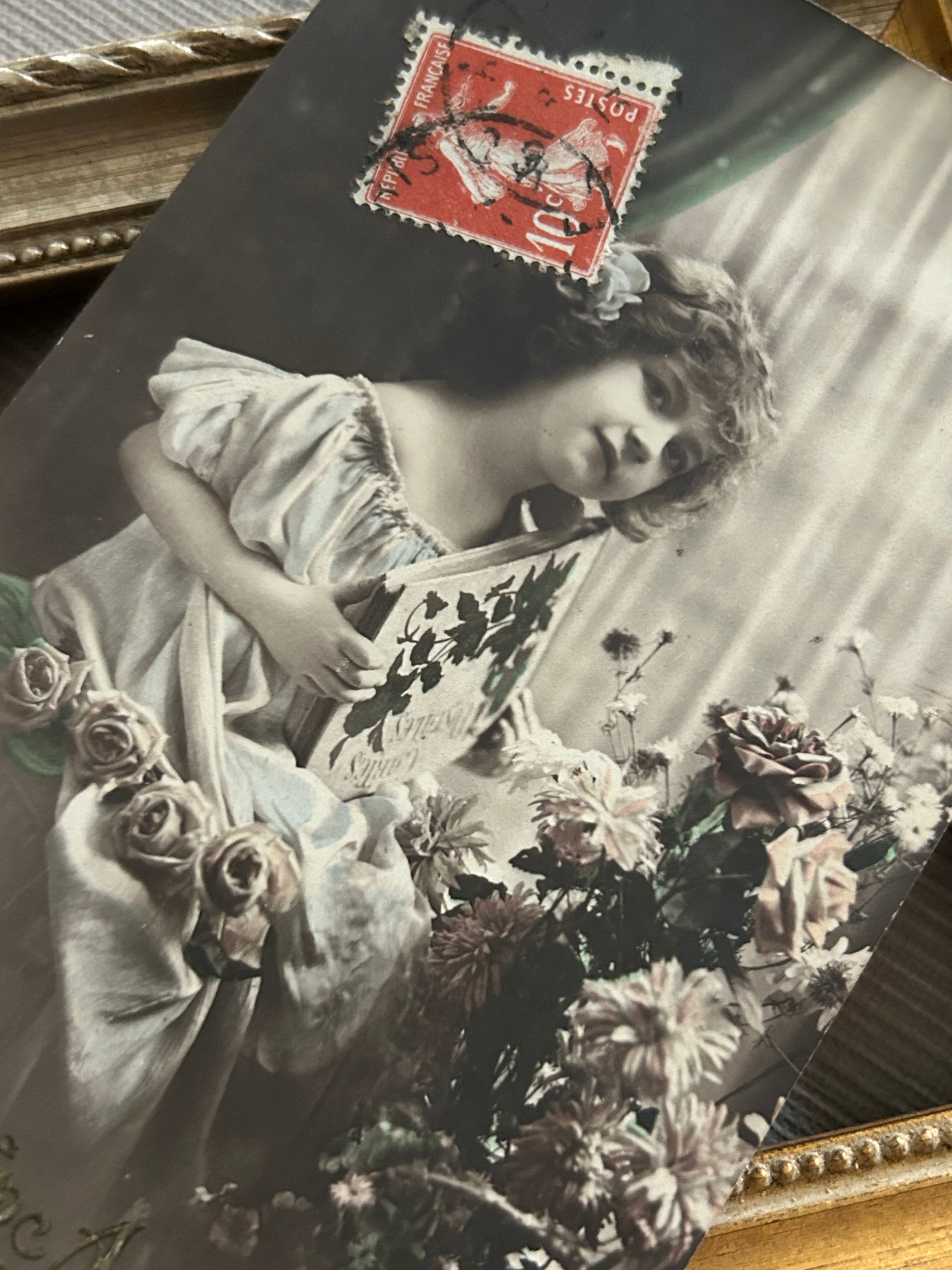 フランスアンティークカード 少女と 花籠 パニエ Rose Boone Annee 額装 インテリア BE