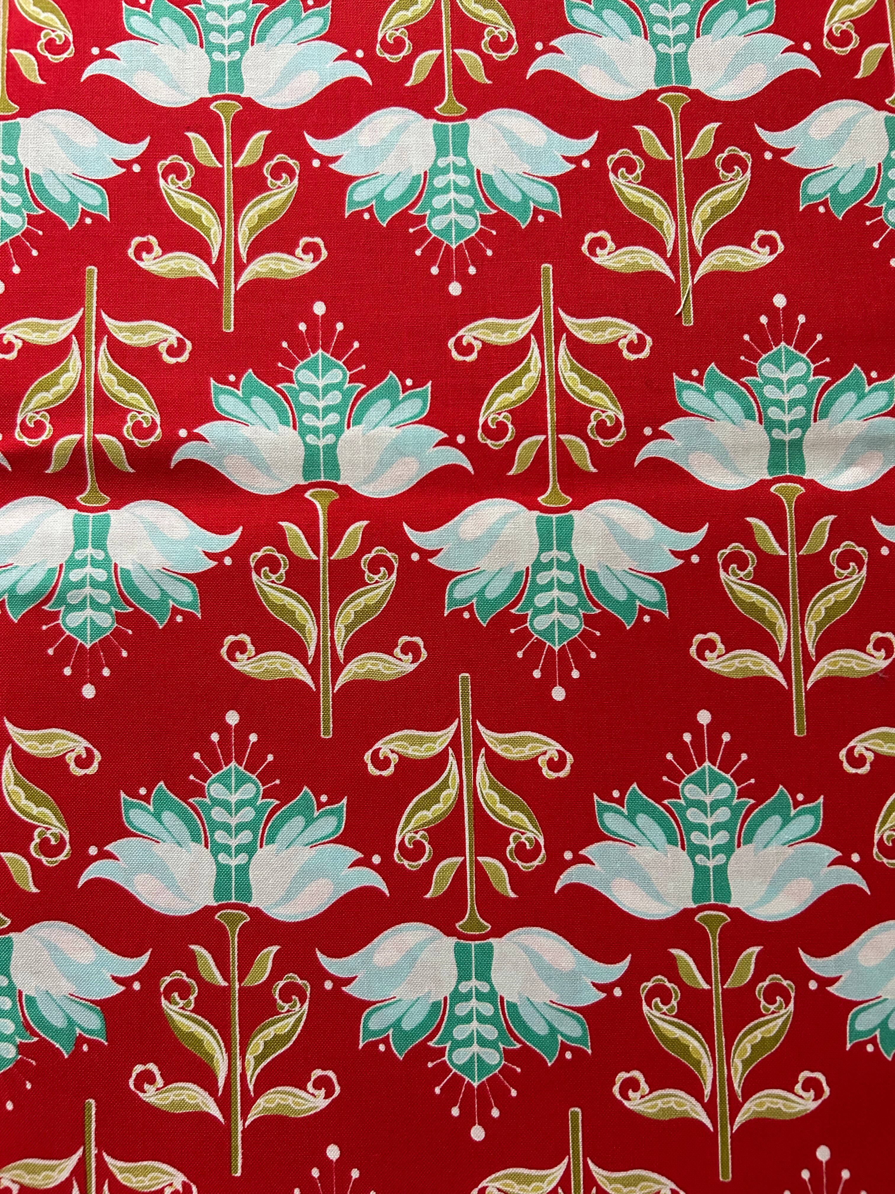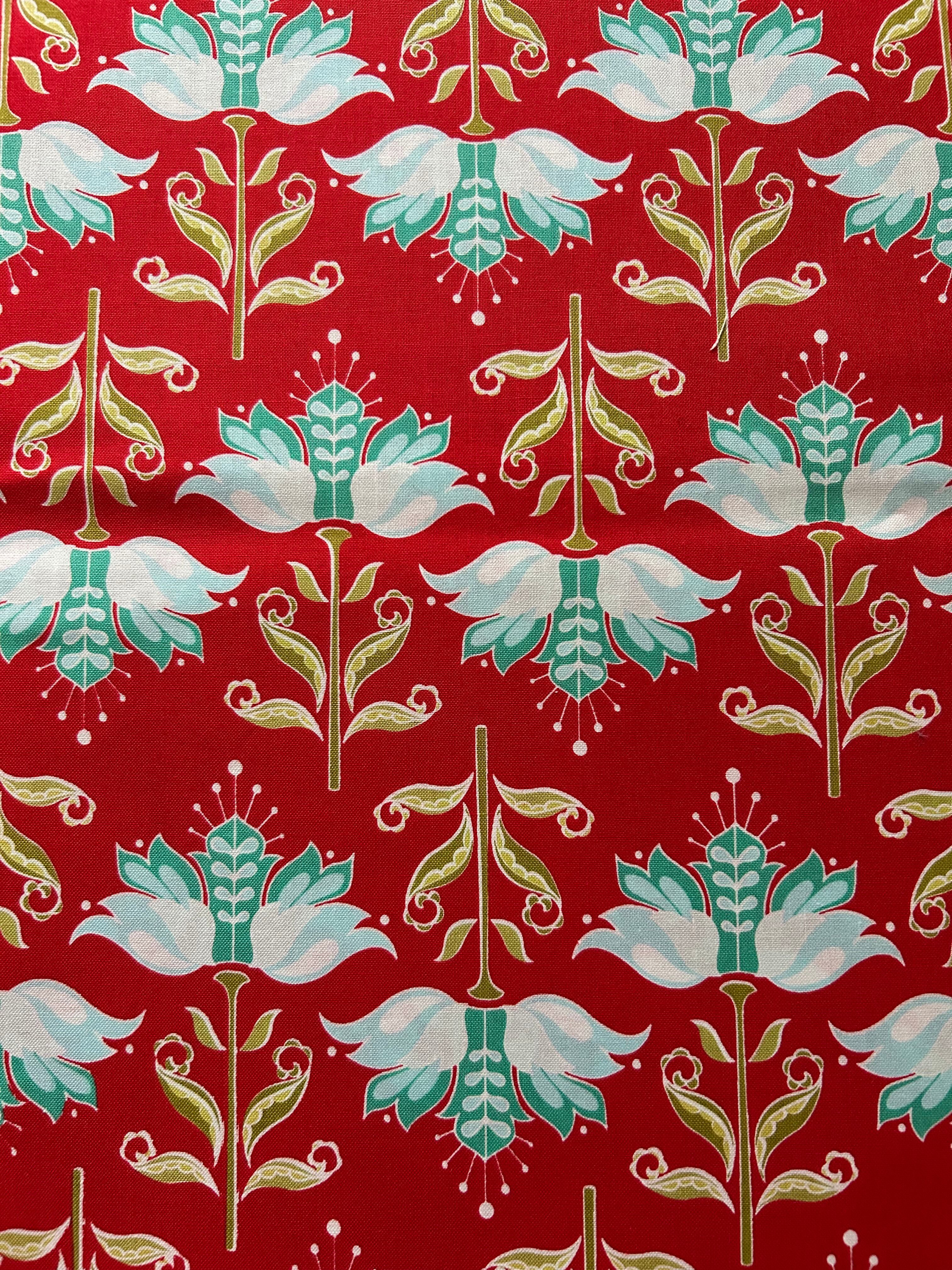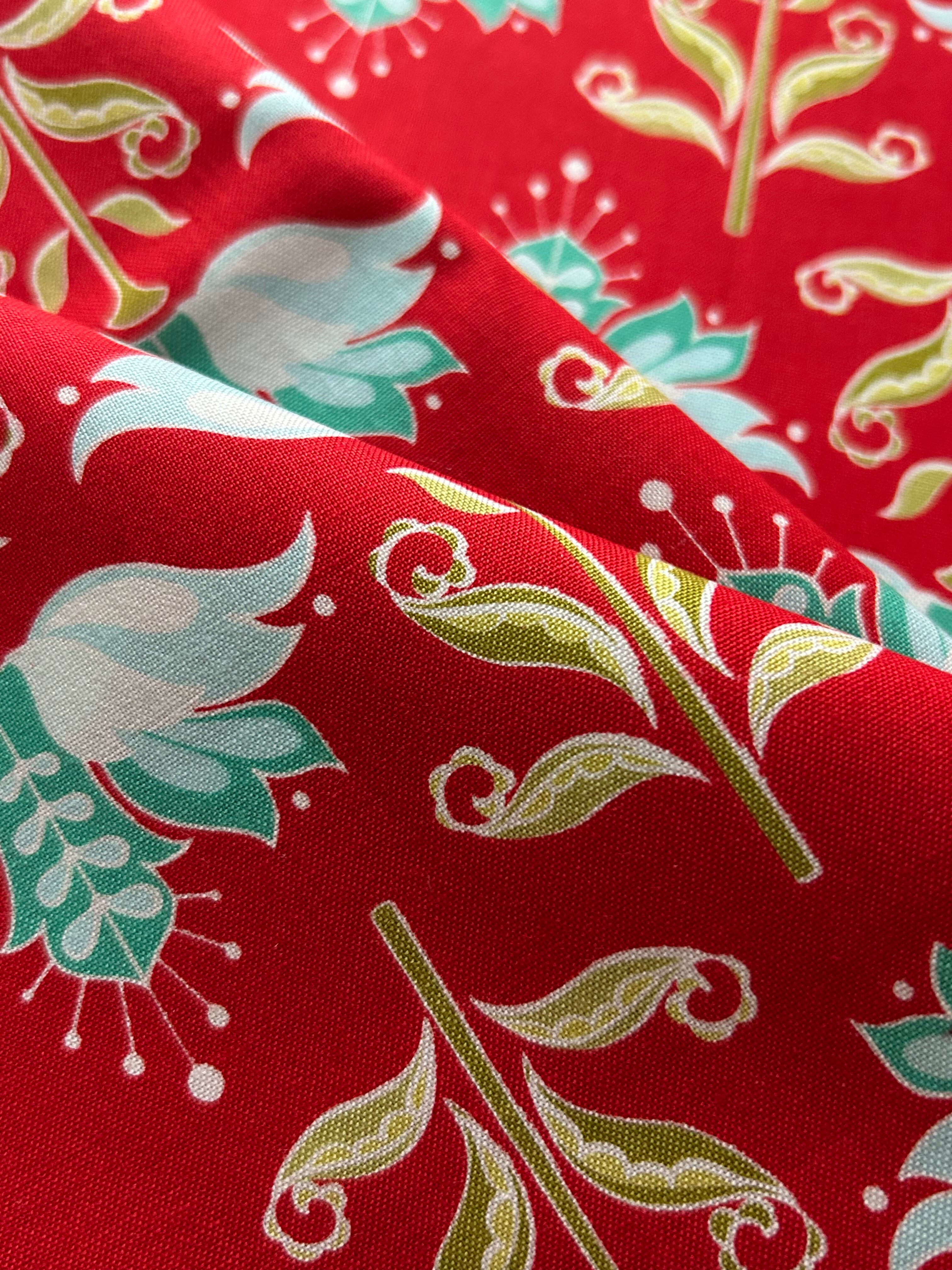 鮮やかなレッド系の地色にポップでオリエンタルなライトブルーの花柄。