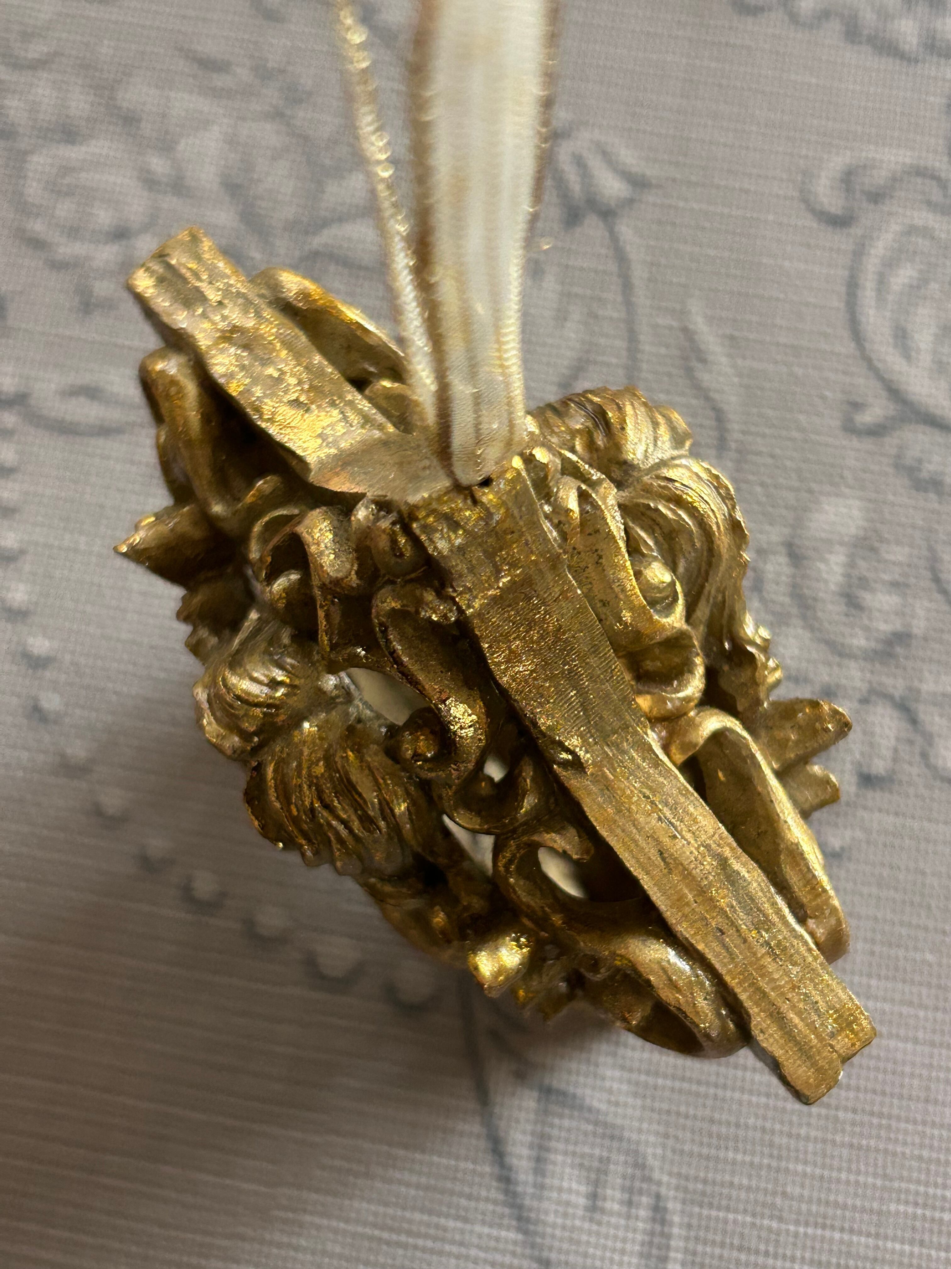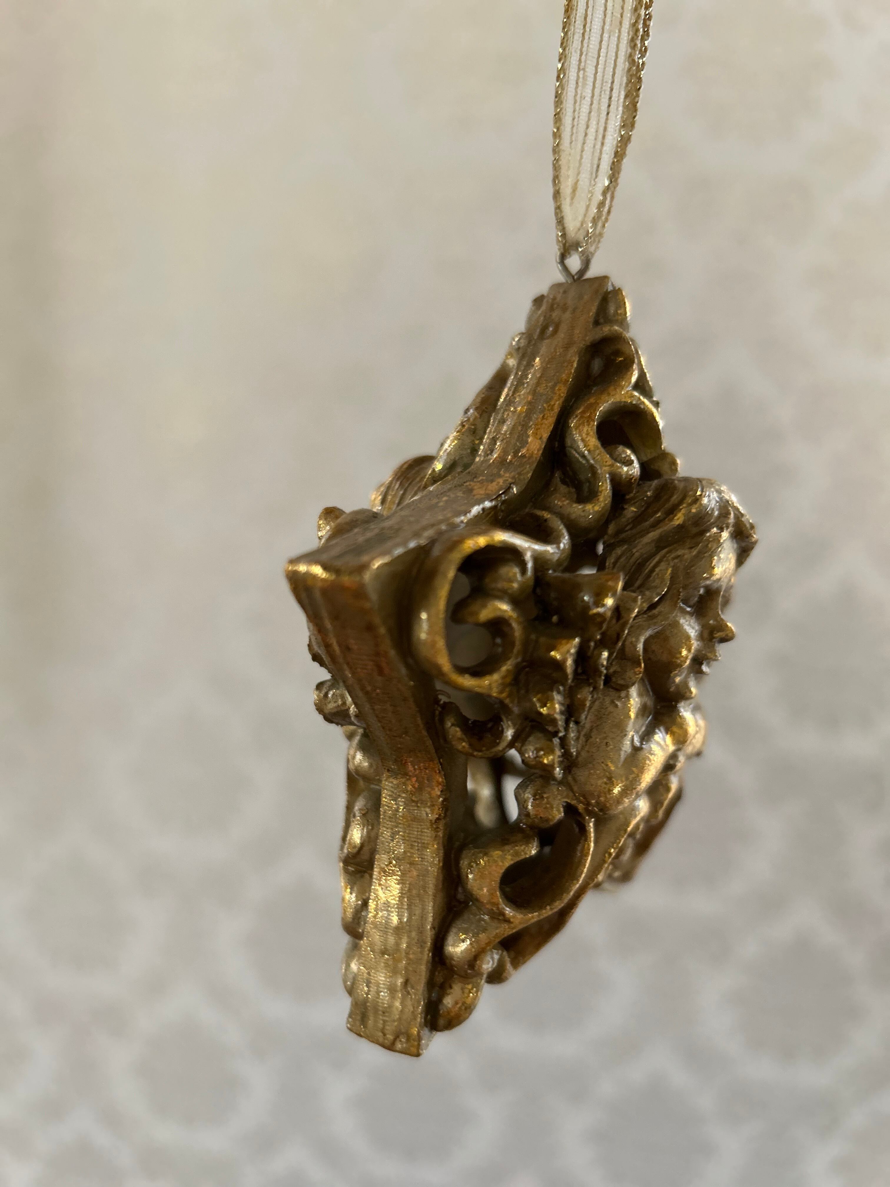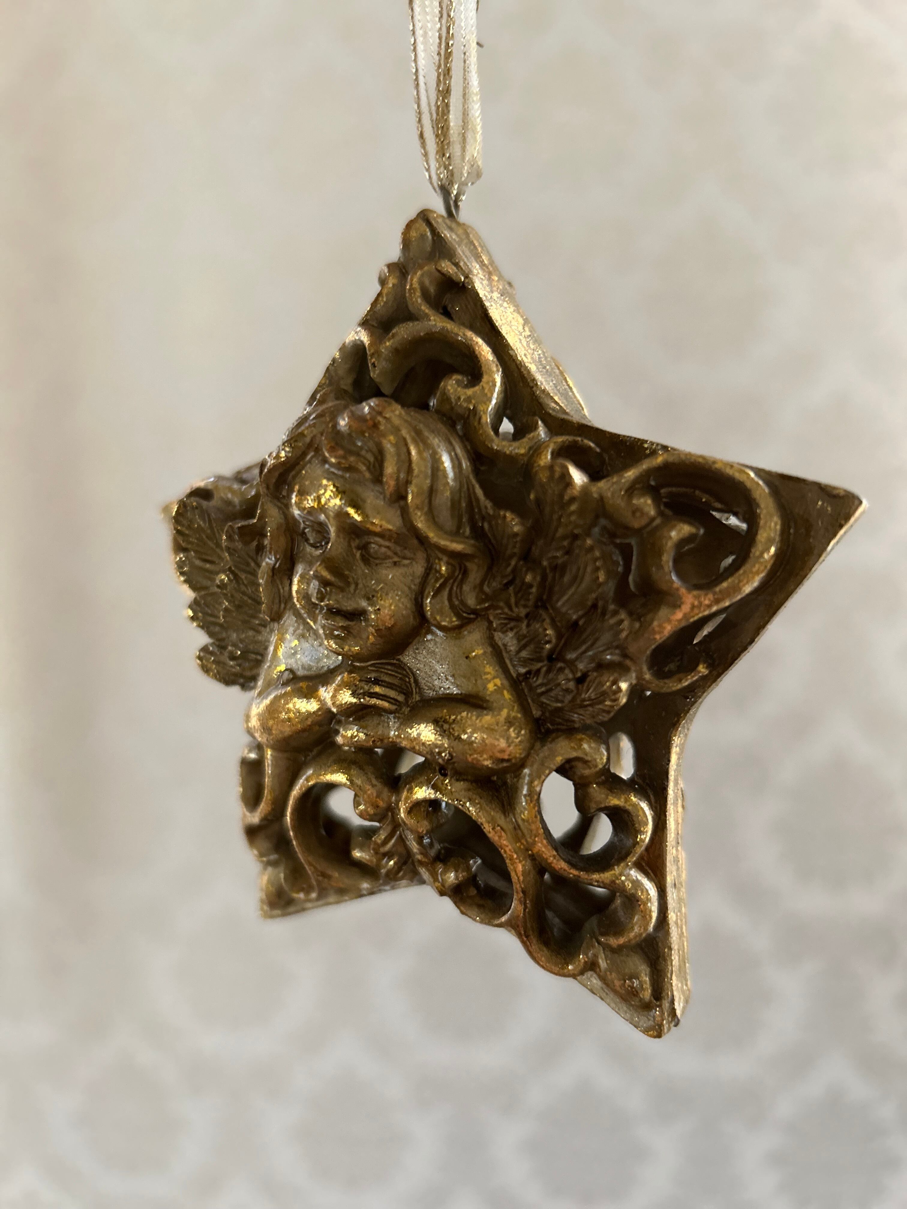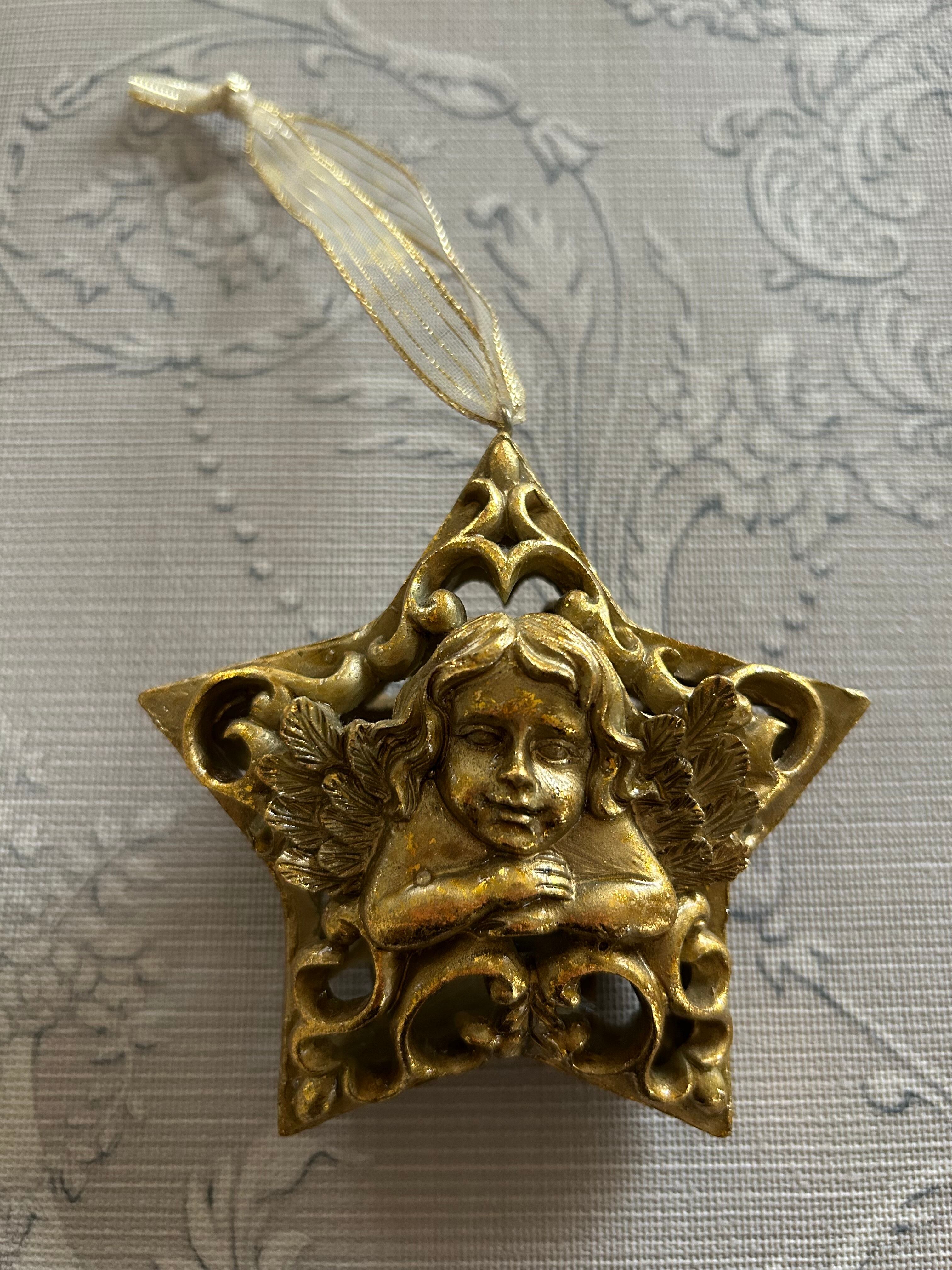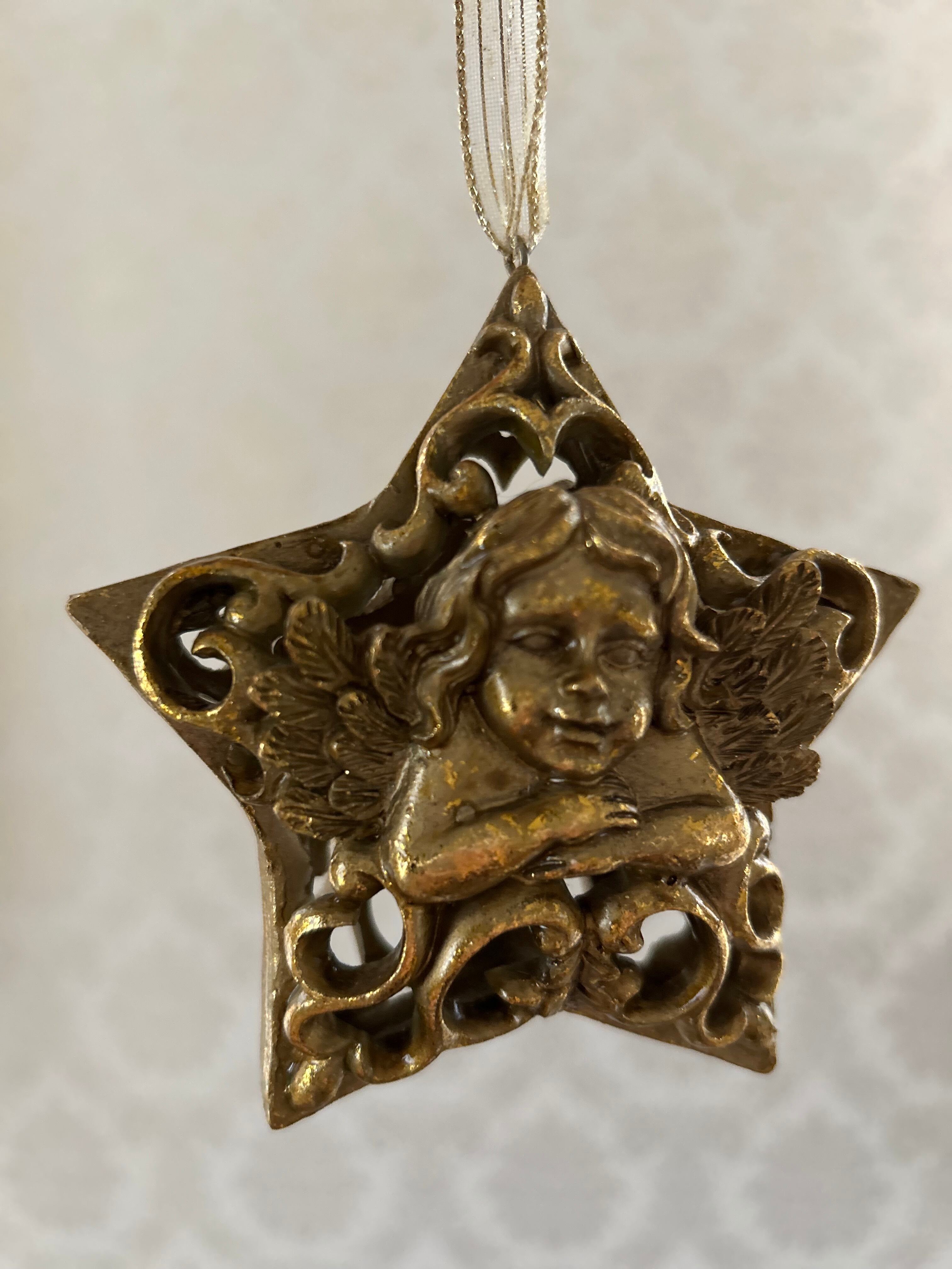 ゴージャスなゴールドカラー、星型の透かしの天使のオーナメントになります。